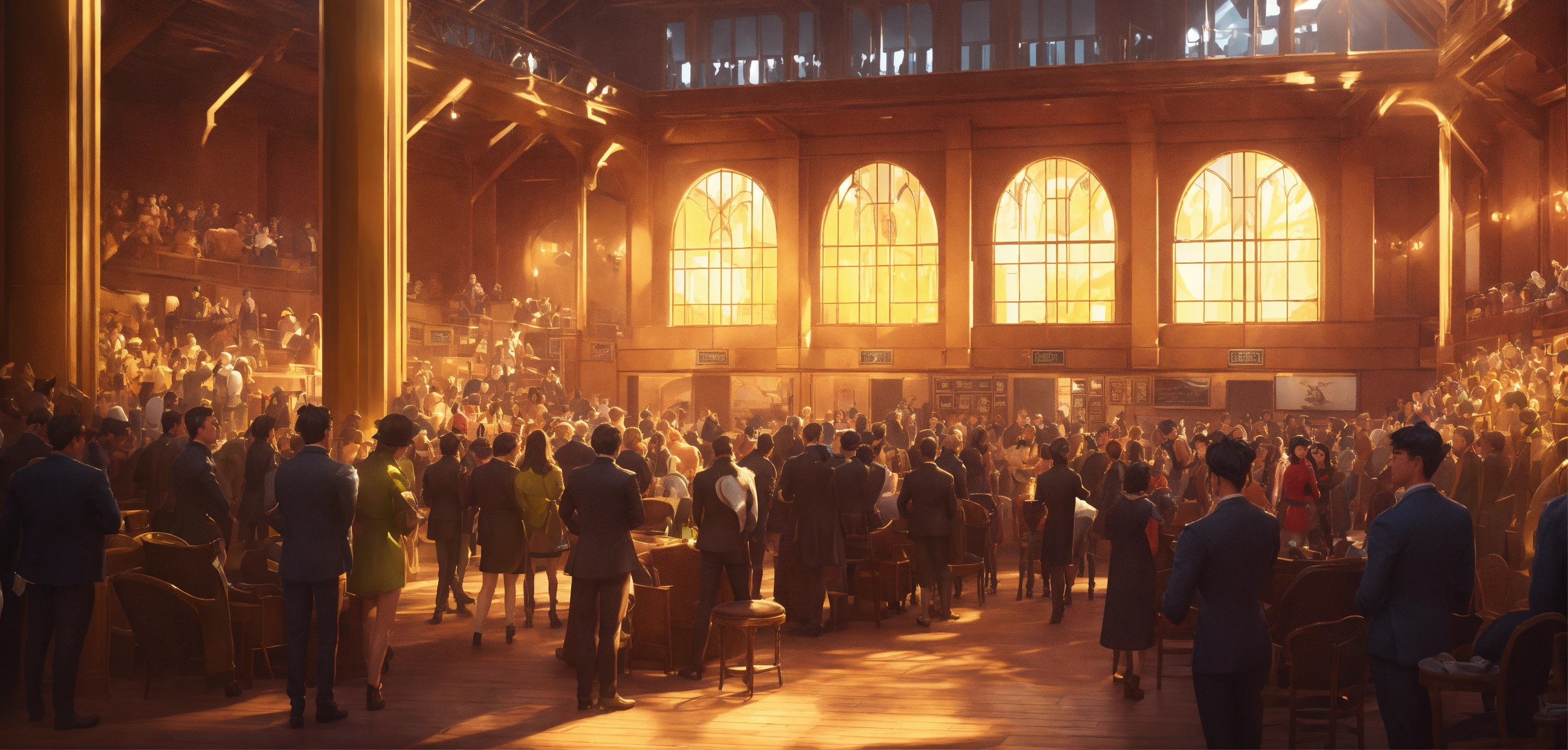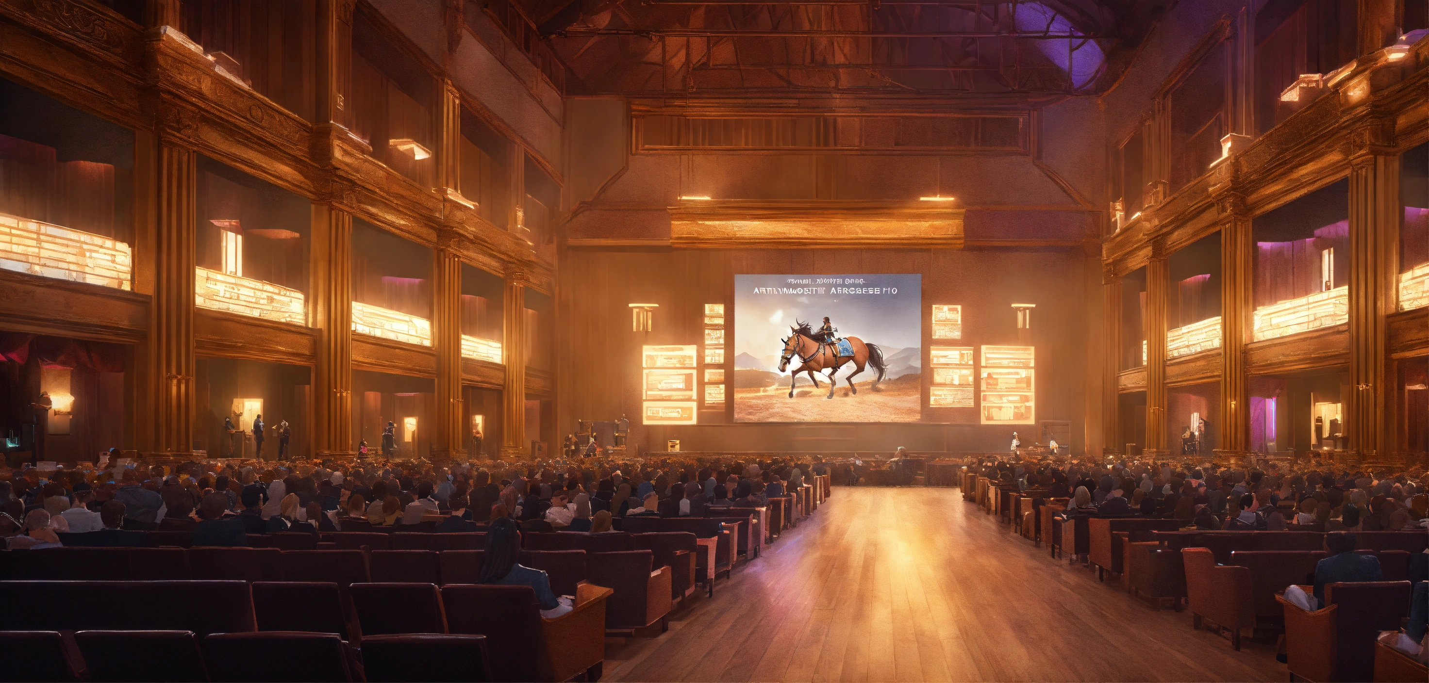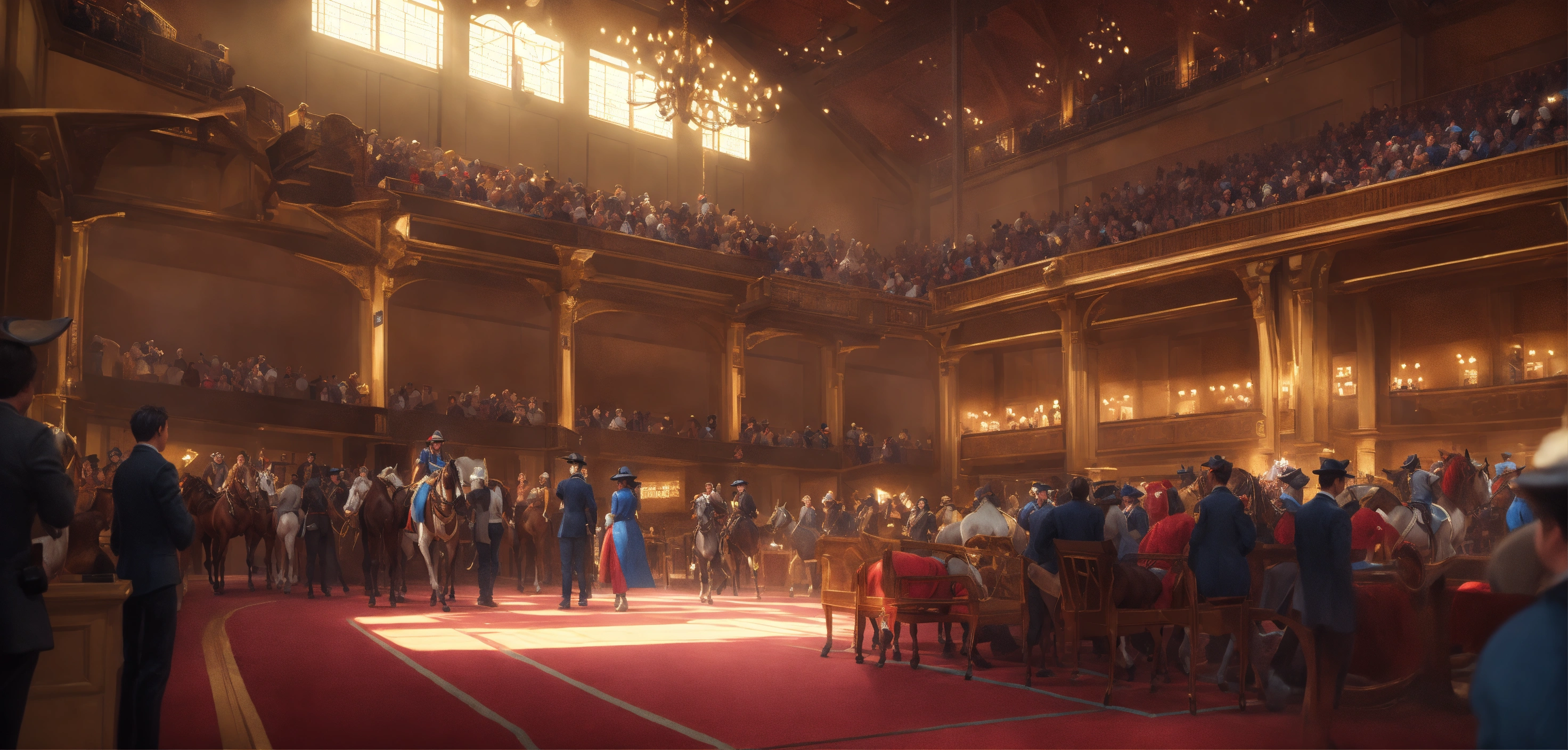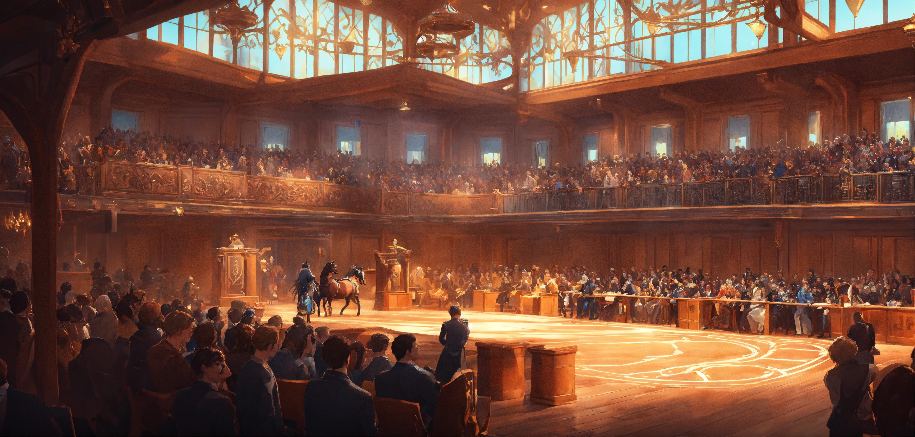 A highly detailed league of legend dynamic illustration of the horse auction in modern event hall, by joshua raphael, by artgerm, by huyy nguyen, by cj xander, by jennifer wuestling, by diep duong van, by huyy nguyen, by grafit studio, volumetric lighting, 3d render, 4k resolution, trending on artstation, masterpiece, close up frame, cinematic shot, keeneland sales, inside hall with stands, lot of armchairs with people, one horse in centre only with light, a windowless hall with a horse stand