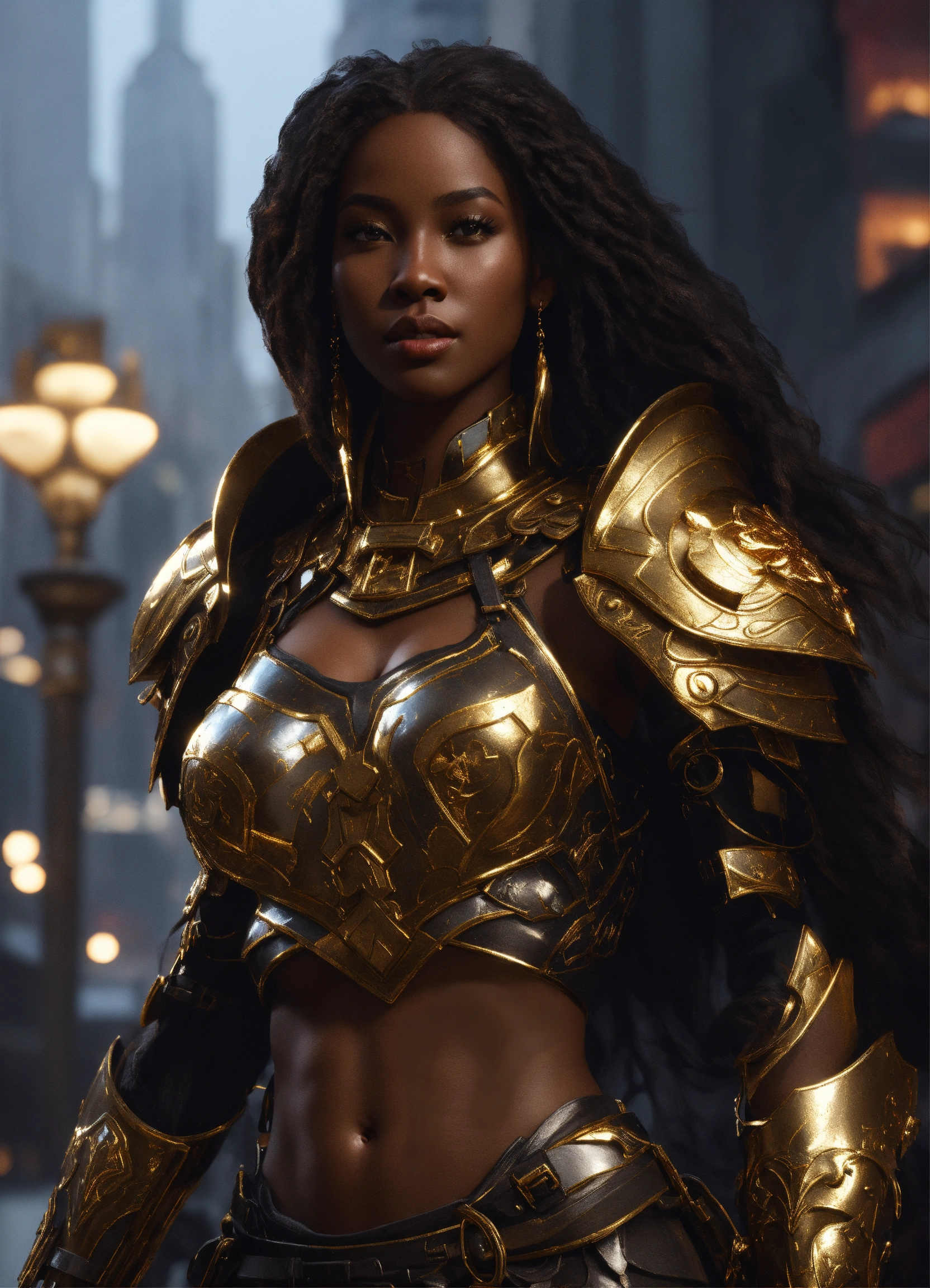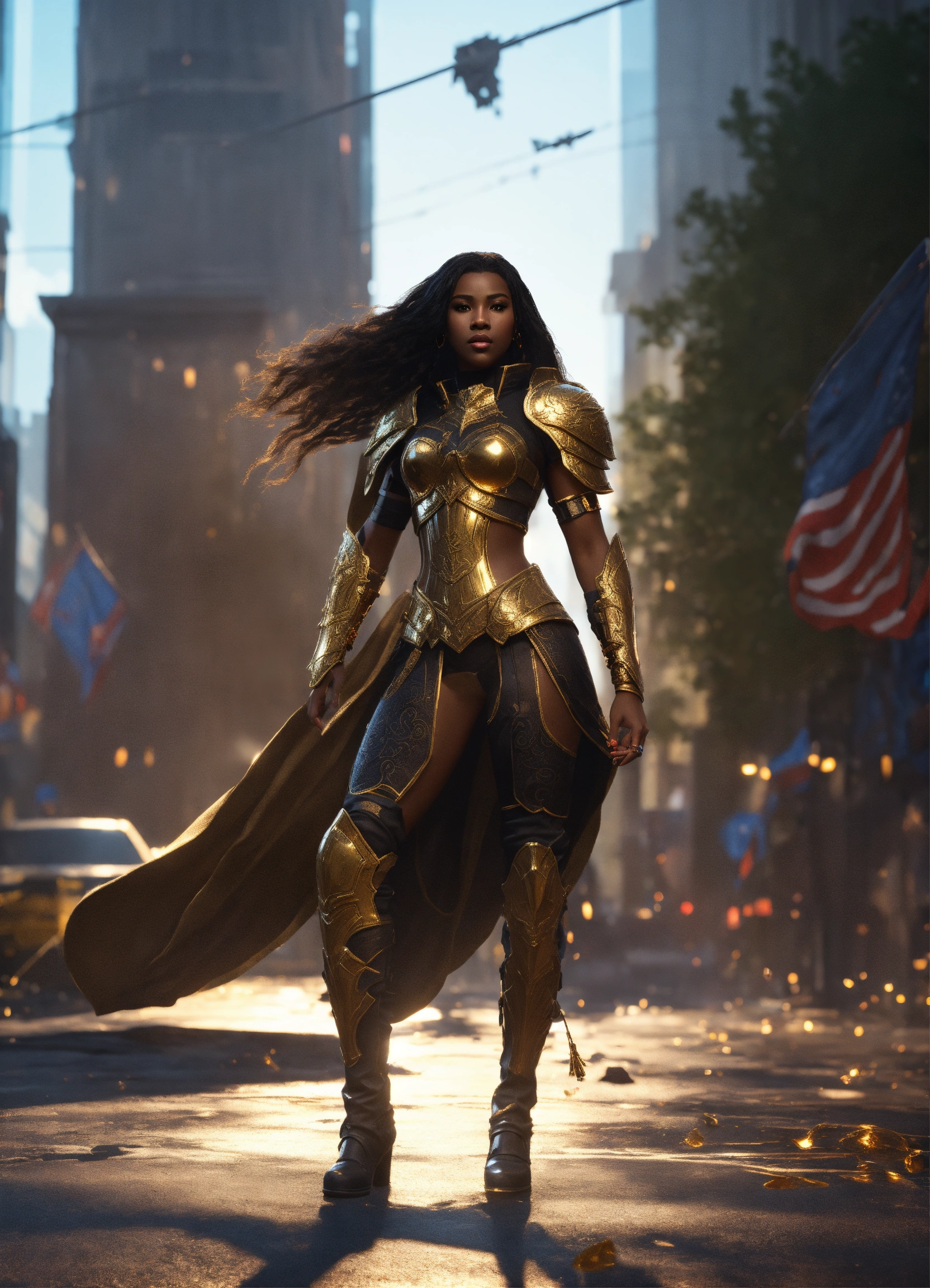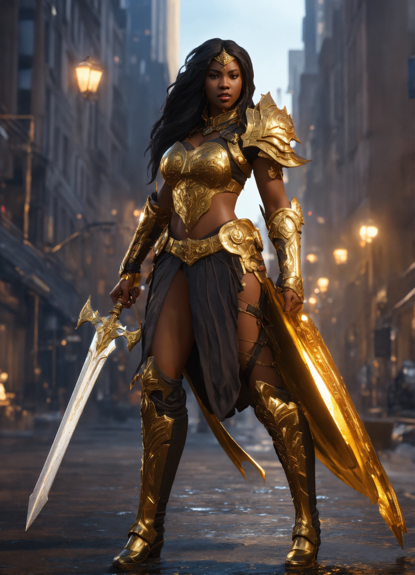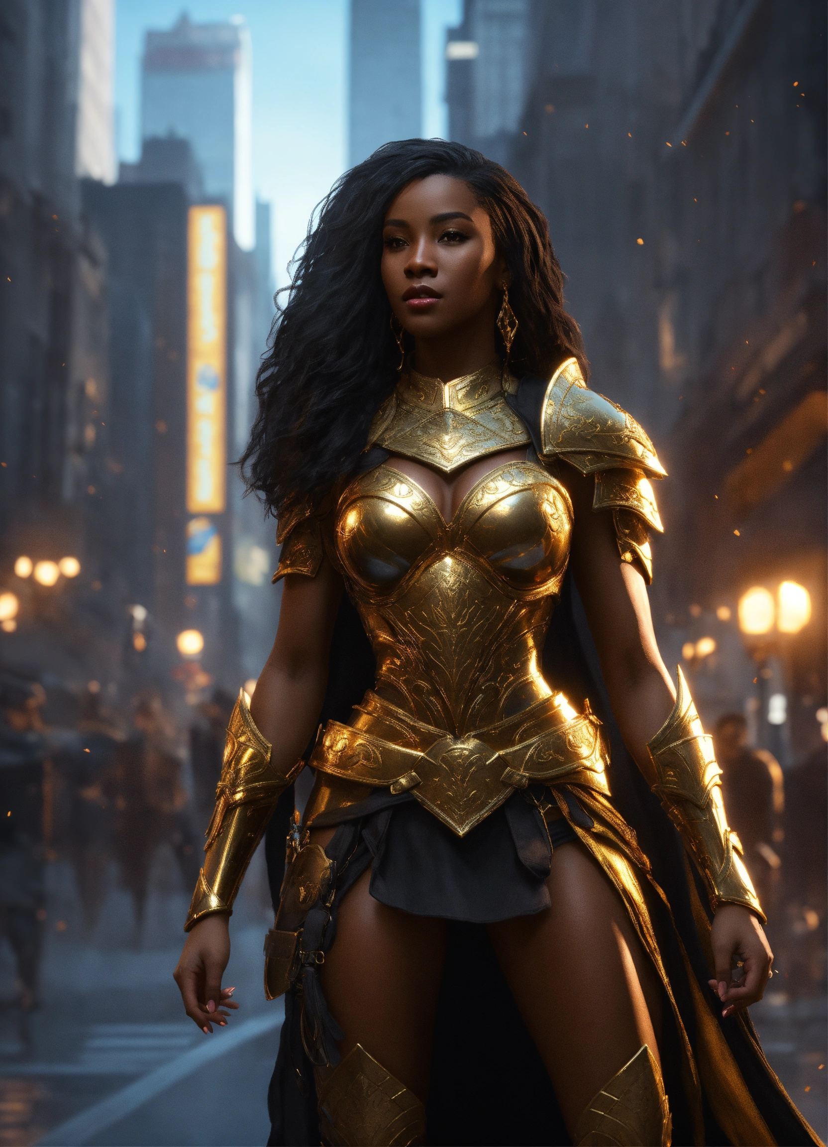 Full body of a beautilul, gorgeous long hair, shapely black female goddess of war with long flowing hair, perfect dark skin, perfect face, full lips most beautiful woman in the world, shapely hour-glass figure, a a dark skin hero wearing gold and black armor, fully covered, in new york city, full body, 8k resolution concept art portrait dynamic lighting hyperdetailed intricately detailed splash art trending on artstation unreal engine 5 volumetric lighting