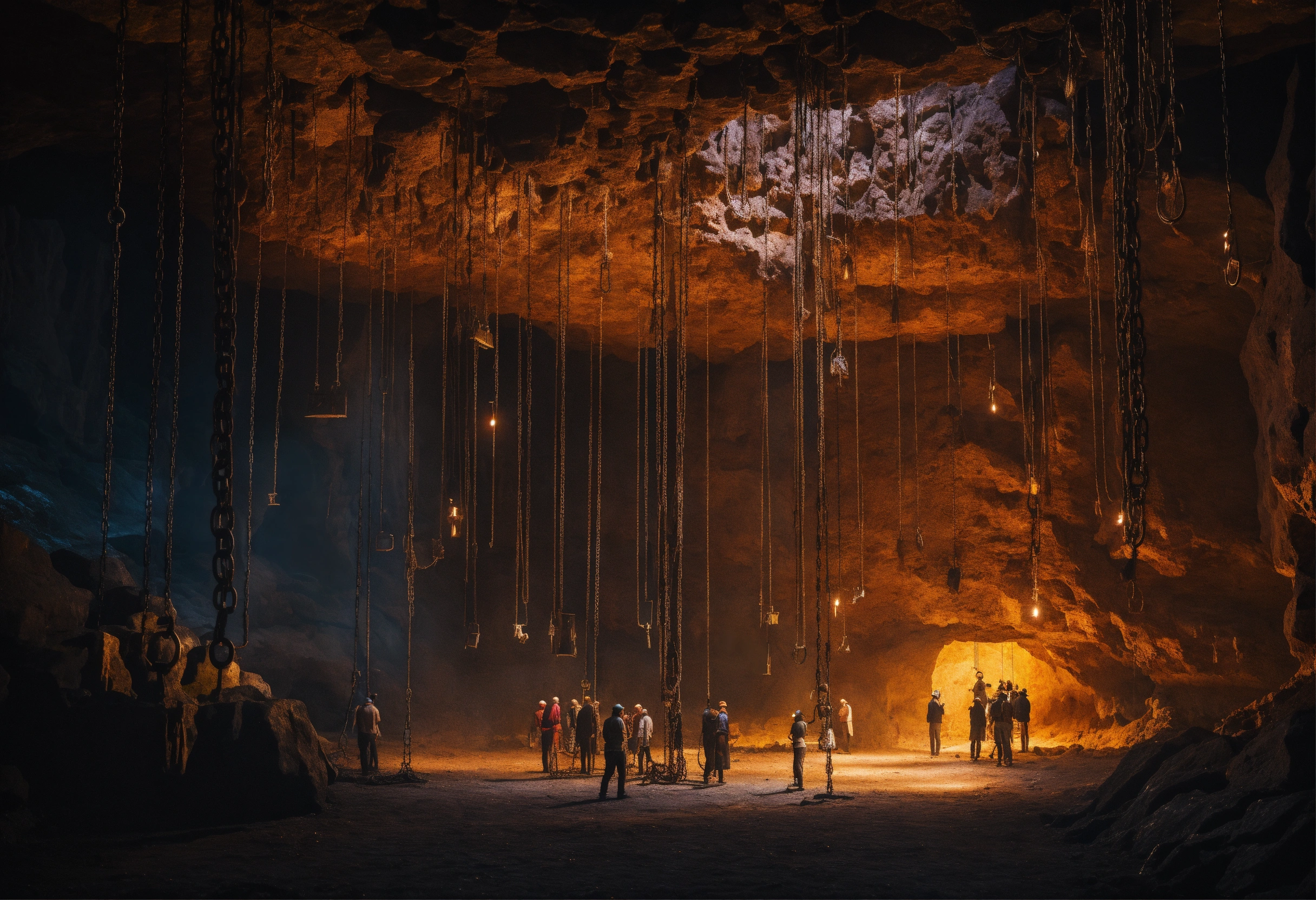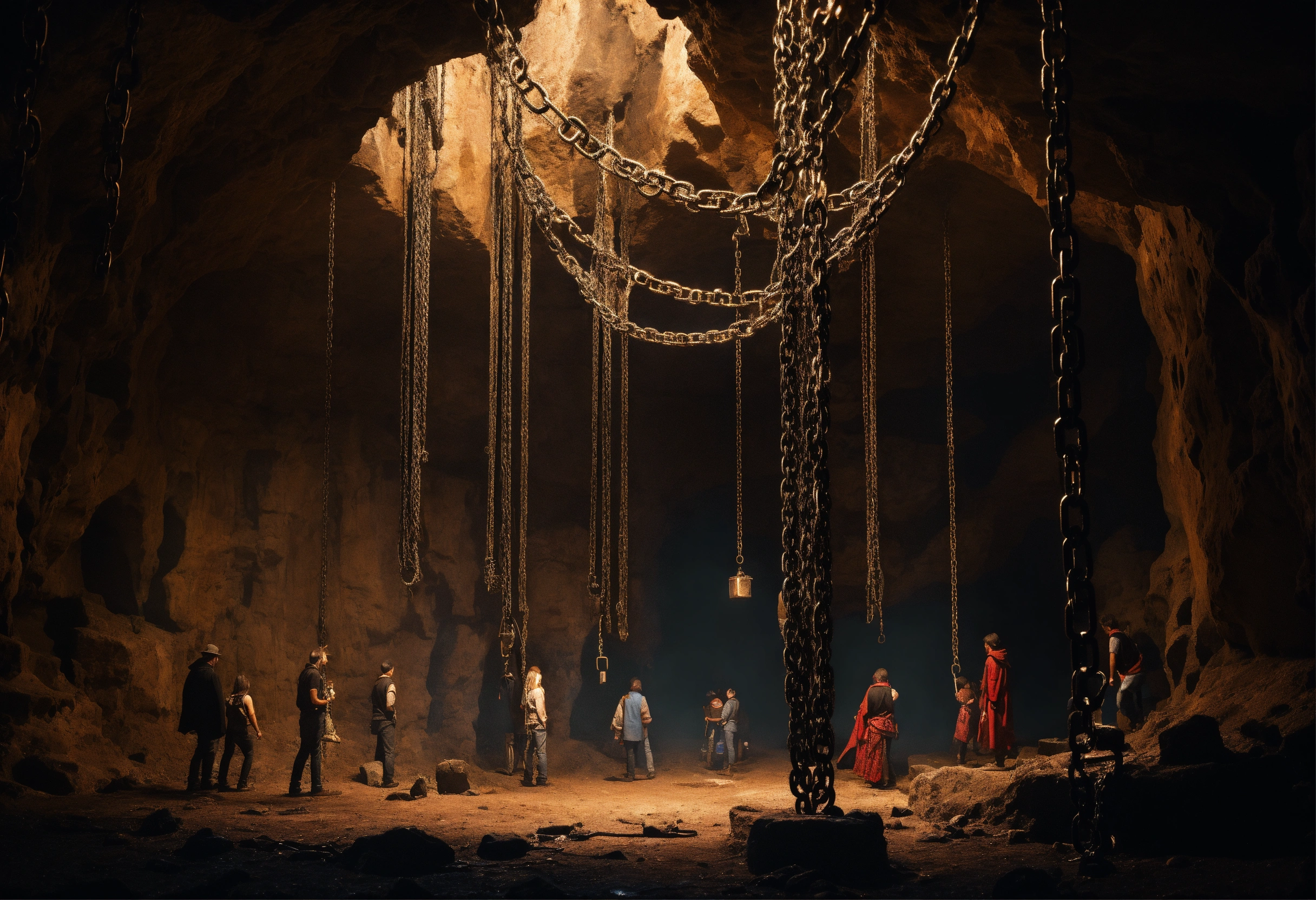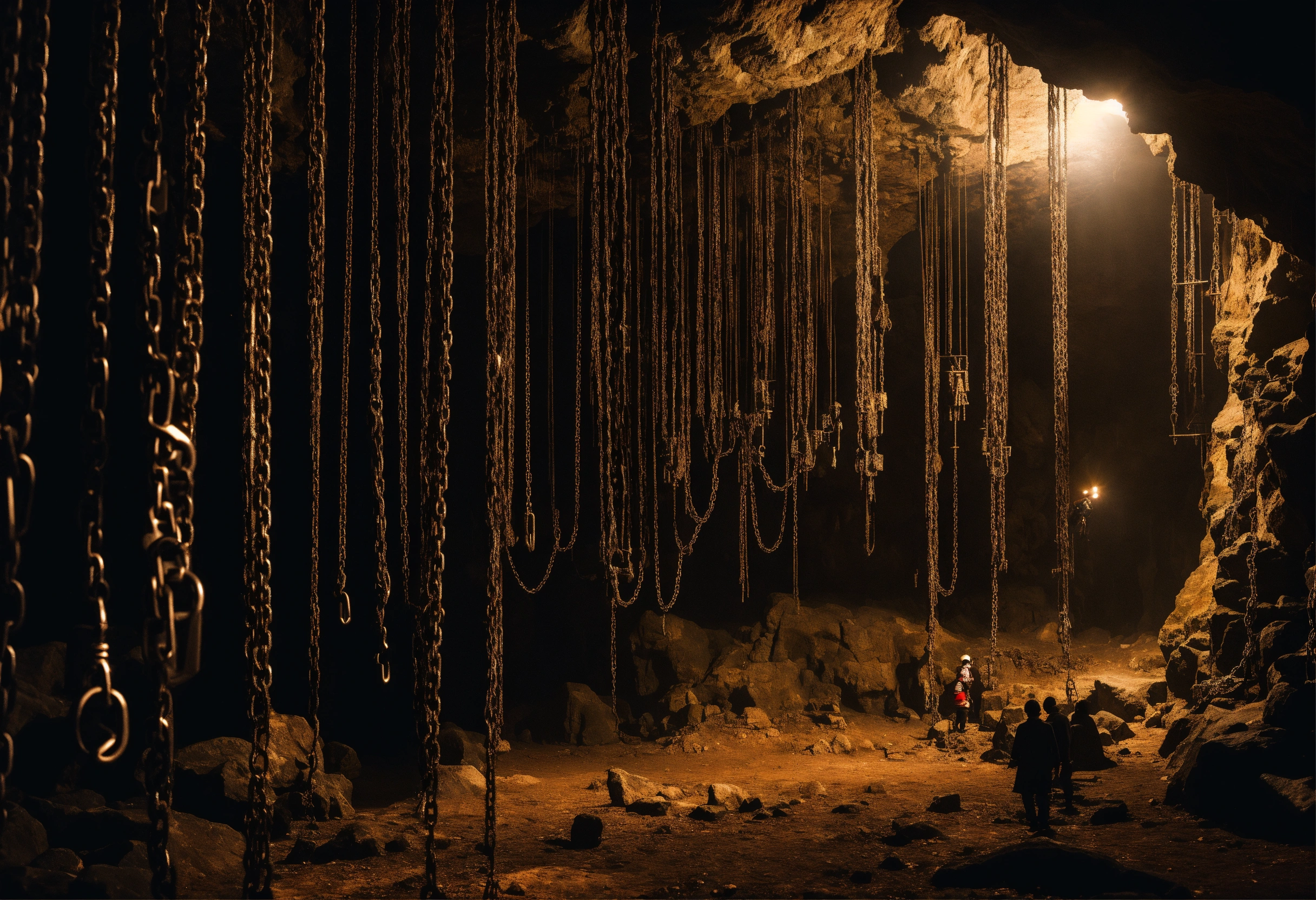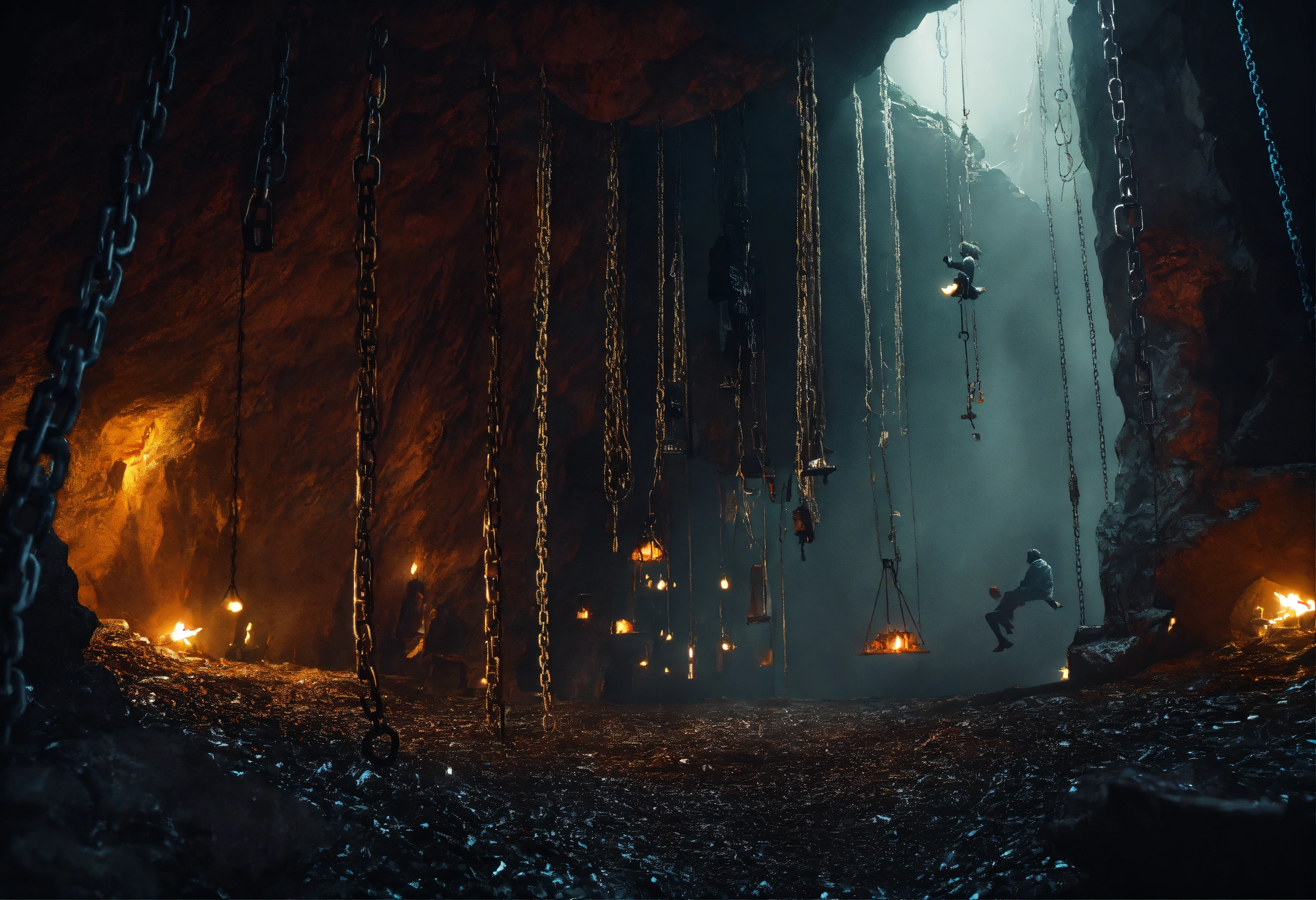 A scary dark cave in which there are many chains with people hanging on top
