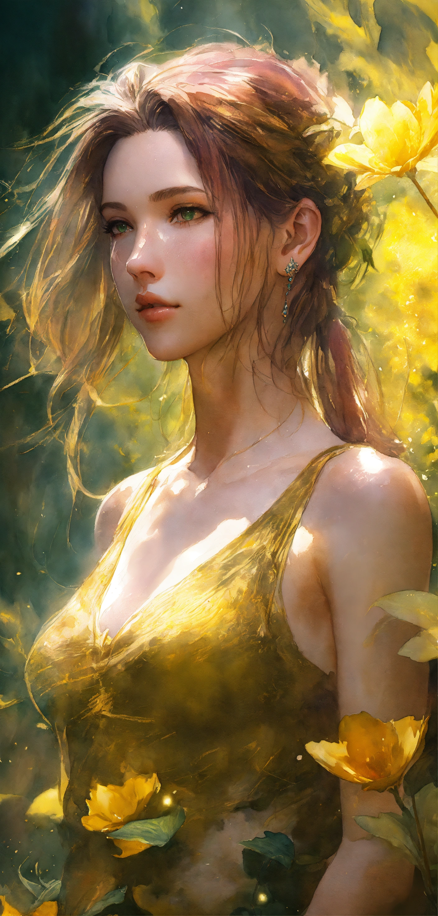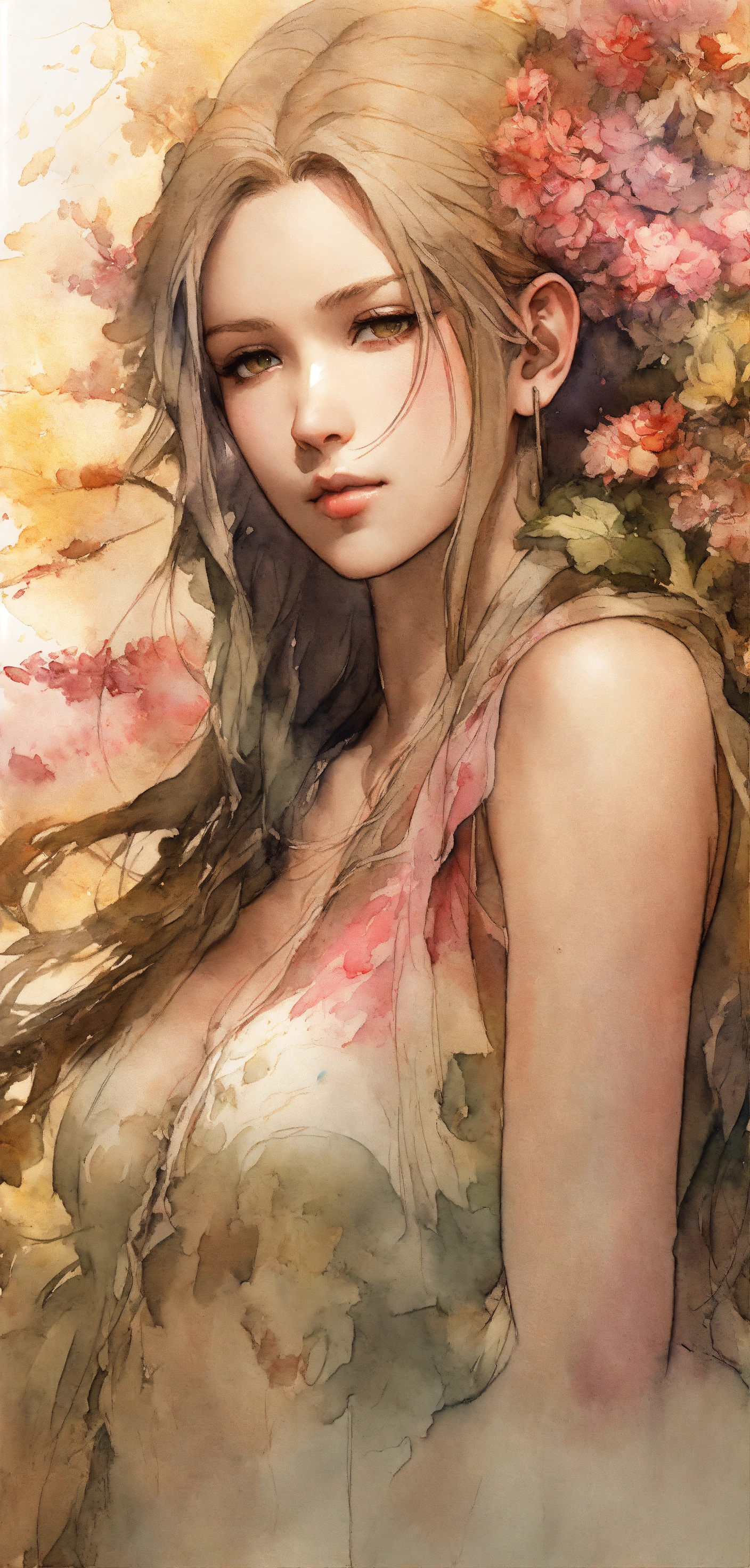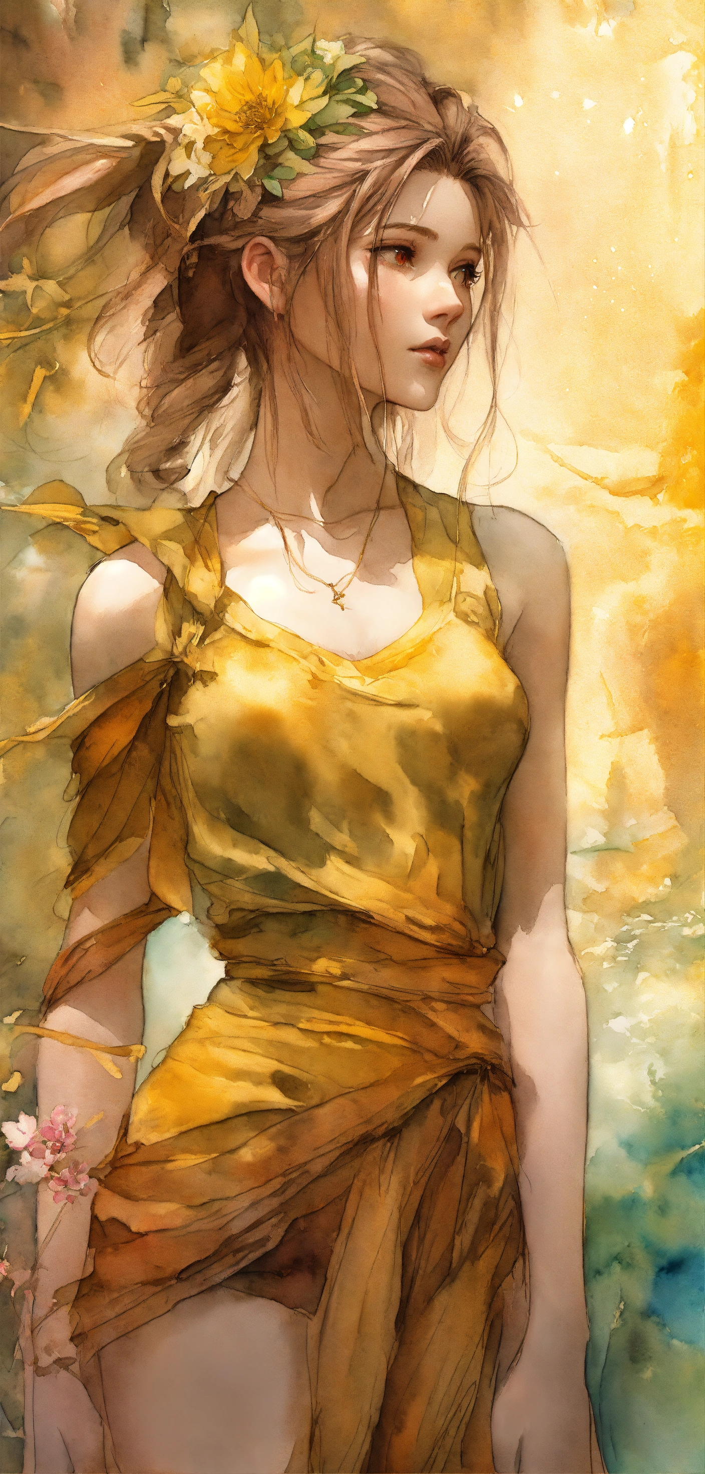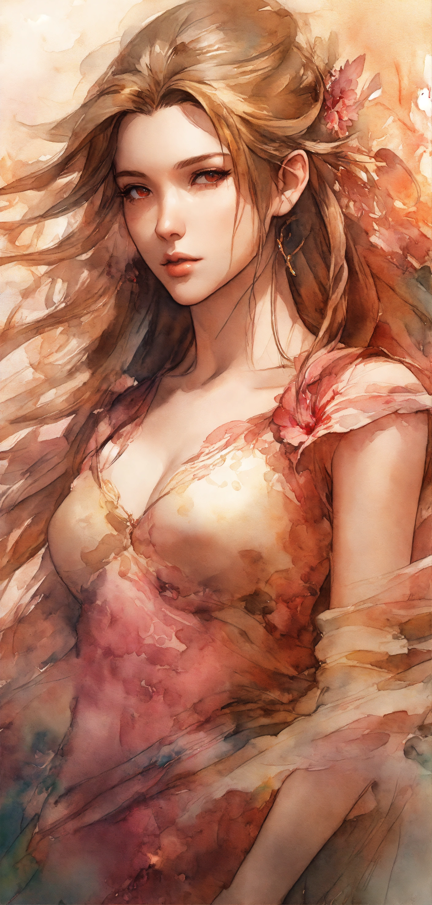 Line art watercolor wash of gorgeous aerith gainsborough from final fantasy vii remake, desnuda, ethereal background, abstract beauty, stand, approaching perfection, pure form, golden ratio, minimalistic, concept art, by brian froud and carne griffiths and wadim kashin and john william waterhouse, intricate details, 8k post production, high resolution, hyperdetailed, trending on artstation, sharp focus, studio photo, intricate details, highly detailed, by greg rutkowski, hands without defects, sculptural body, luxury jewerly, full body