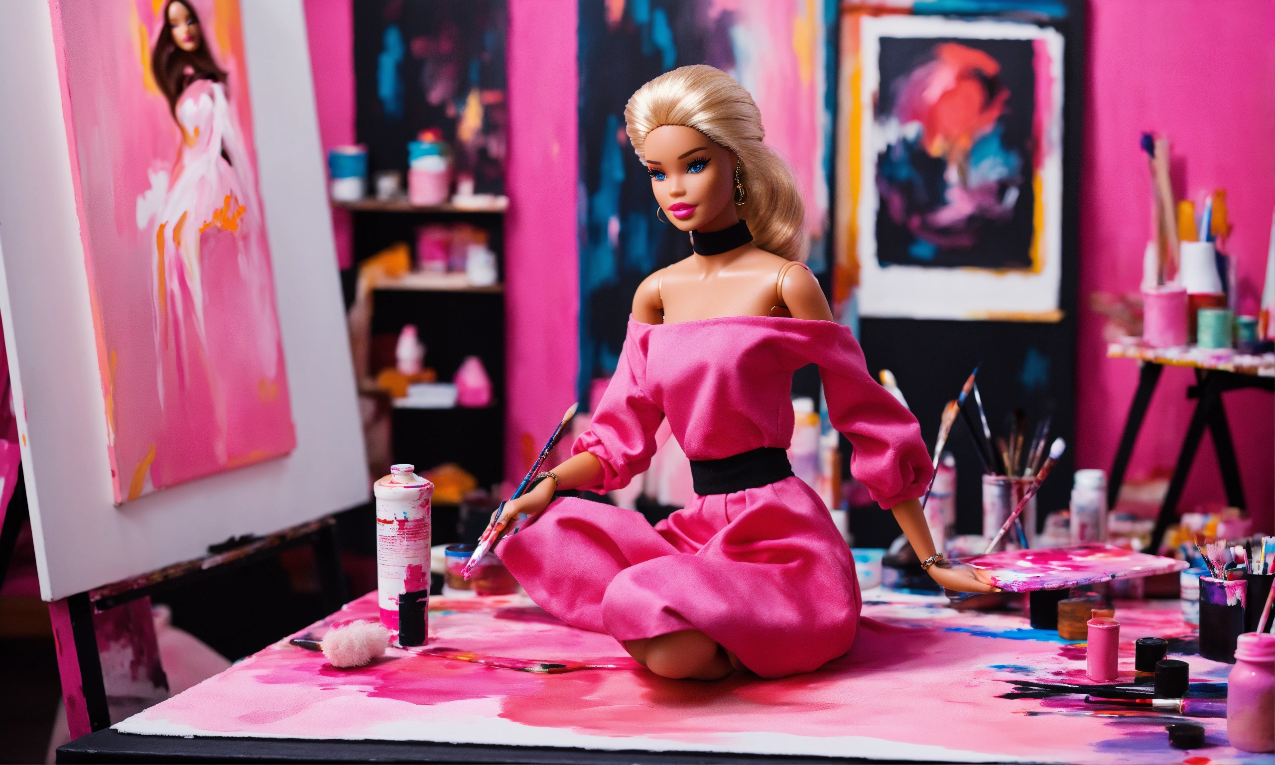 Barbie dolls, career as a art college student, pink, and black fashionable, gorgeous, working in a art studio, painting on abstract canvas