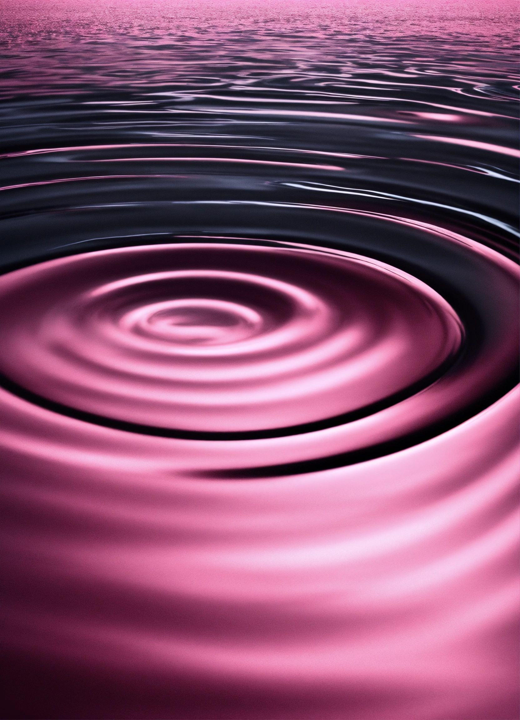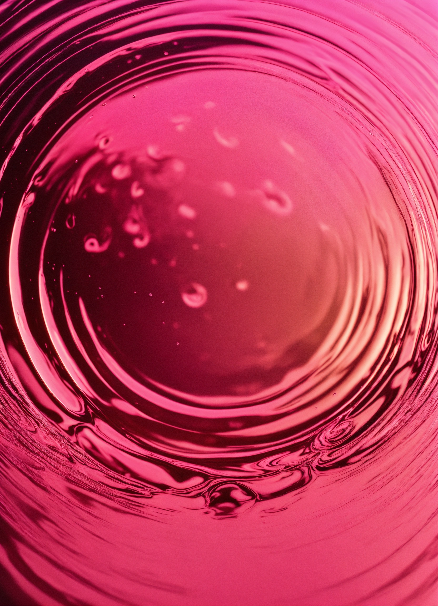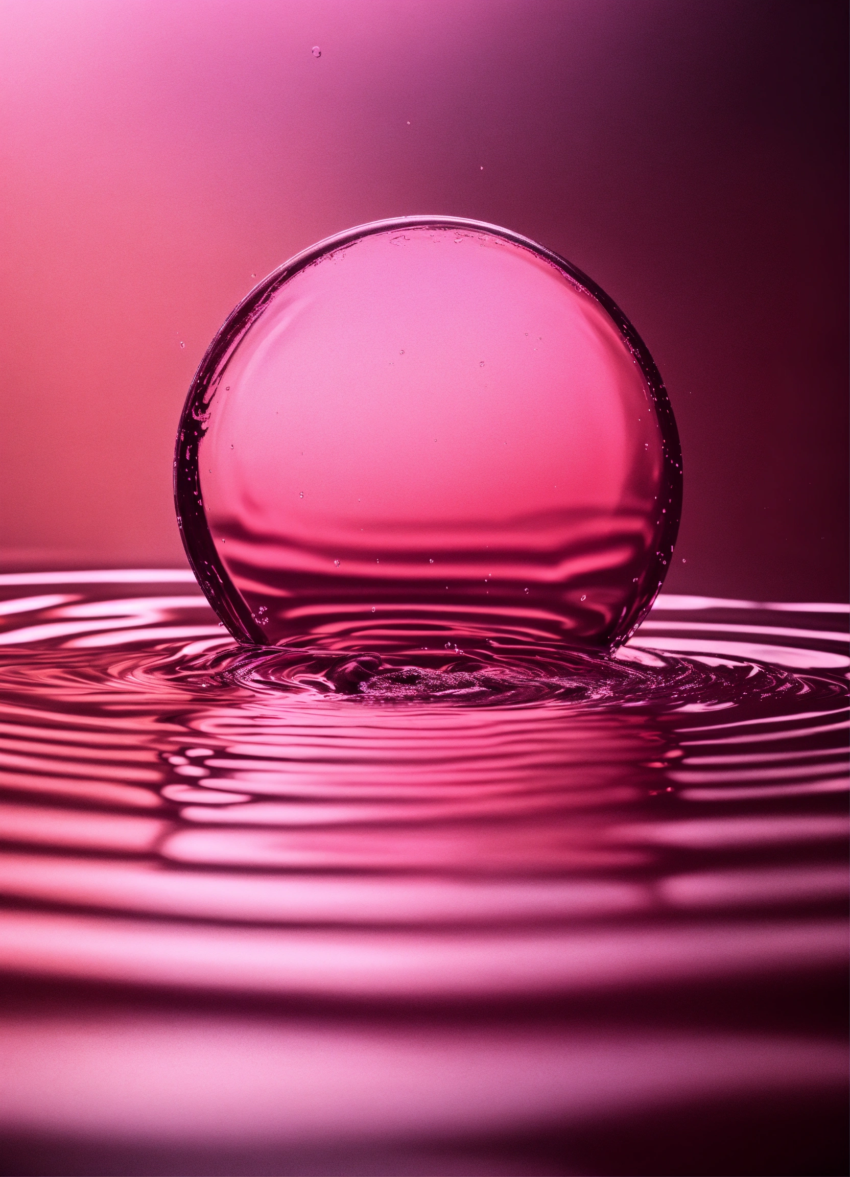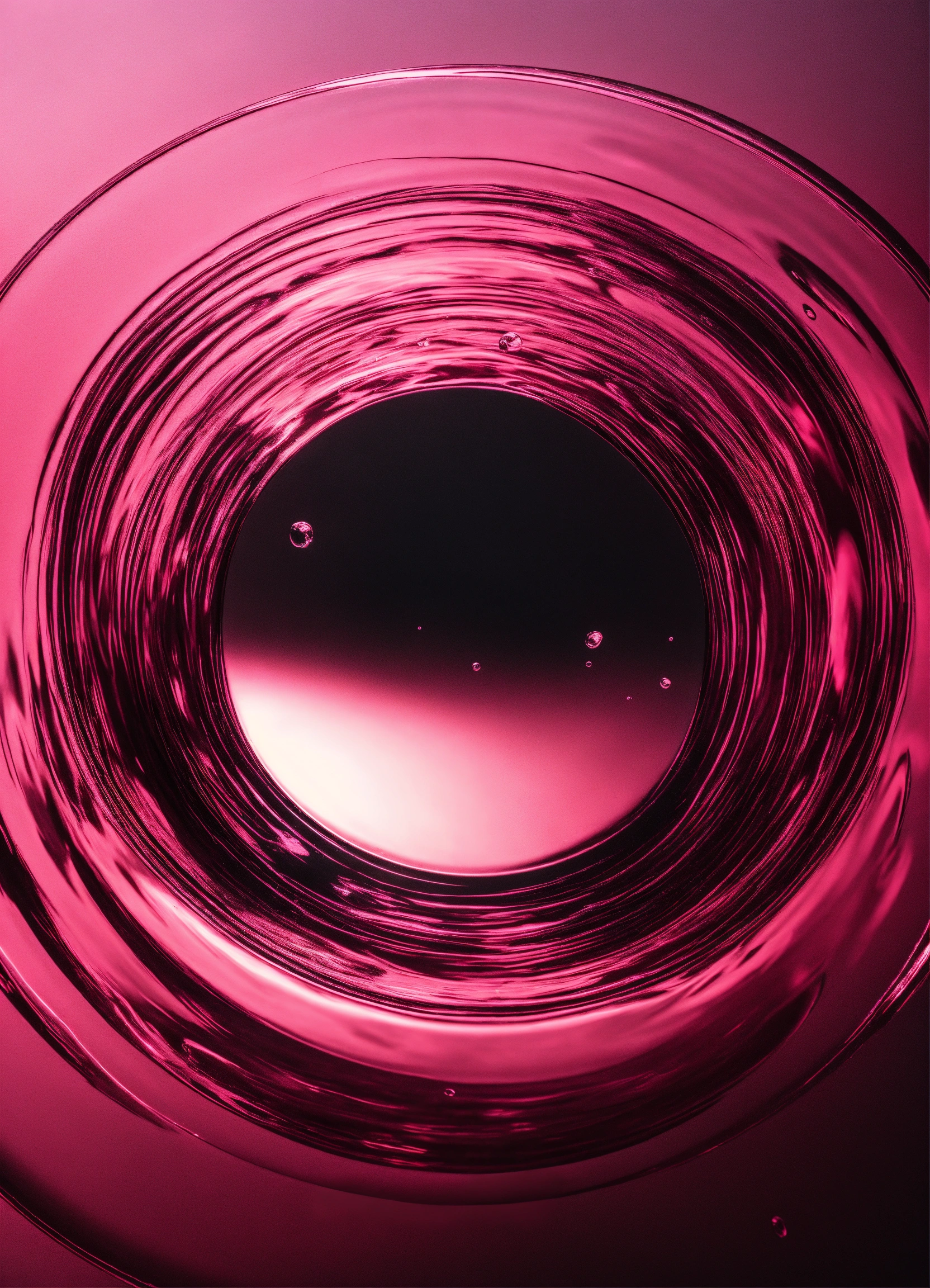 Hyper realistic opaque pink abstract circular metallic frozen water in air with light reflecting on water with black background minimalist