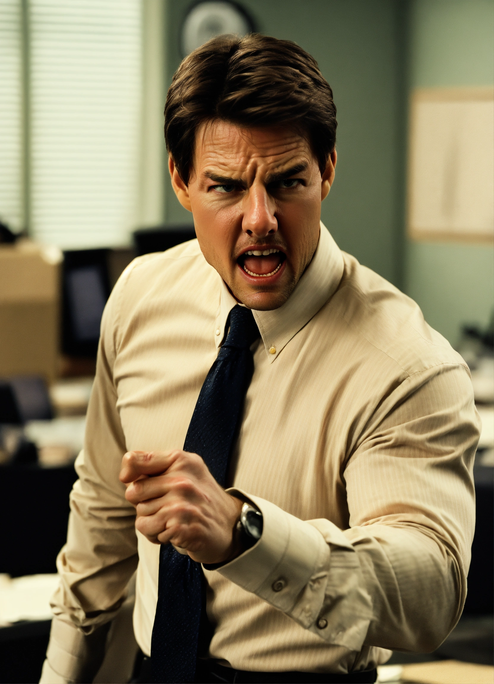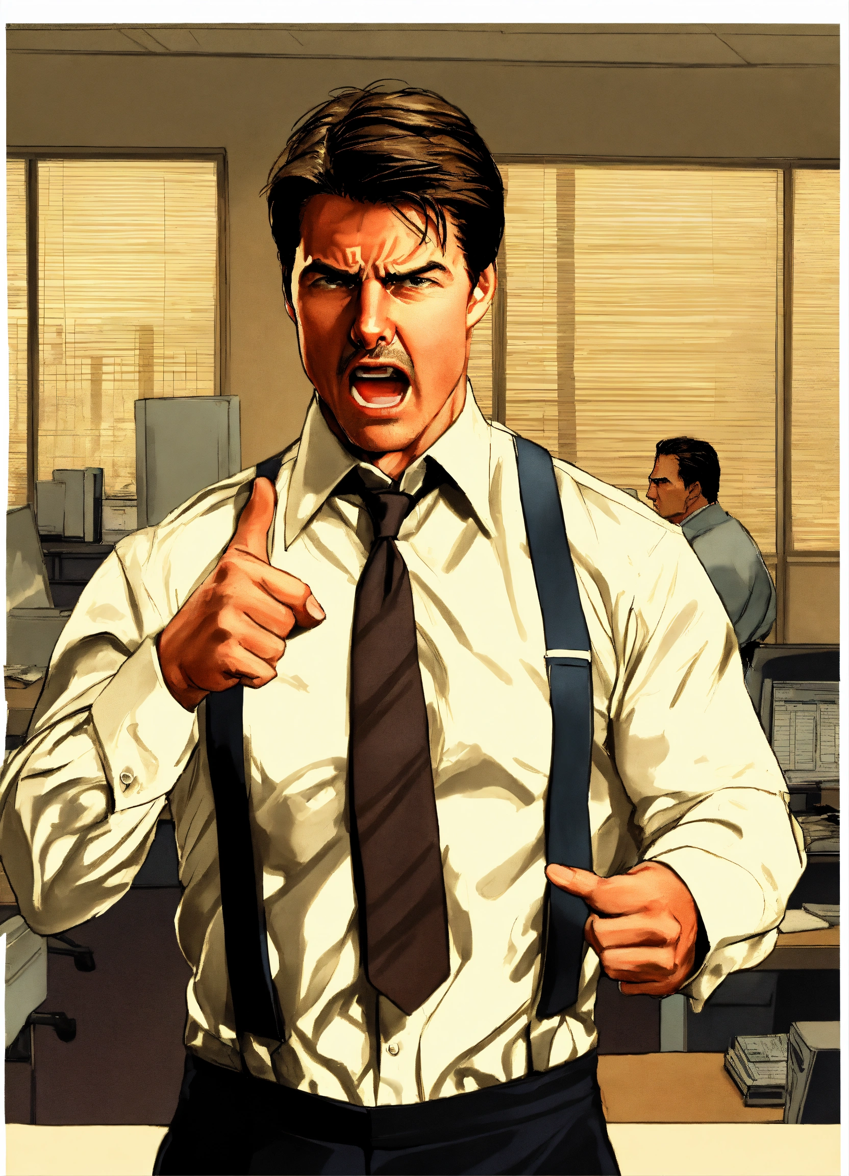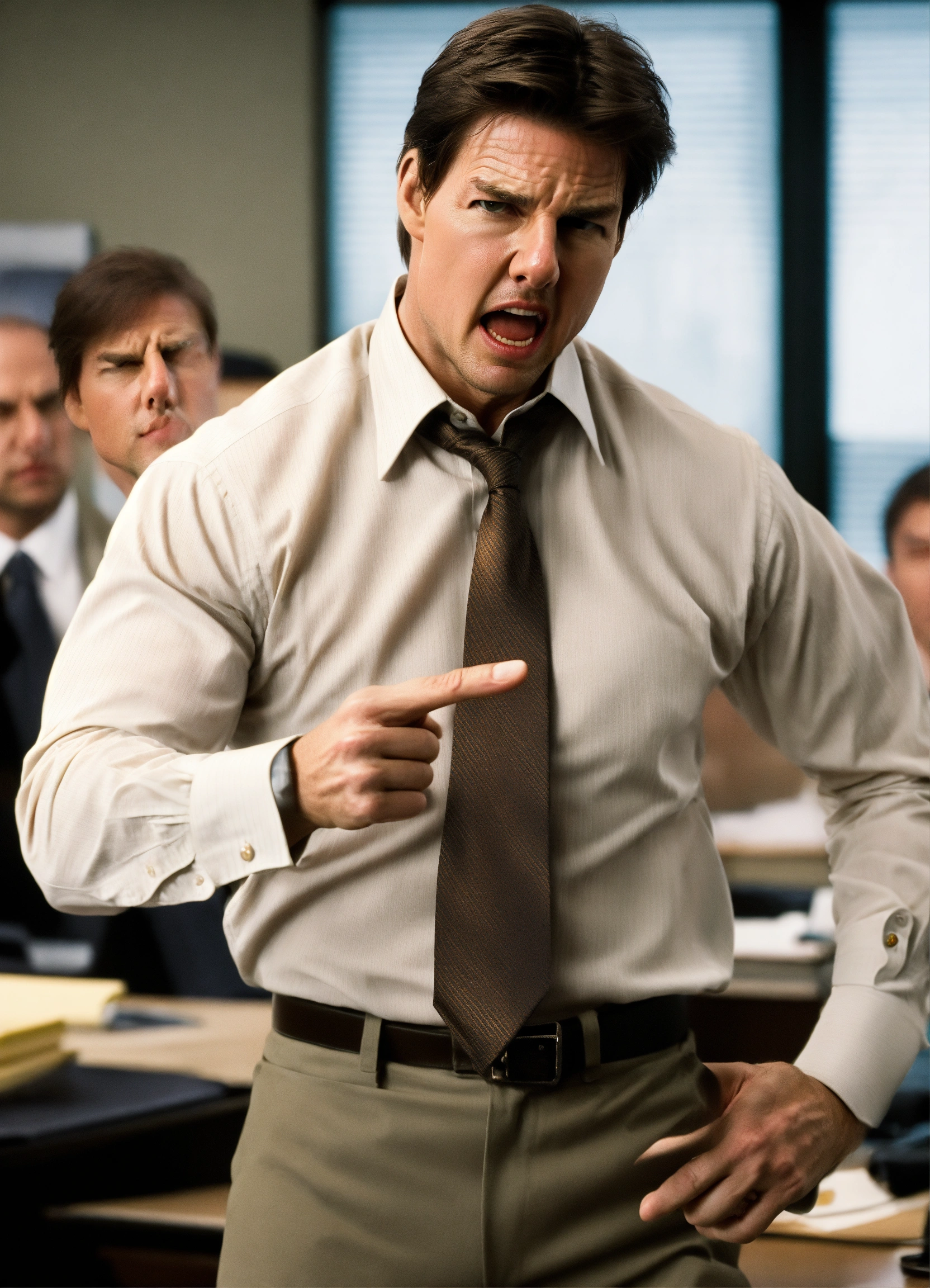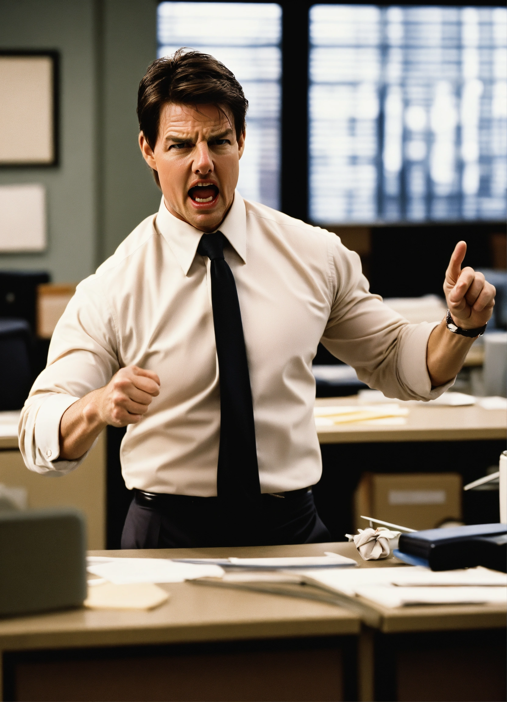 Anger management, angry man, tom cruise, pointing finger, long sleeve shirt with a loose tie in an office space.