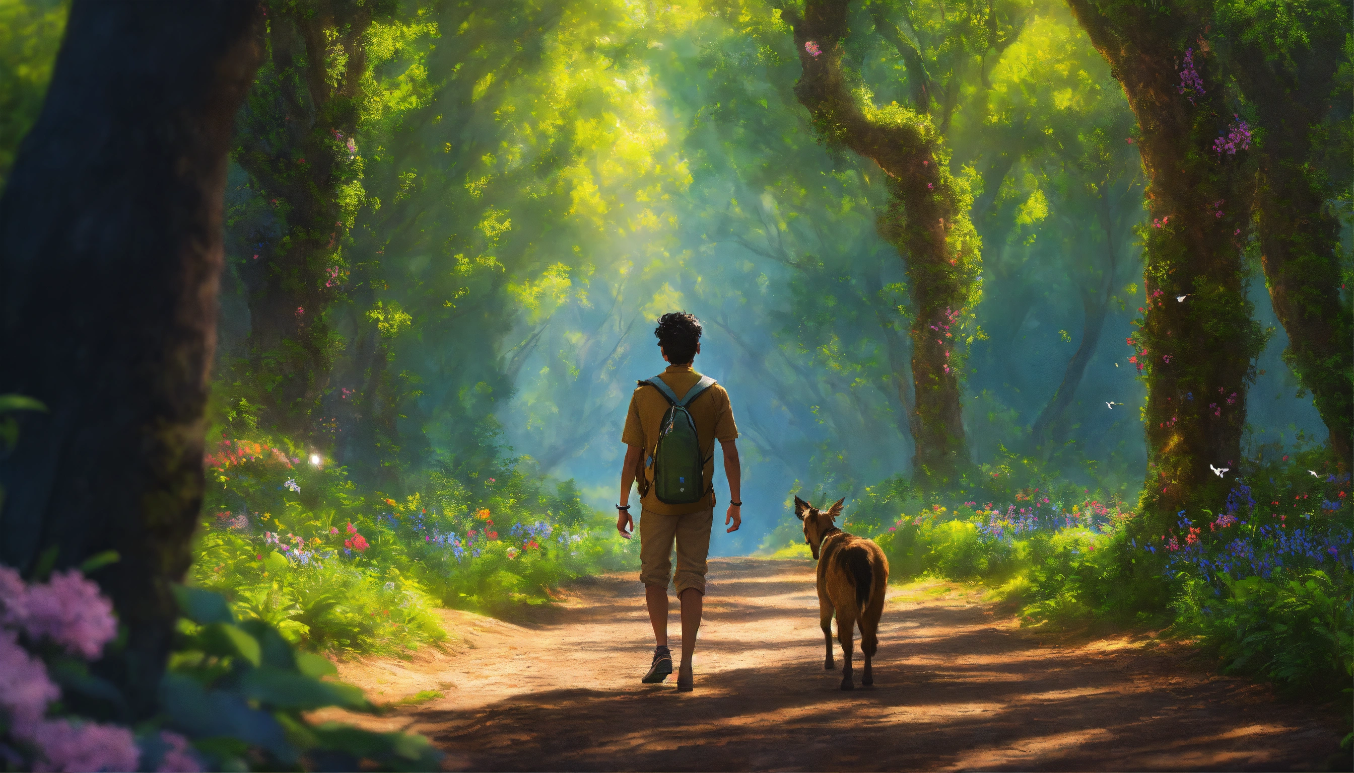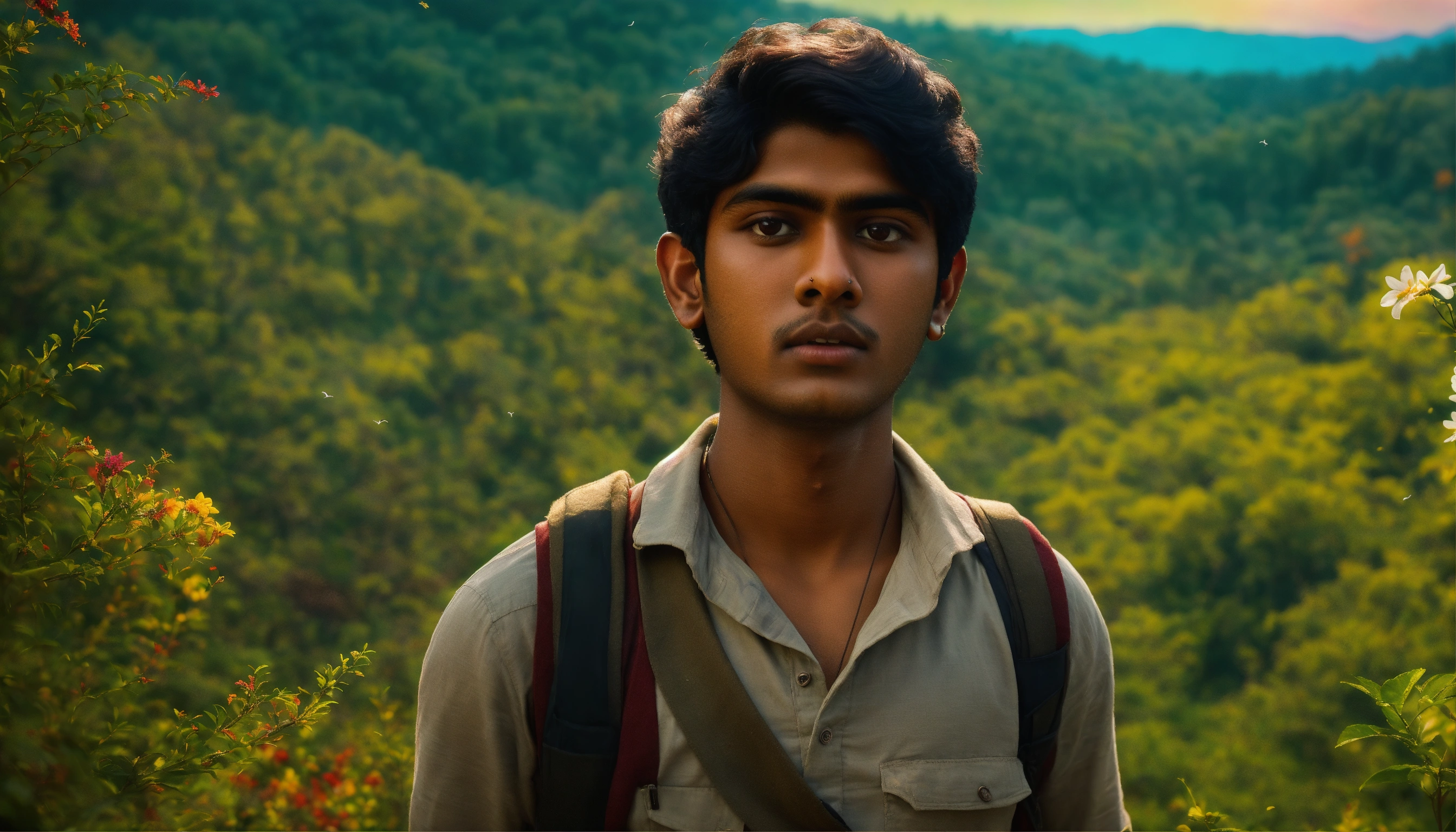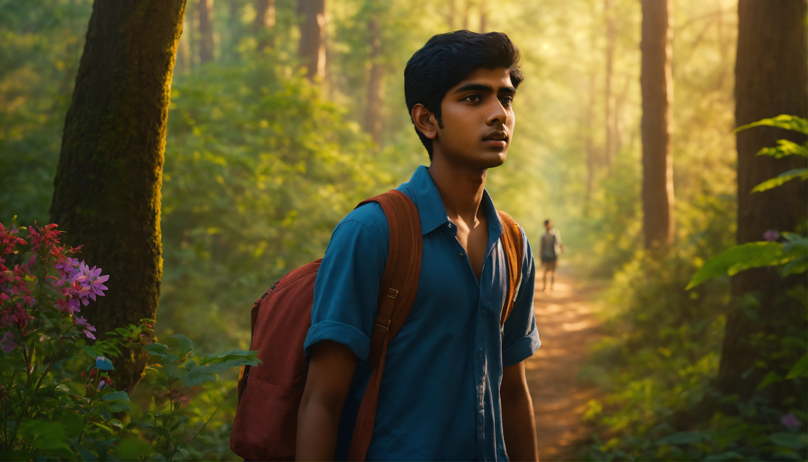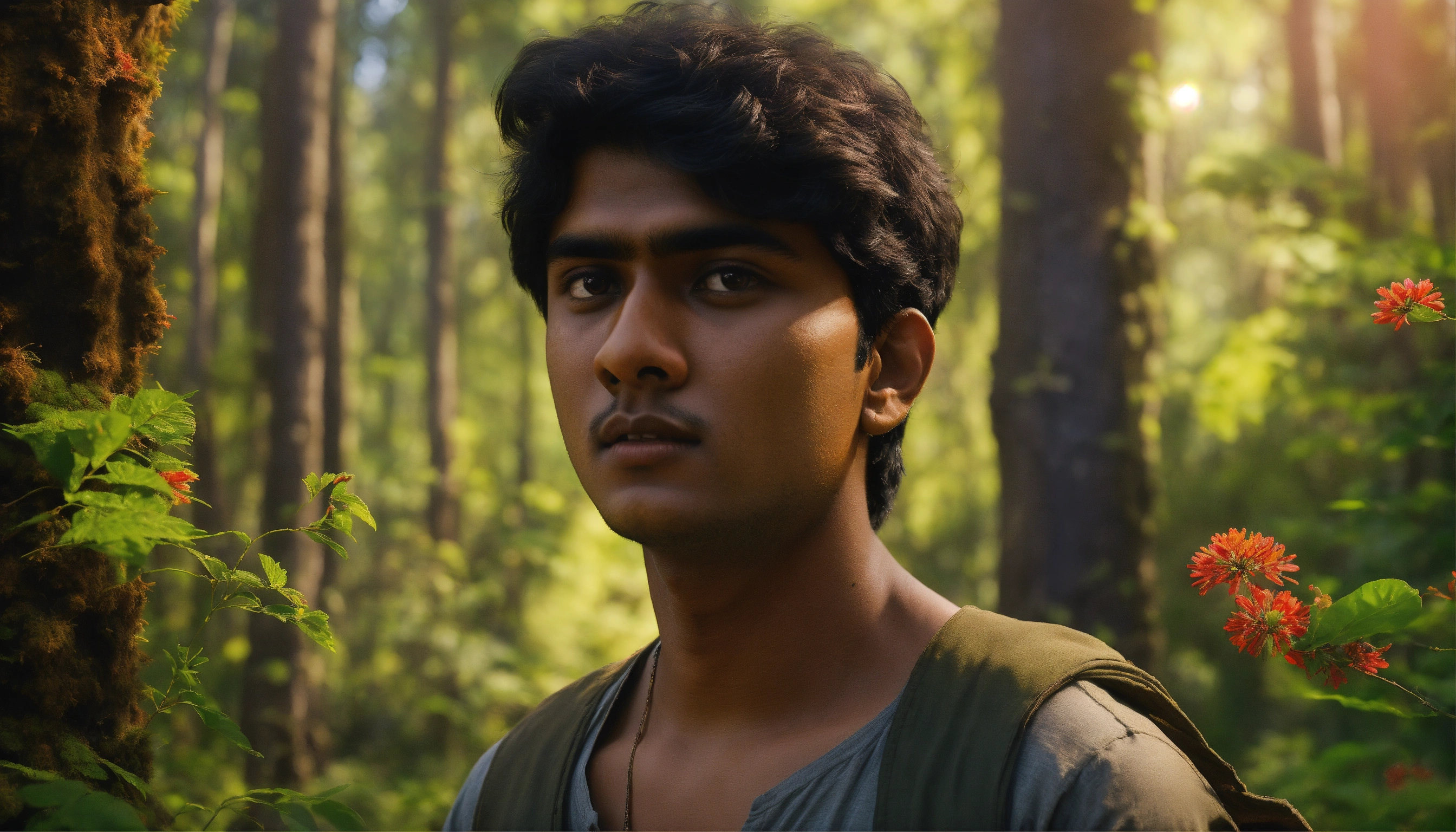 Hyper-realistic portrait of arjun, a 16-year-old indian boy, walking through a thriving forest, beautiful landscapes, with towering trees, colorful wildflowers and a symphony of birdsong. 8k