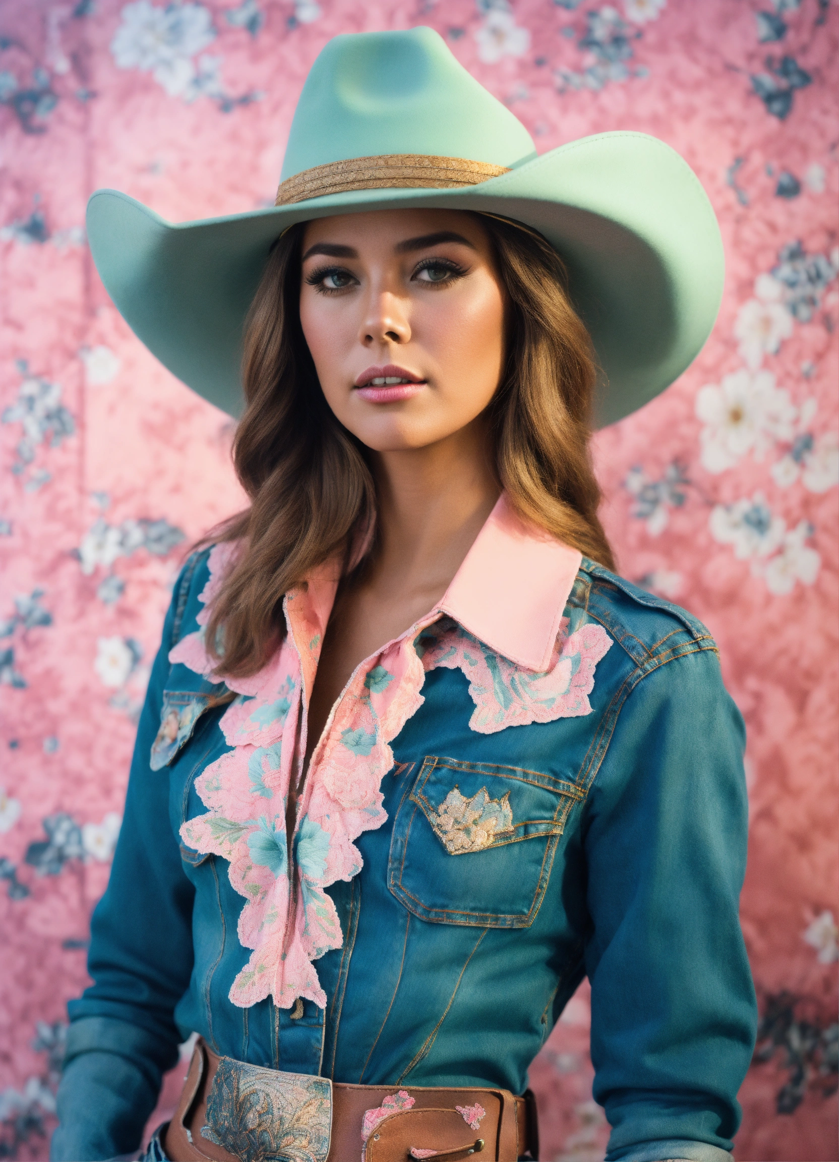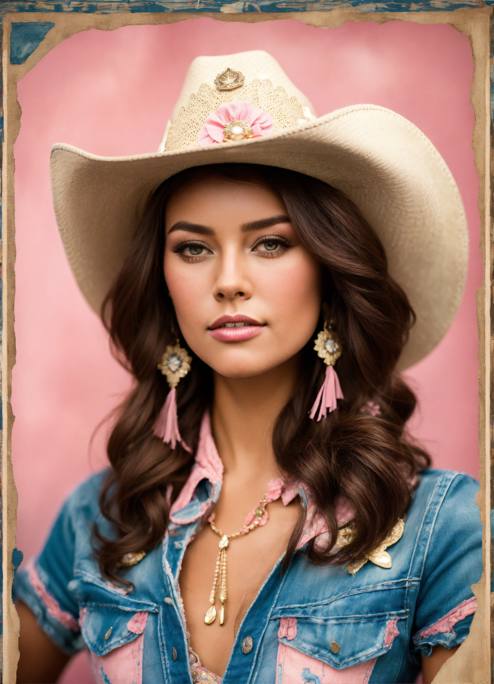 News quest, collage style, portrait of a southern beauty queen wearing a denim wild west outfit and pastel pink cowboy hat. 3d hyperpop, organic patterns, nikon 750, muted background color