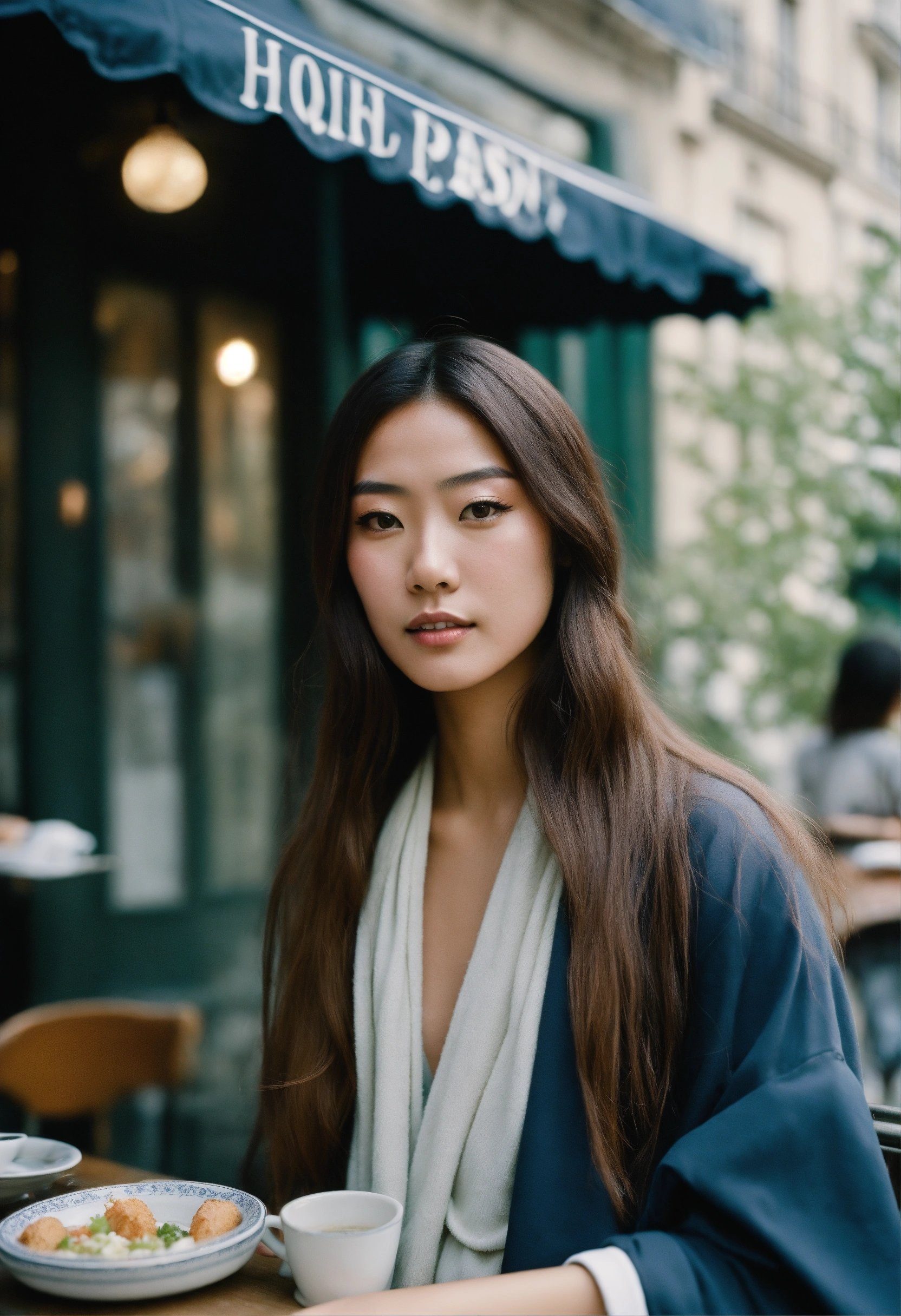 Portrait of a beautiful japanese fashion model with long flowing hair and a sporty athleisure outfit, ethereal dreamy foggy, photoshoot by henri cartier bresson, editorial fashion magazine photoshoot, fashion poses, in front of parisian café terrace. kinfolk magazine. film grain. a soft smile