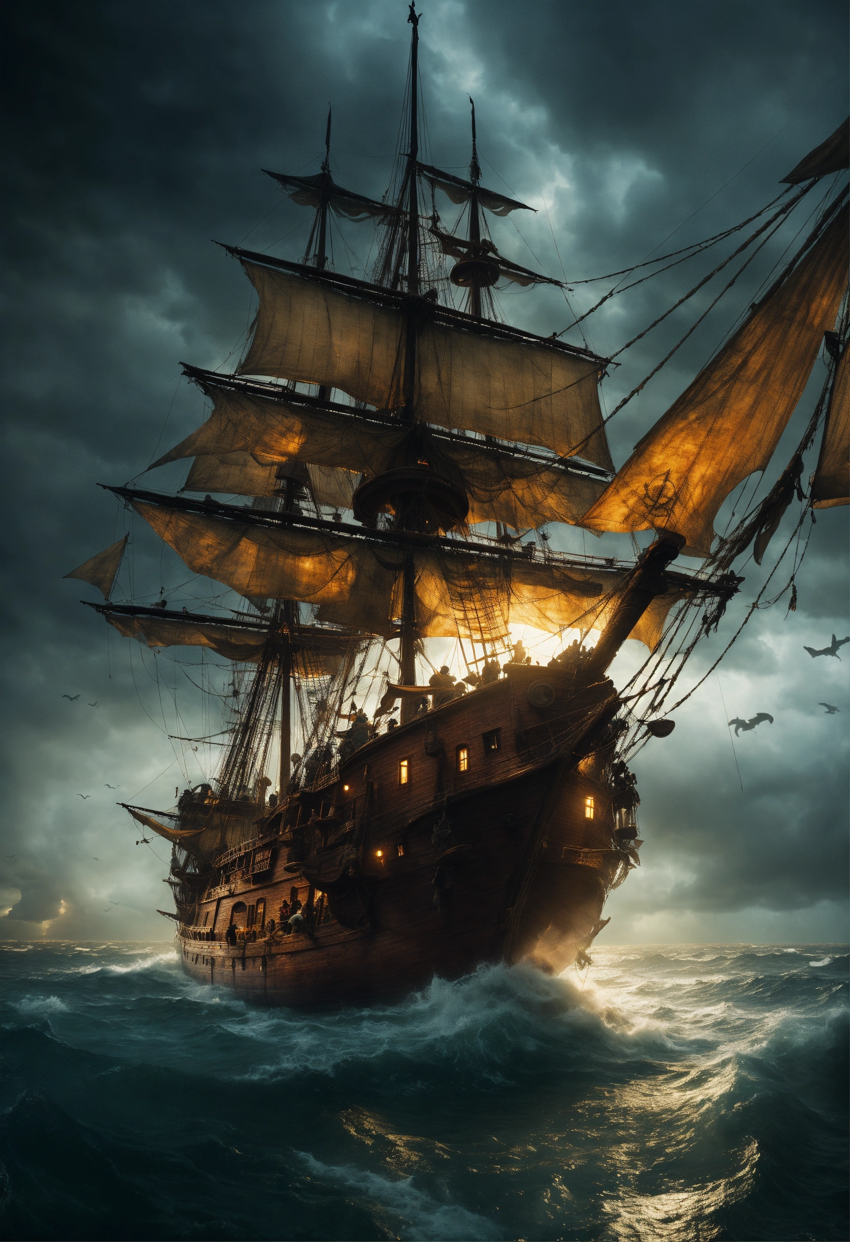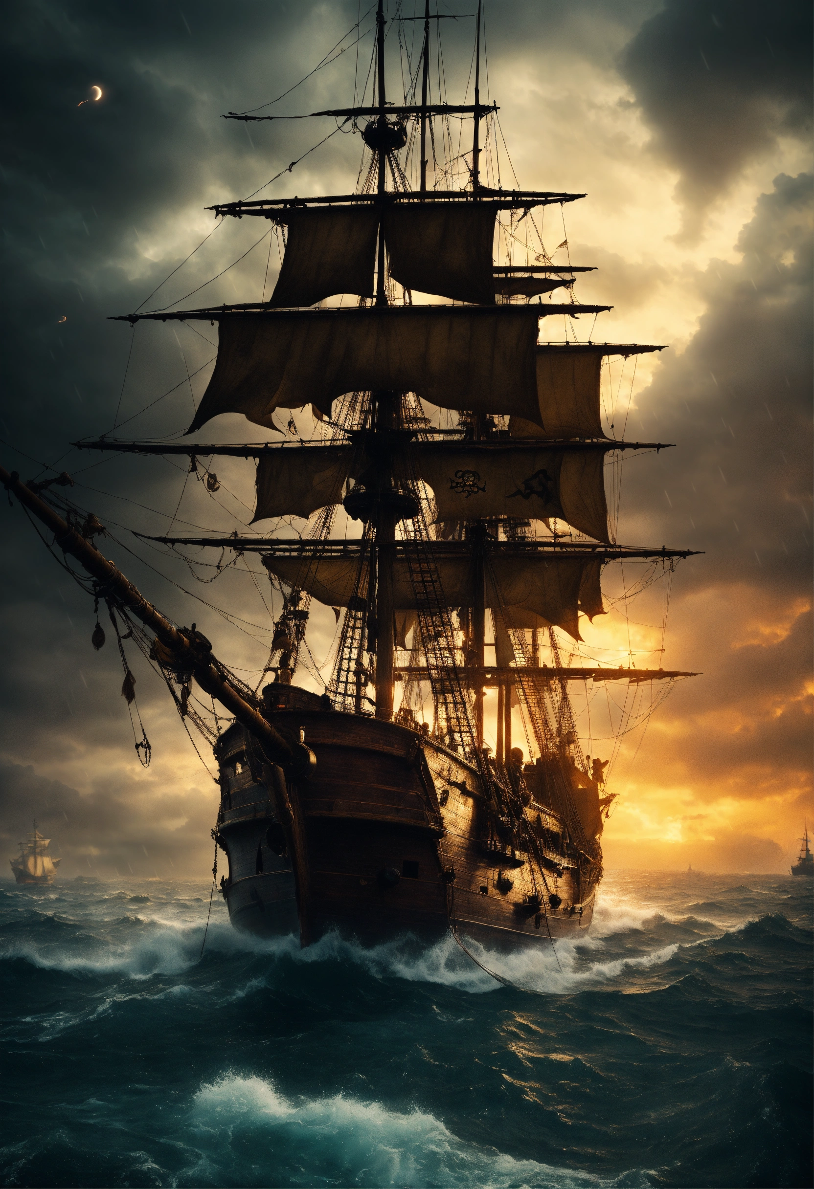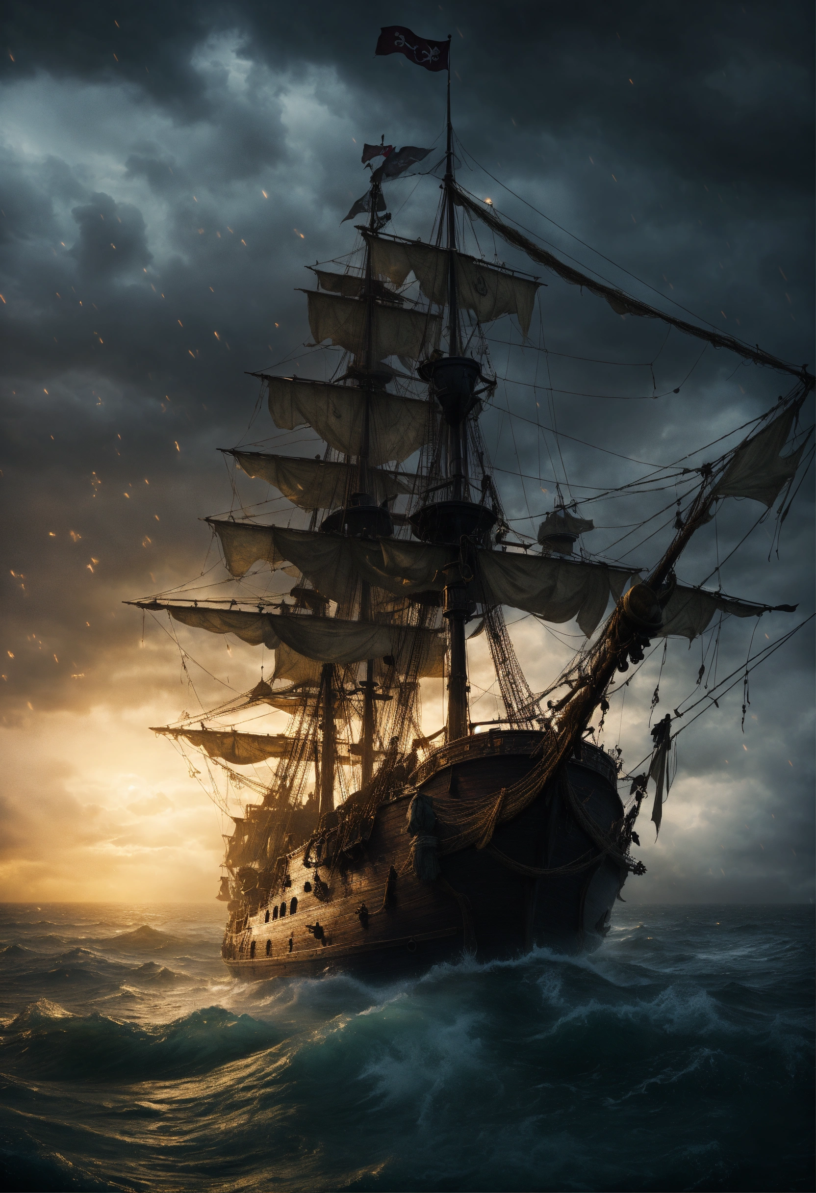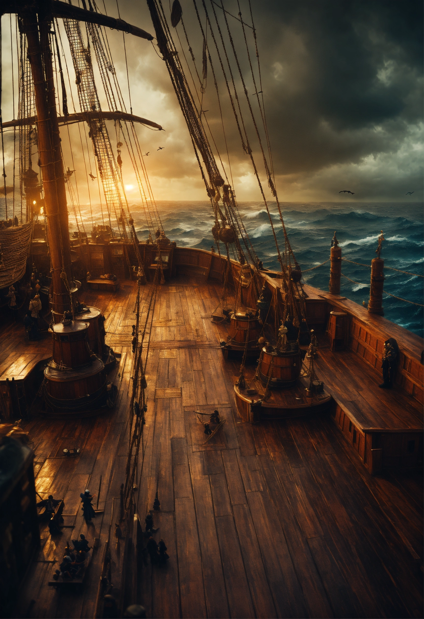 An epic fantasy scene featuring pirates on a ship deck. close view. stormy atmosphere. cinematic view, sharp detail.
