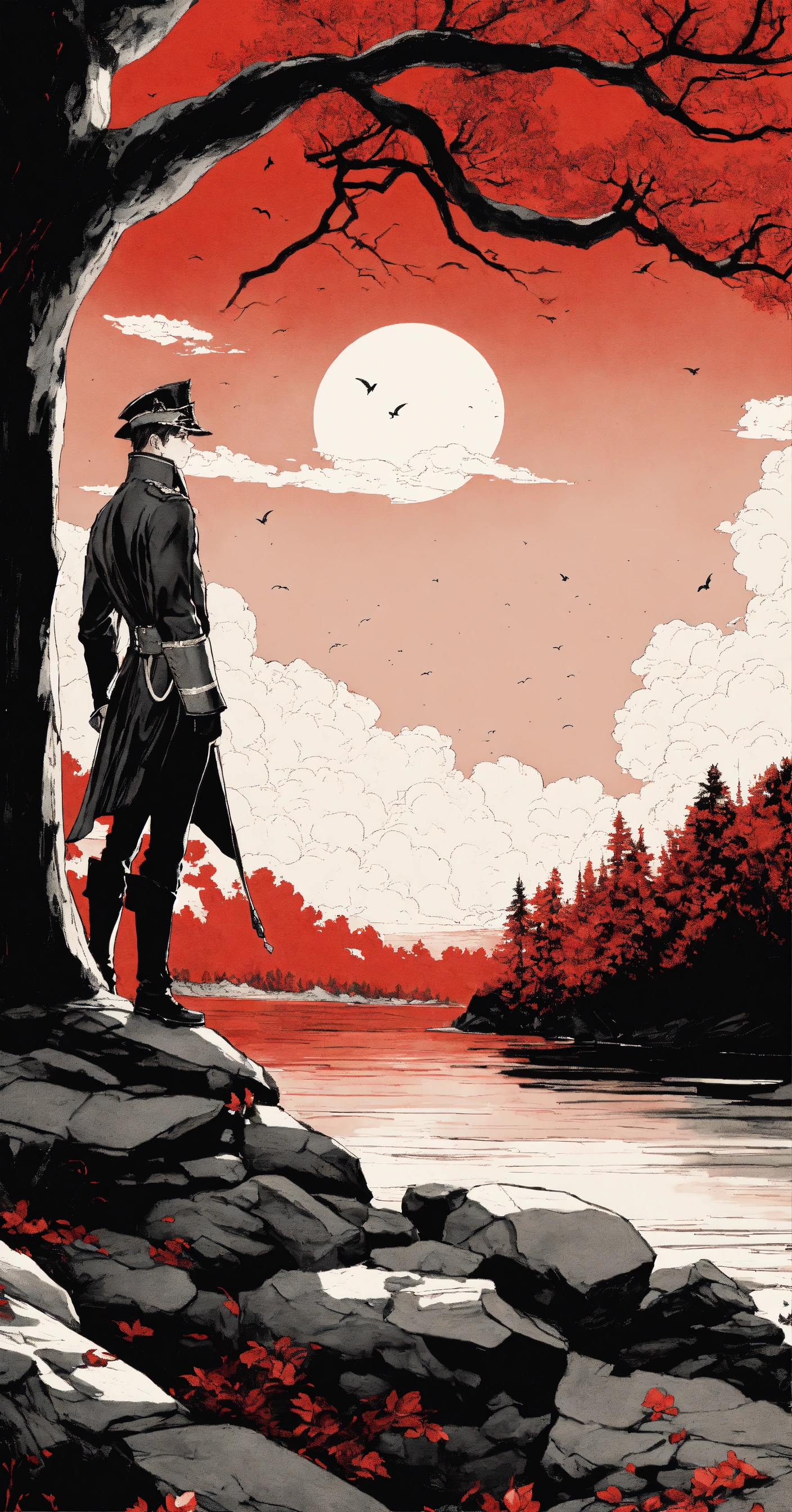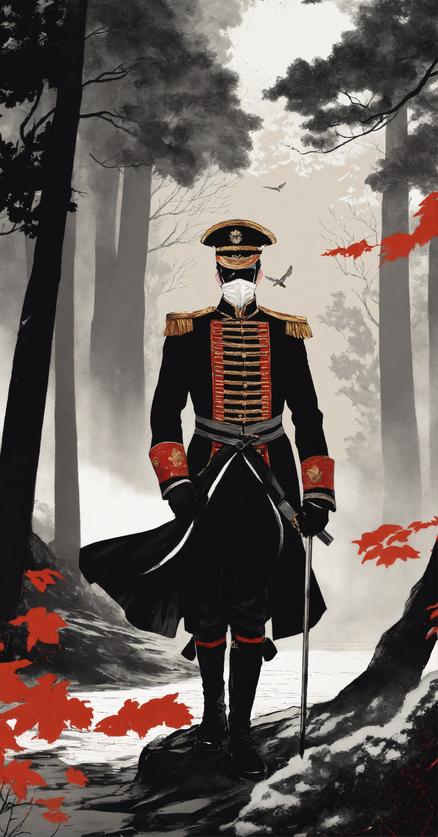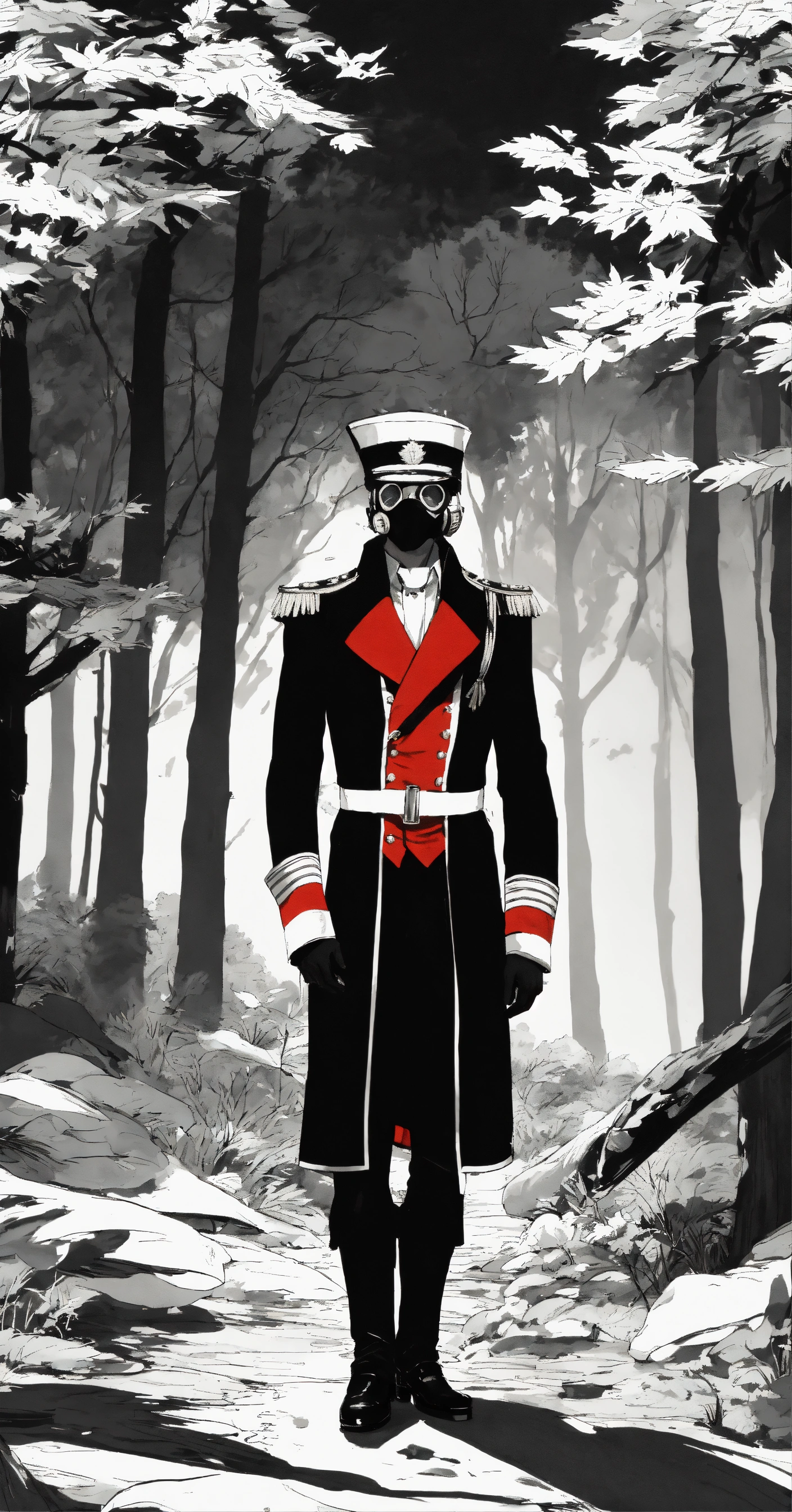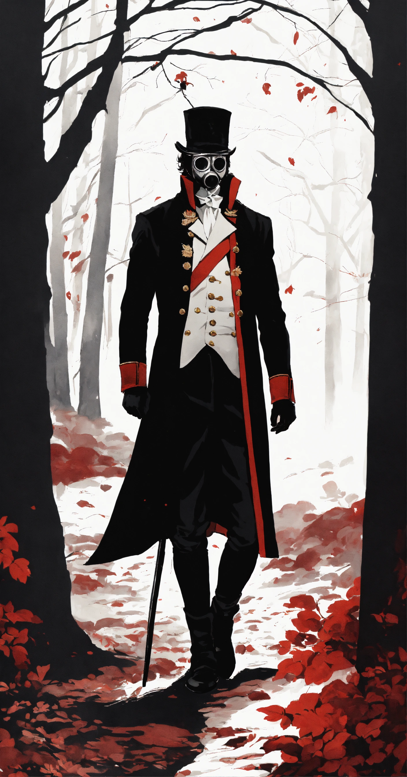 Create a monochrome ink scene inspired by the napoleonic empire style, depicting a young man elegantly dressed in attire from that era. he stands in a low-angle shot, facing an immense forest with white leaves. additionally, adorn the young man with a gas mask resembling a bird's head, reminiscent of the plague masks. ensure that you use only the colors black, white, and red for this illustration, and capture the aesthetics of a graphic novel by an author.