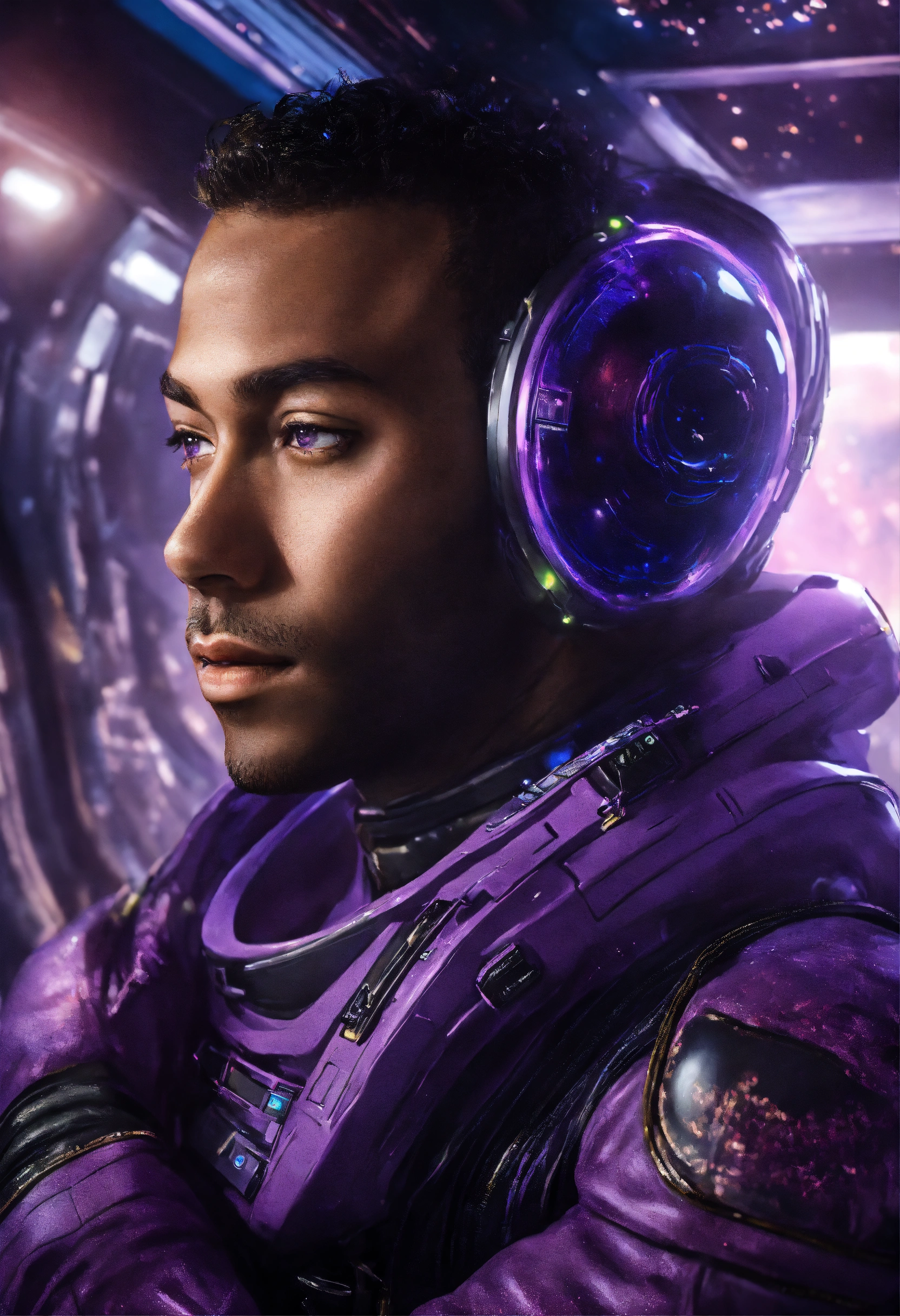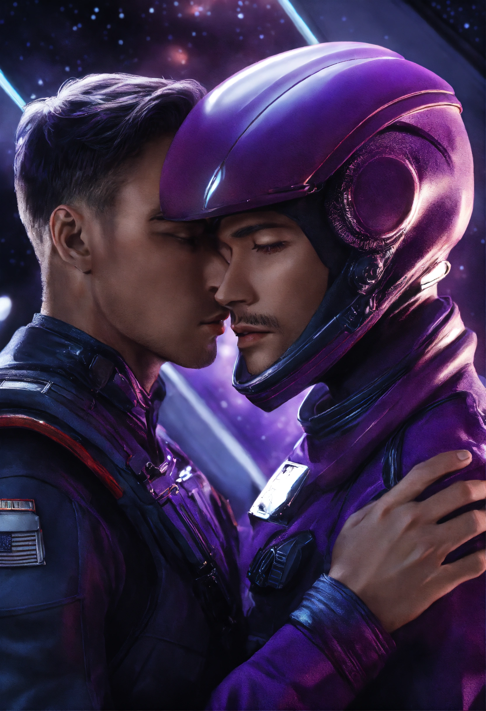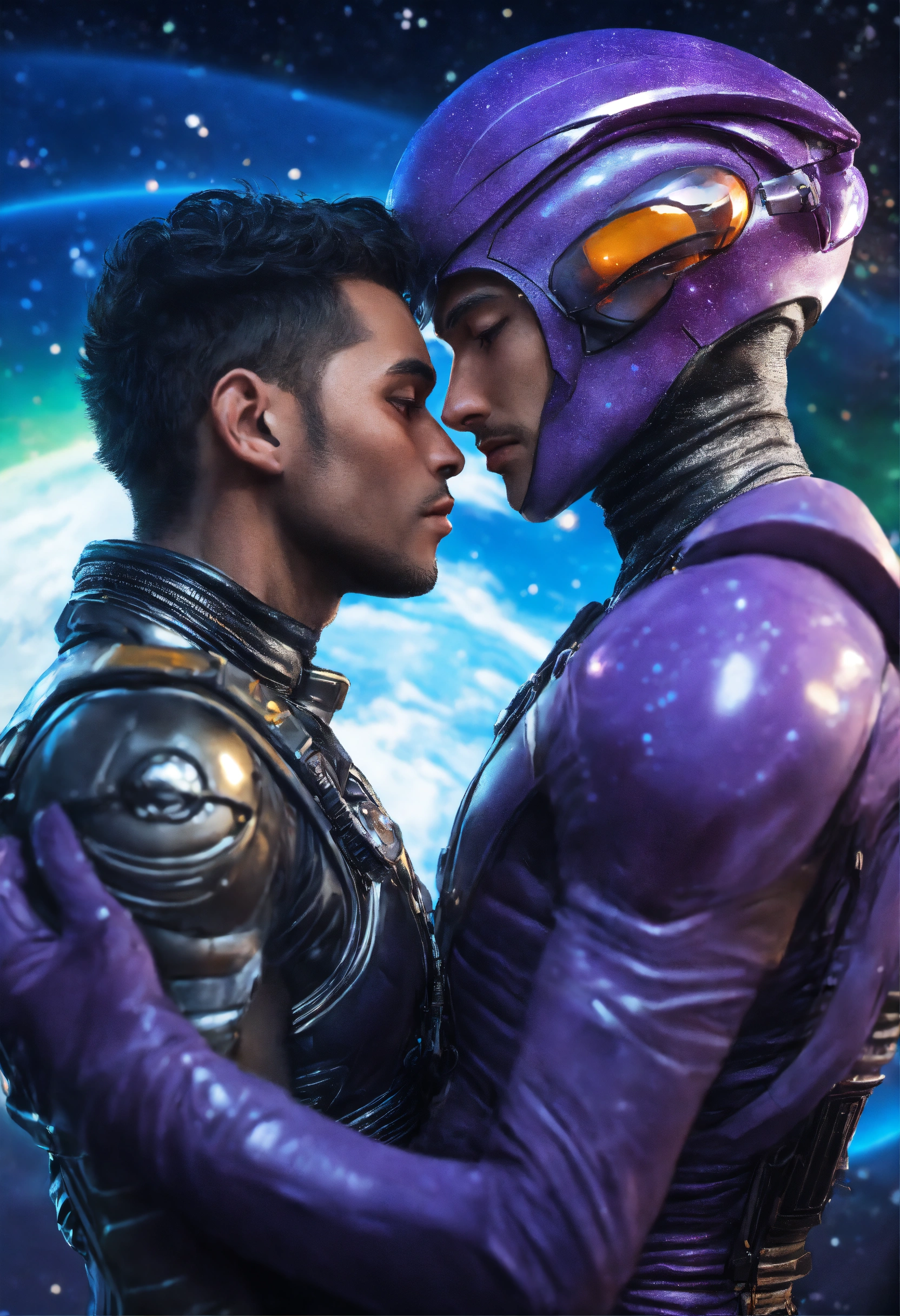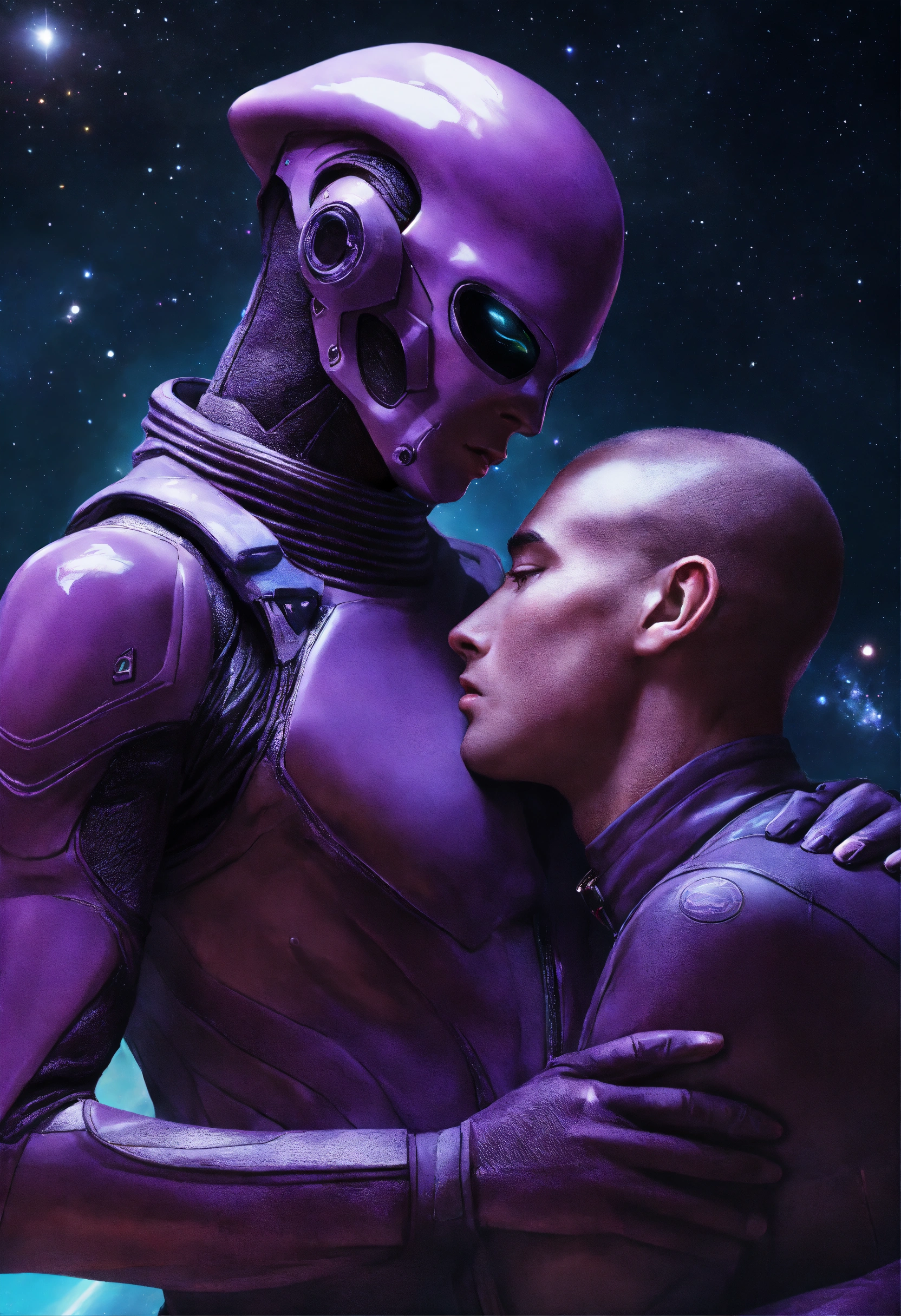 Alien male masculine with purple skin and a masculine human male in a space uniform embracing, photorealism