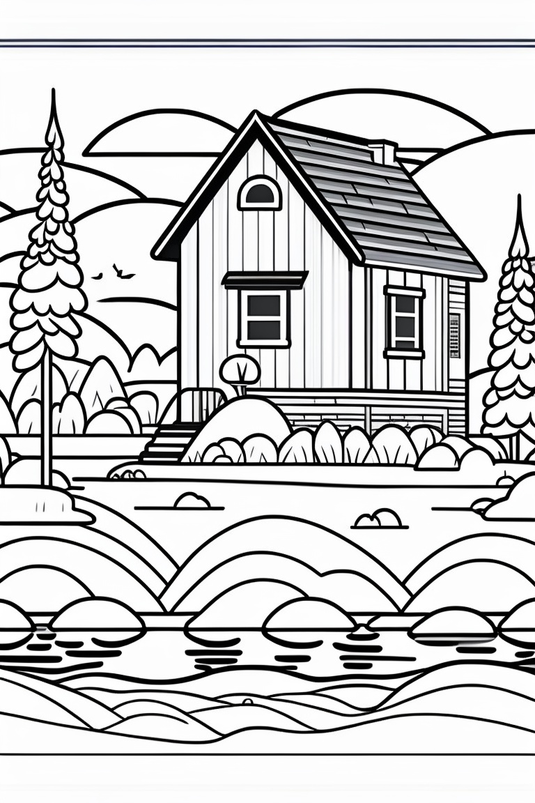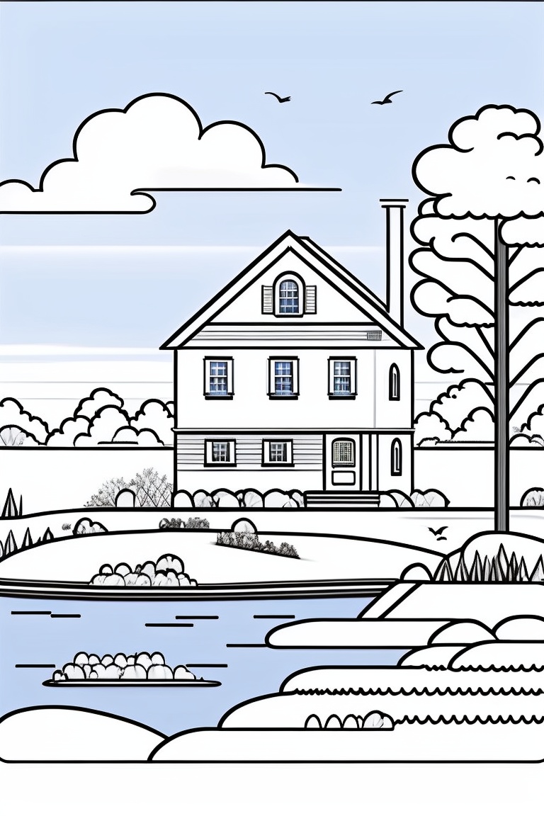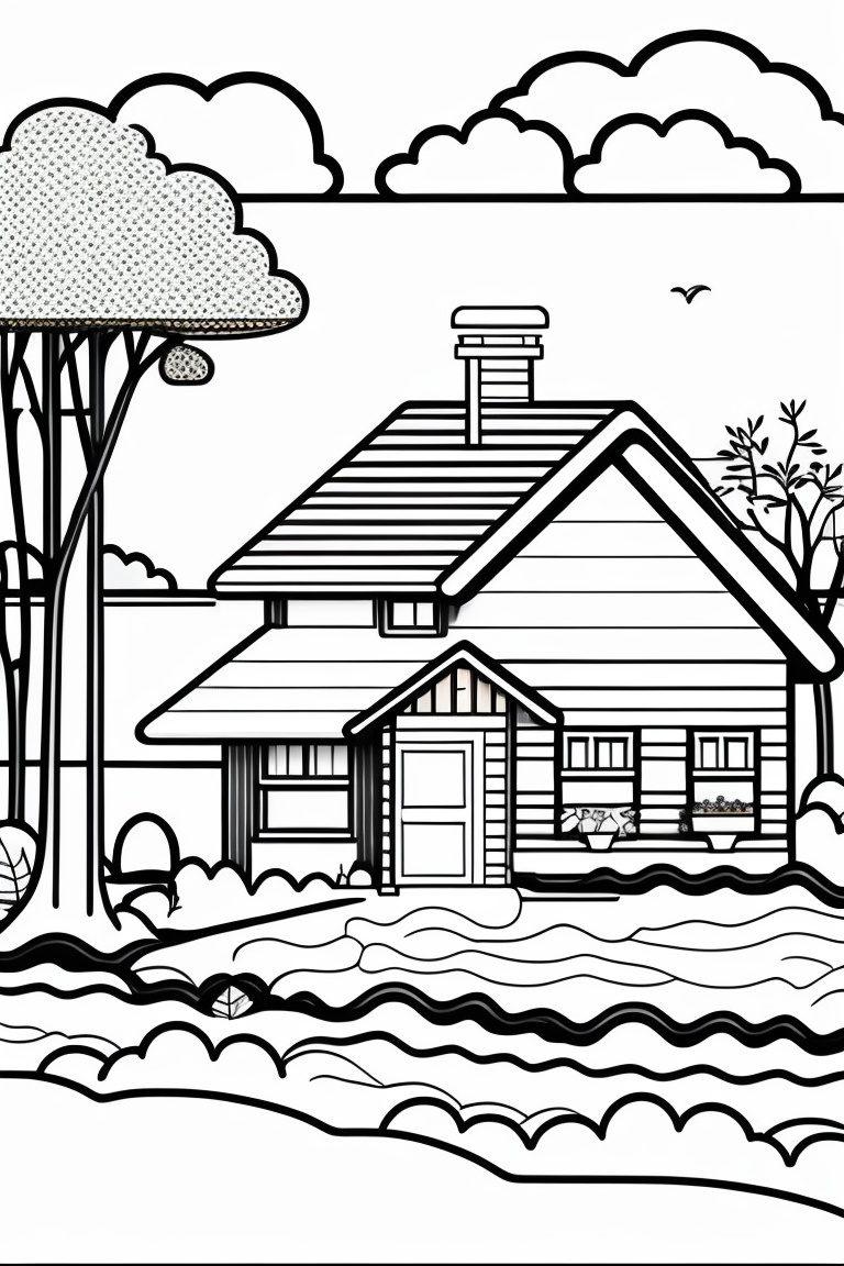 Cute house on the edge of the river, coloring book page, simple and clean line art, children drawing book. black and white, crisp black lines, sharp lines, simple coloring page for kids, cartoon style.