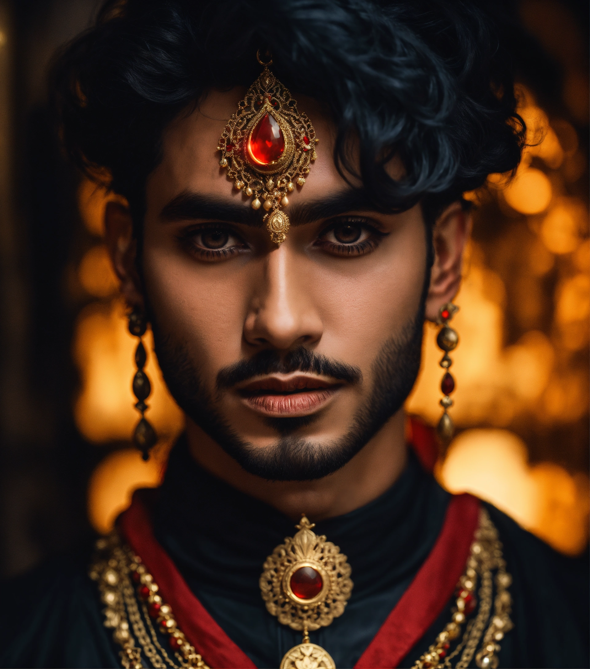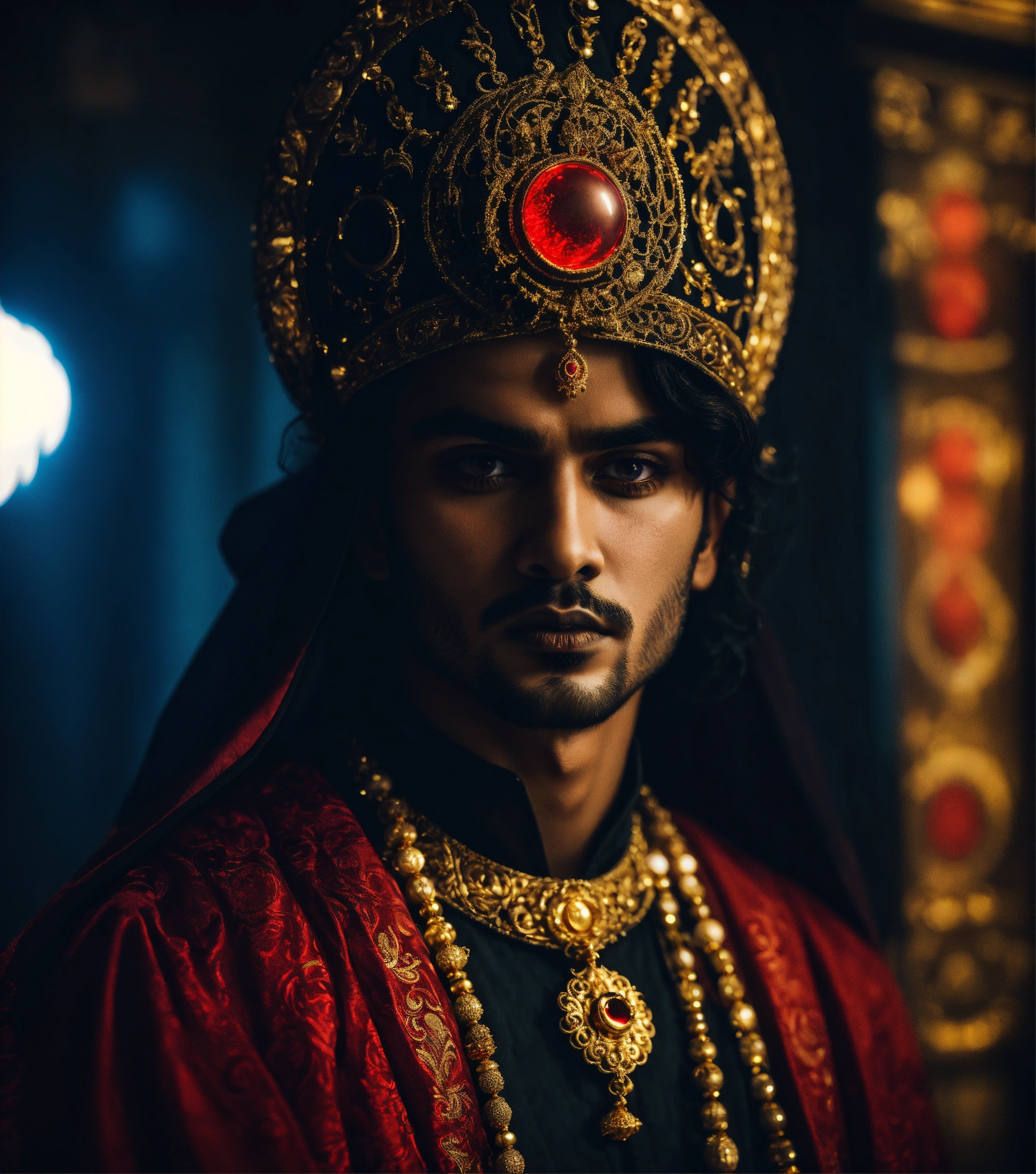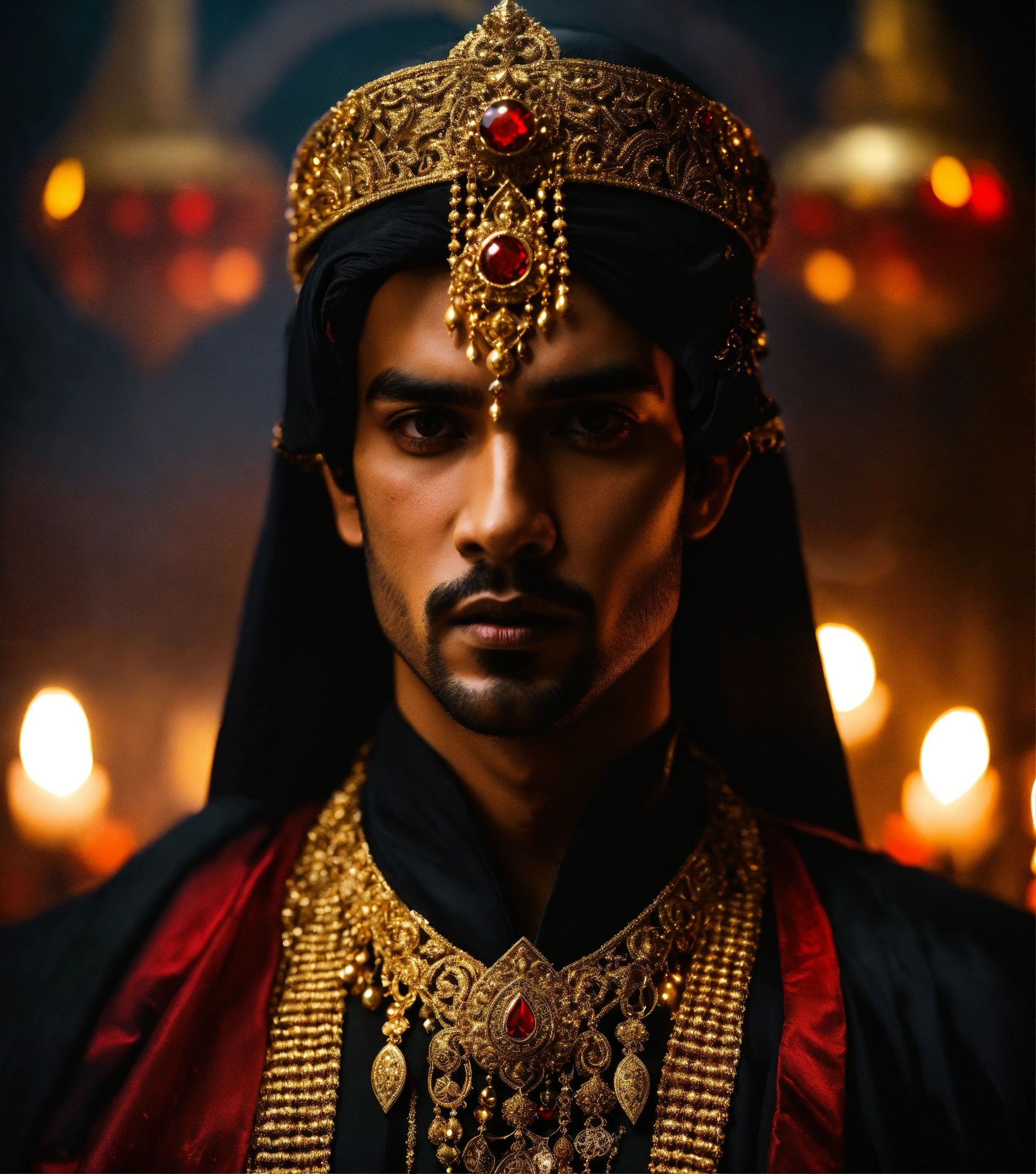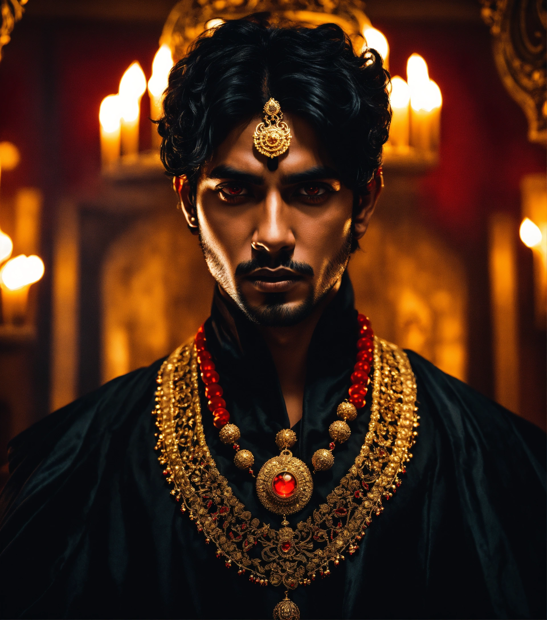 Dark, mysterious and dramatic headshot of a young handsome south asian evil sorcerer with glowing red hypnotising eyes wearing black elaborate robes and ornate gold jewellery in a sinister dimly lit occult temple