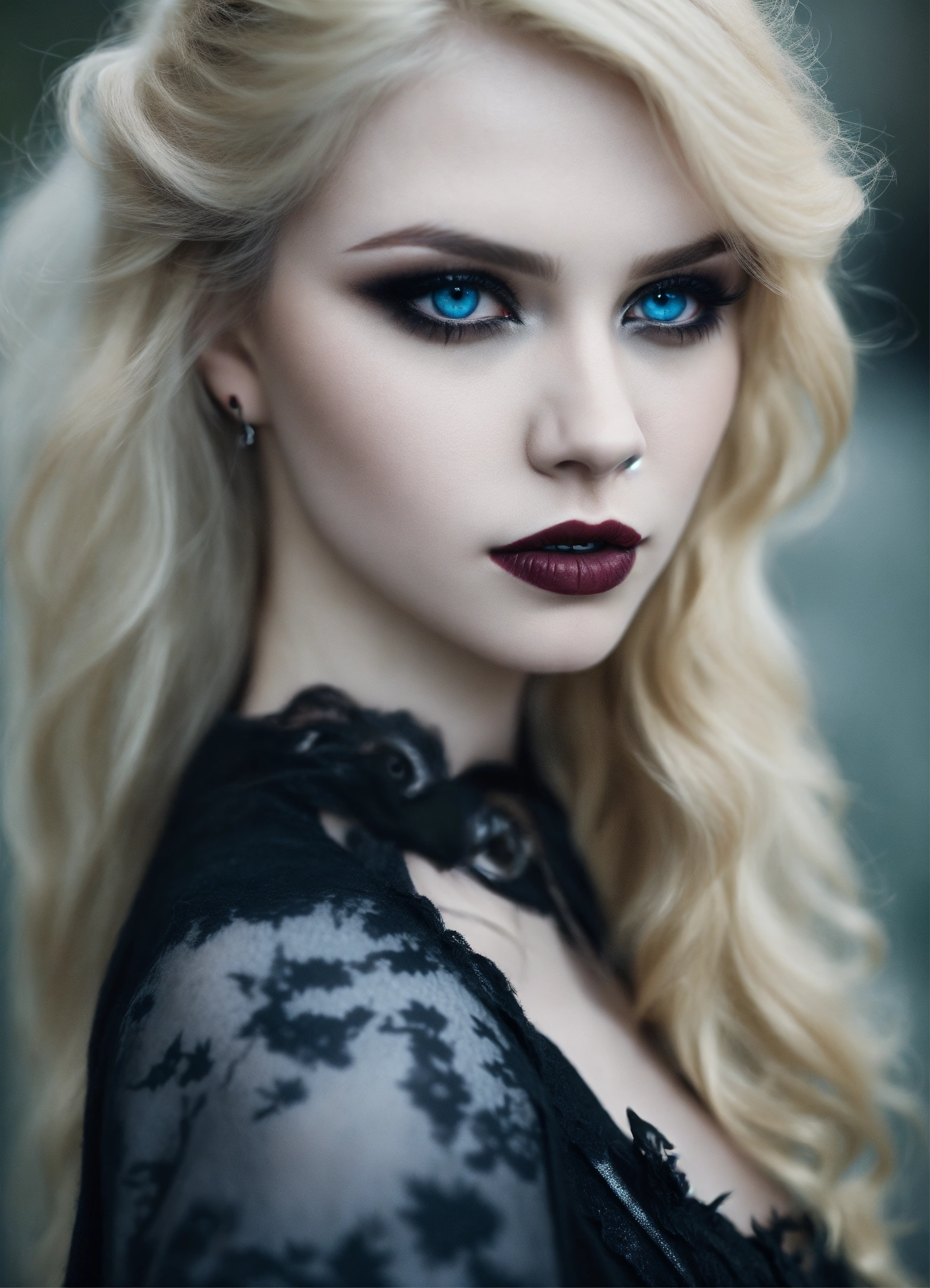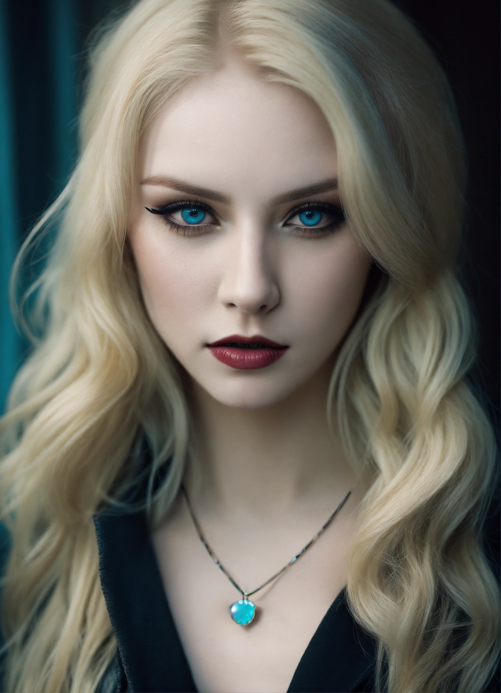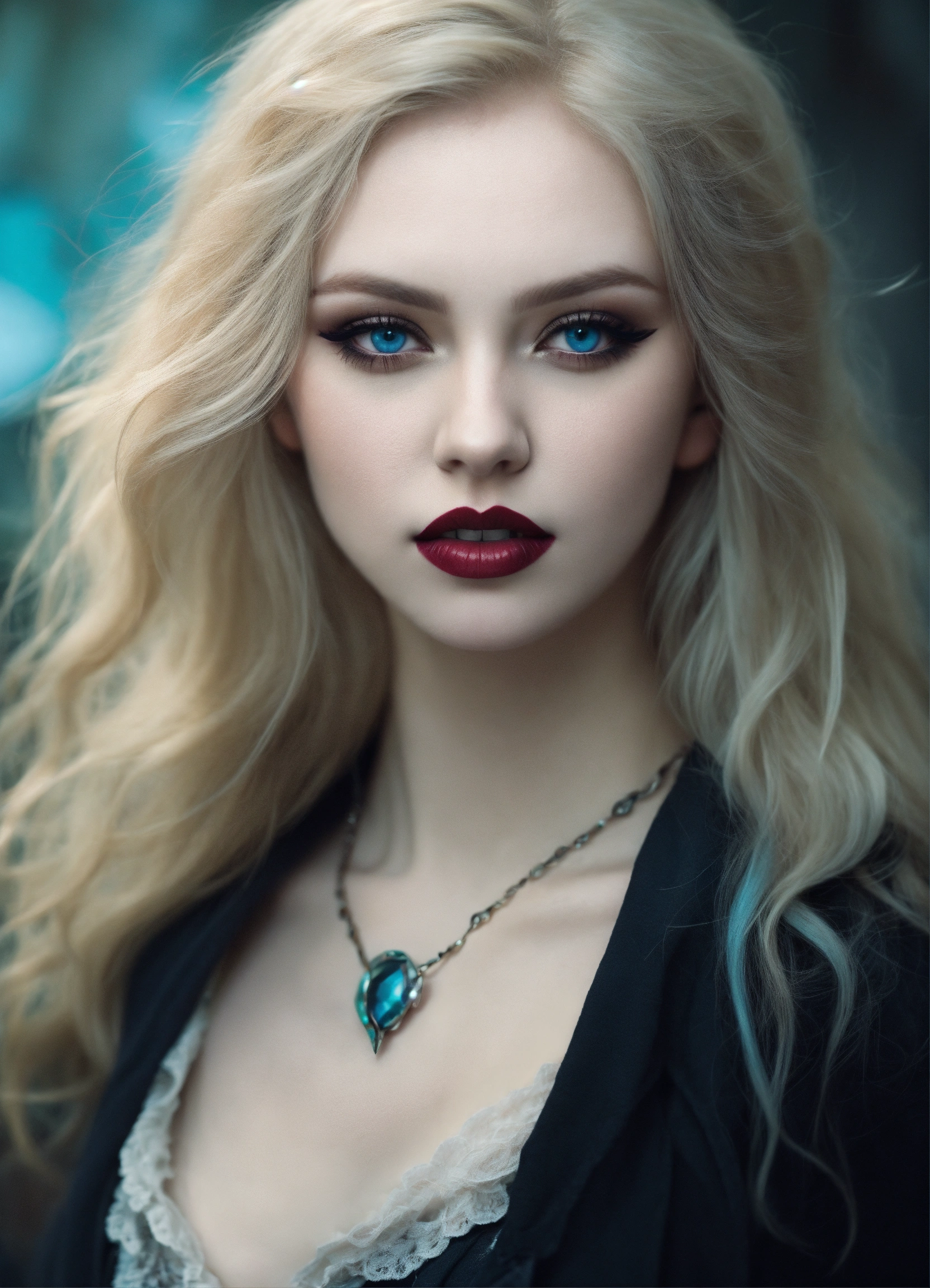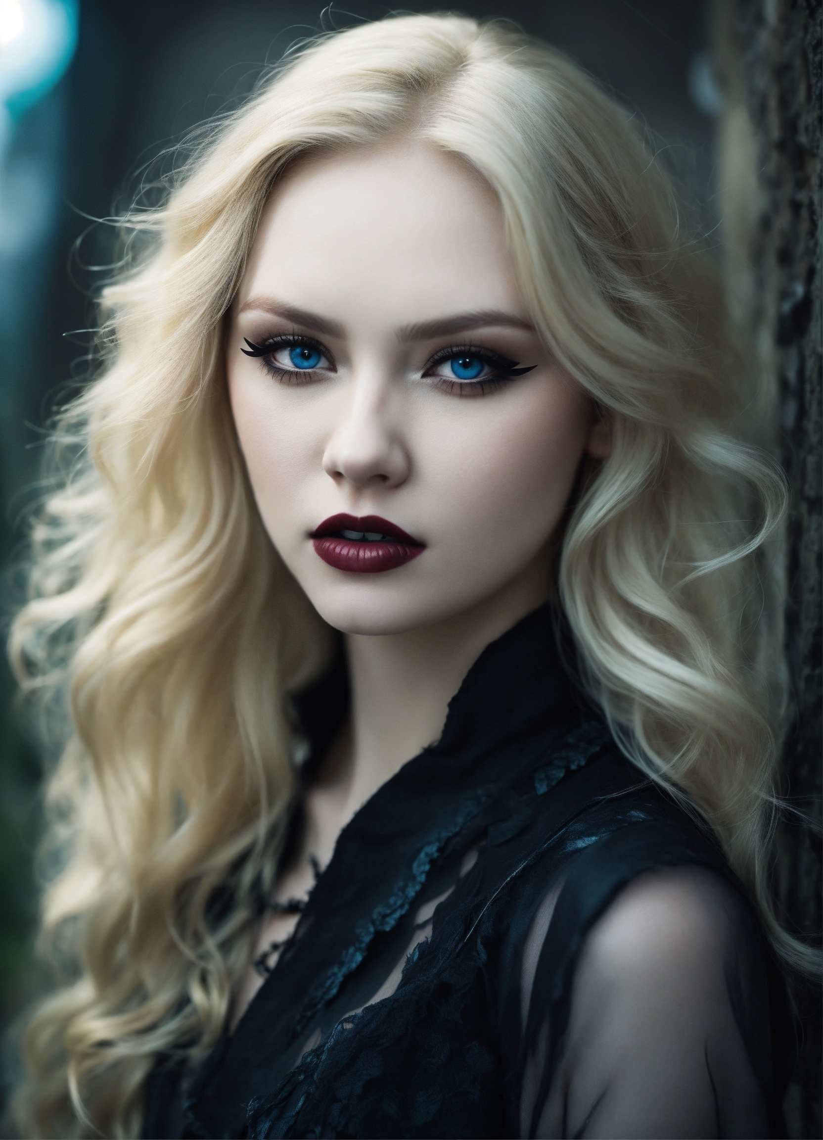 A ridiculously beautiful blonde vampire, with very pale blue eyes and pale skin. she wears cat eye eyeliner and dark clothes.
