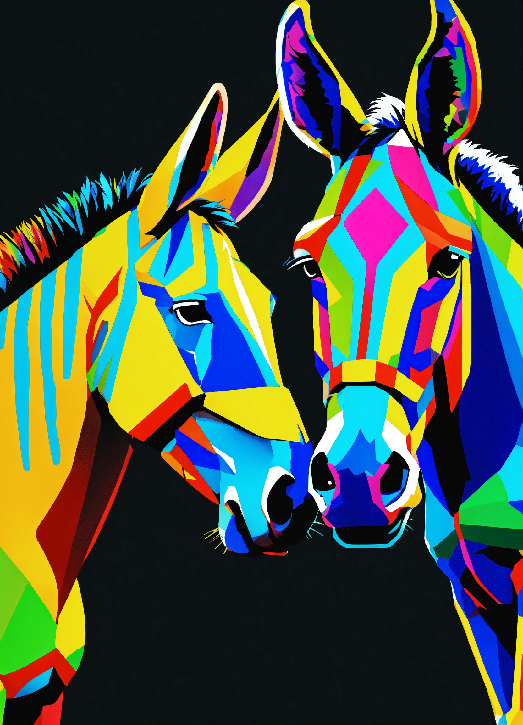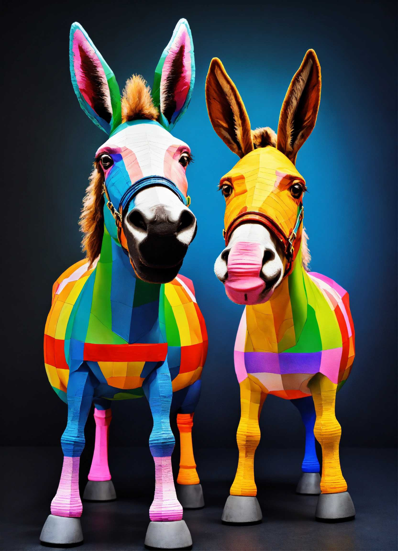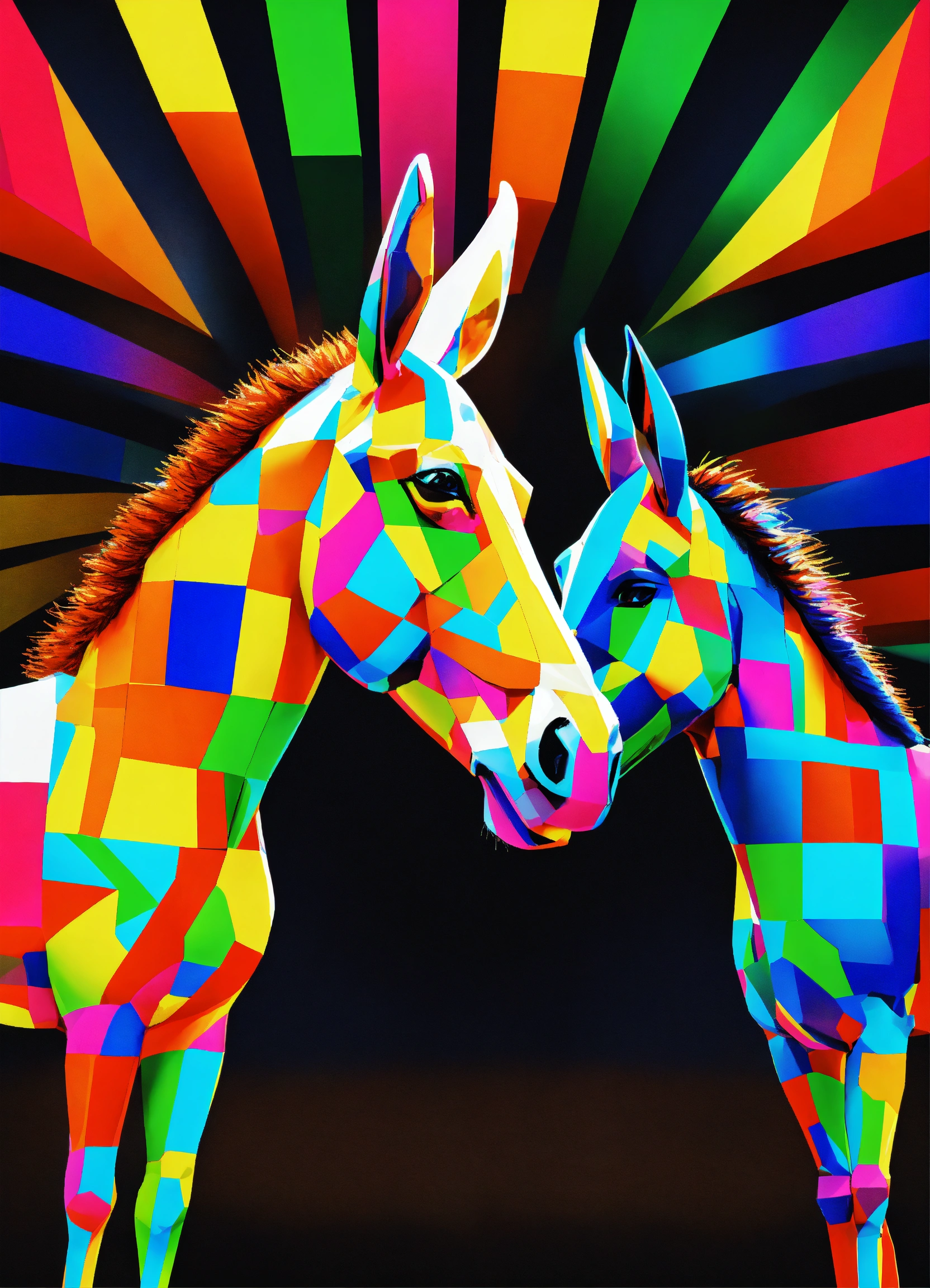 A mule and a donkey looking at each other on a black background with mathematical signs of equality and difference around them, in bright colors, 3d figures.