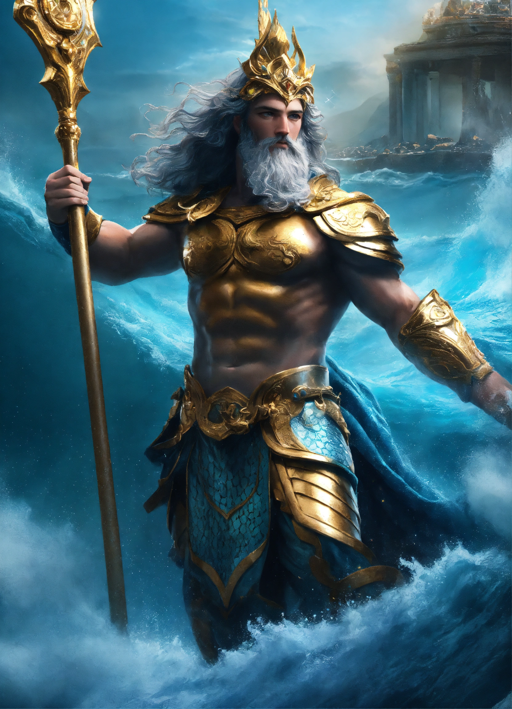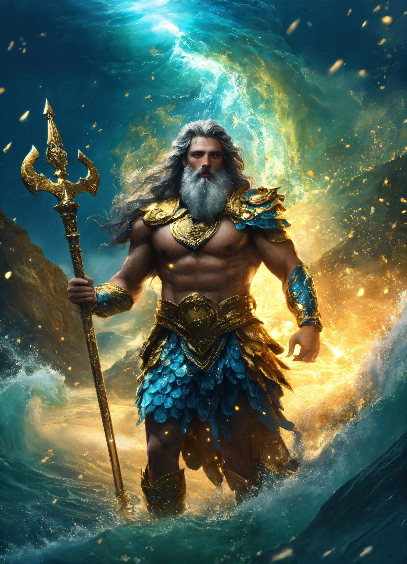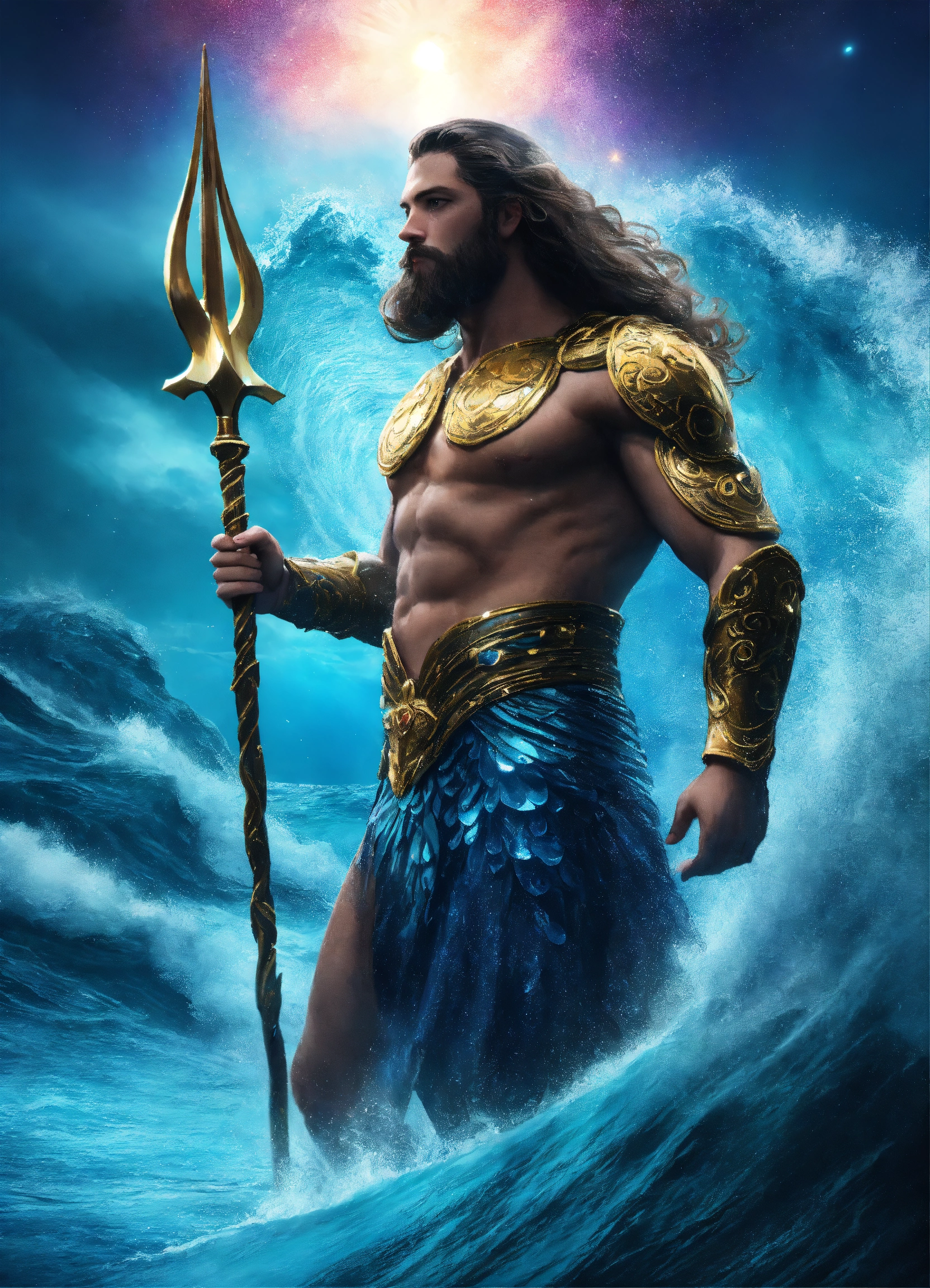 Poseidon, conjuring the cosmic event, age of gods, armor made of sea gems and starlight, heart of the ocean, raising his trident as the tsunami forms, stars spiraling around him, full body shot, hyper-realistic, photo realism, cinematography --ar 916."