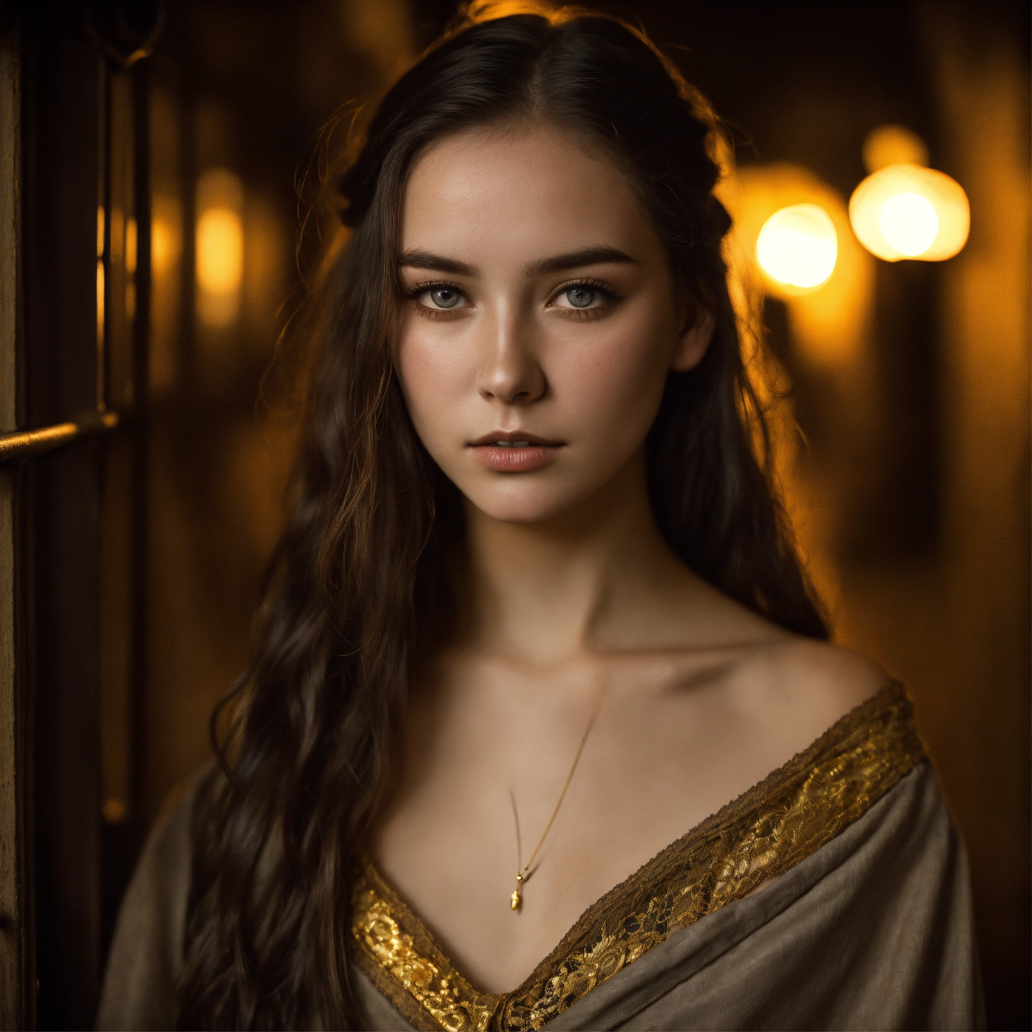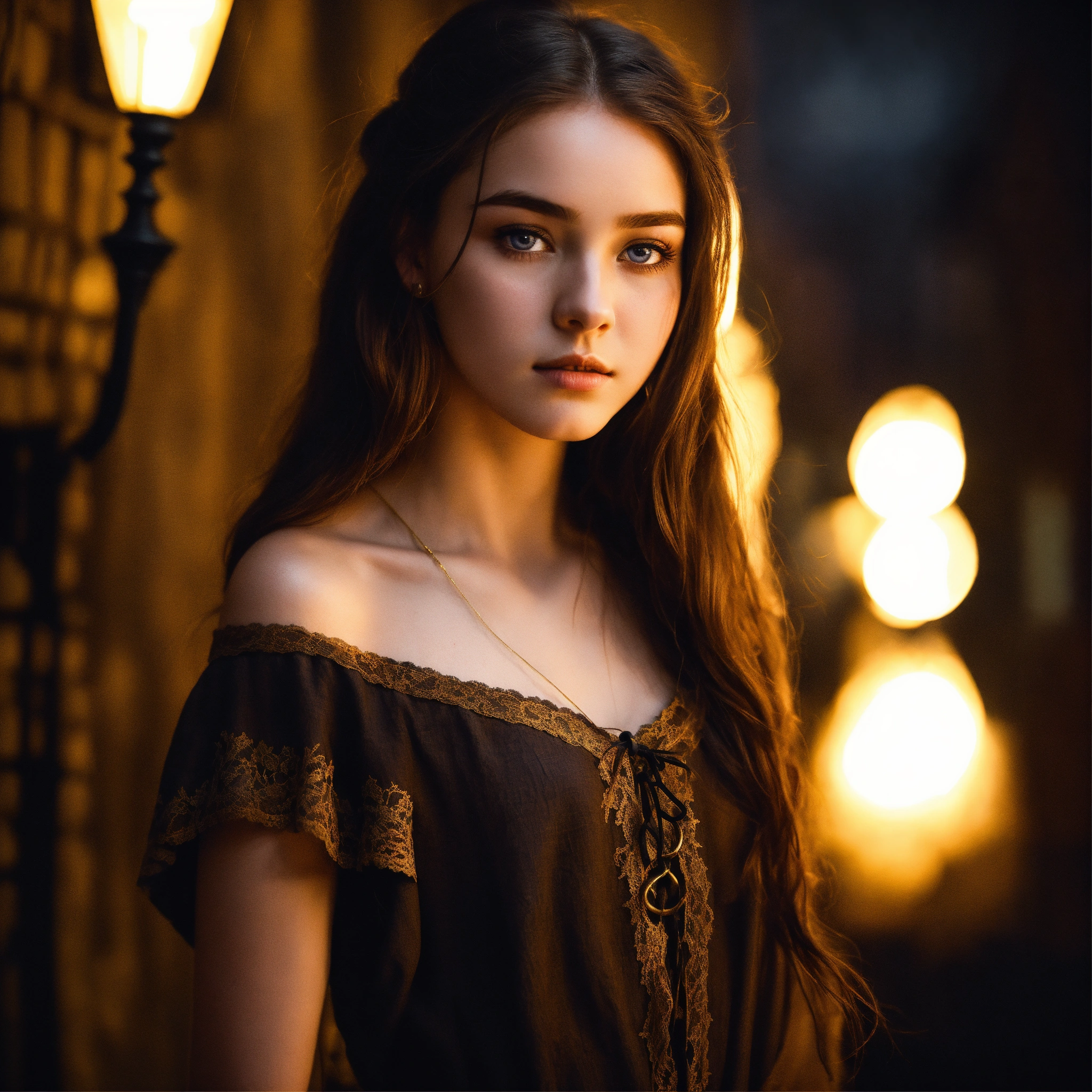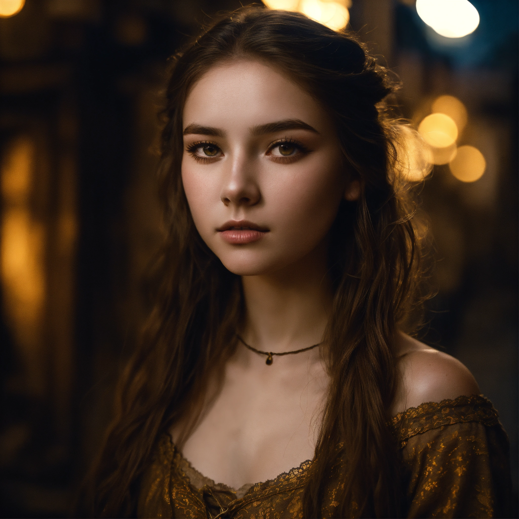 Body portrait, goddess of beauty, childish, highly attractive 14 years old girl, long brown hair and bright gold-flecked eyes and deathly pale skin, very narrow face with high cheekbones, thin eyebrows, very slim, lightly clad, black off-the-shoulder linen blouse, brown lace-up bodice, black linen trousers, stands in the night in a dark medieval alley, graceful, wispy, intimate, darkness, mysterious, glowing eyes, dark, cold ambient lighting, focus on face, extremely detailed, fantasy