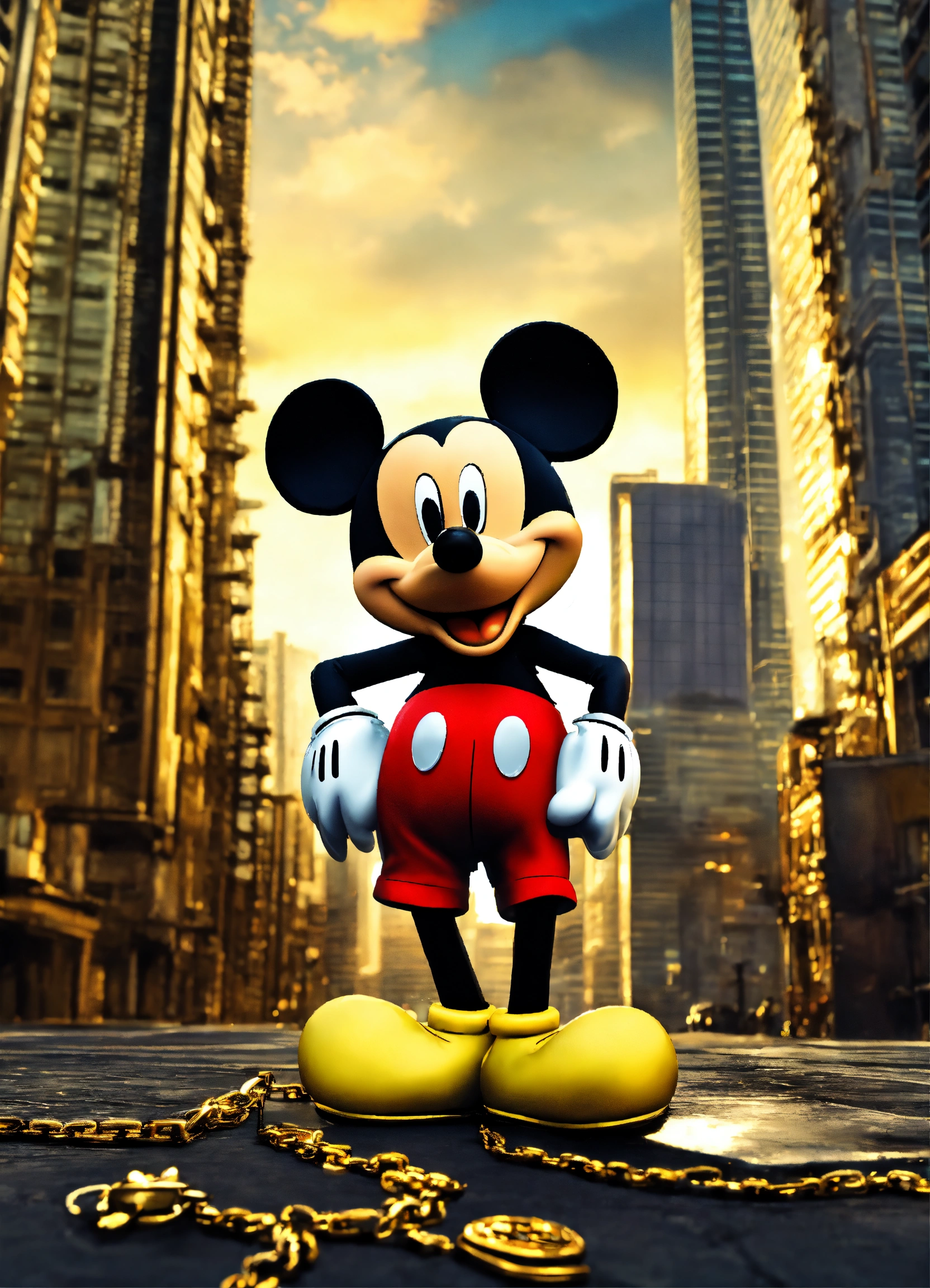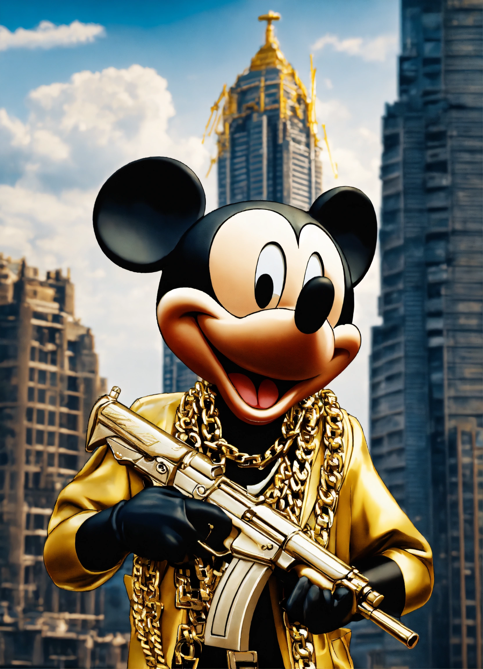 Mickey mouse gold chains gold teeth with tommy gun in front of skyscraper realistic