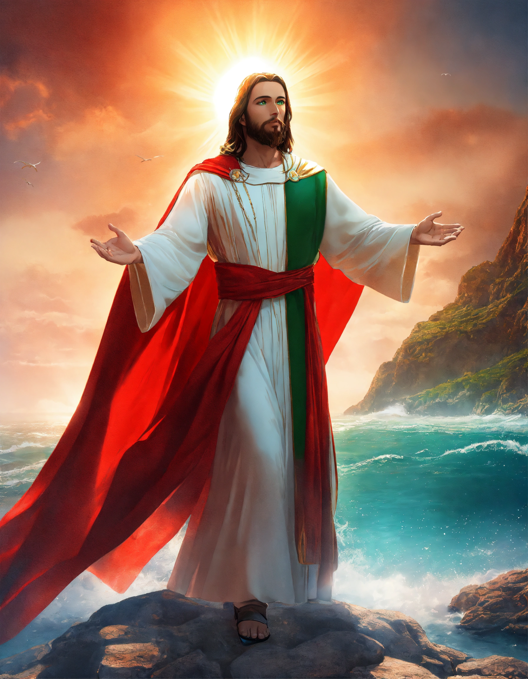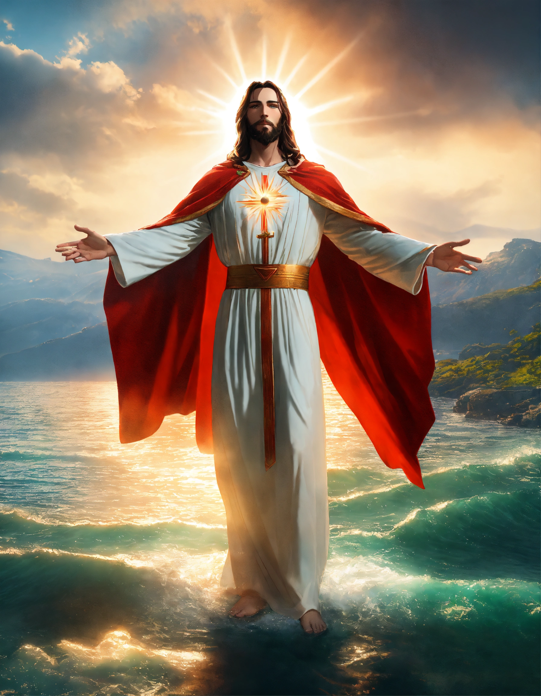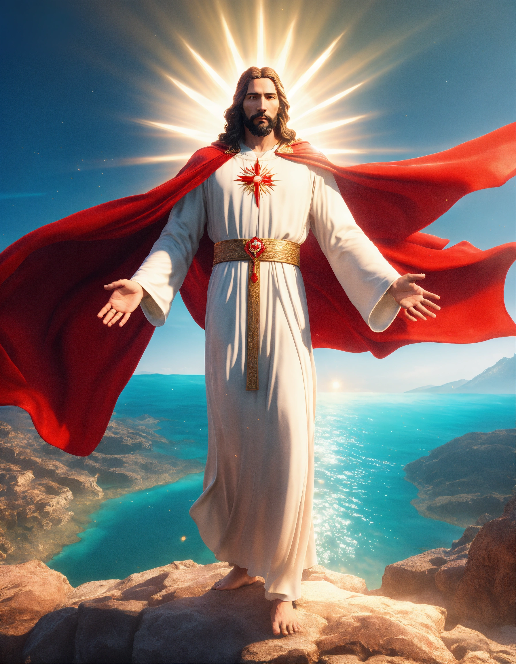 Unreal engine 8k full body portrait of a handsome divine mercy jesus with big green eyes in a red cape and white robe with sun rays emanating from his chest and his perfect hands out on his sides with a blue aura on his right side and red aura on his left side with an ocean background behind him floating above the clear blue water and the heavenly mountain horizon behind him
