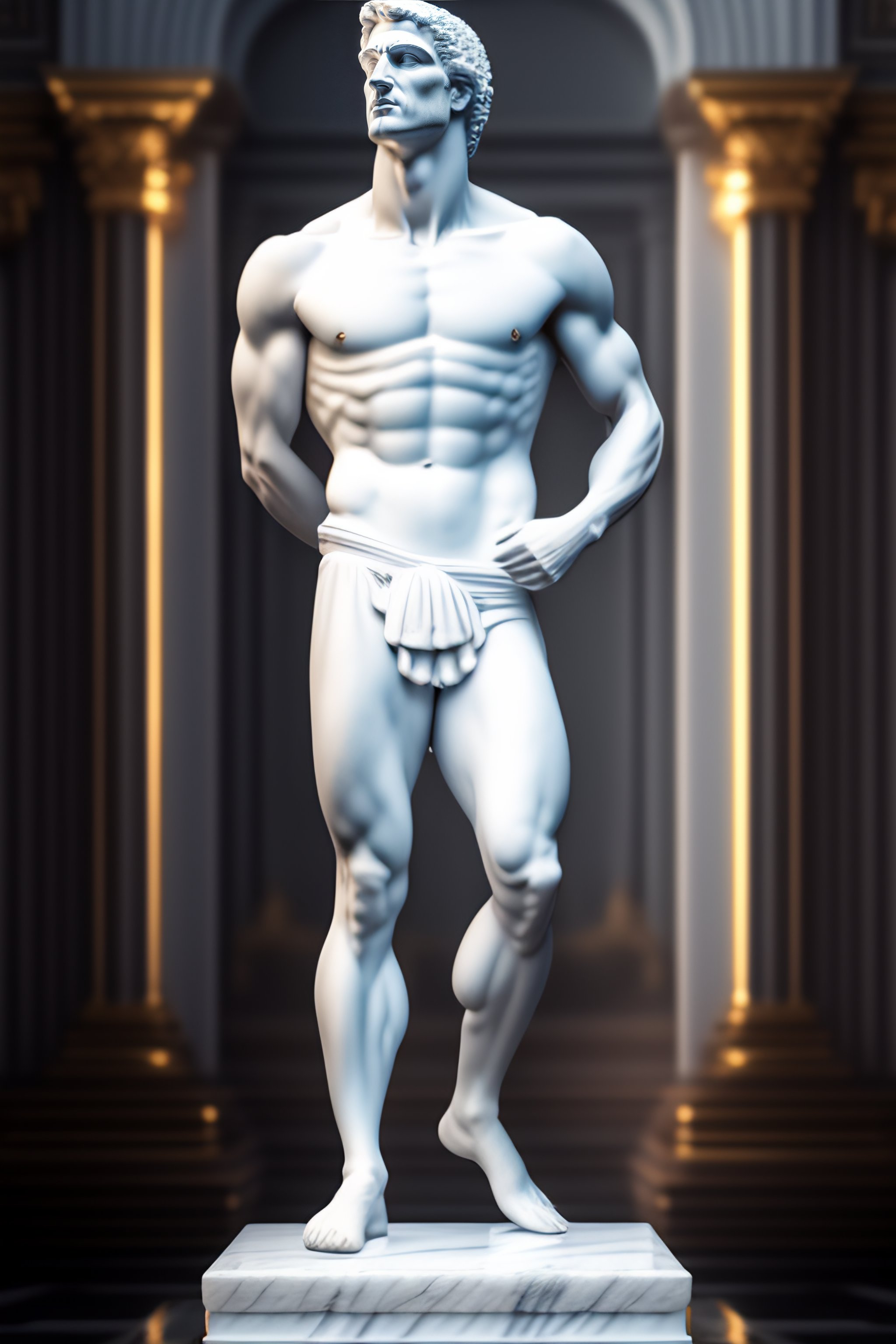 Full body portrait of a realistic greek white marble statue of julius caesar, moody, dark, photorealistic, super detailed, hyper realistic, bright lights, 8 k