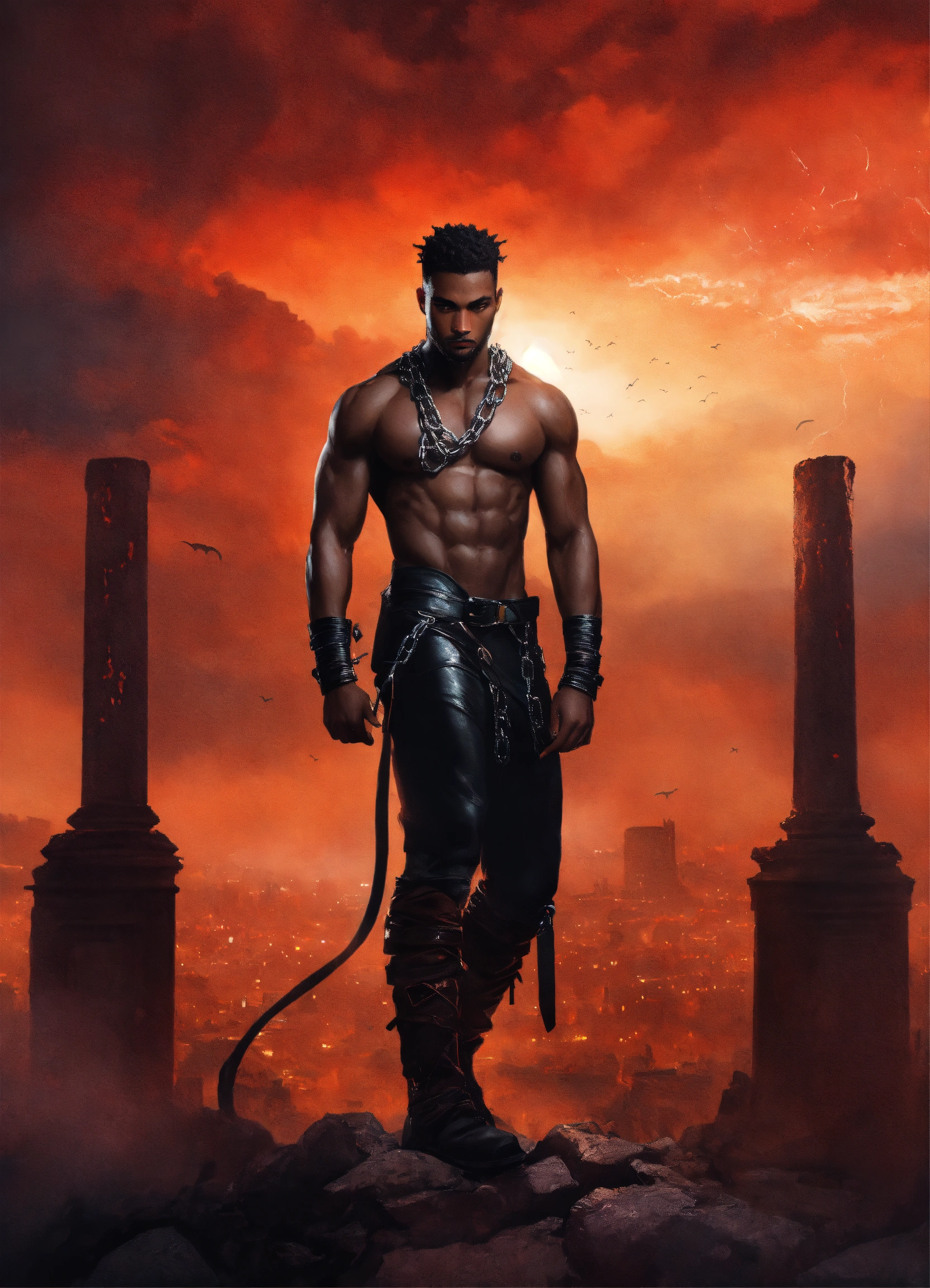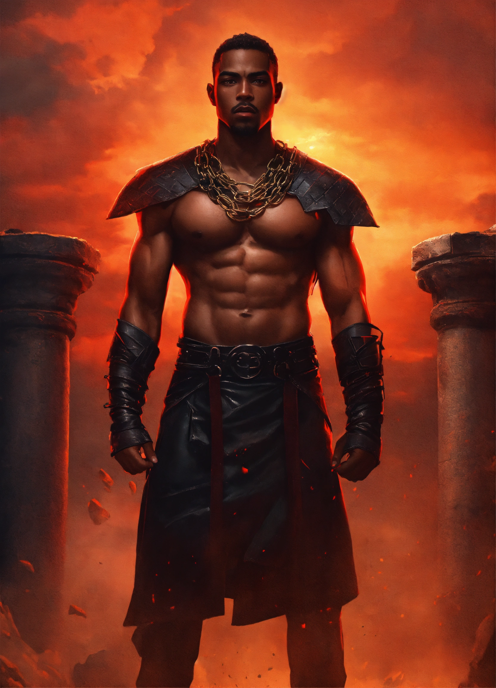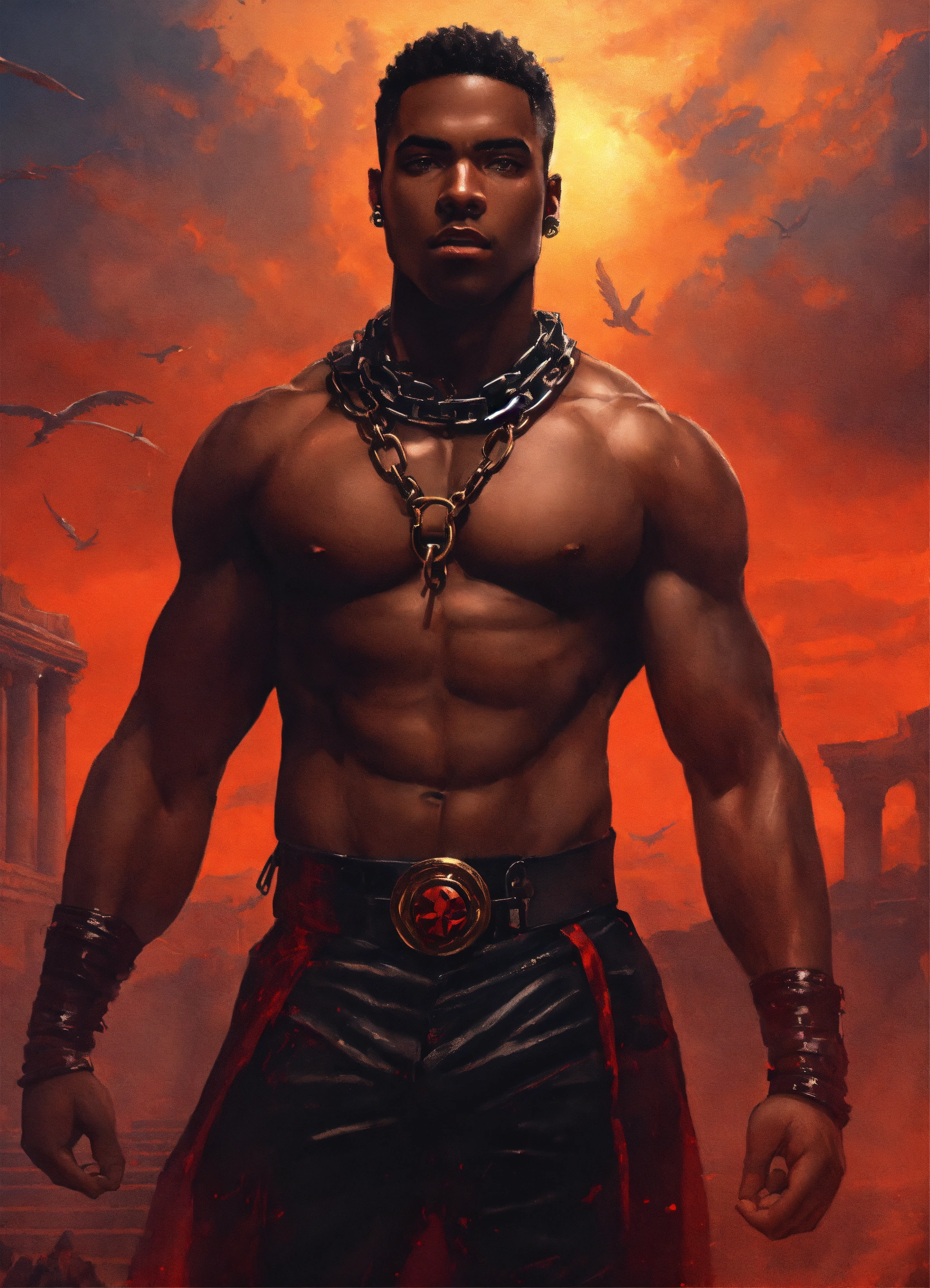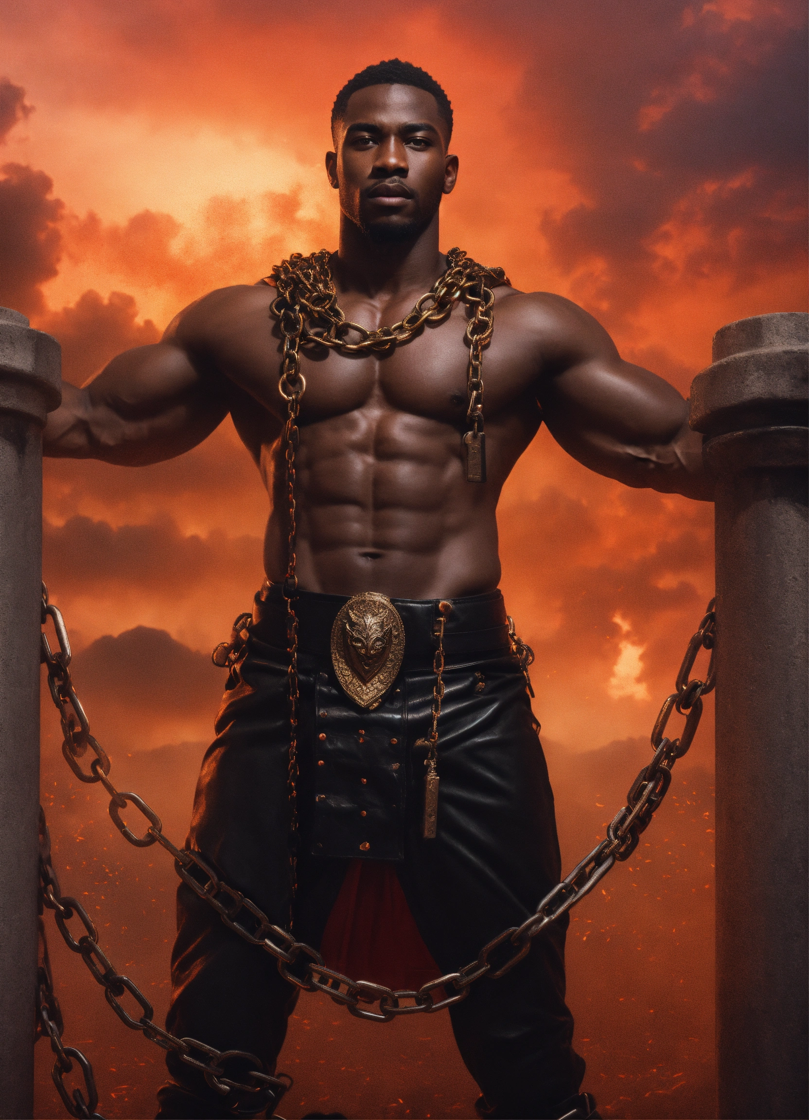 Young strong handsome african god prisoner, captive bound god, front facing strong handsome god short hair wearing a black leather super hero suit, muscular dark skinned black male god prisoner, arms chained, long short hair handsome male god chained to the pillars arms outstretched, front facing, with ruins and a violent red sky behind him and monster guards in the mist watching him, fantasy, high detail, realistic photo, high detail, digital painting, cinematic, stunning, hyper-realistic, sharp focus, high resolution 8k, insanely detailed