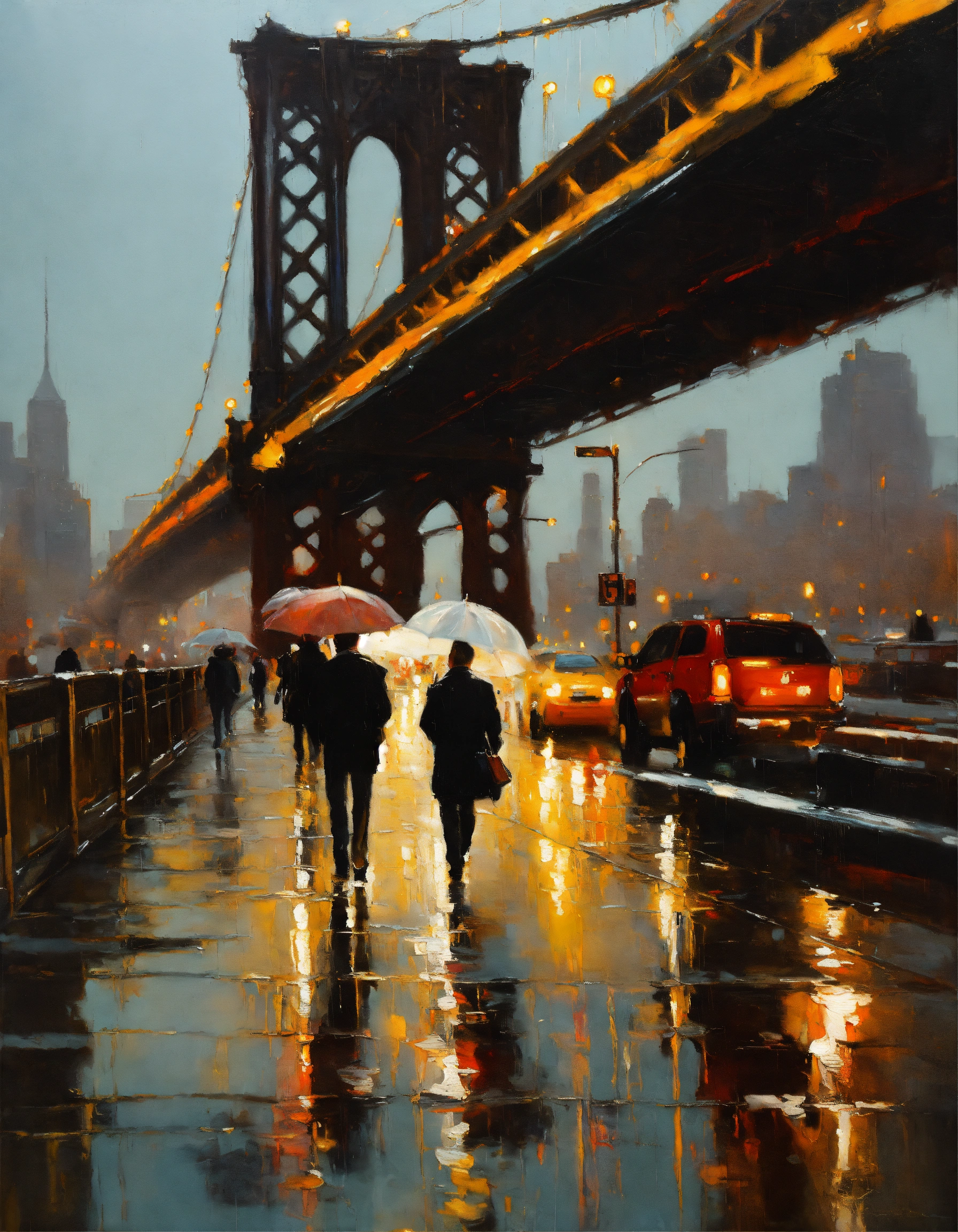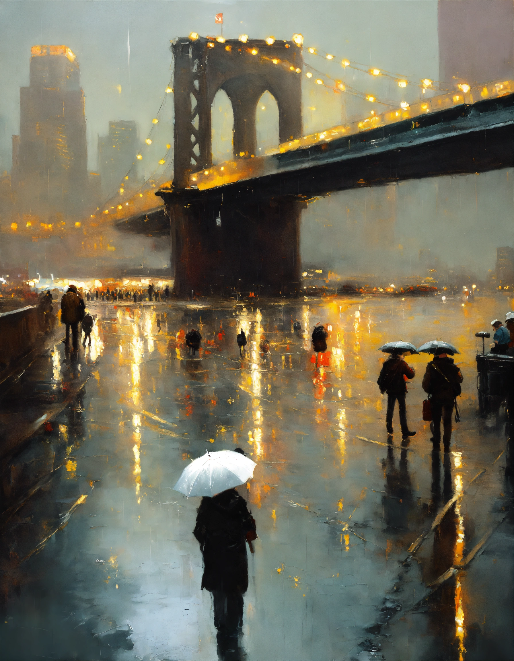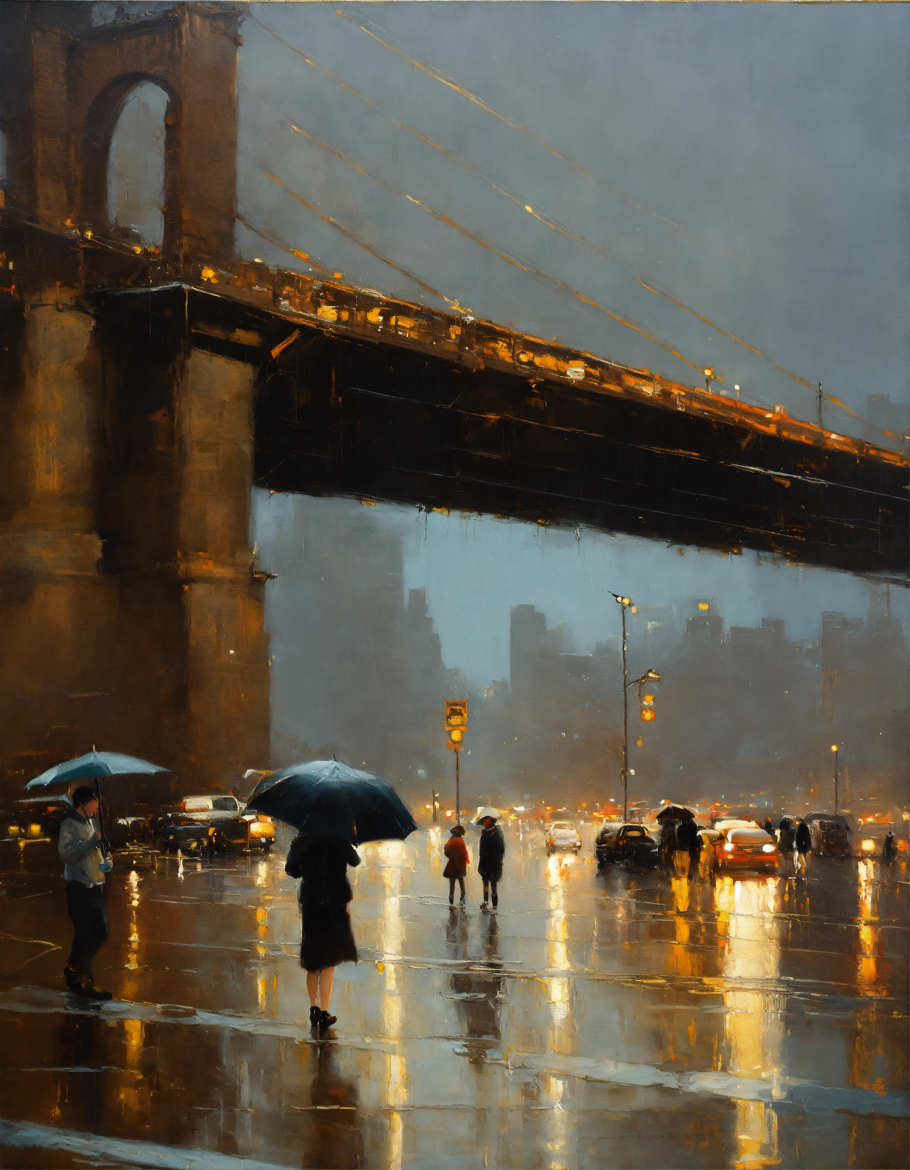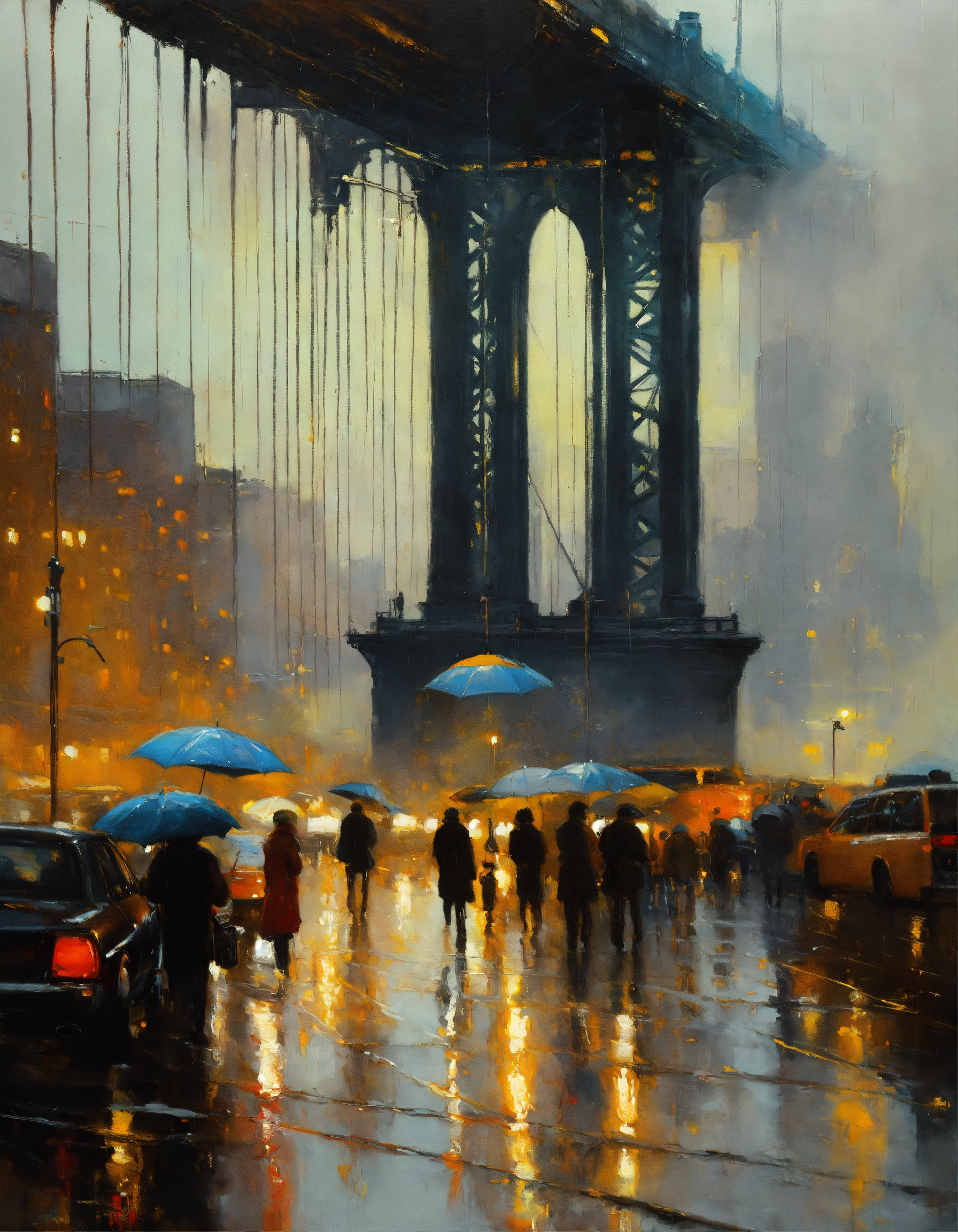 New york bridge, rain, people, canvas, oil paint, impasto brushstrokes, richard schmidt, mark legu, jeremy mann