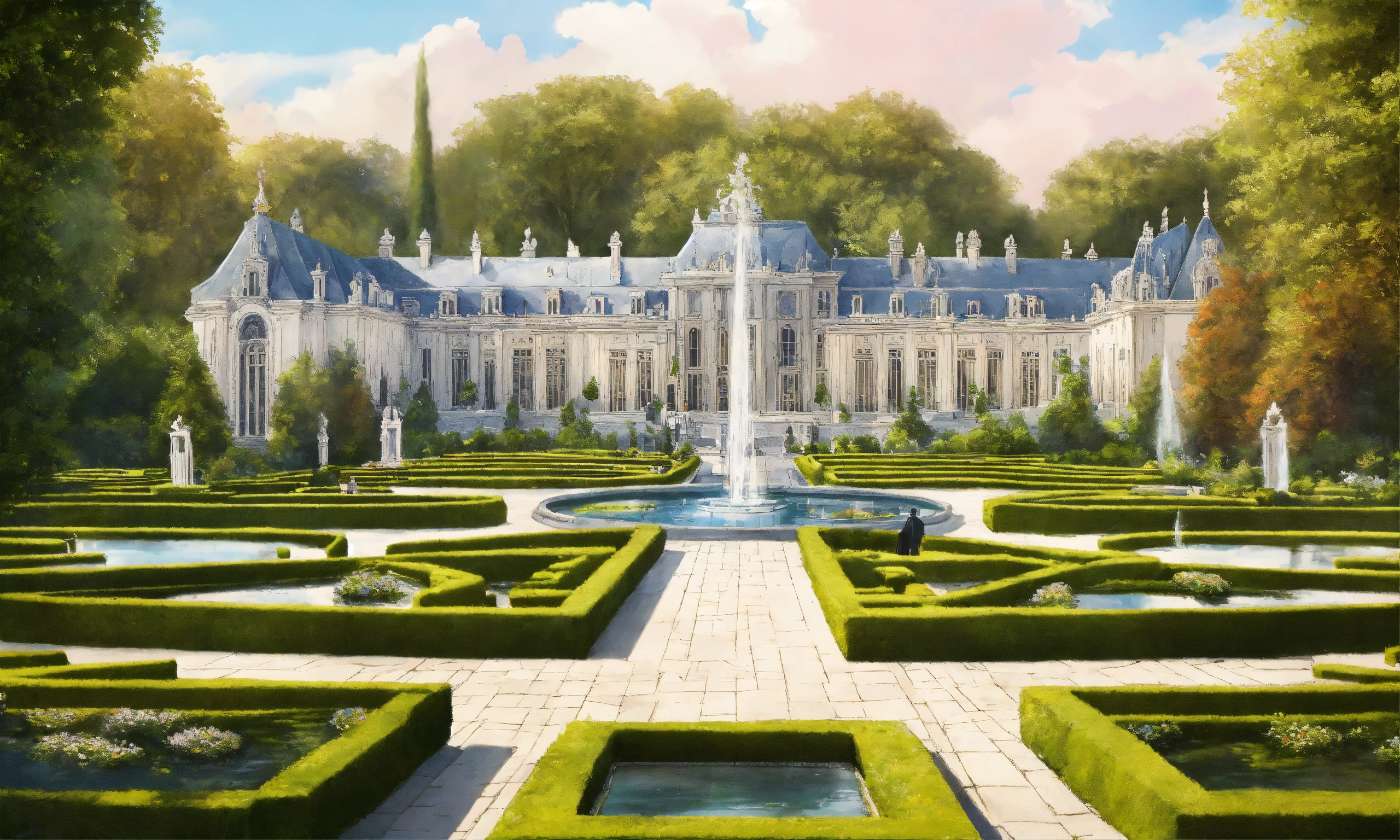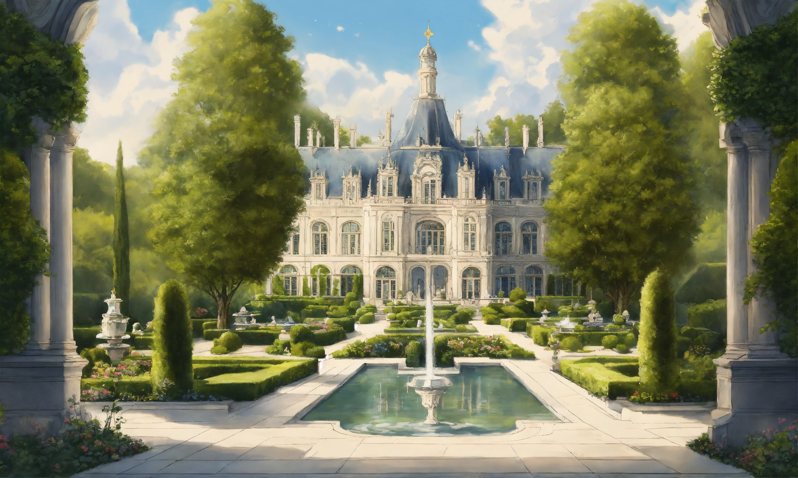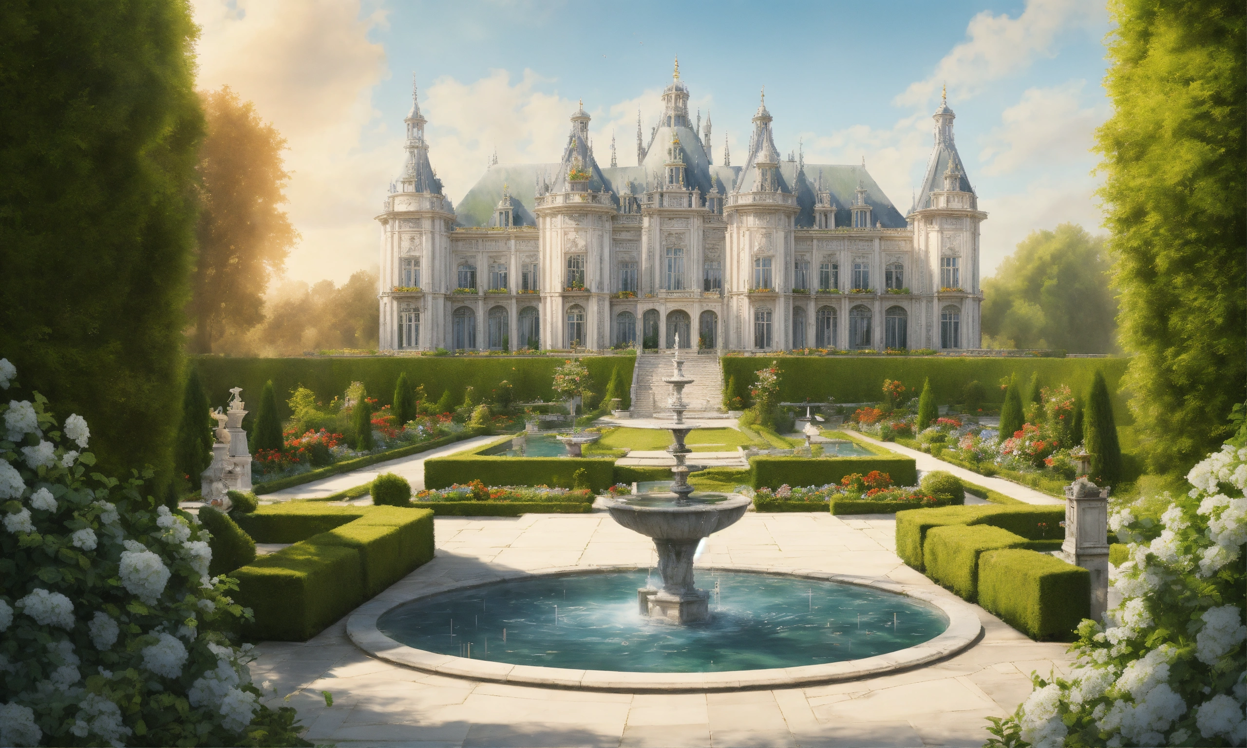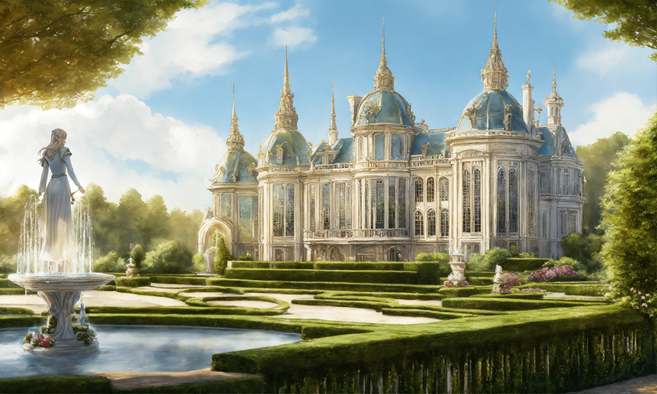 Drawing of the full image of an elegant white marble high elf sci fi palace overlooking a garden of hedges and fountains in belgium, beautiful day, immensely detailed