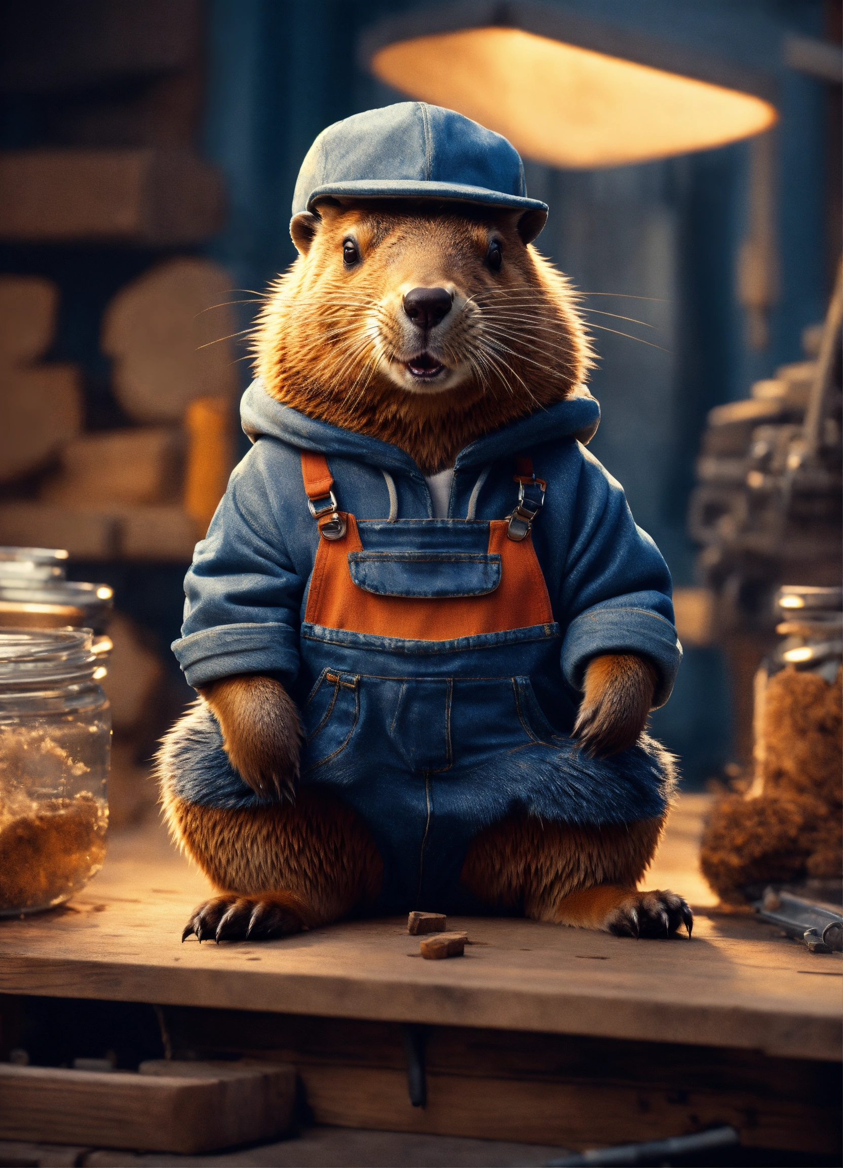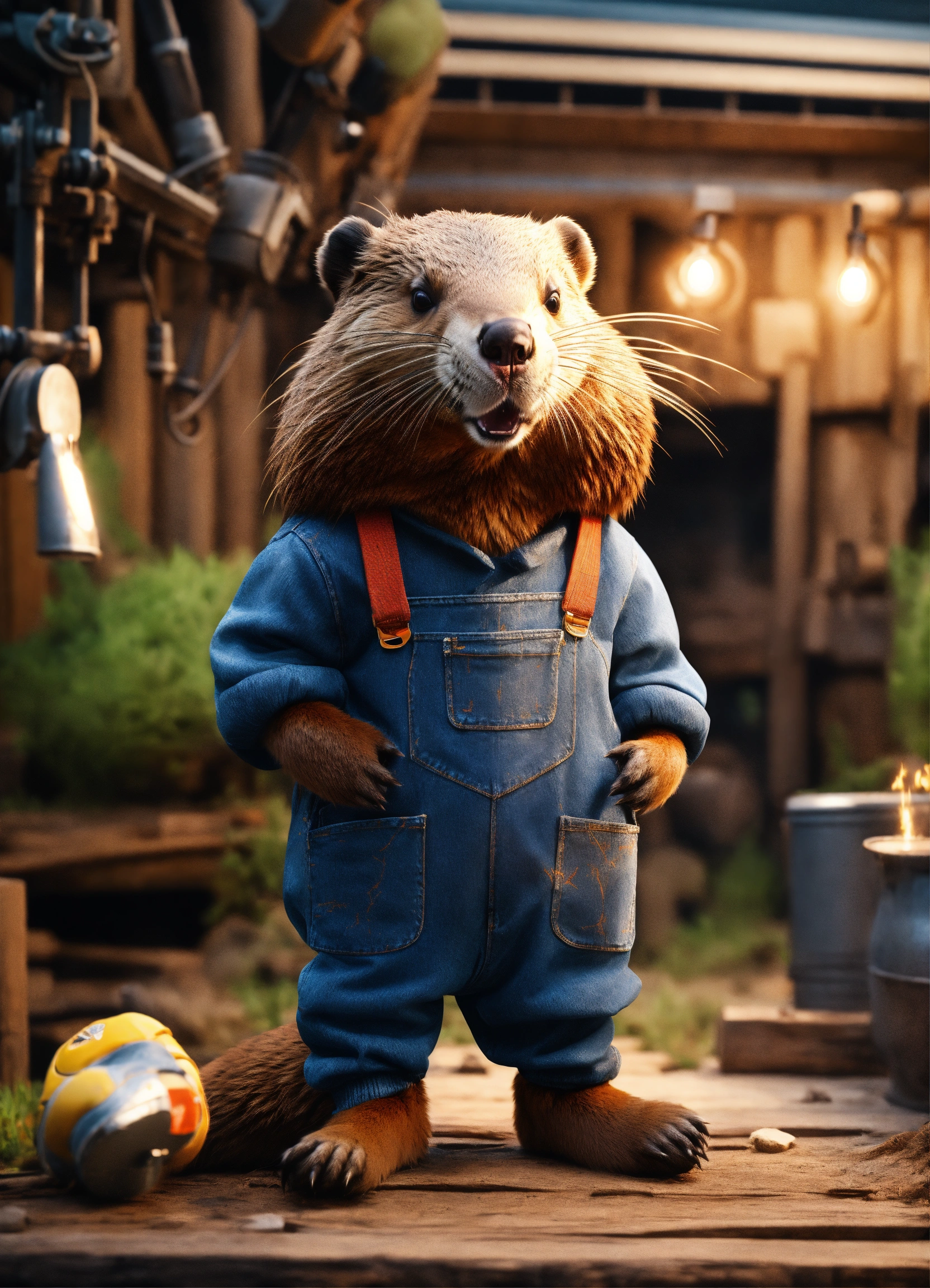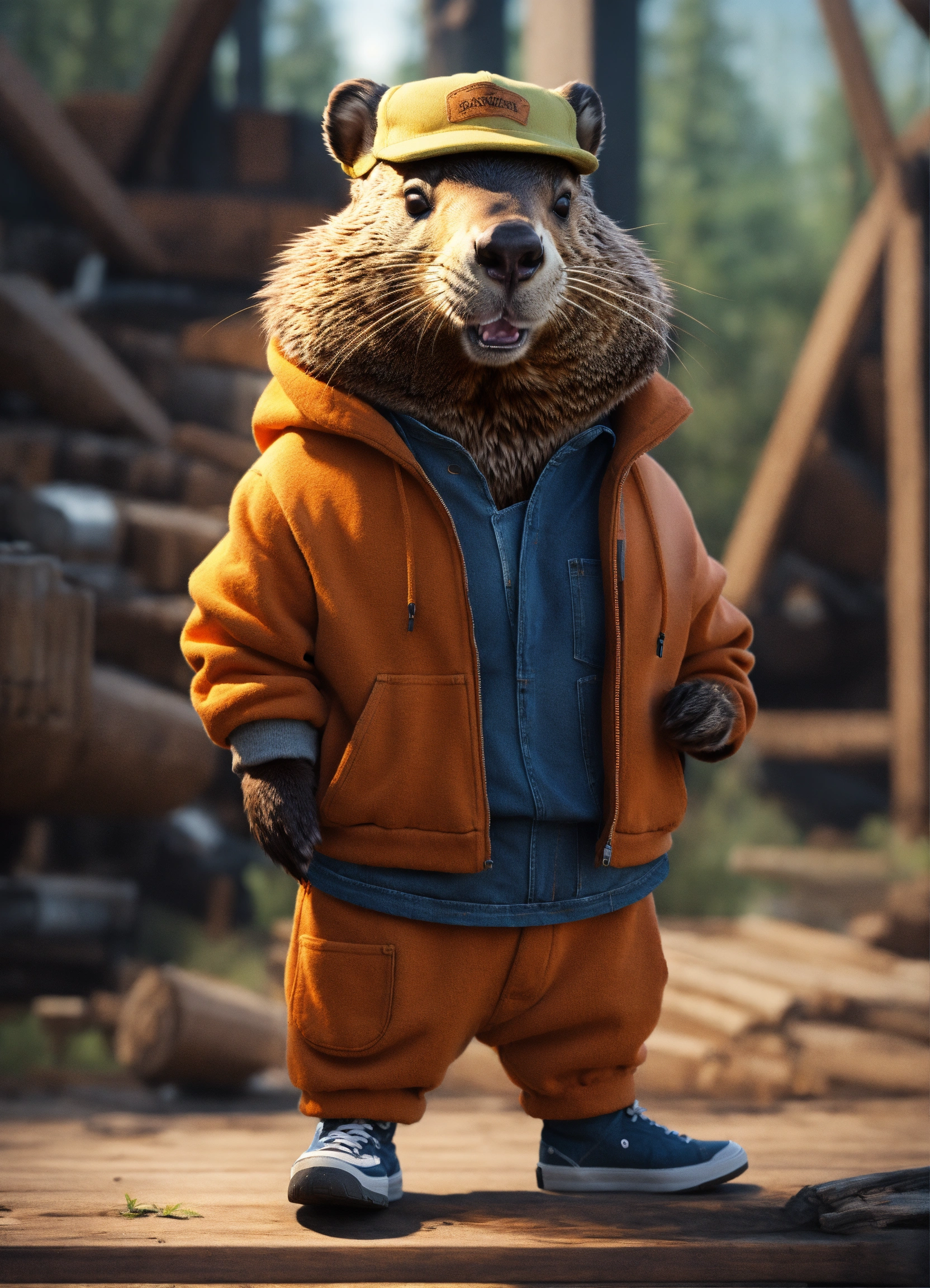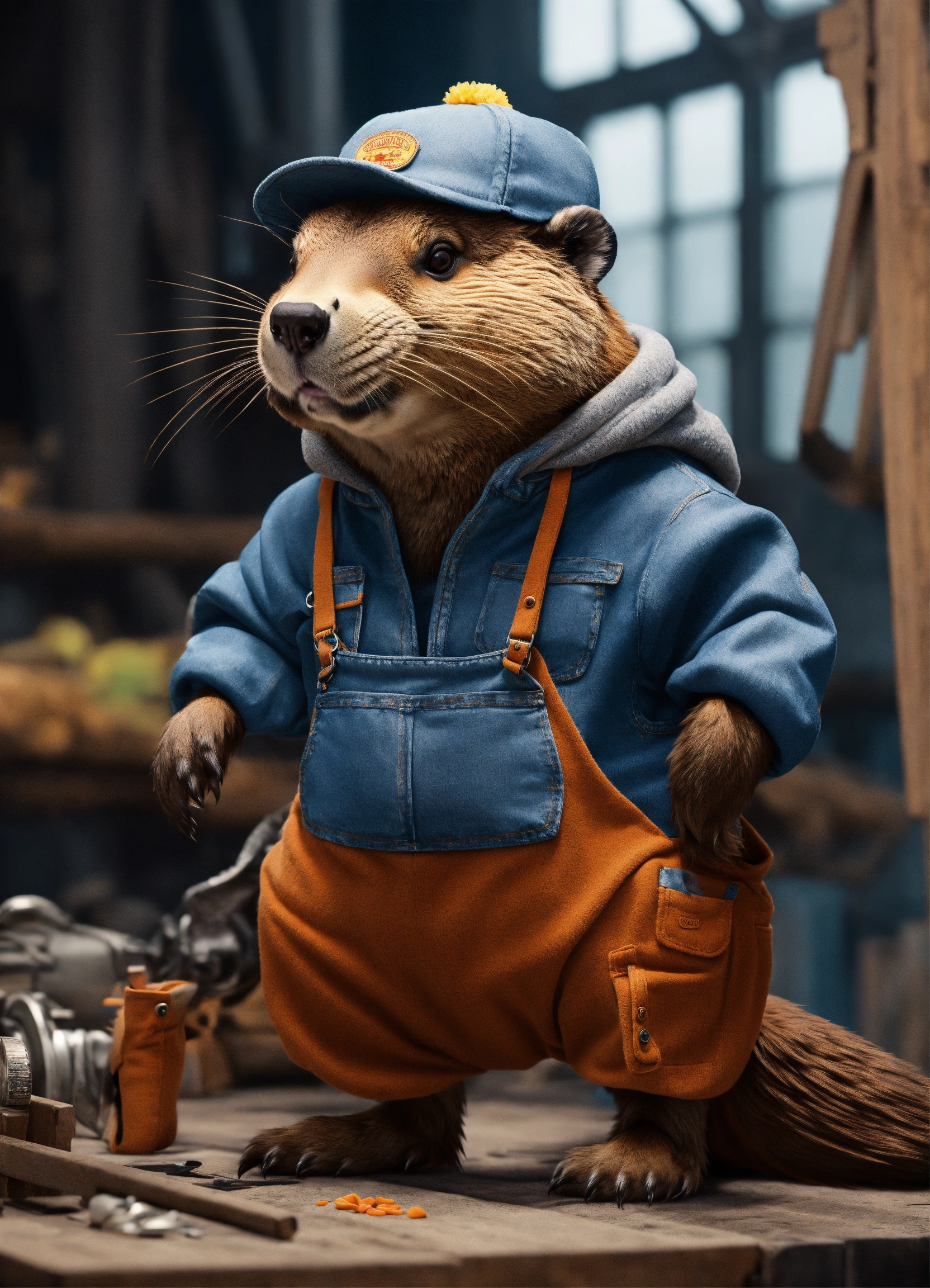 Extremely realistic beaver. in a sweatshirt with long sleeves. in denim overalls. in sneakers. at the sawmill. volumetric lighting, maximalist photo illustrations, 8k concept art, meticulously detailed, complex, expansive, fantastical.