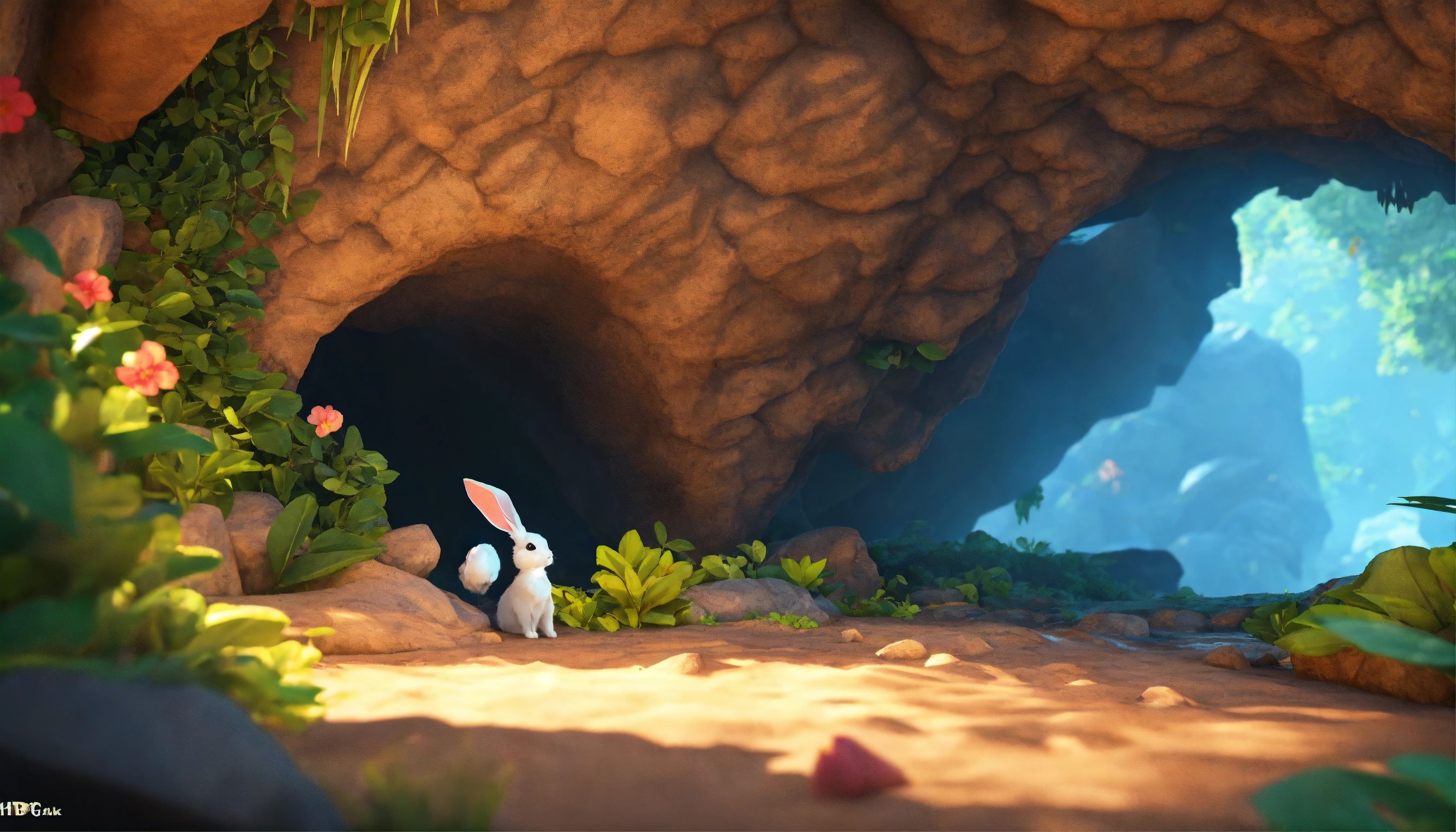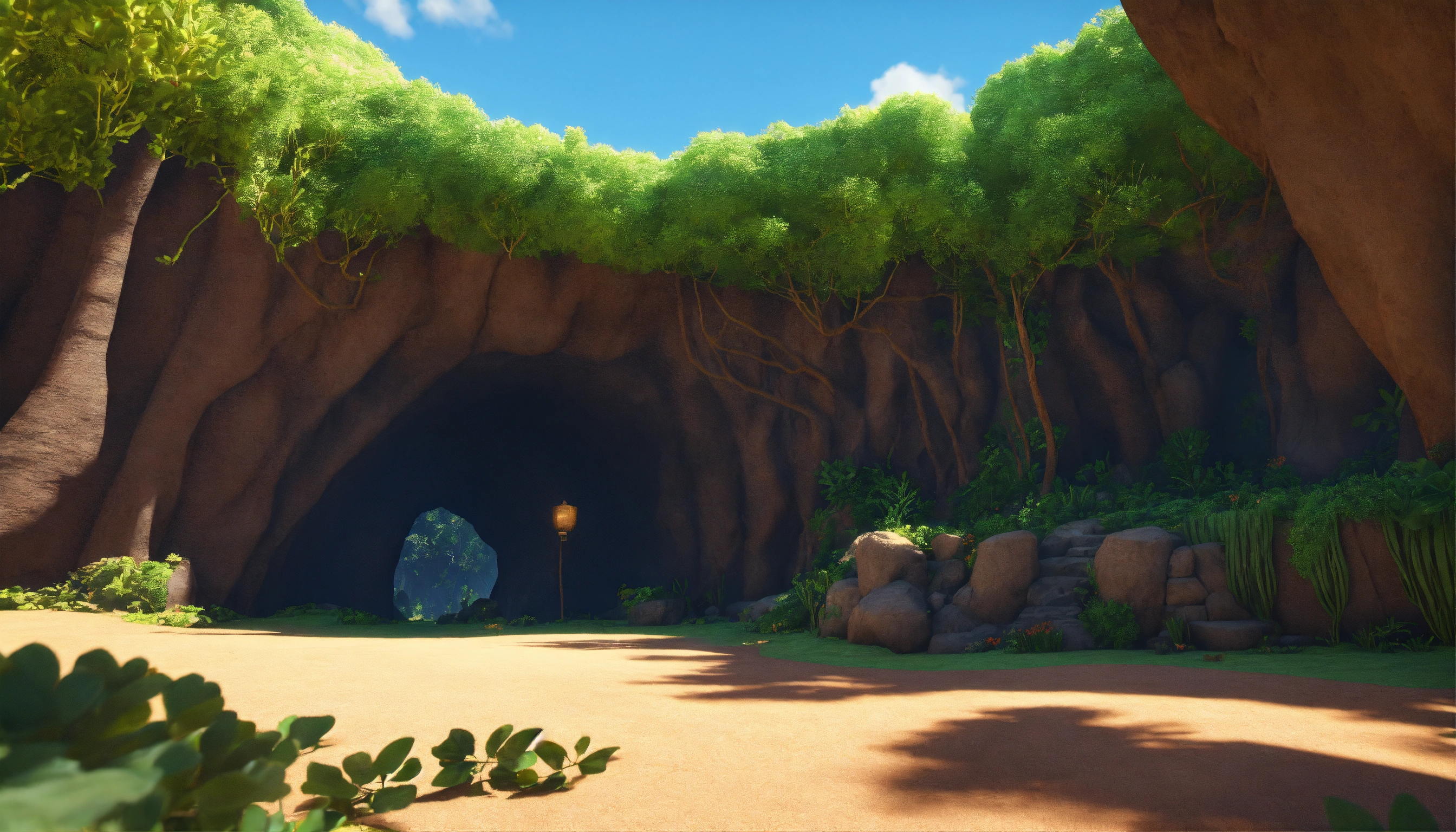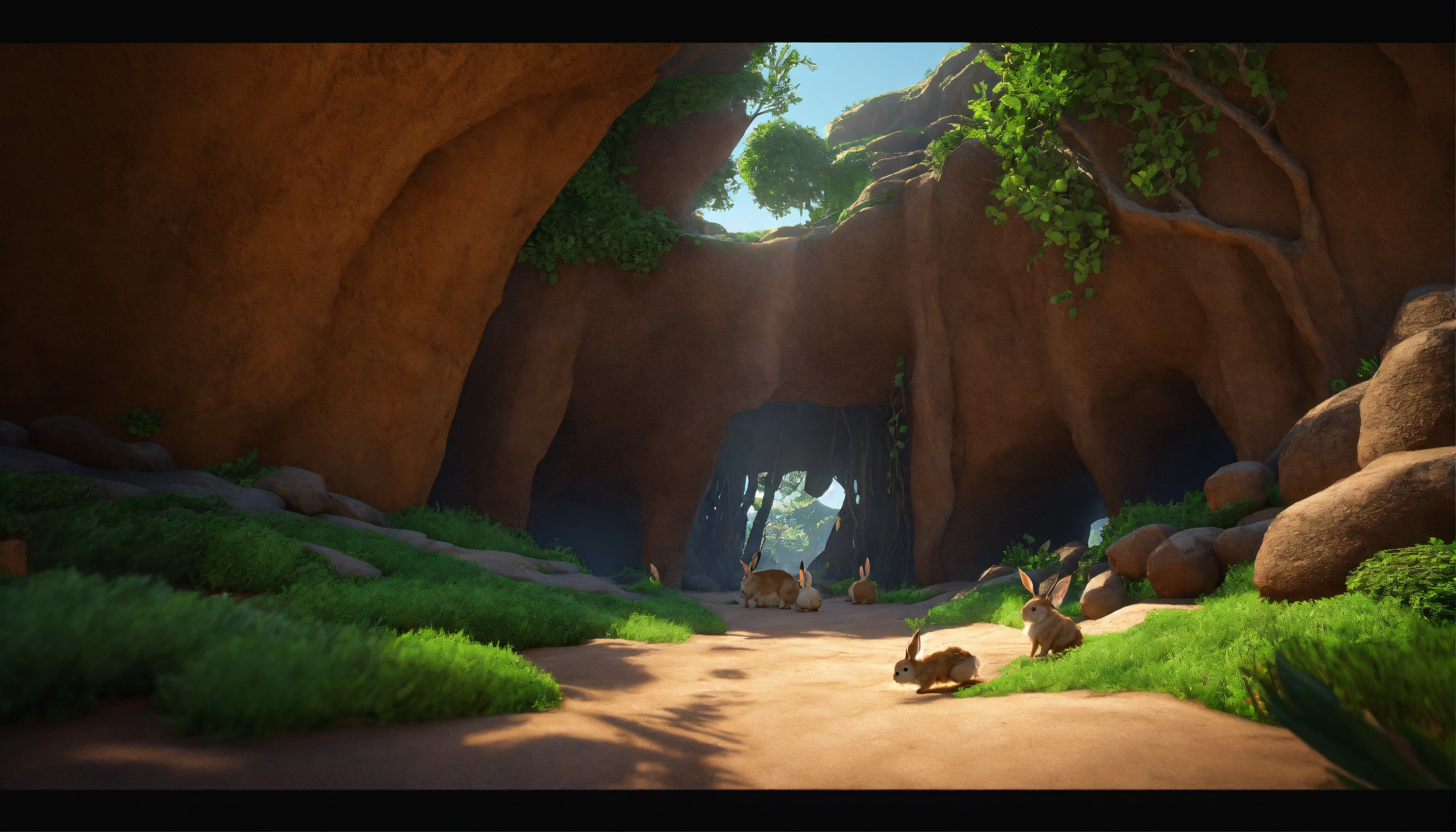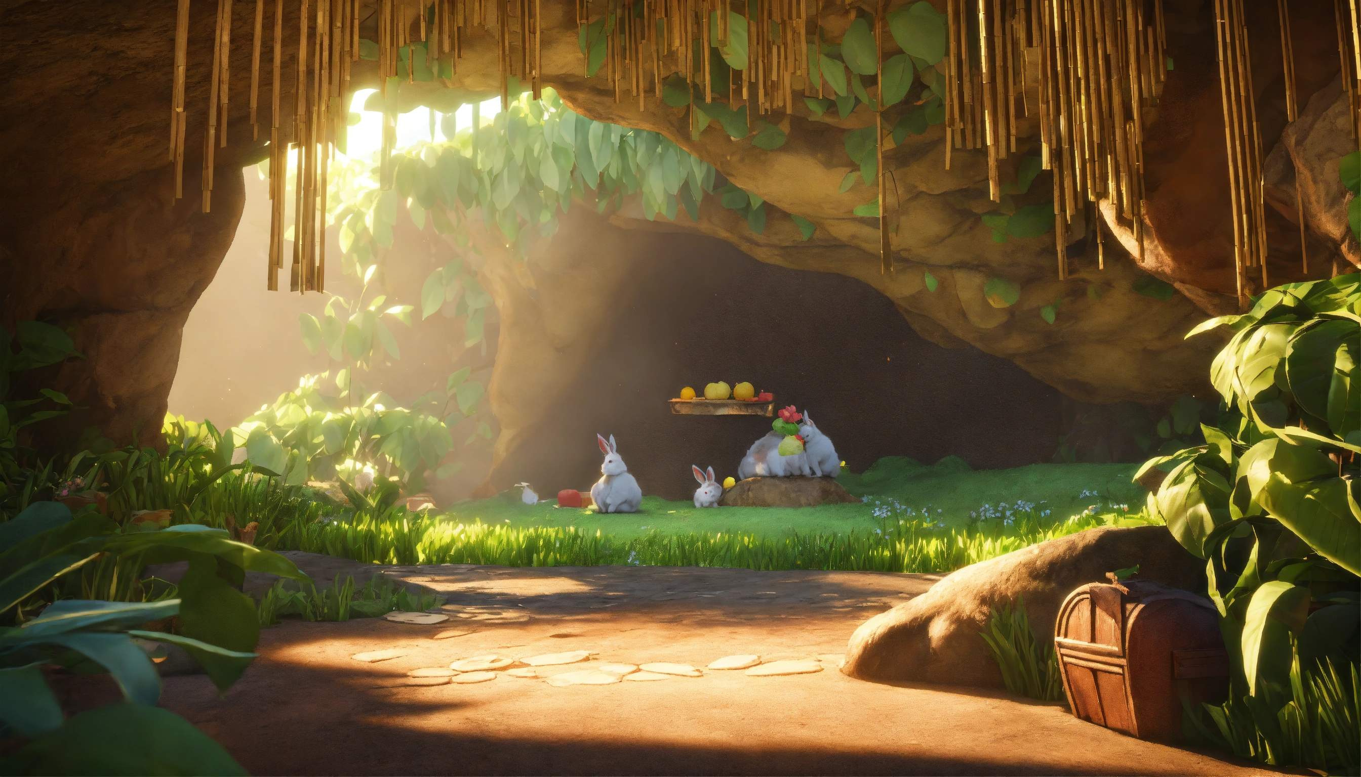 Generate an image of a cave entrance near the banyan tree where the rabbits live, 3d style, hyper-realistic, 8k, ultra hd, pixar style