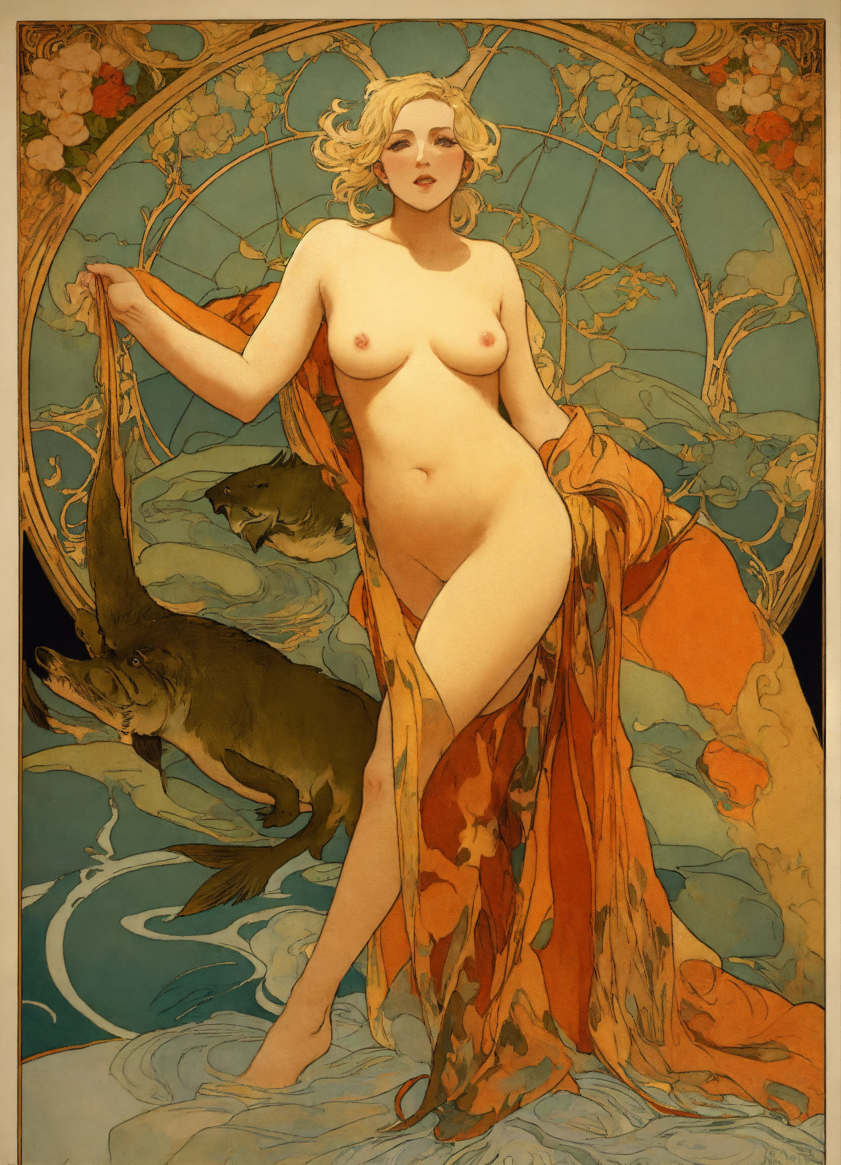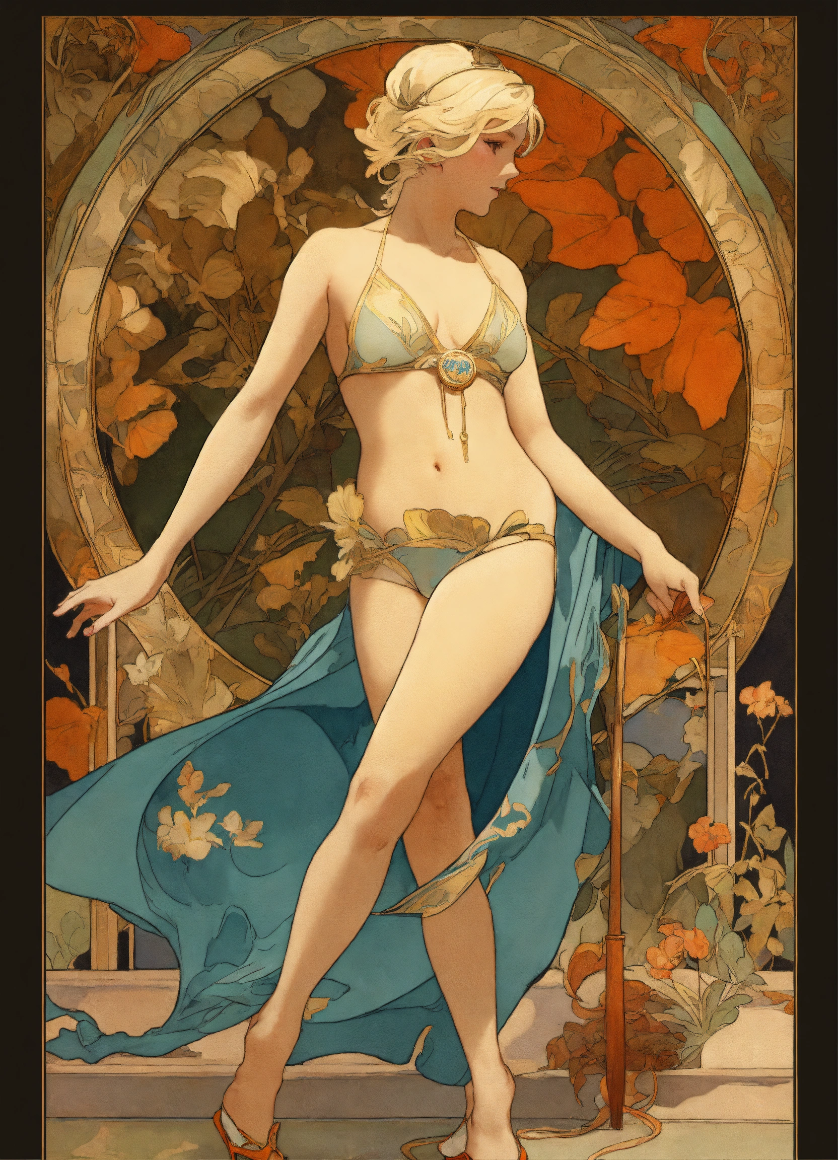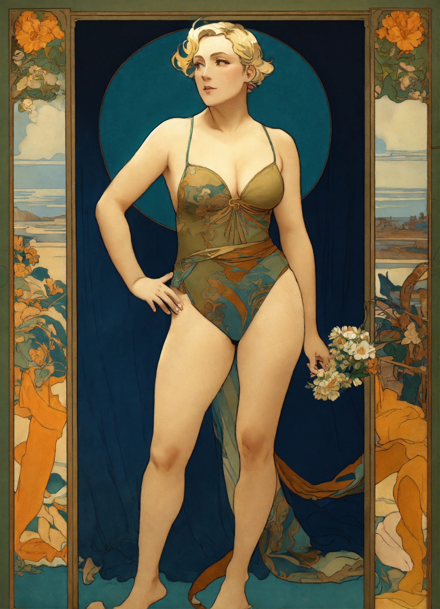 Barine le pen en maillot de bain sombre portant des escarpins à talons fins peinte dans le style d'alphonse mucha