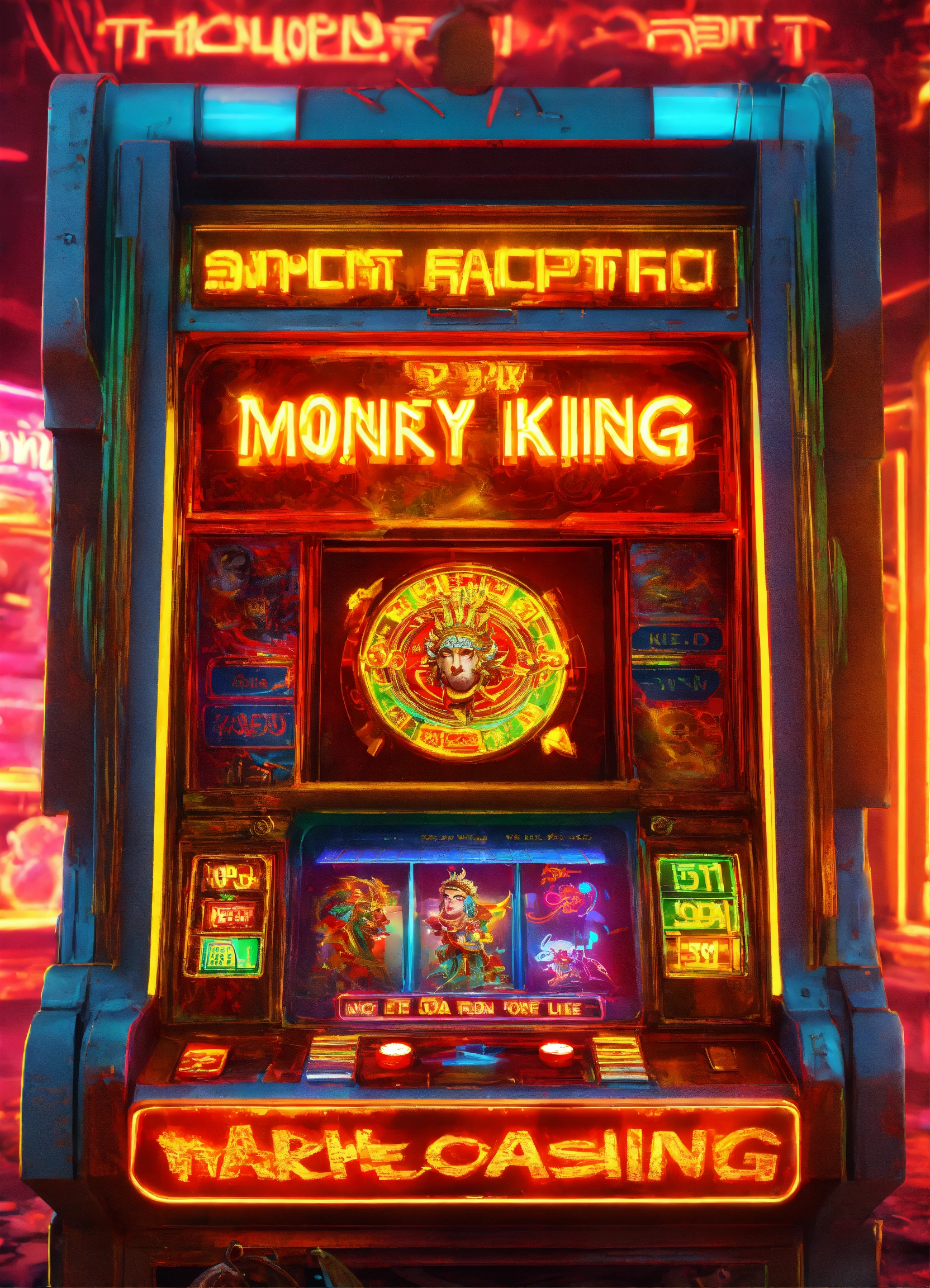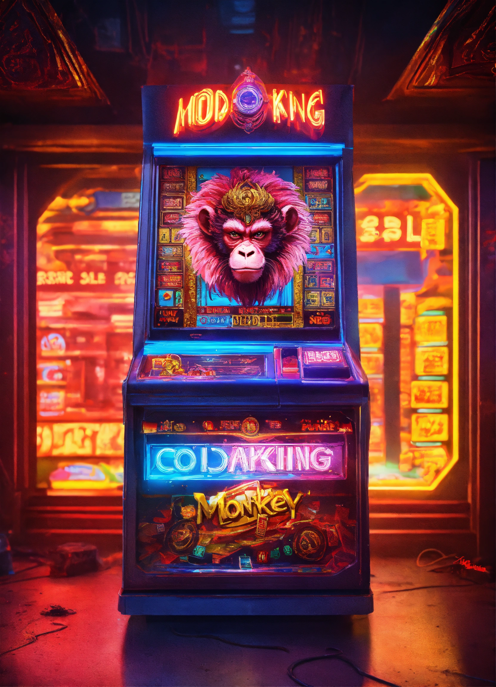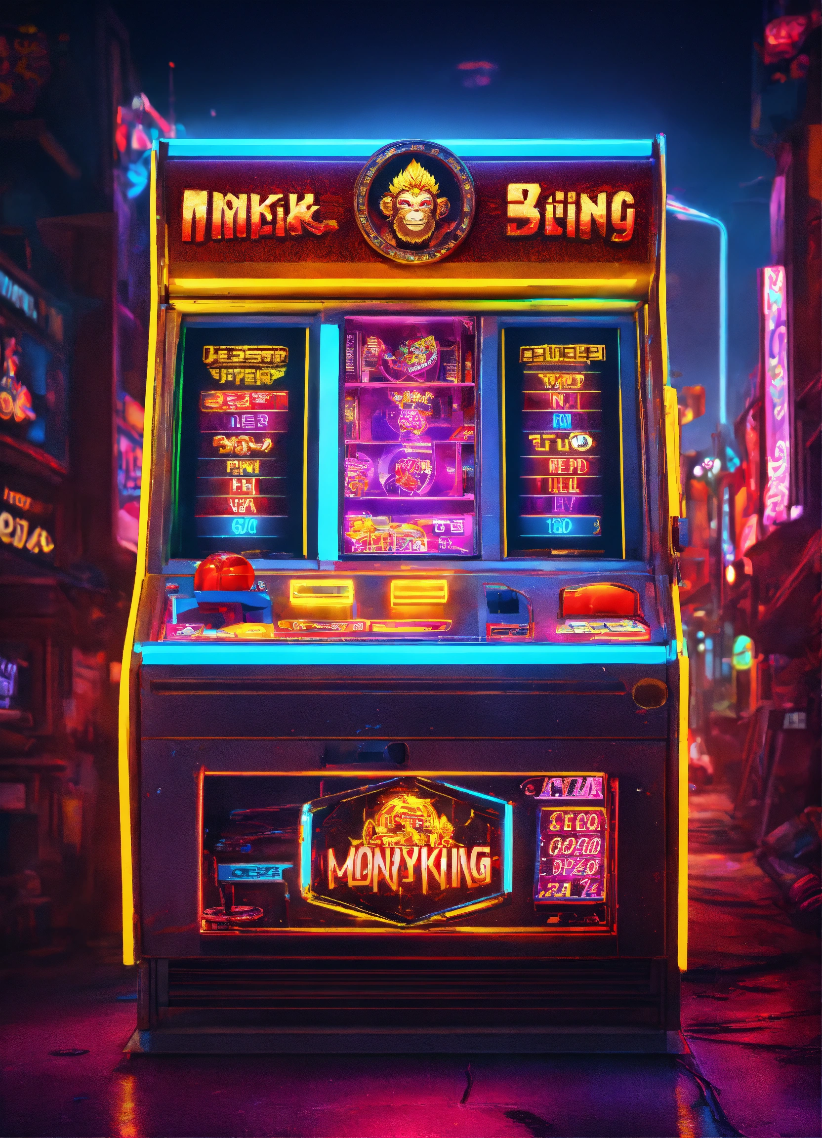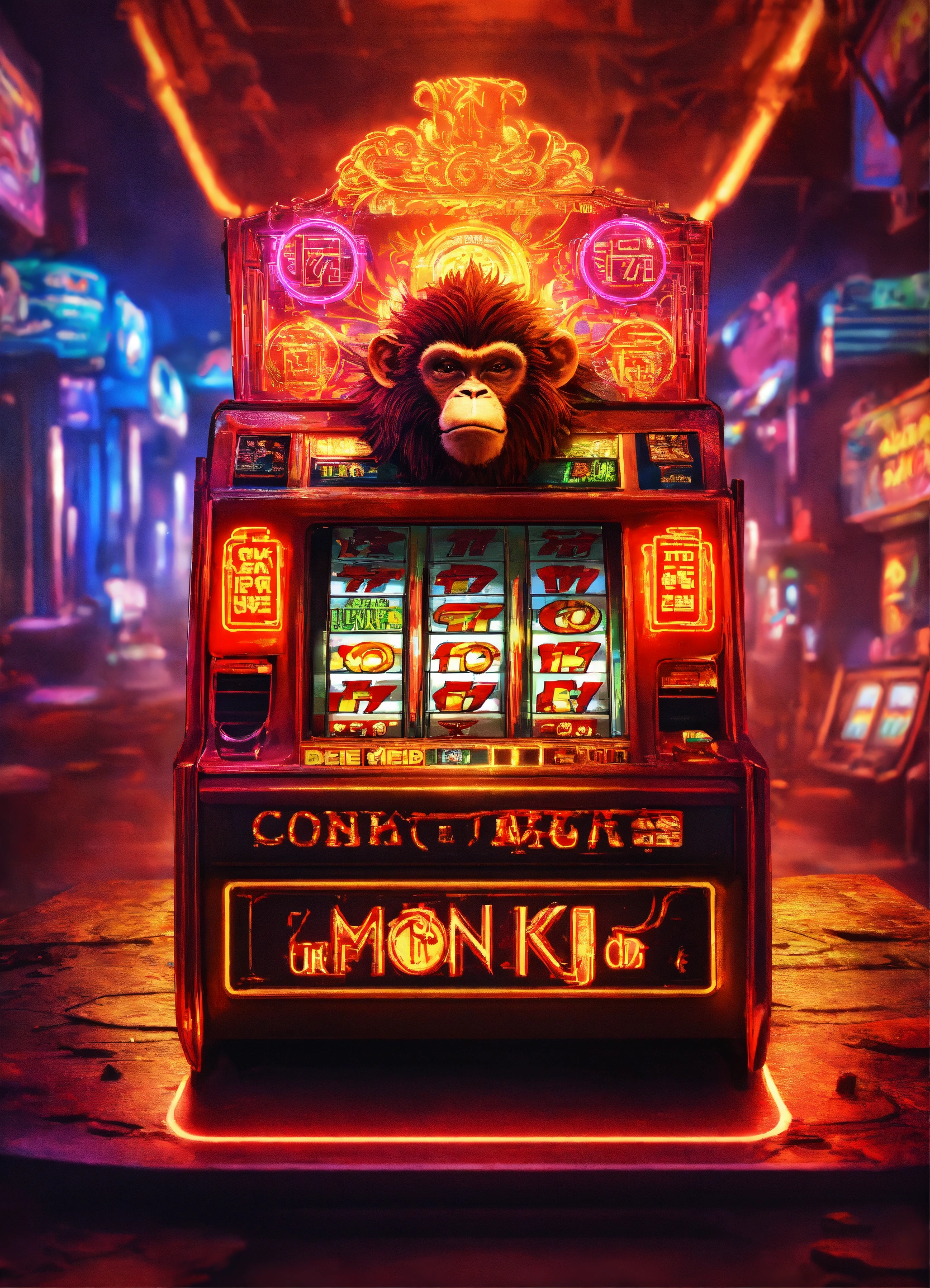 3d post-apocalyptic monkey king slot machine casino neon light cyberpunk background