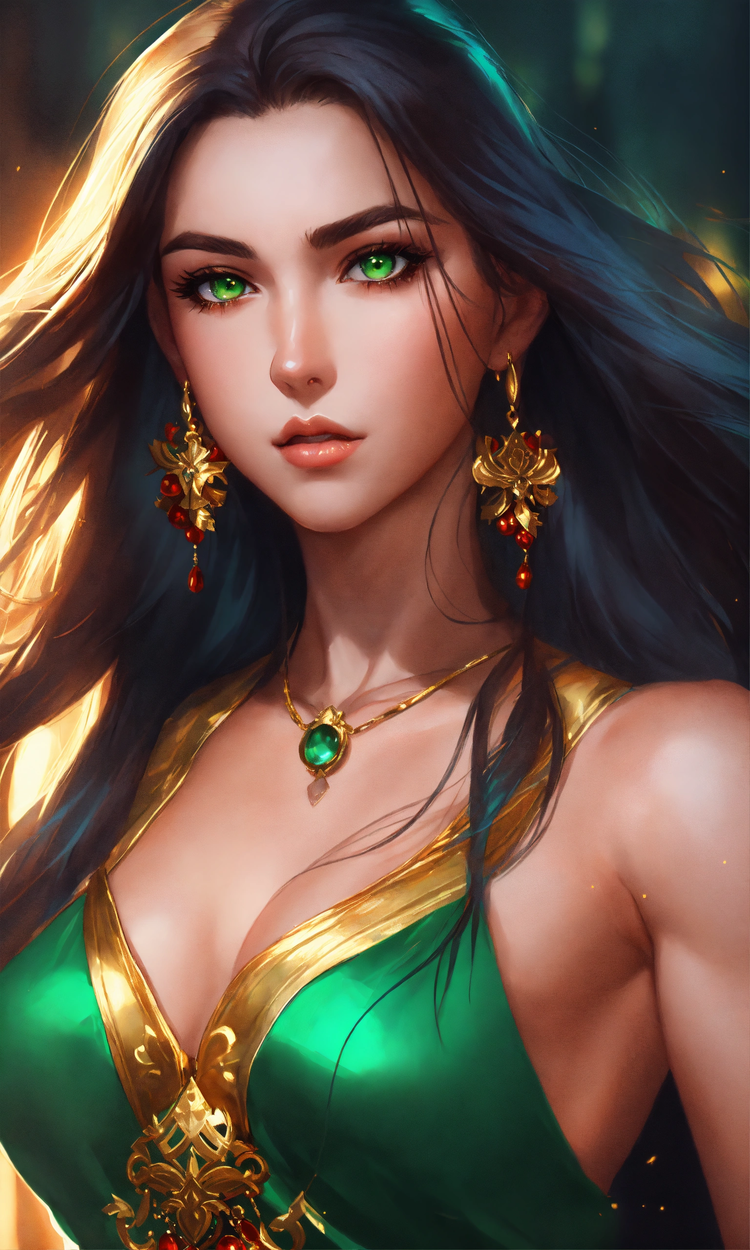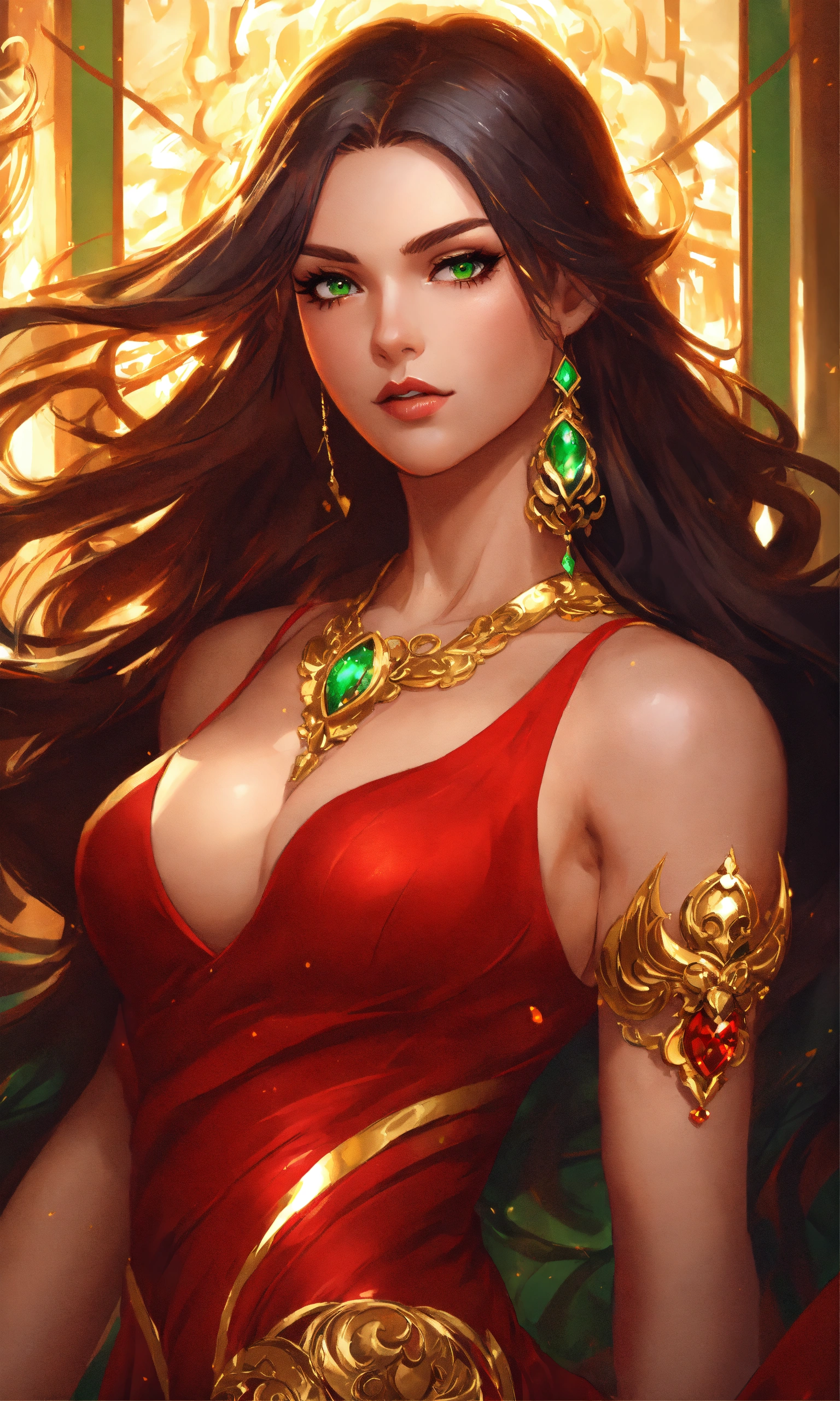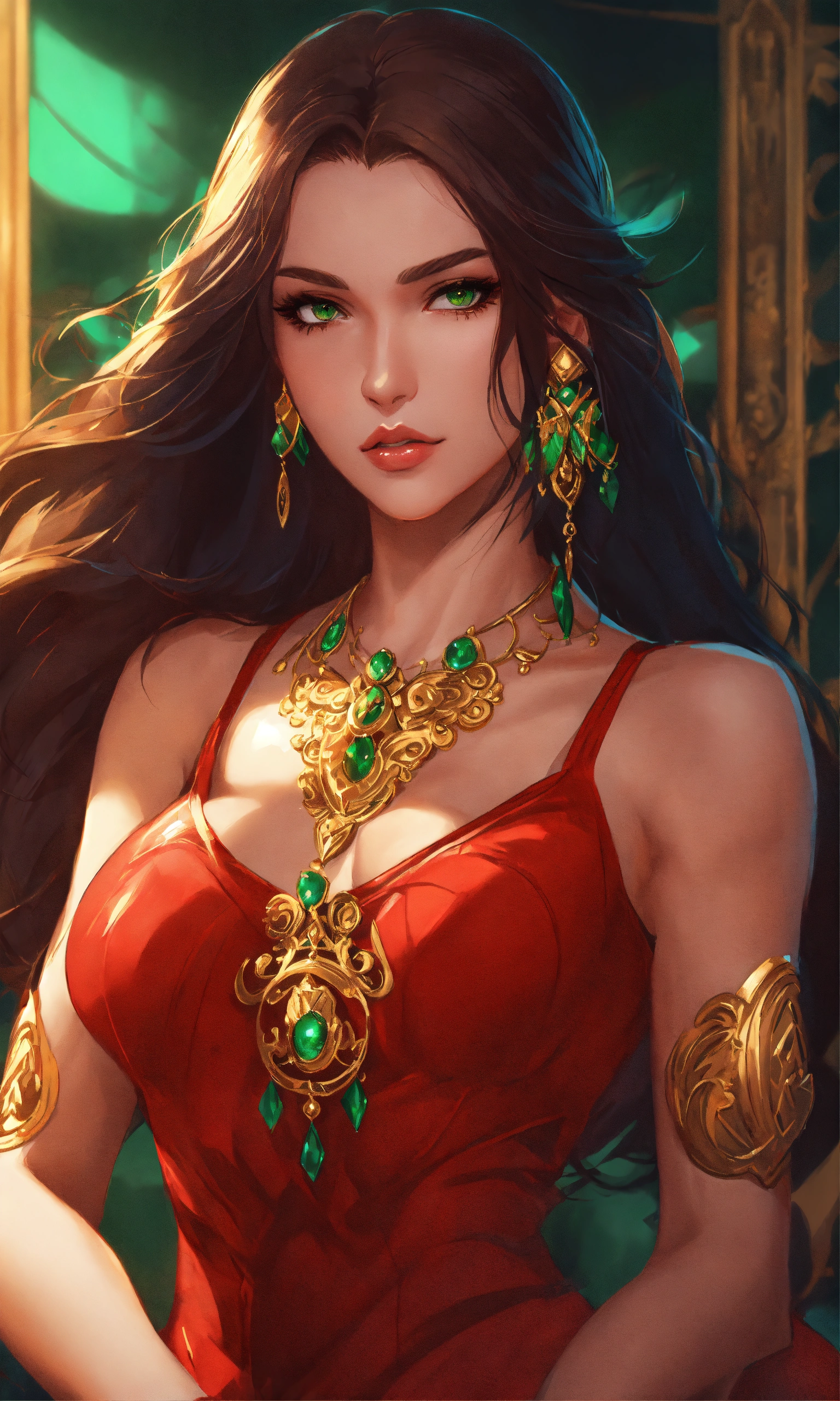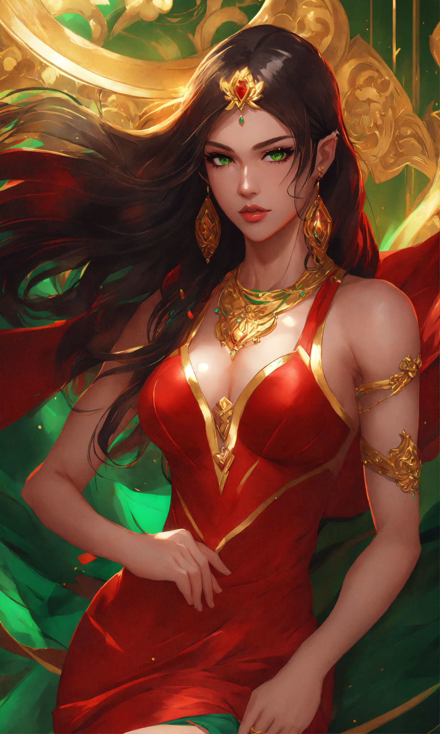 Illustration, woman in short red dress, green eyes, gold ornaments, muscles, long dark hair, photo, animestyle, by artgerm, trending on artstation