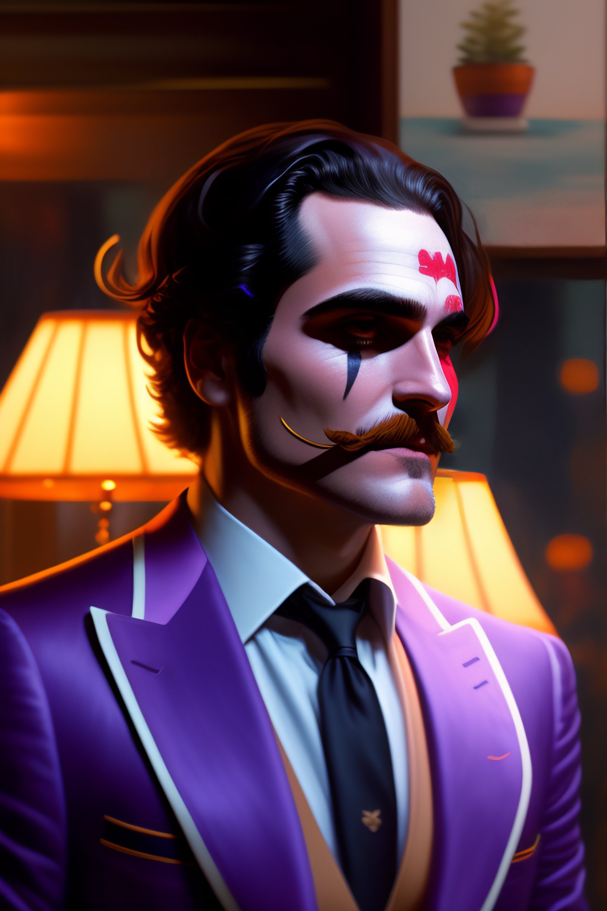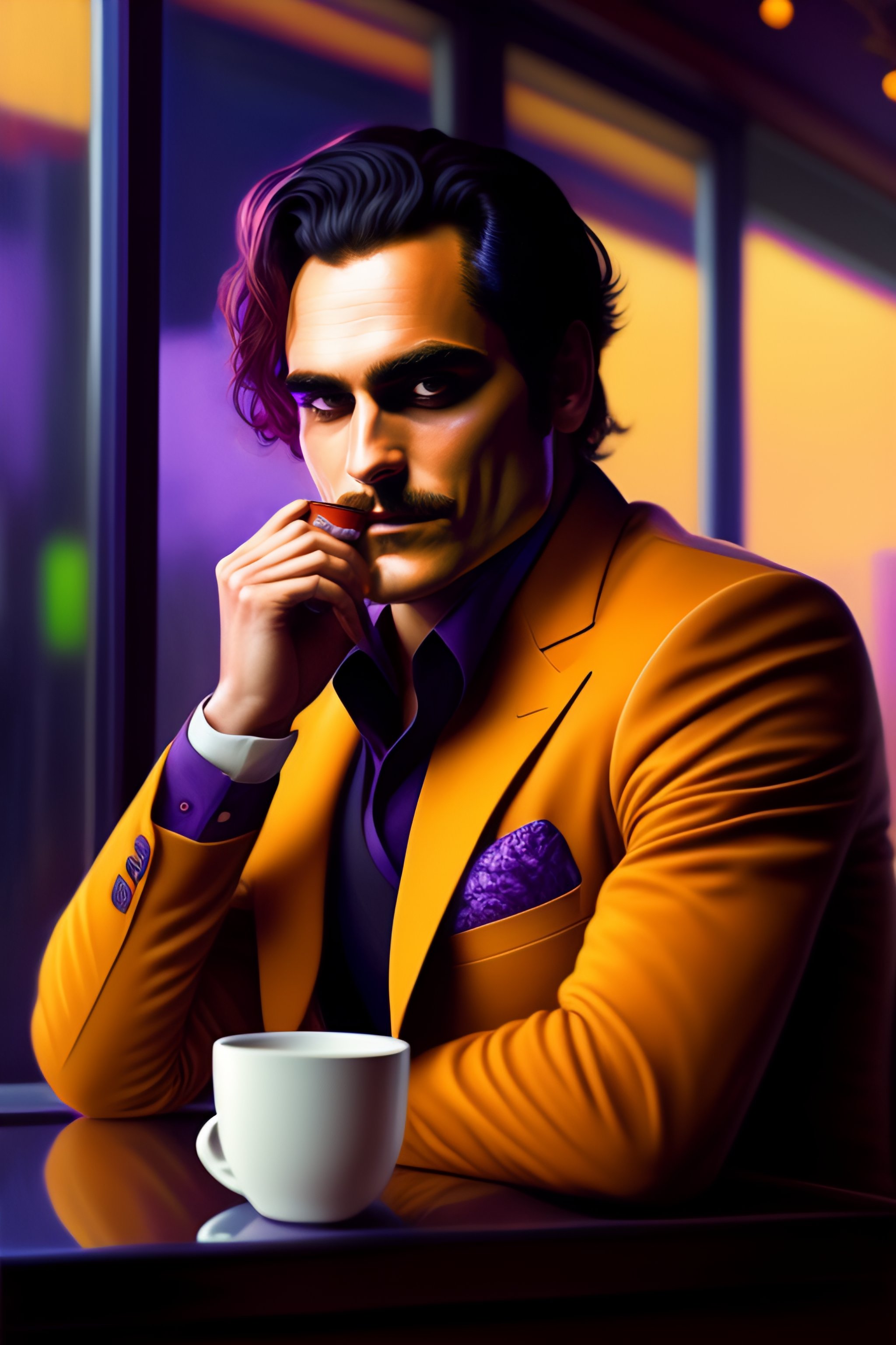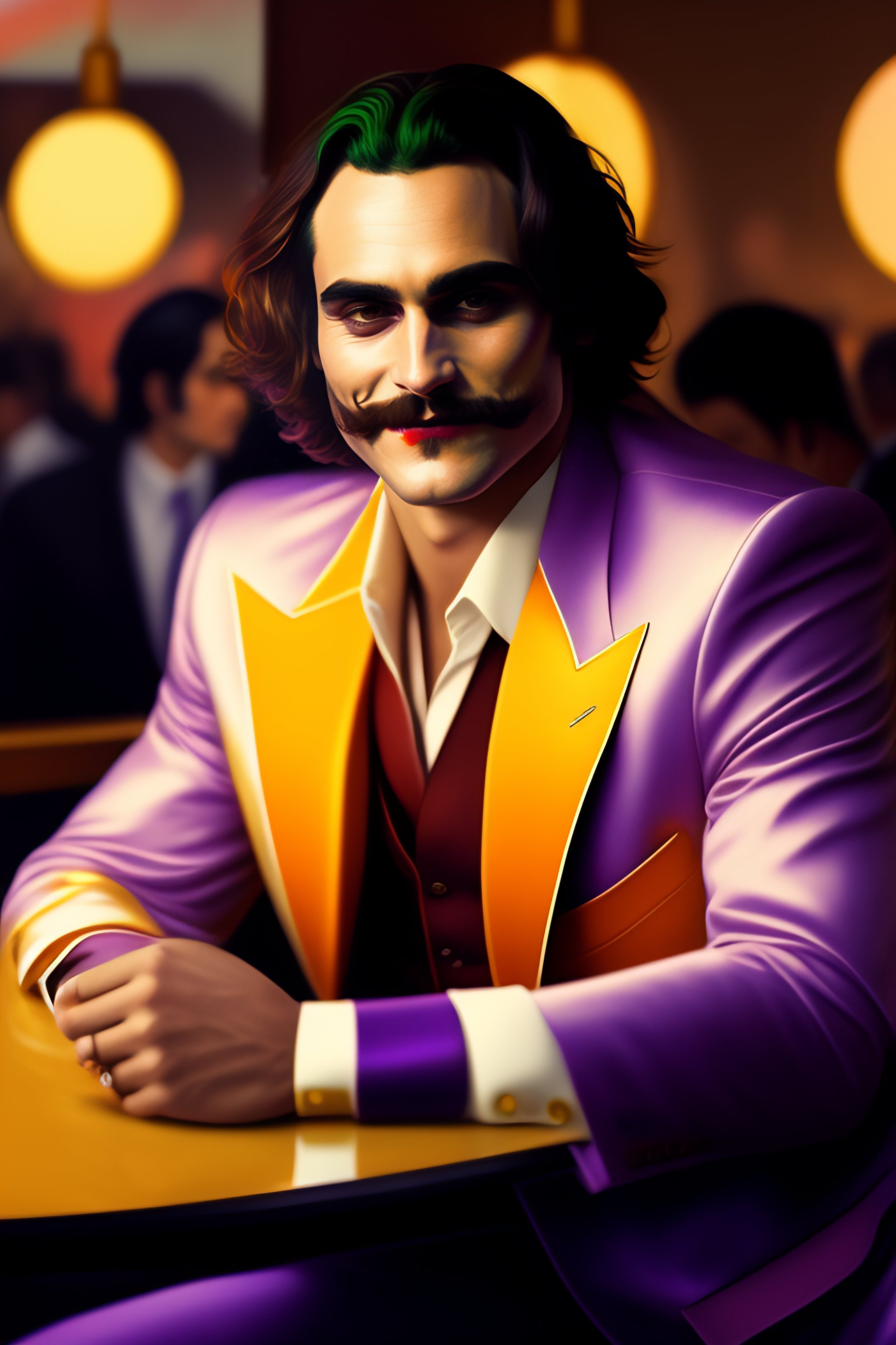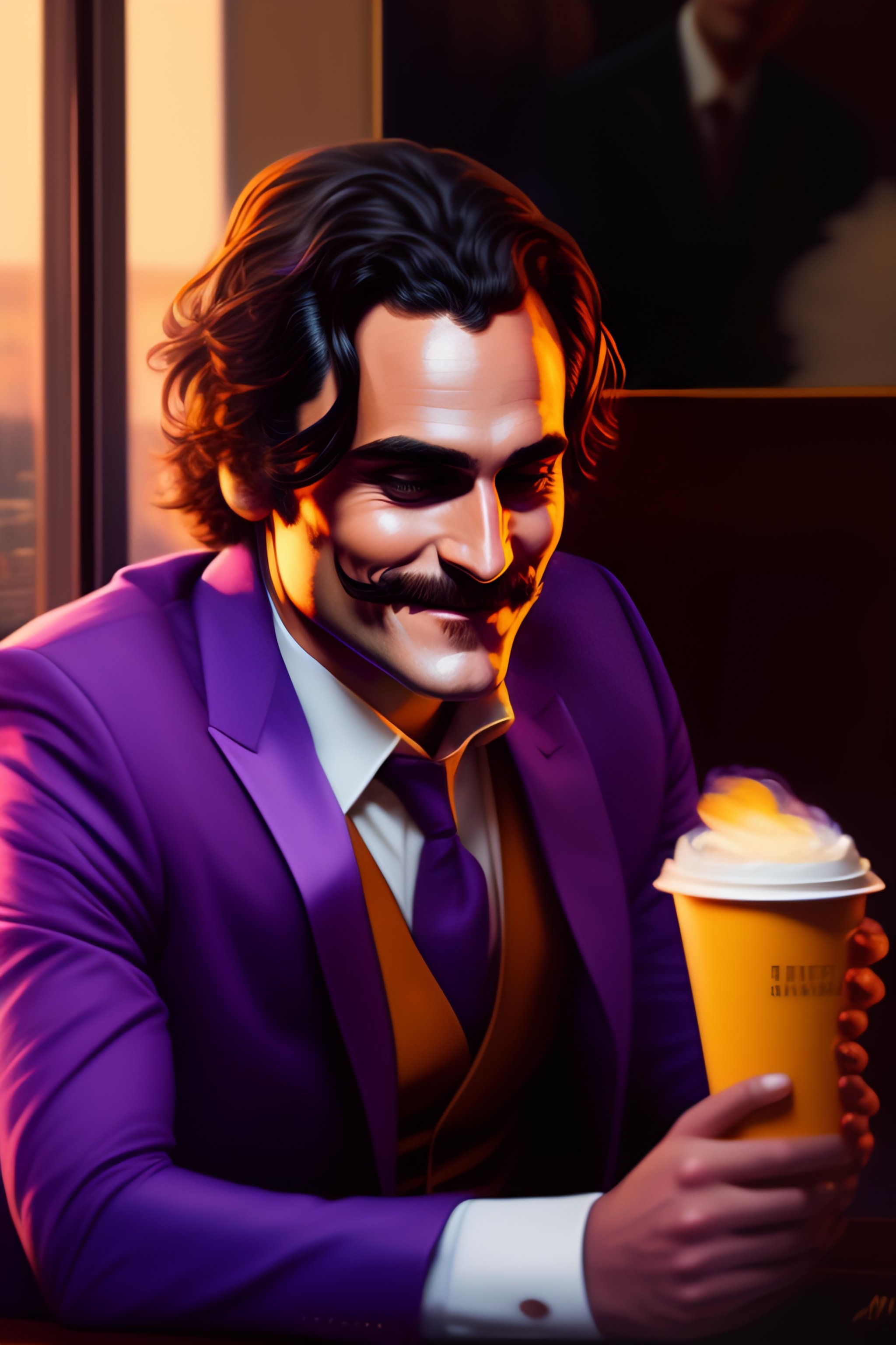 A ultradetailed panting of joaquin phoenix with make up of the joker wearing purple suit in a coffe store smoking, oil painting, by ilya kuvshinov, greg rutkowski and makoto shinkai, heavenly beauty, barely clothed