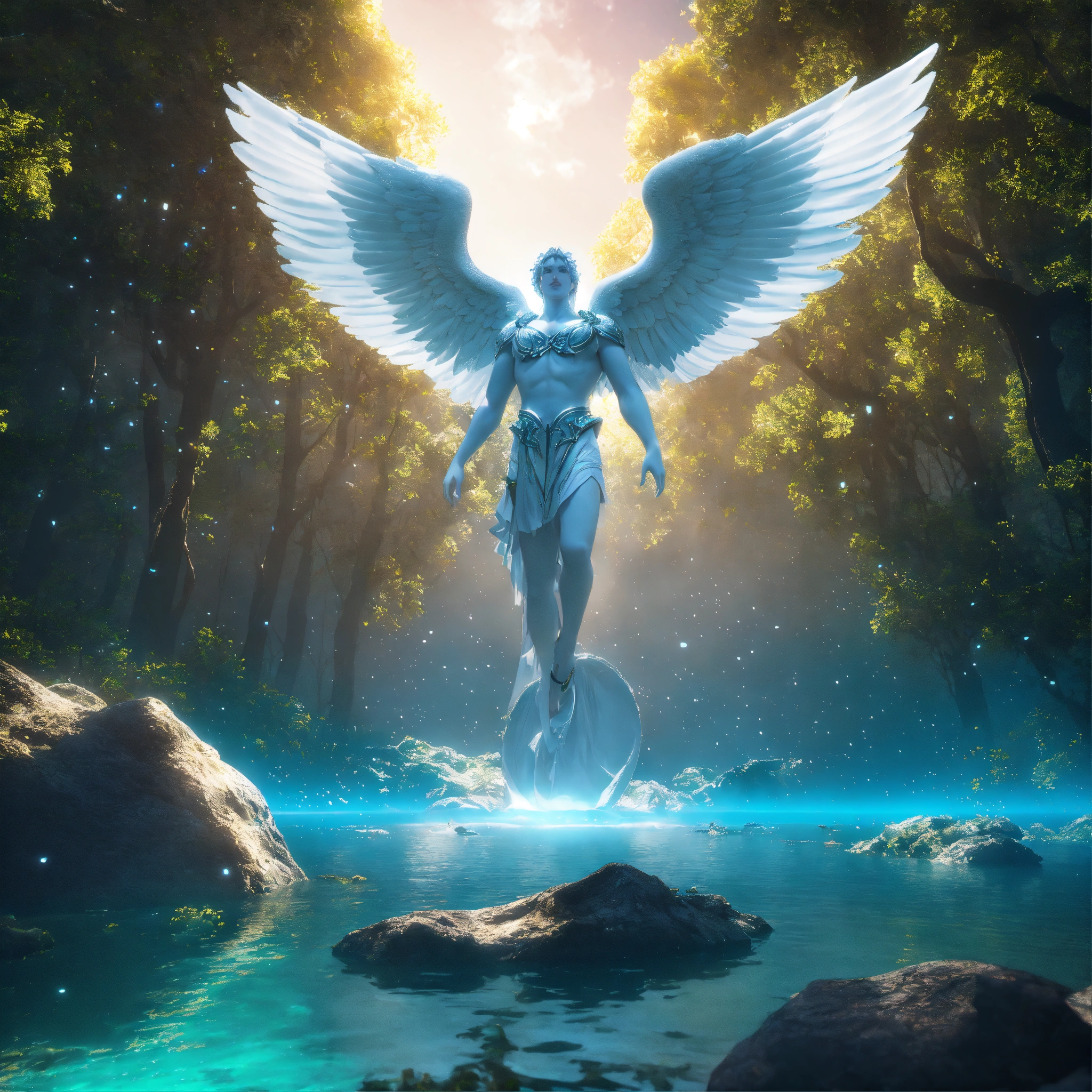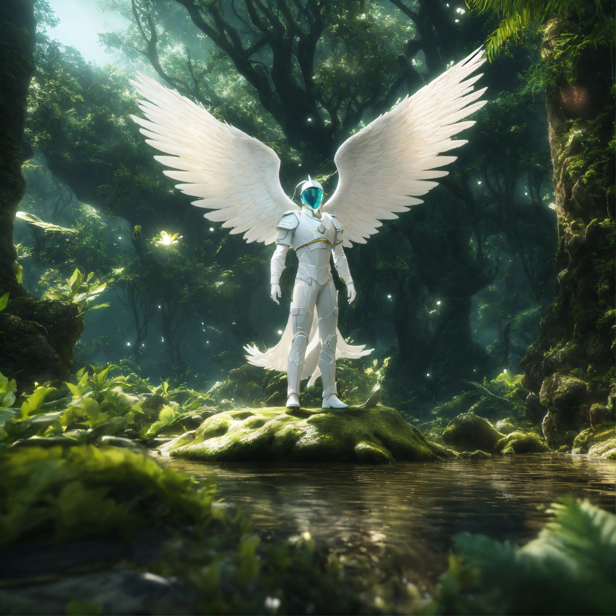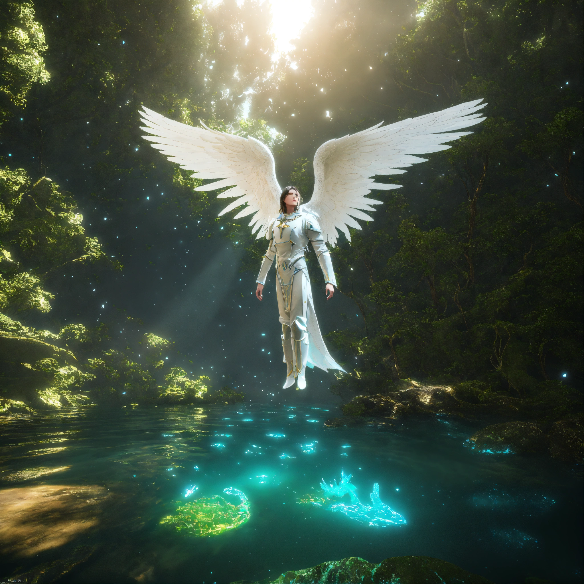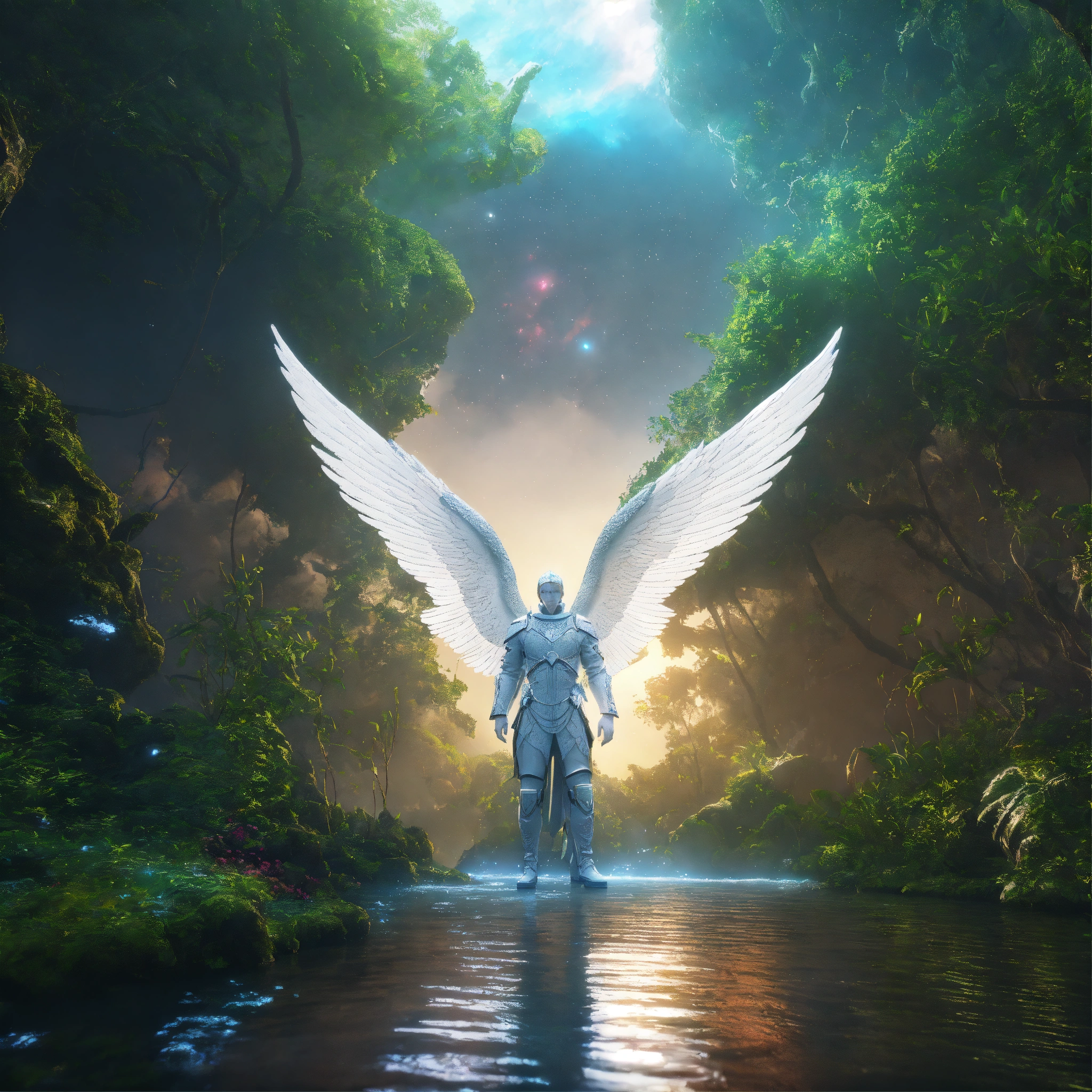 White archangel michael in dress, reptile in the forest, being reincarnated into a ocean world, sky nebula, artstation scifi 3d scene of a showing forest, maximalism, ambient occlusion, atmospheric haze, unreal engine, hyper realism, realistic shading, cinematic composition, realistic render, octane render, detailed textures, photorealistic, wide shot