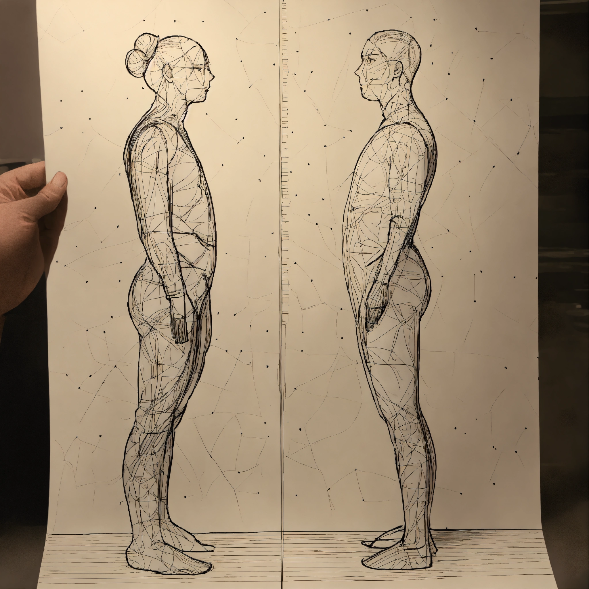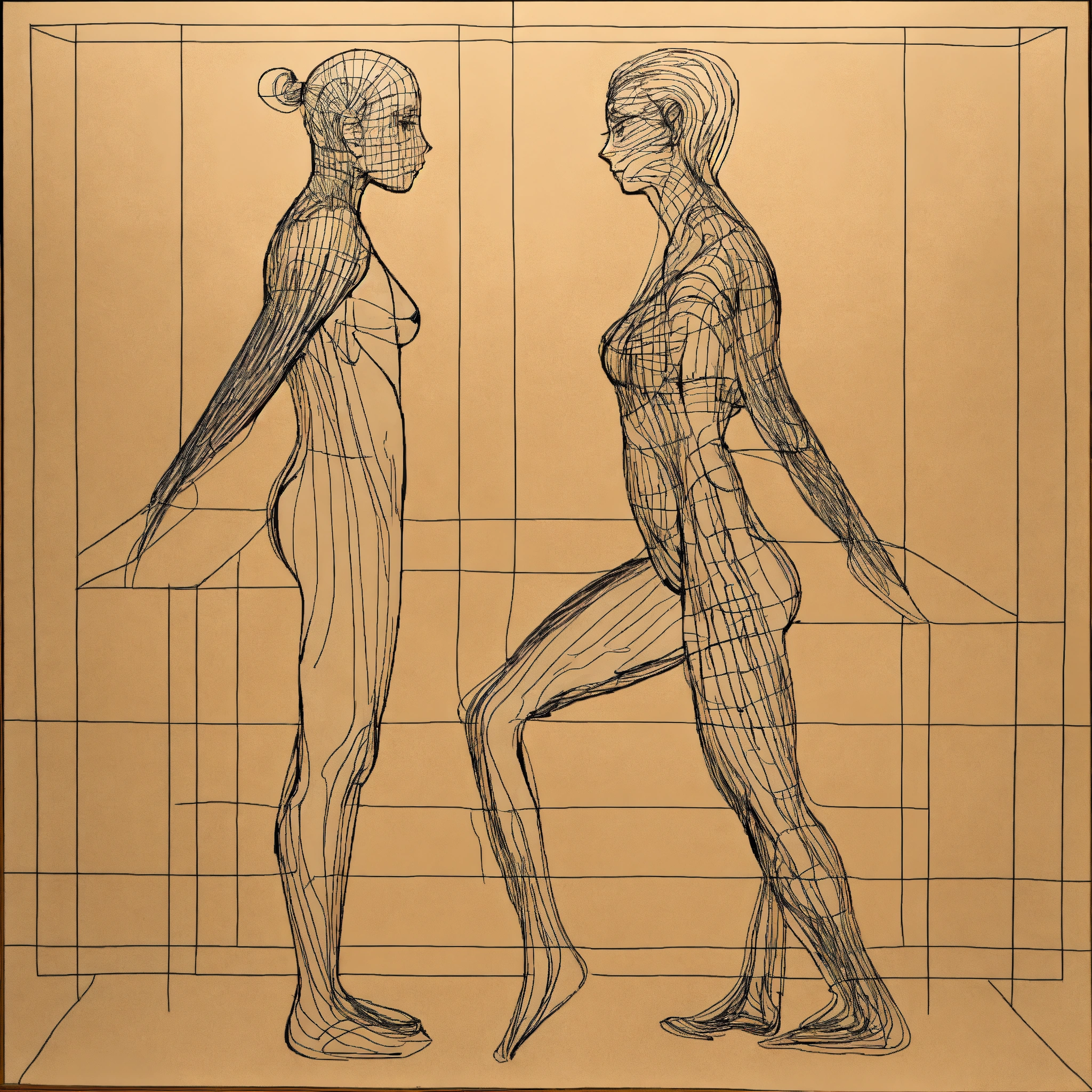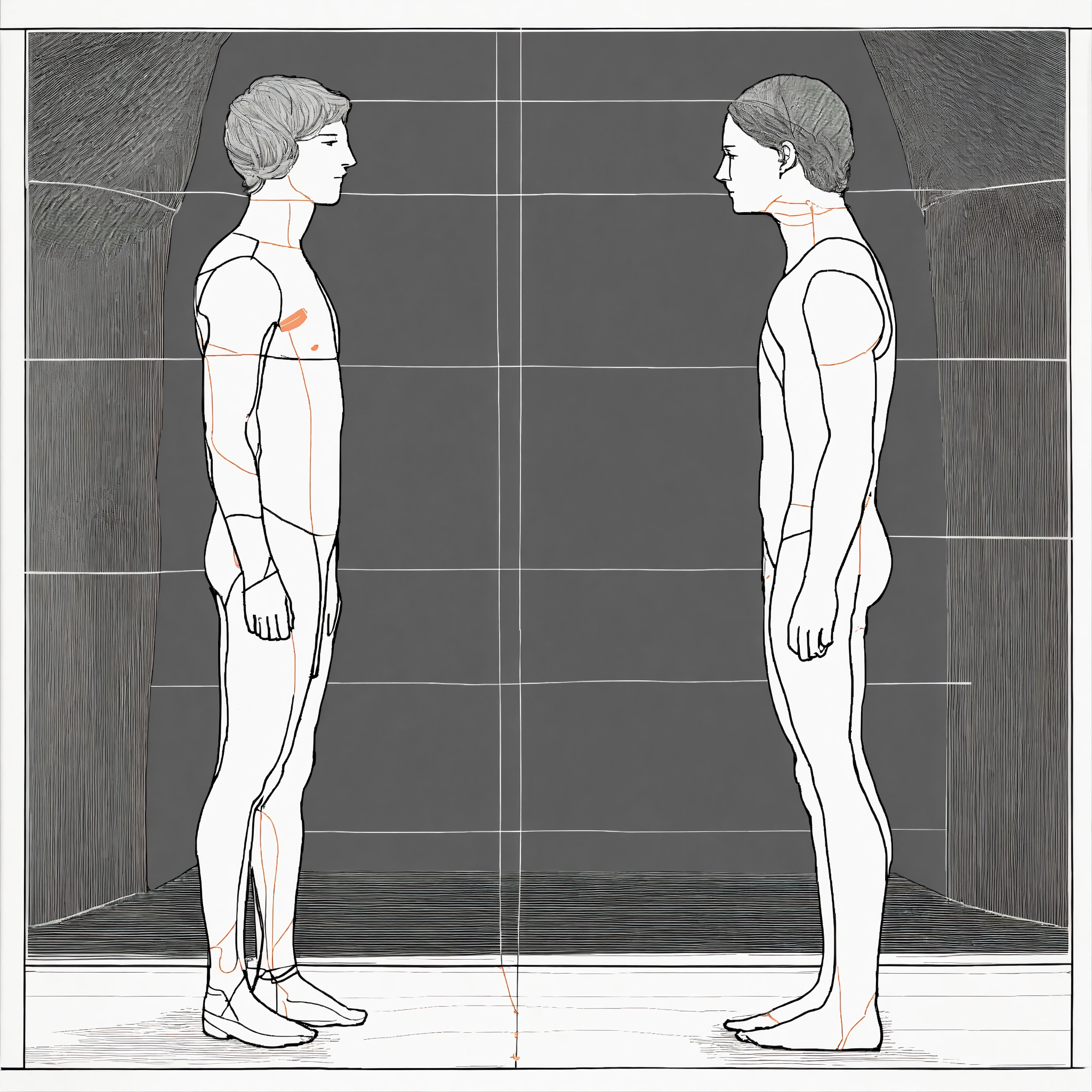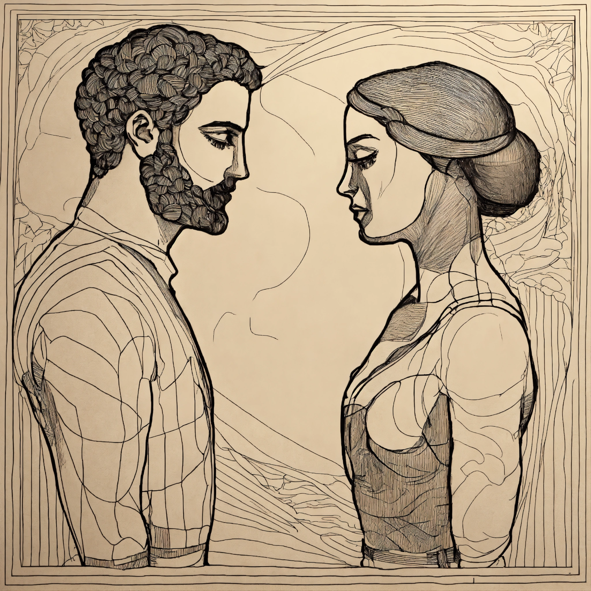 Conintuous line drawing of whole body of a man and woman facing each other