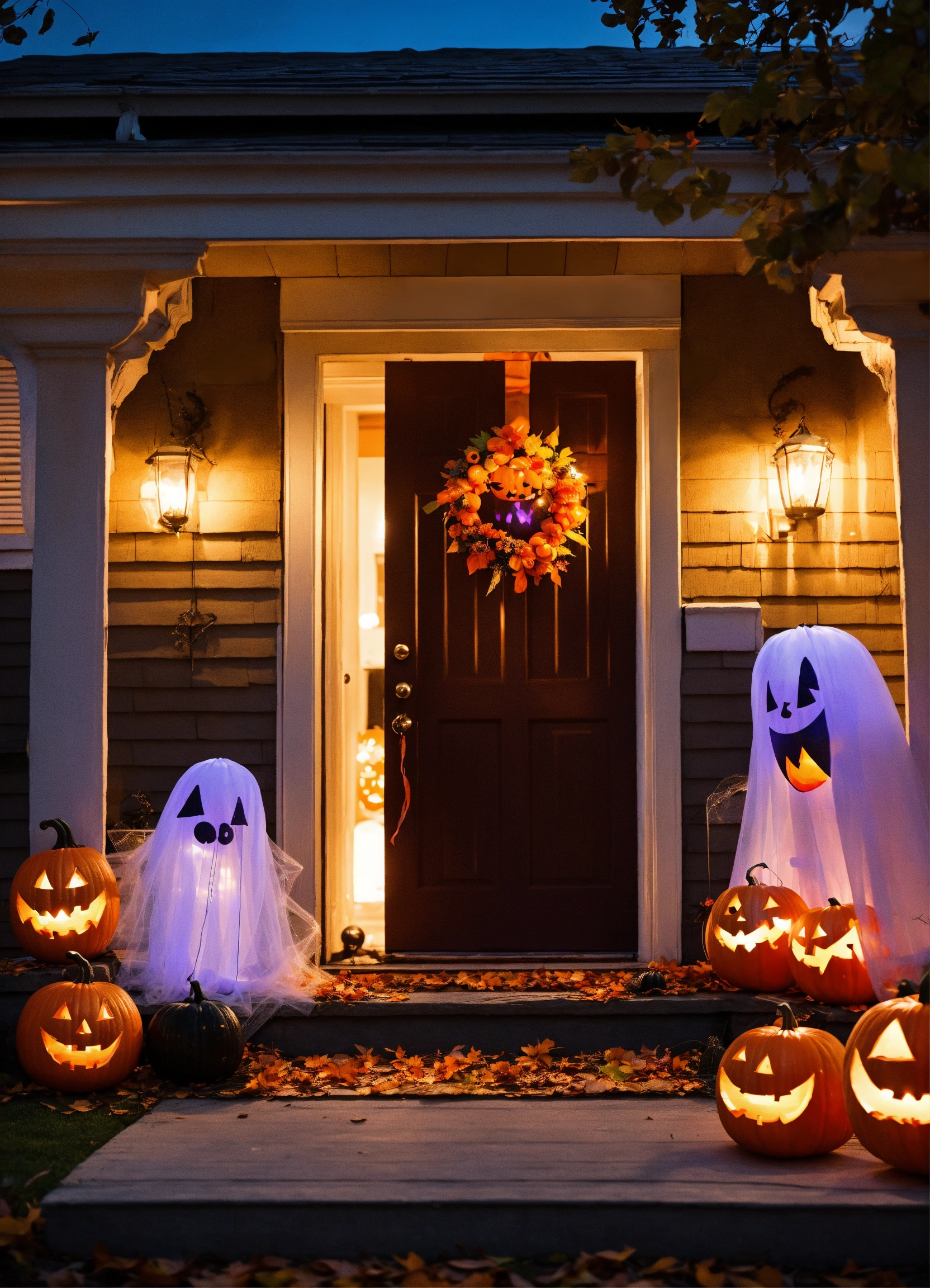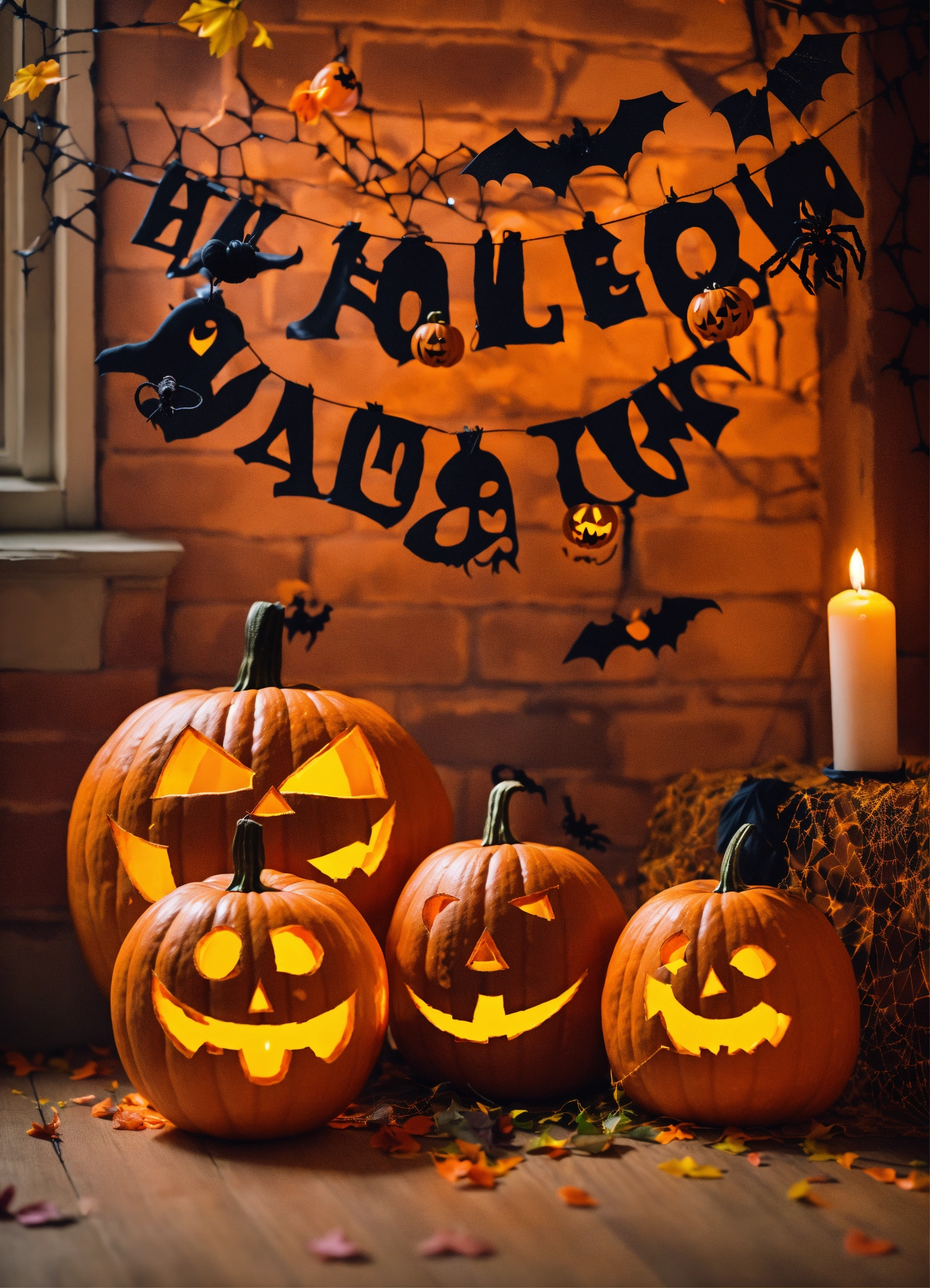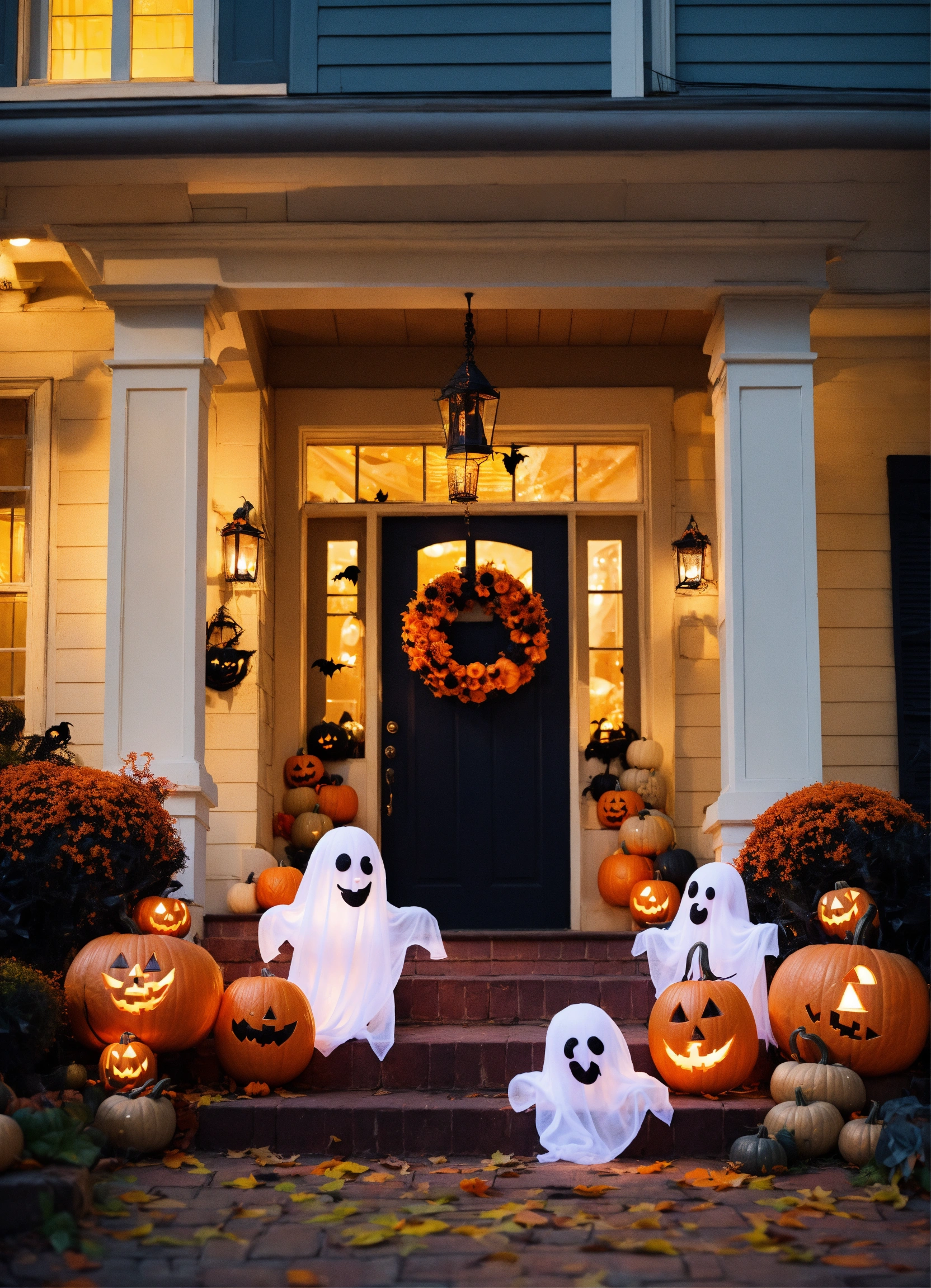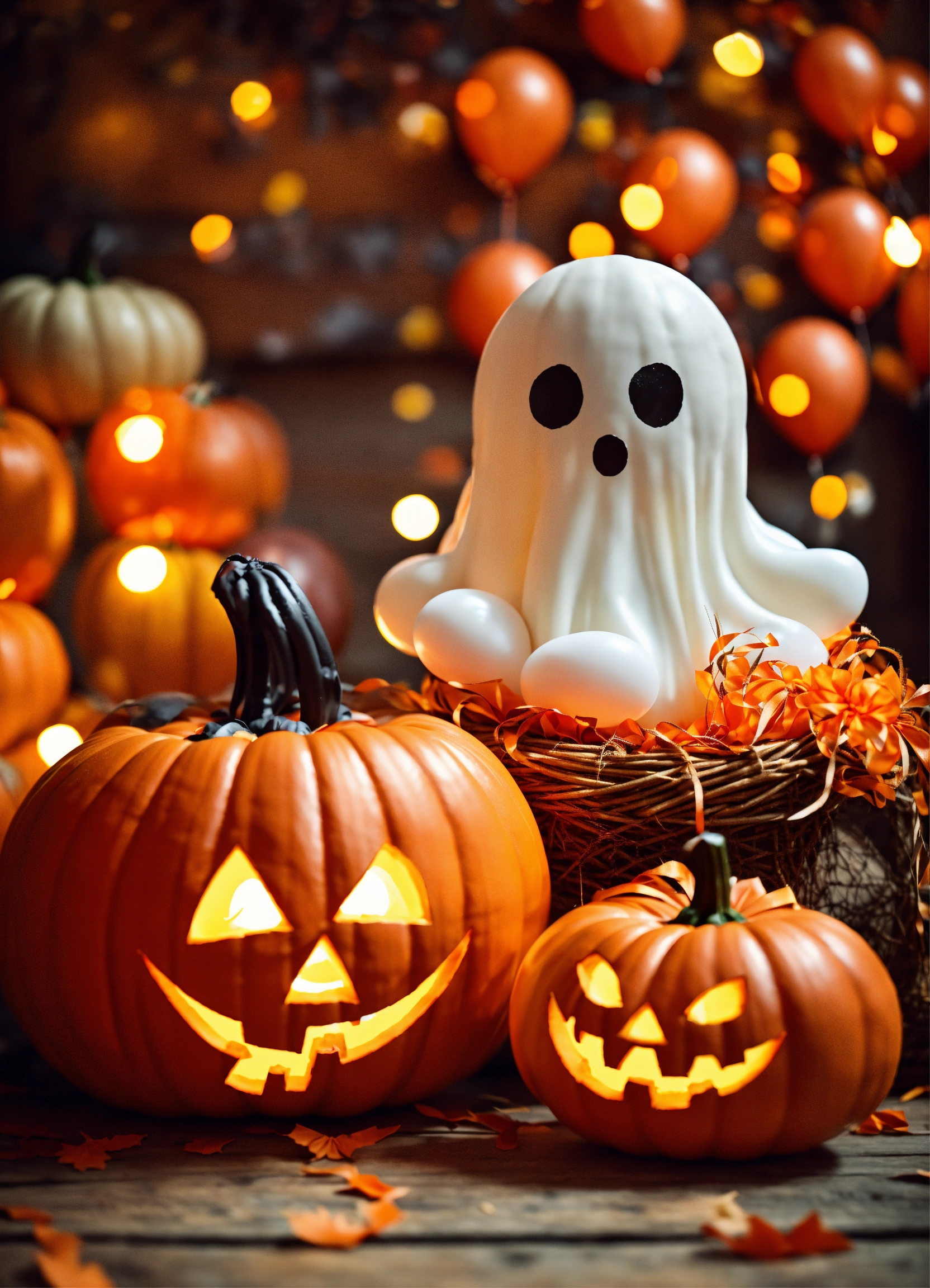 A funny and cute hallowen decoration for kids, cute ghosts, treat or trick letters, ballons, spider webs, photo 4k