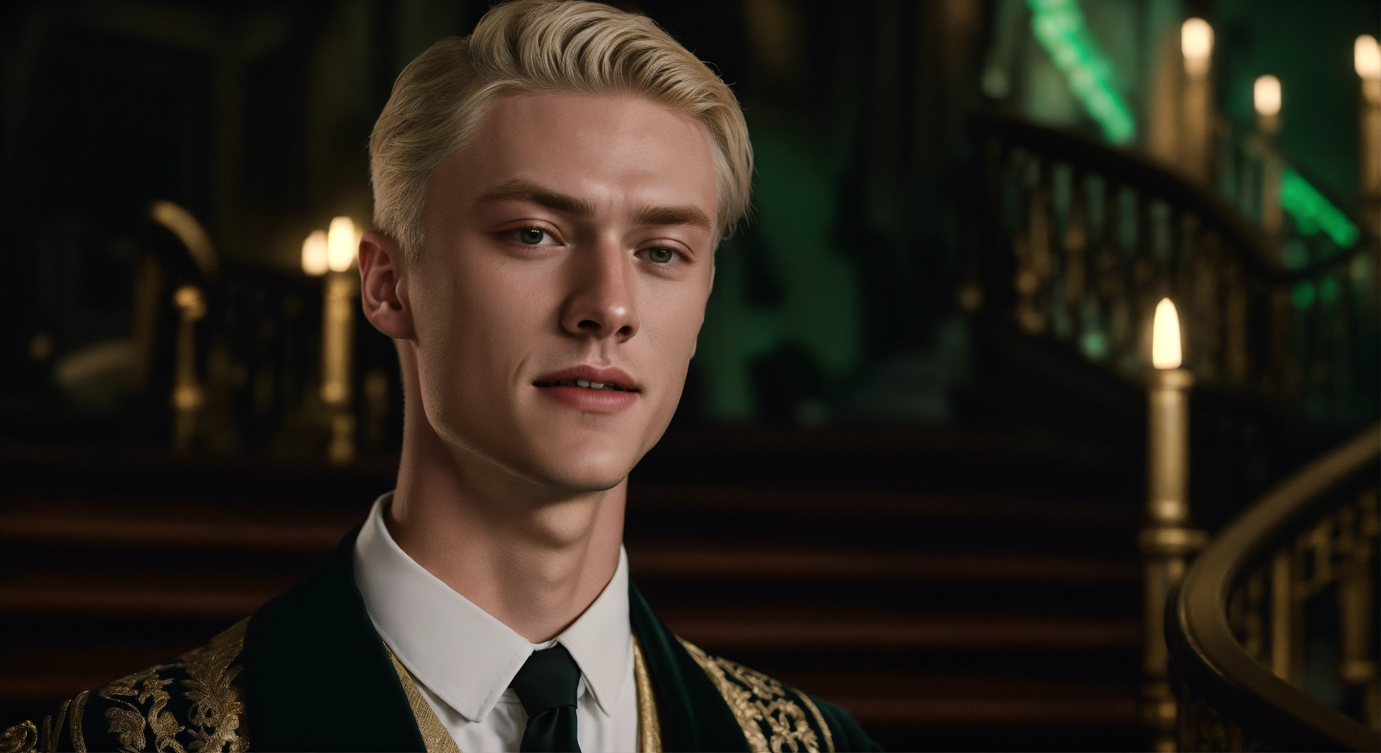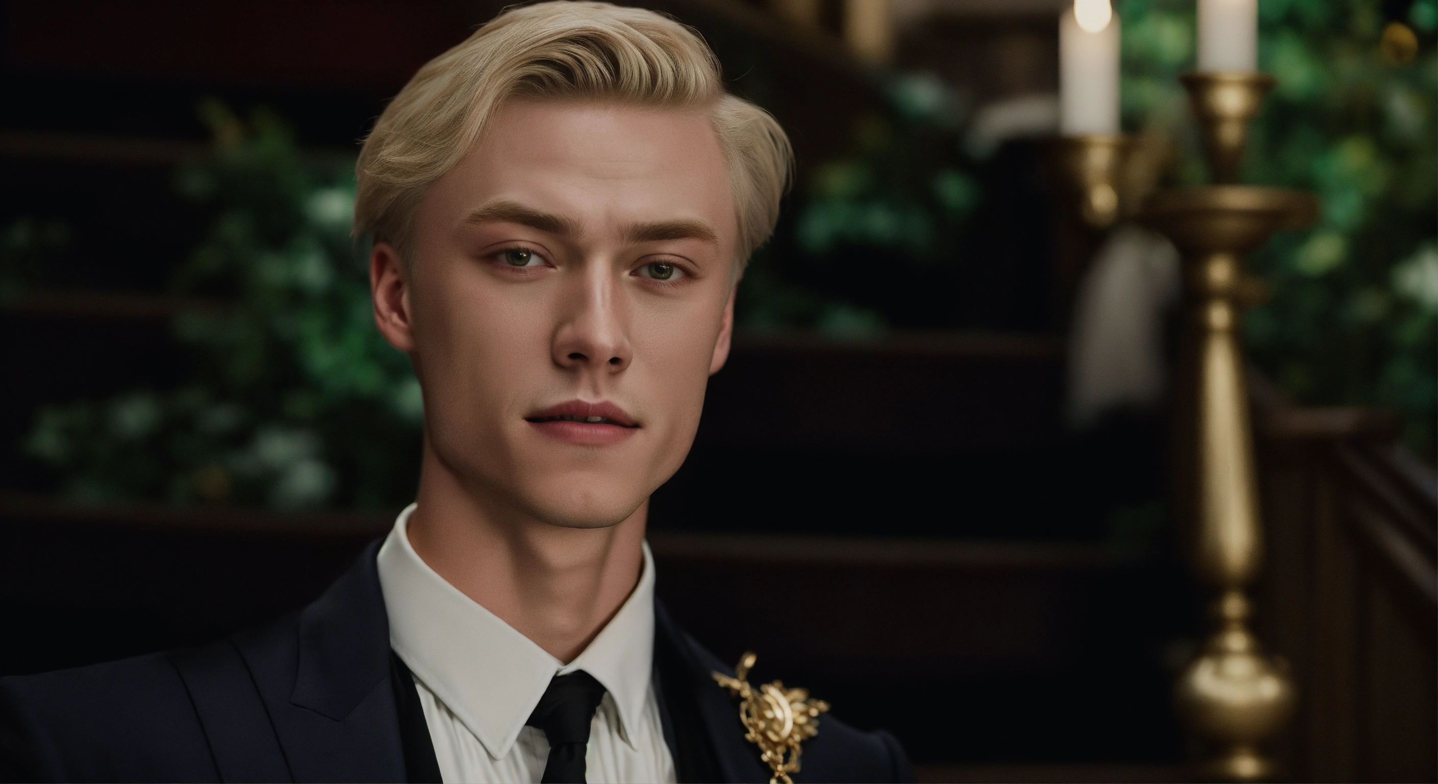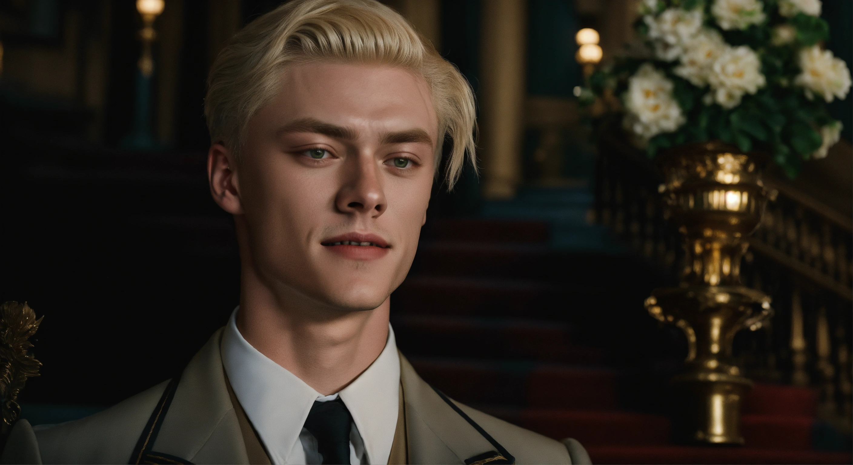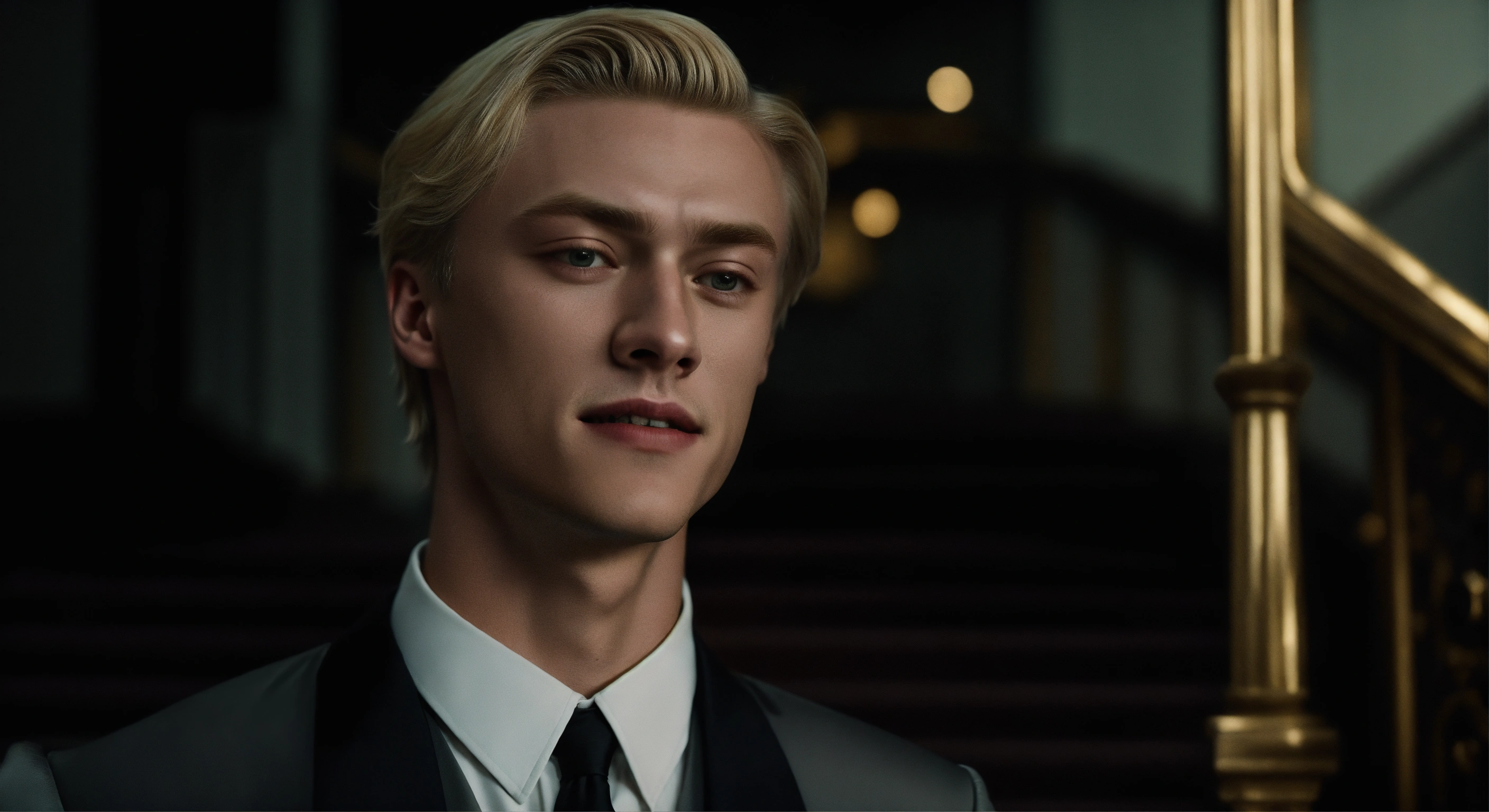 High quality, movie scene of lucky blue smith as draco malfoy smile with high cheekbones white suit with gold down a grand staircase at a white gala on new years day. brown tones. 8k resolution. digital art, high quality, realistic, tv show lighting, perfect lighting, canon 35mm f2.0, natural lighting, film grain, movie scene