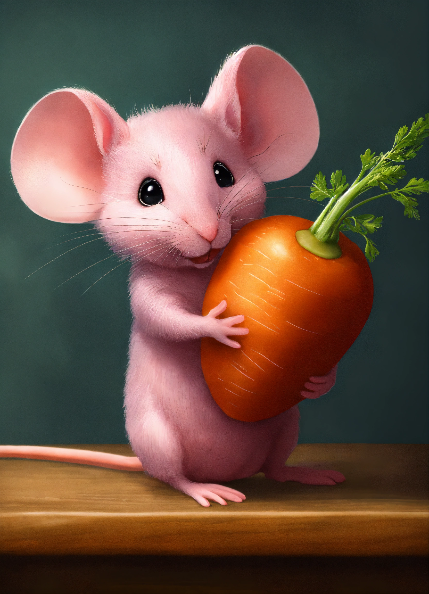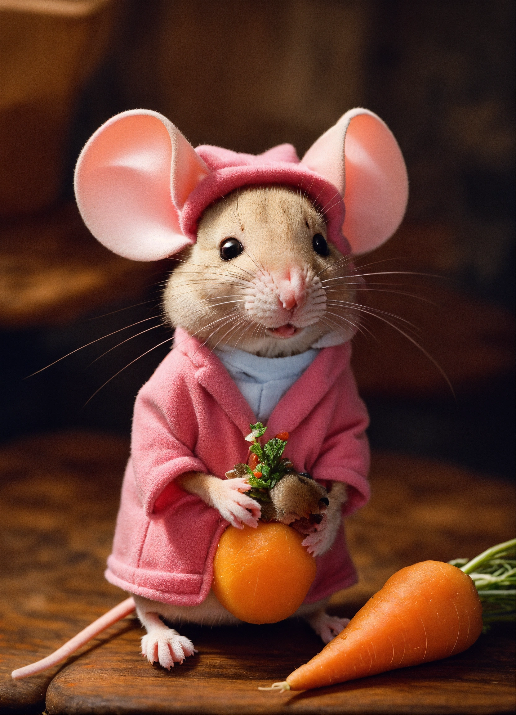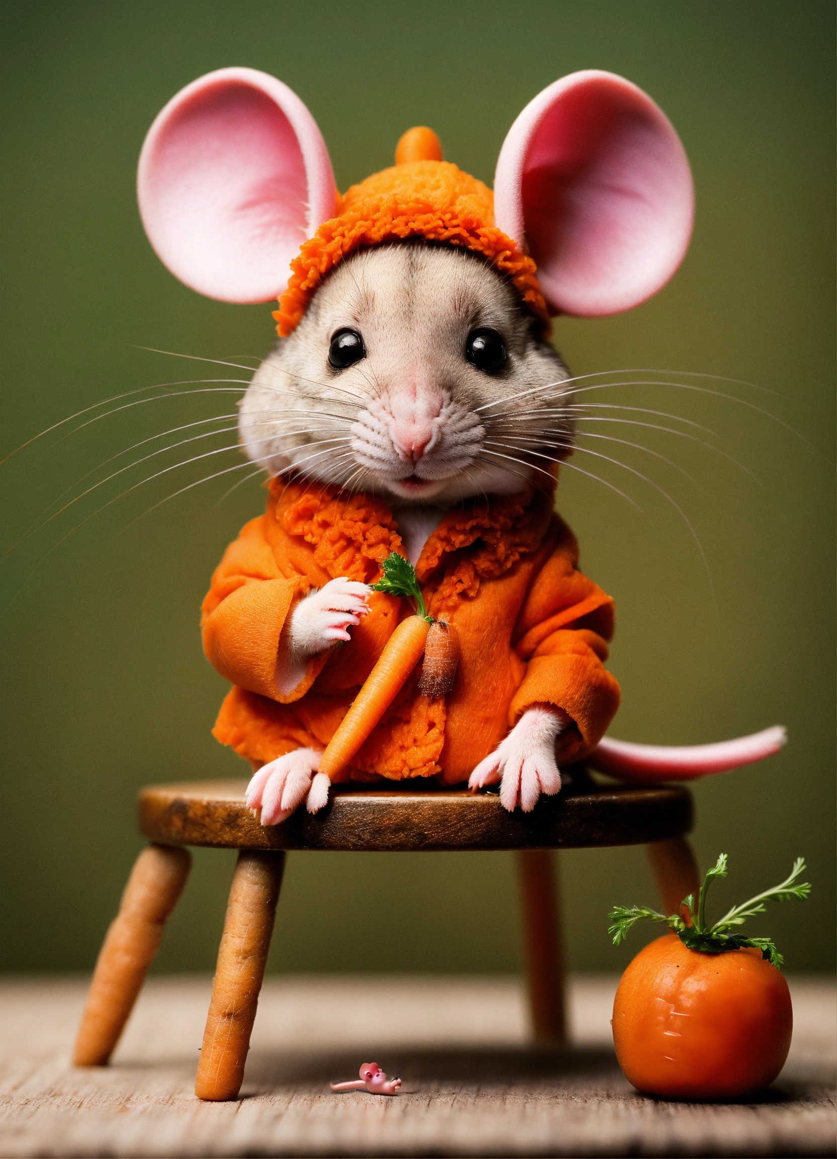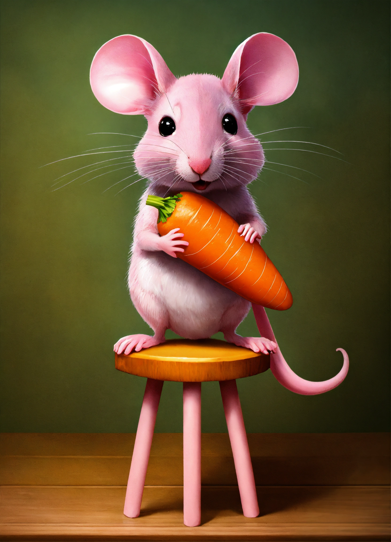 A little pink mouse sitting on a stool eqting a carrot