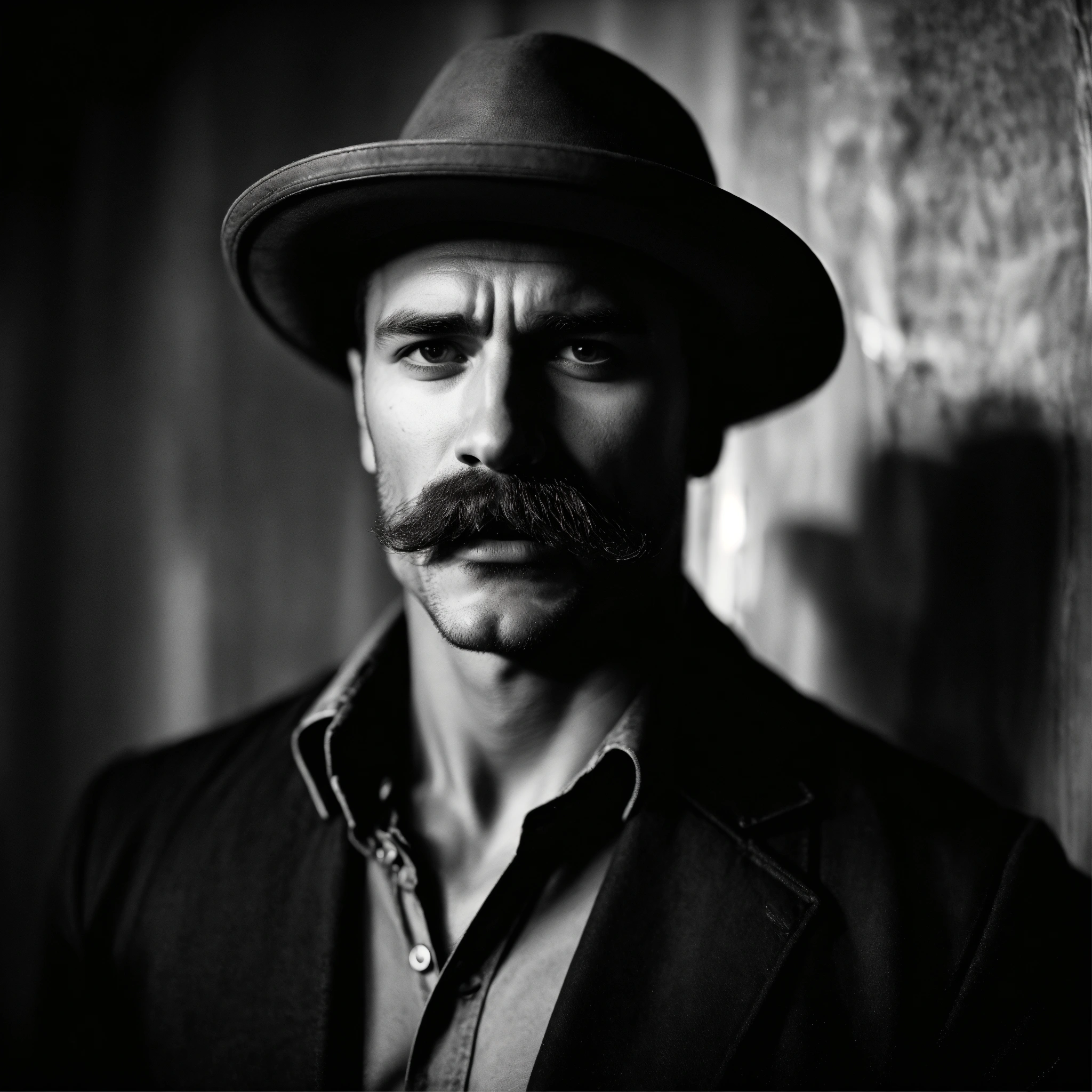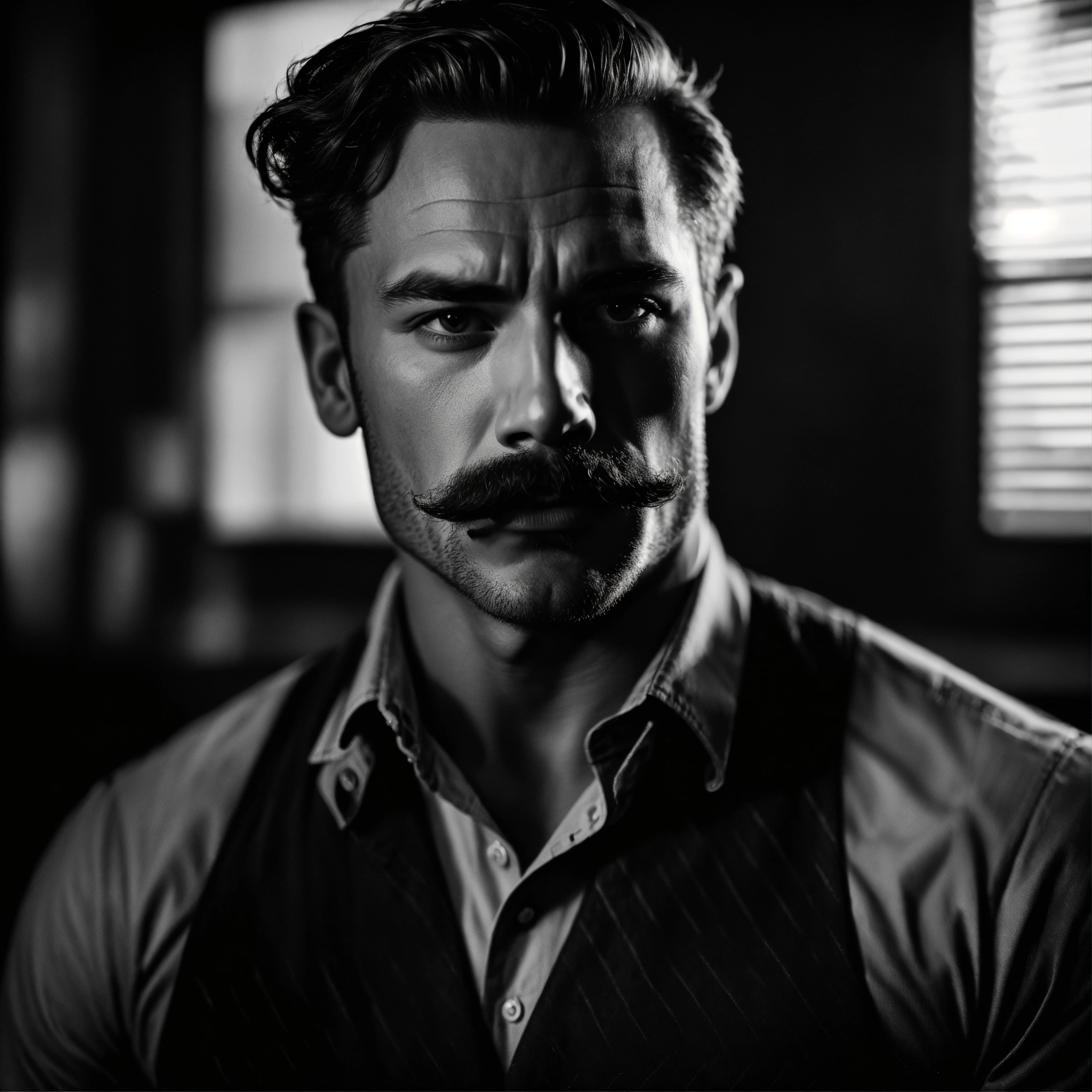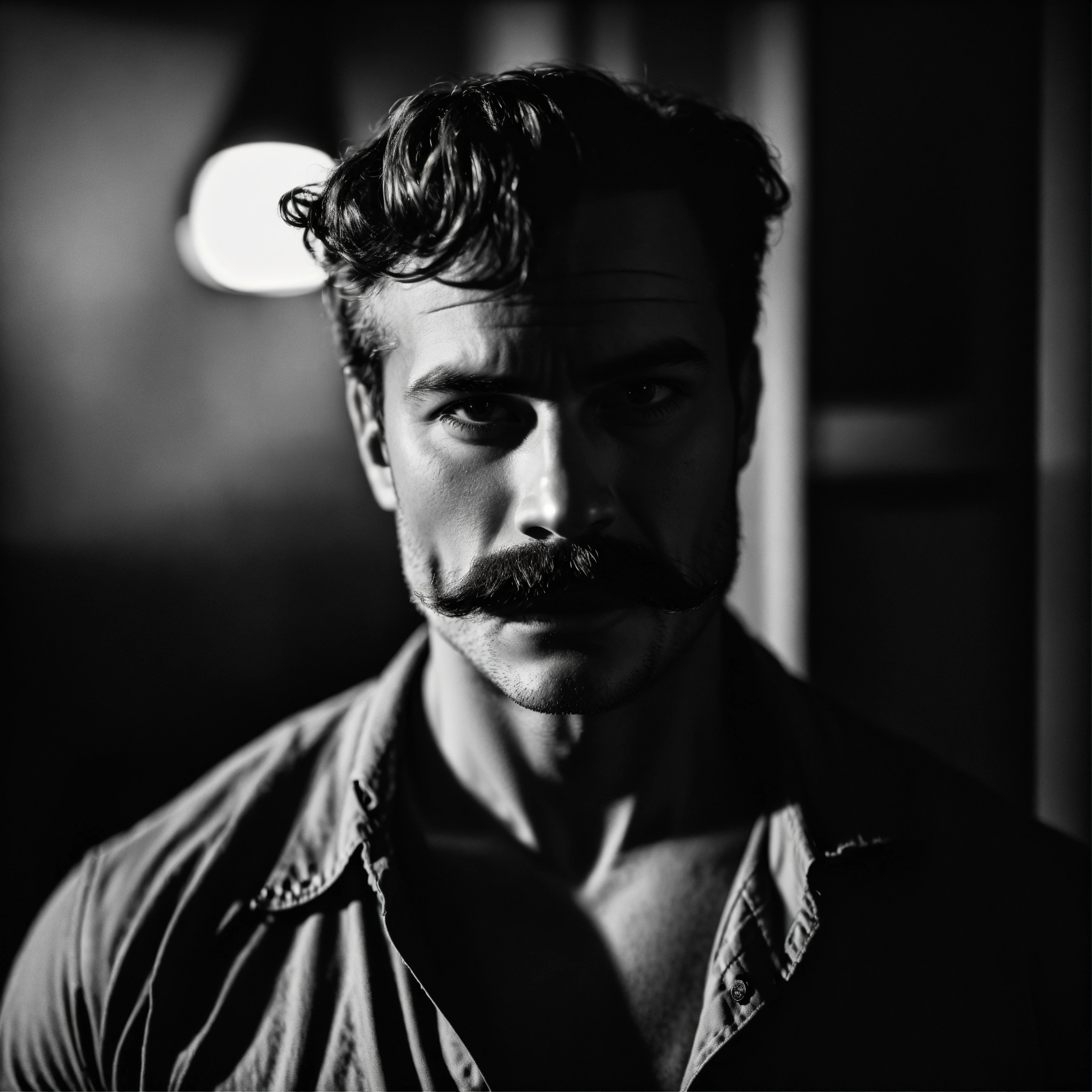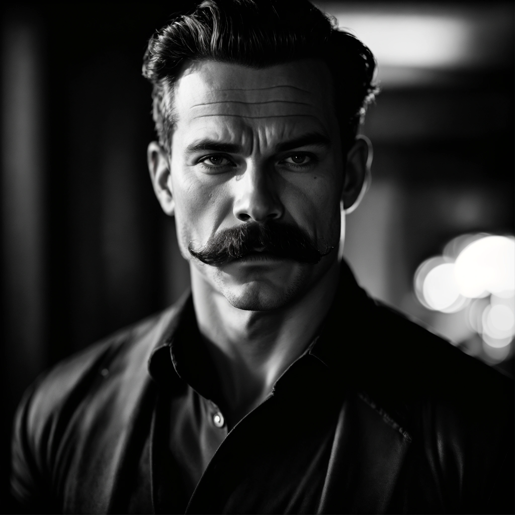 Detailed and powerful portrait of a muscular man with a distinguished mustache, bold and confident expression, dramatic lighting, strong shadow play, chiaroscuro, vintage black and white film photography, leica m monochrom, full shot