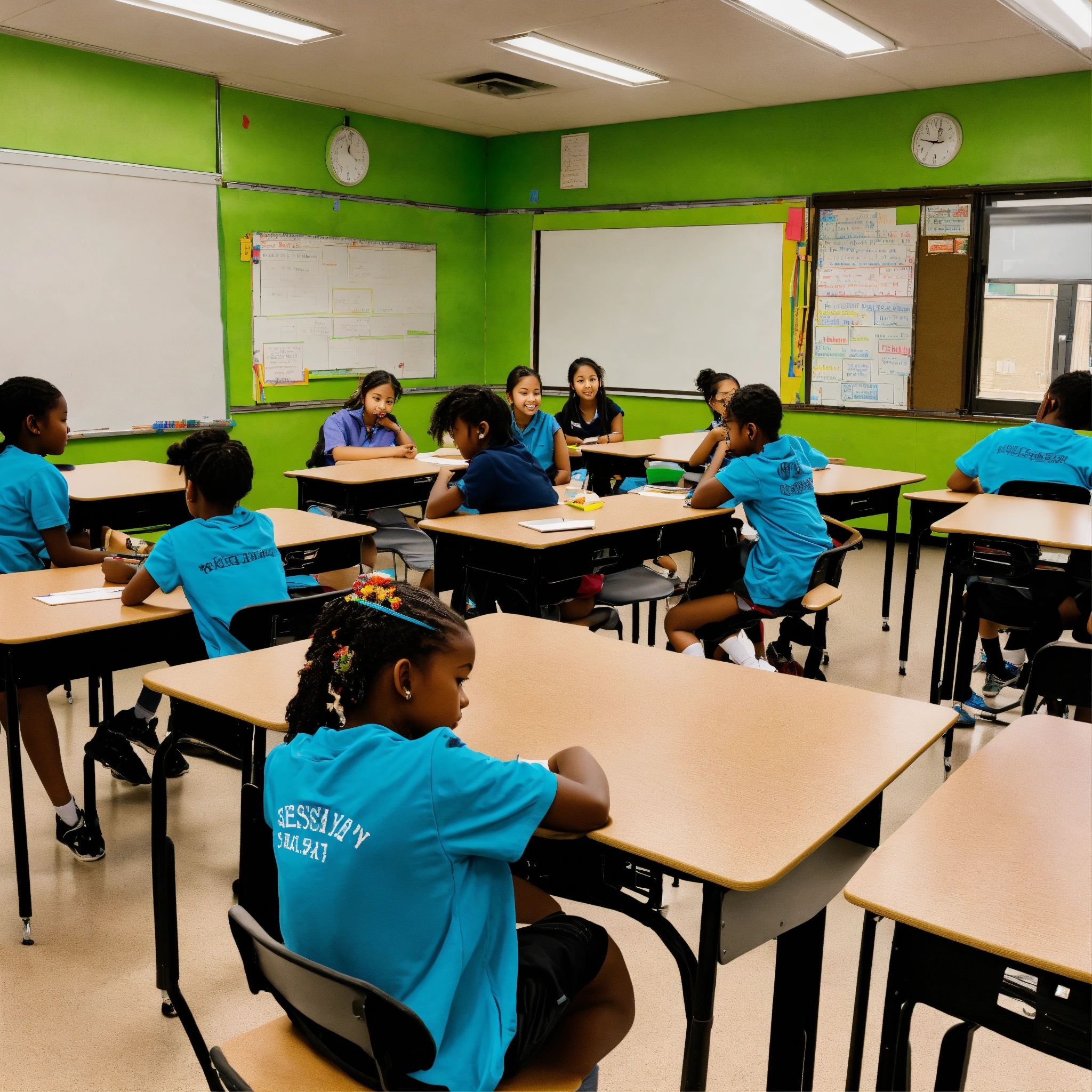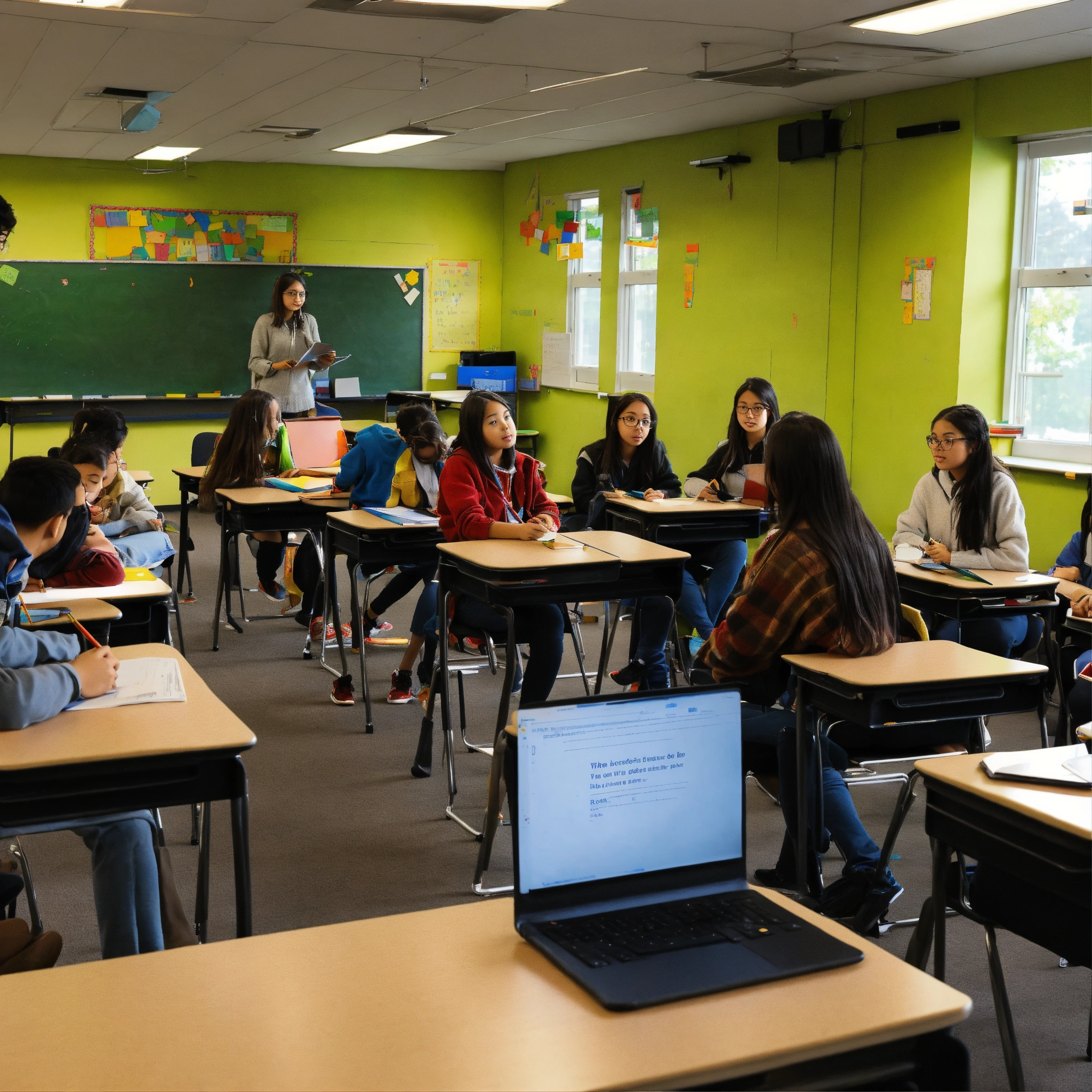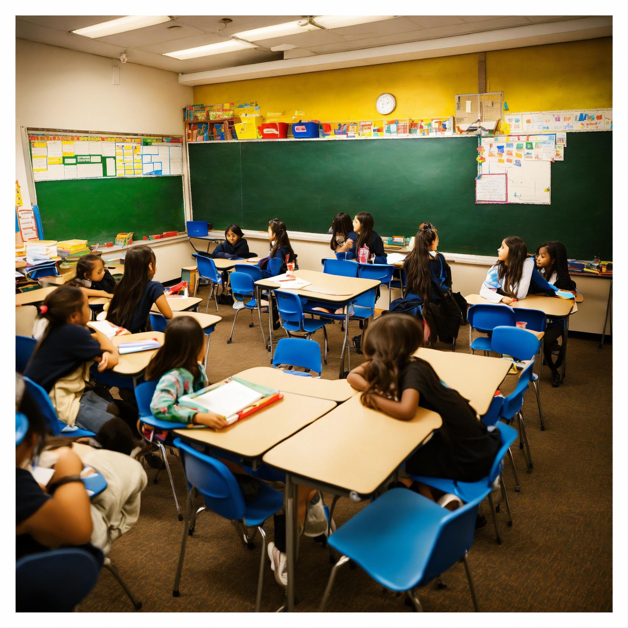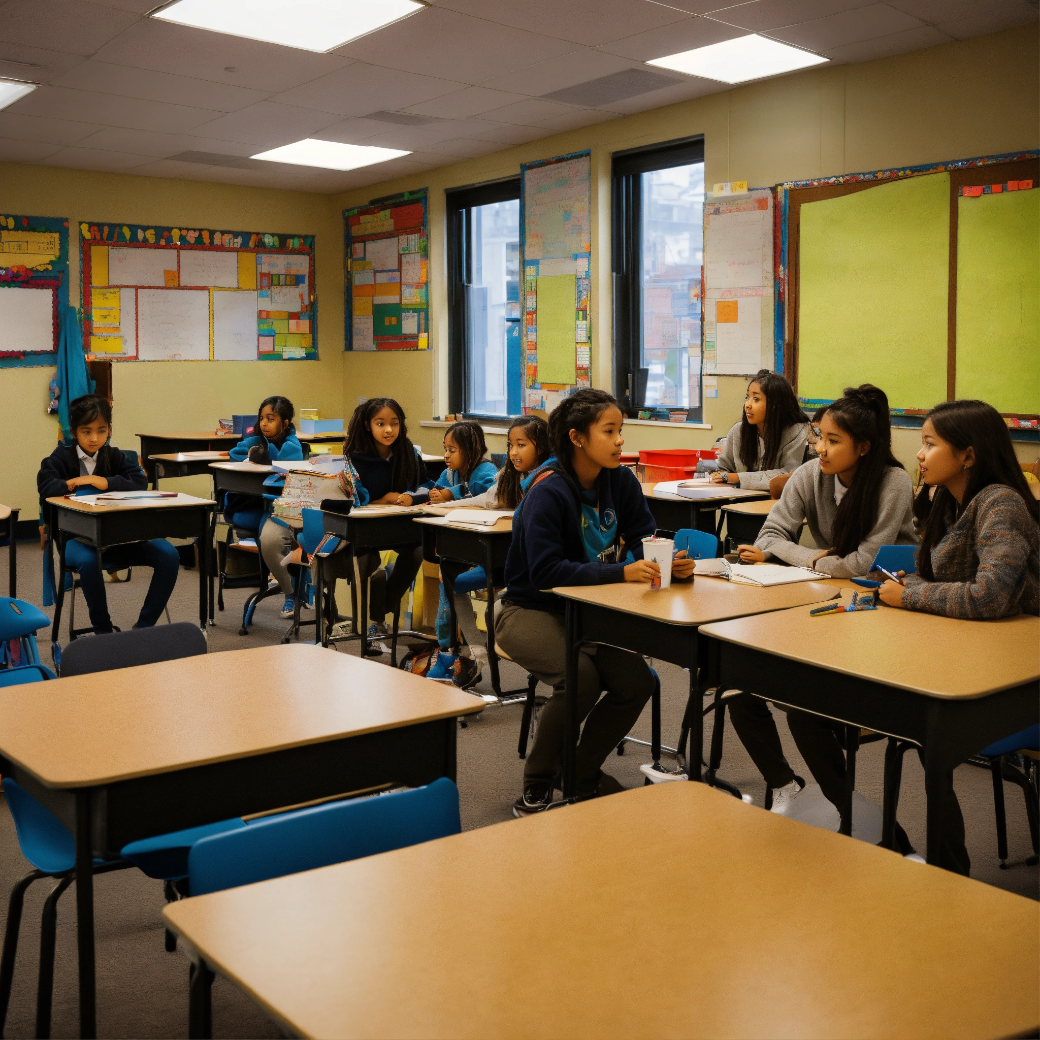 A photo of a classroom with students sitting at their desks, the students are engaged in a discussion with their teacher