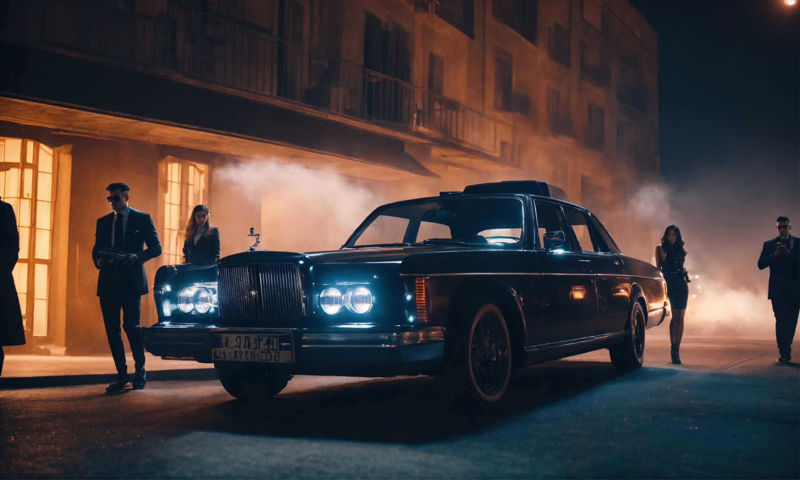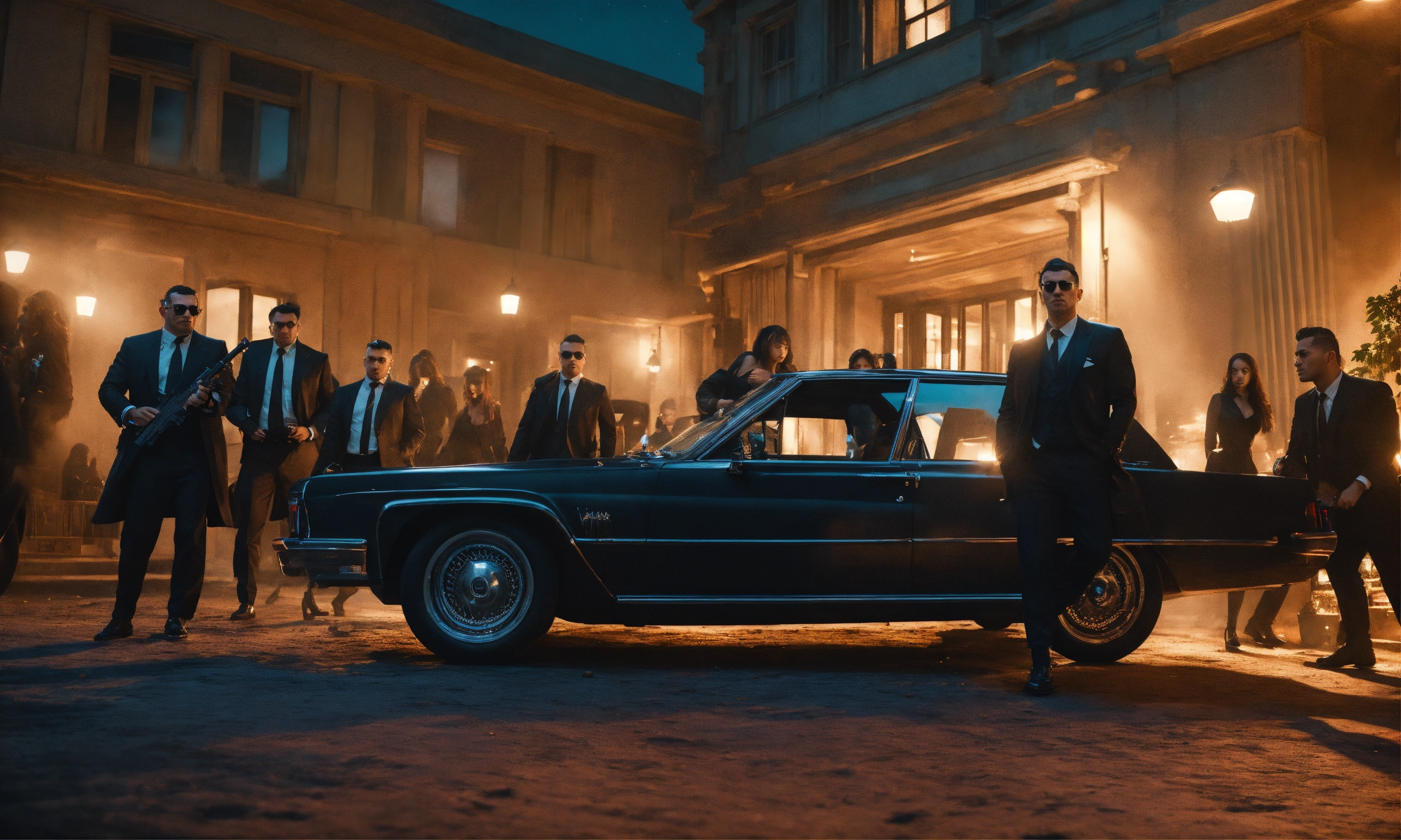 Group of mafia male with riffles surrounded by girls, interior set design night time, black car with machine gun coming out from sunroof, mood lighting, wide front shot, 8k, luxcorerender, earthly colour, cinematic photography, real humans, real images, matte finish, shot on arri anamorphic, extreme wide shot, smooth, sharp focus, ornate, highly dynamic, particulate, hyperreal, wide shot