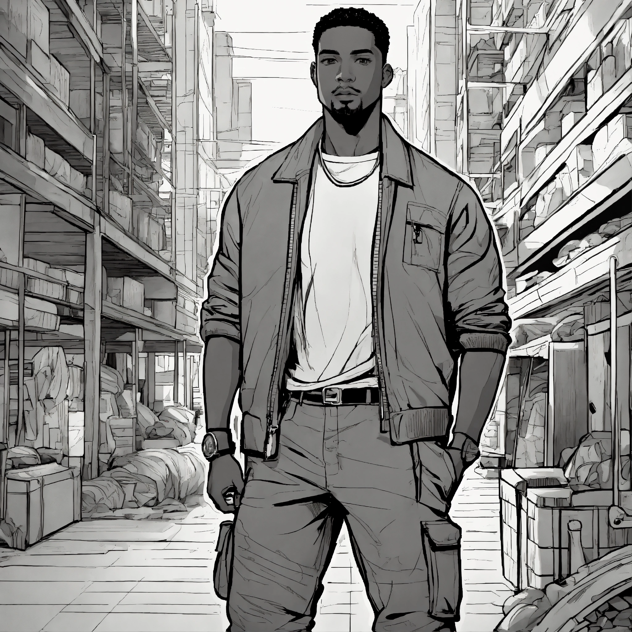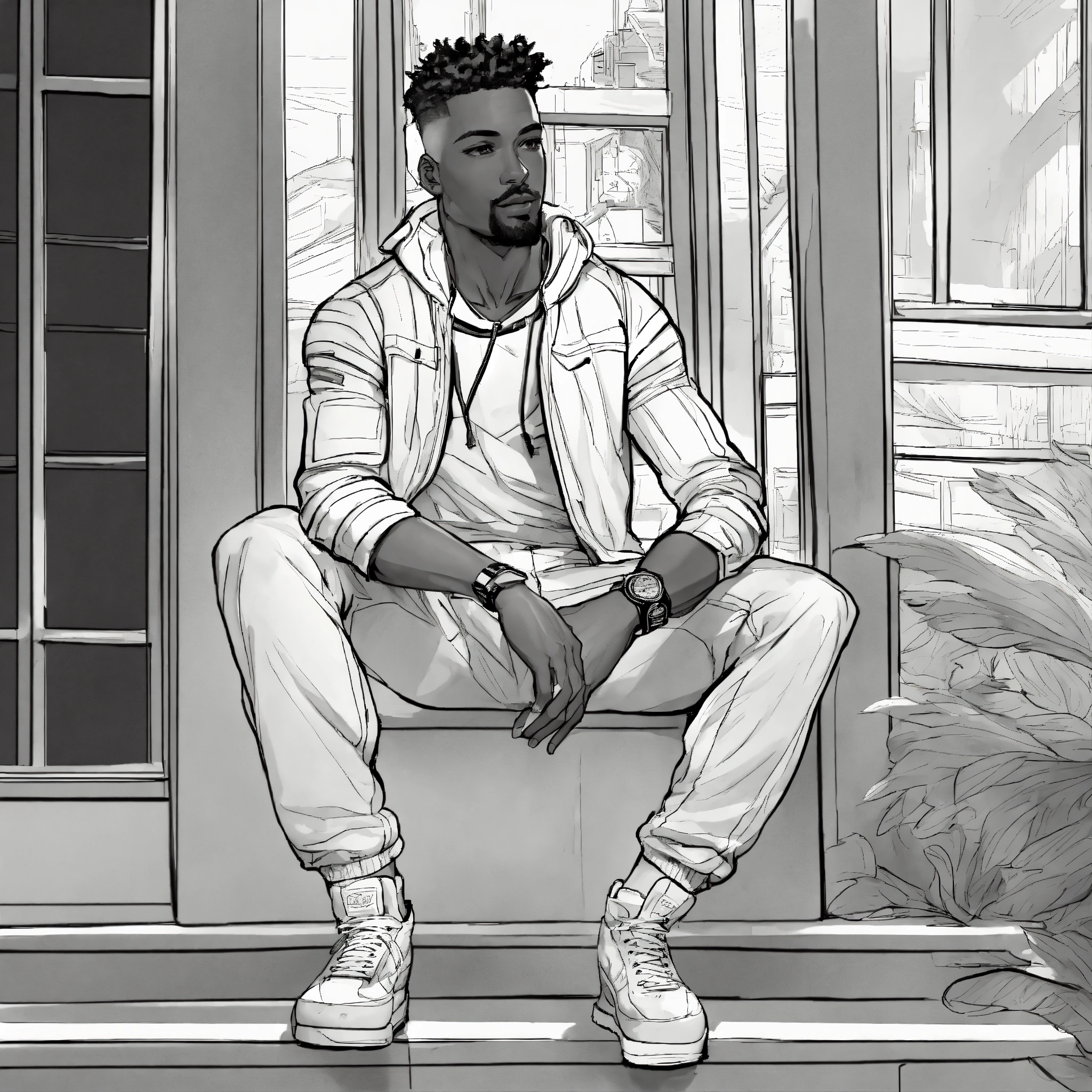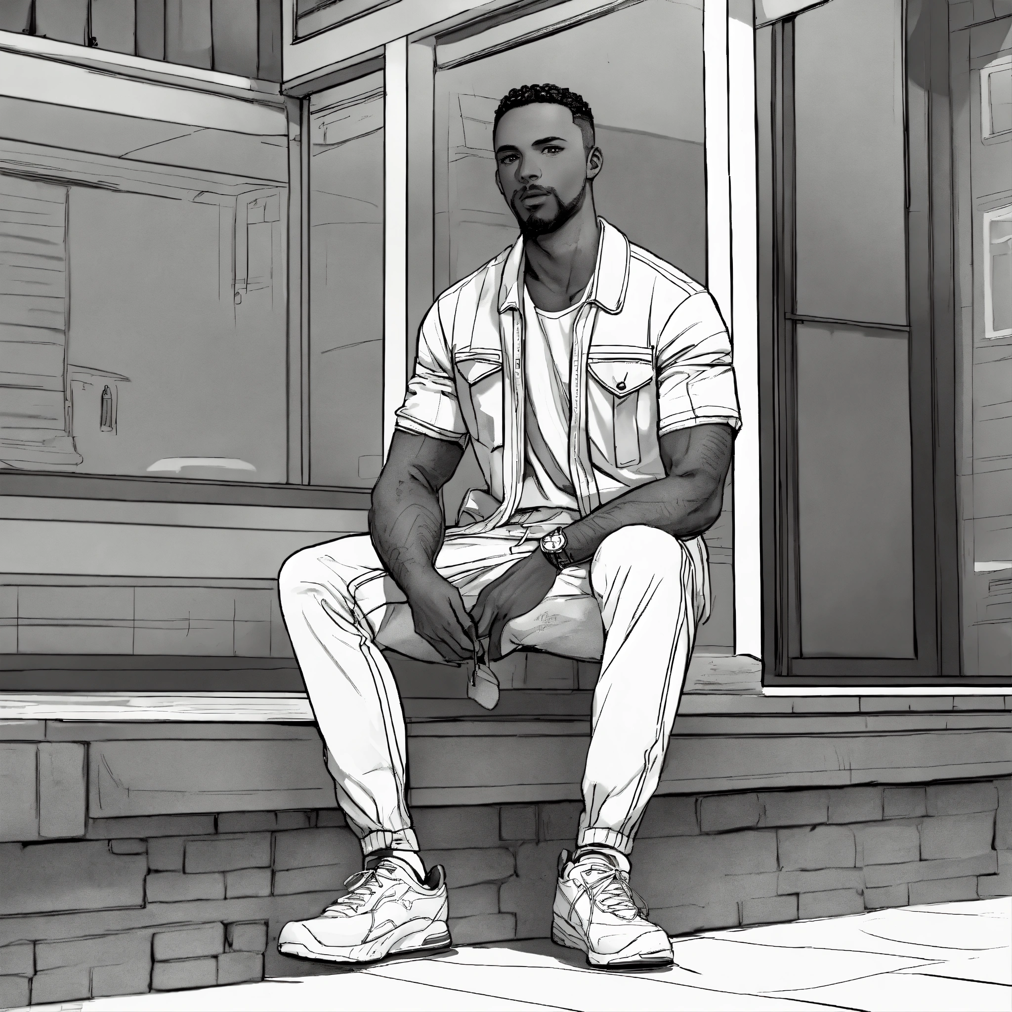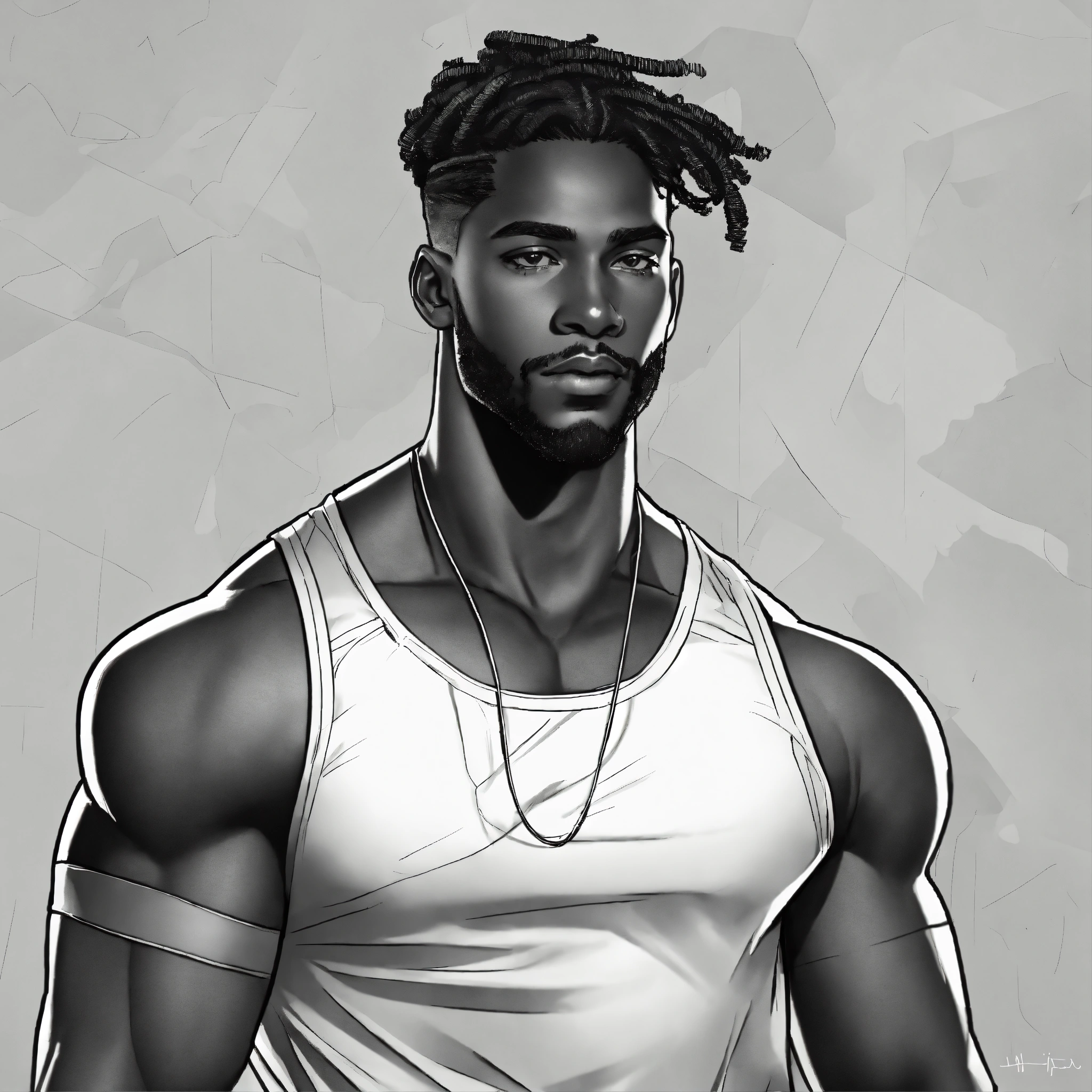Dark dark complexion fully clothed athletic man, realistic healthy glossy well defined loc’d hair texture, full body shot, rule of thirds centered subject placement, storybook, dreamlike, cartoon, illustration, intricate detail line drawing, cargo pant, black and white line art, coloring book, dynamic white