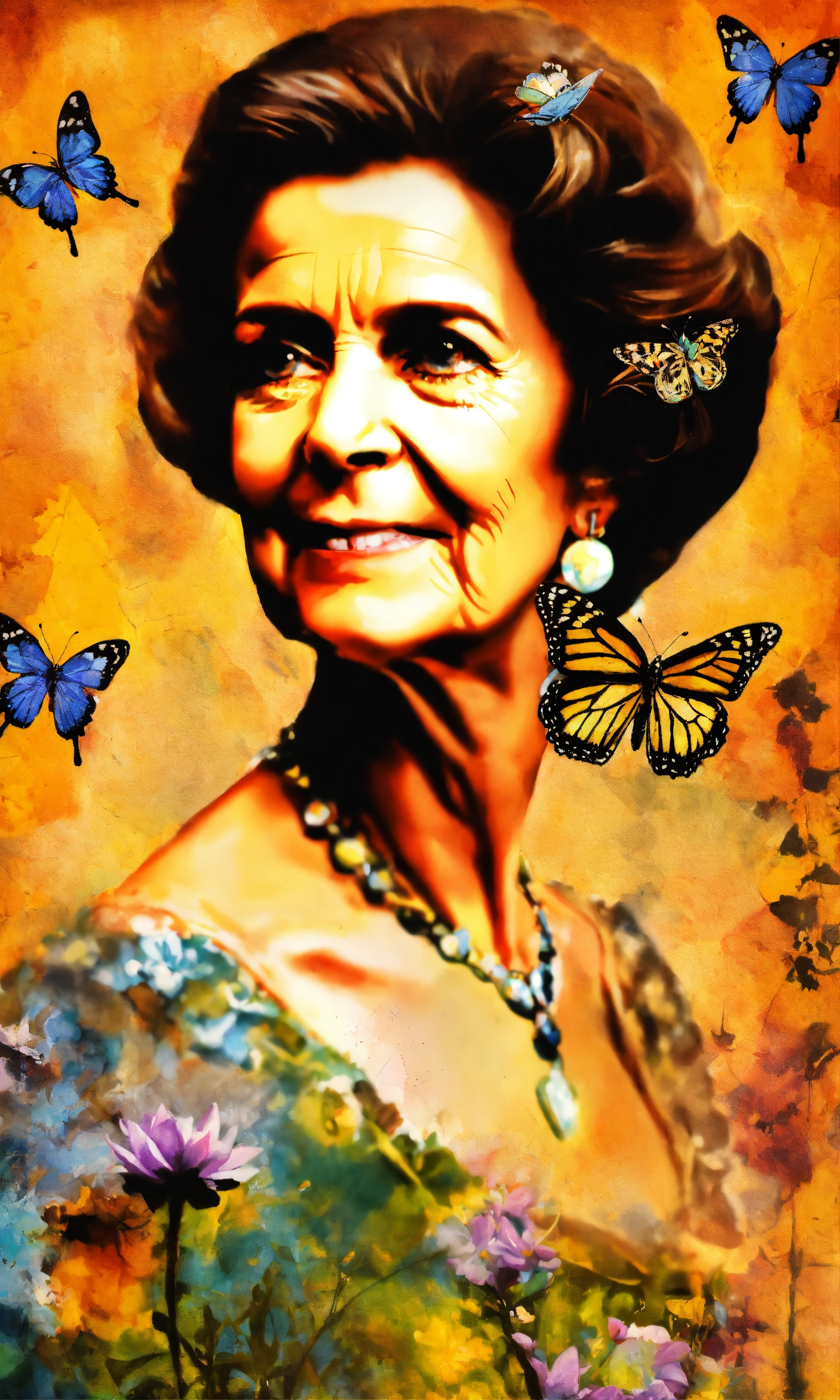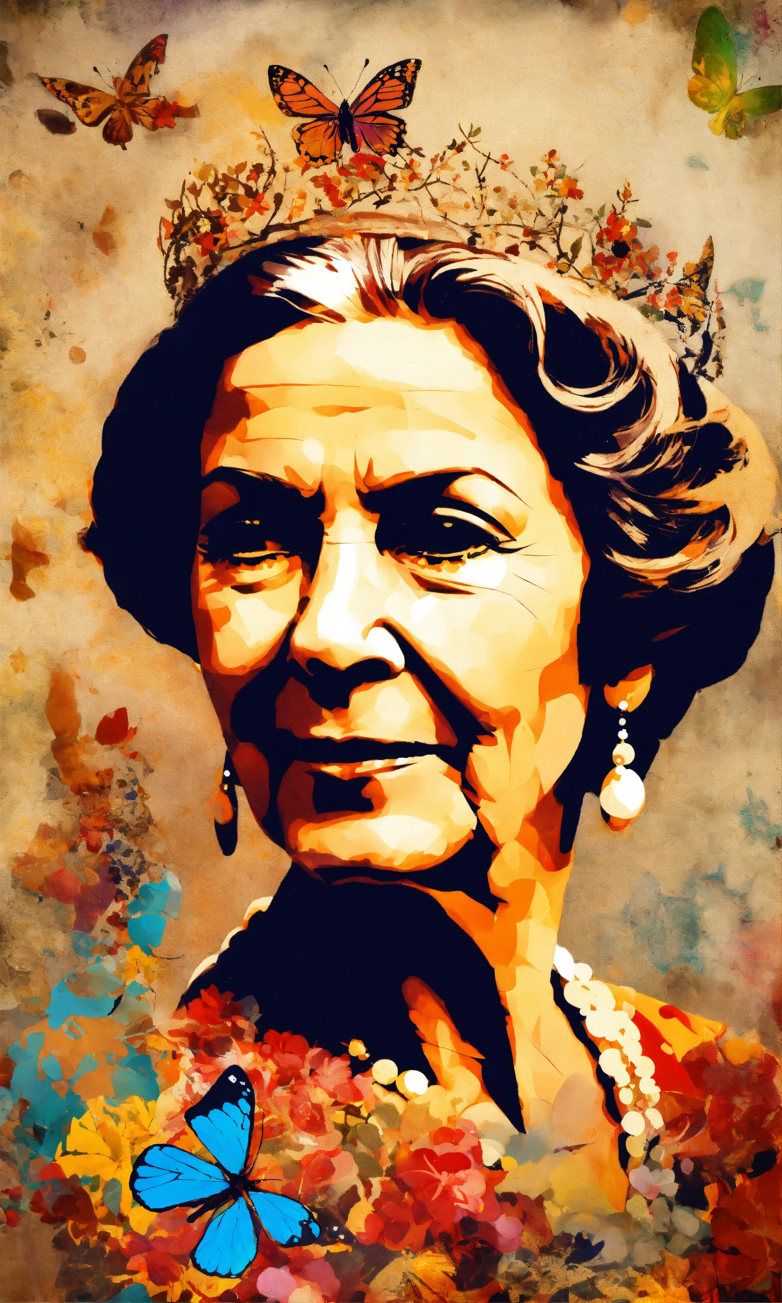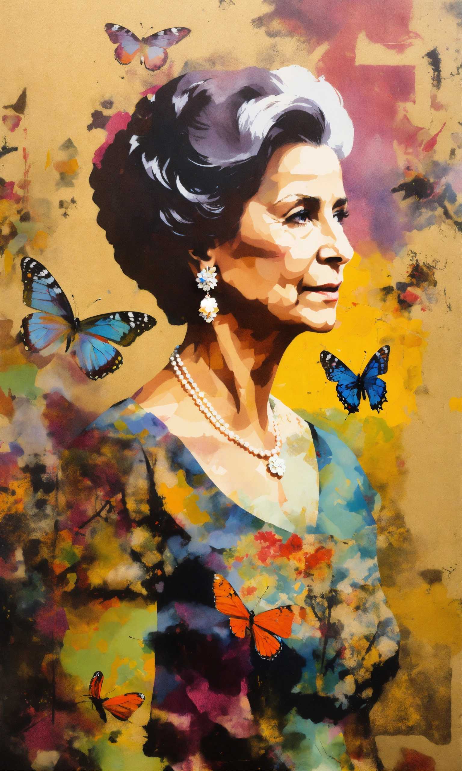 Queen sofia of spain, older, with a butterfly fluttering around her, collage style, stencil graffiti.