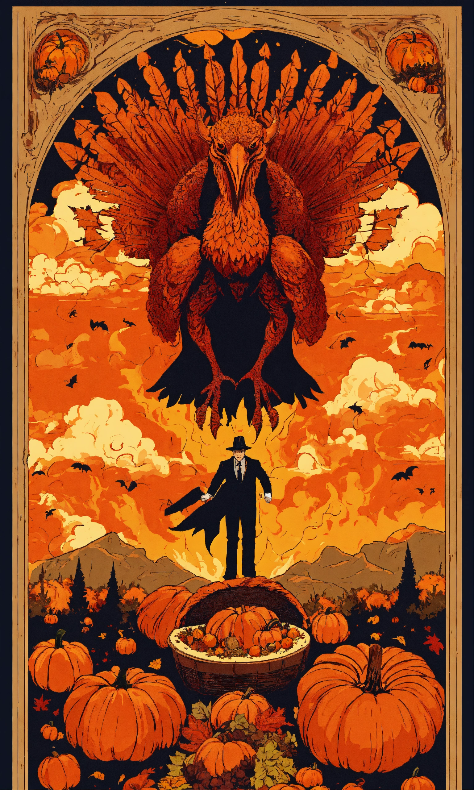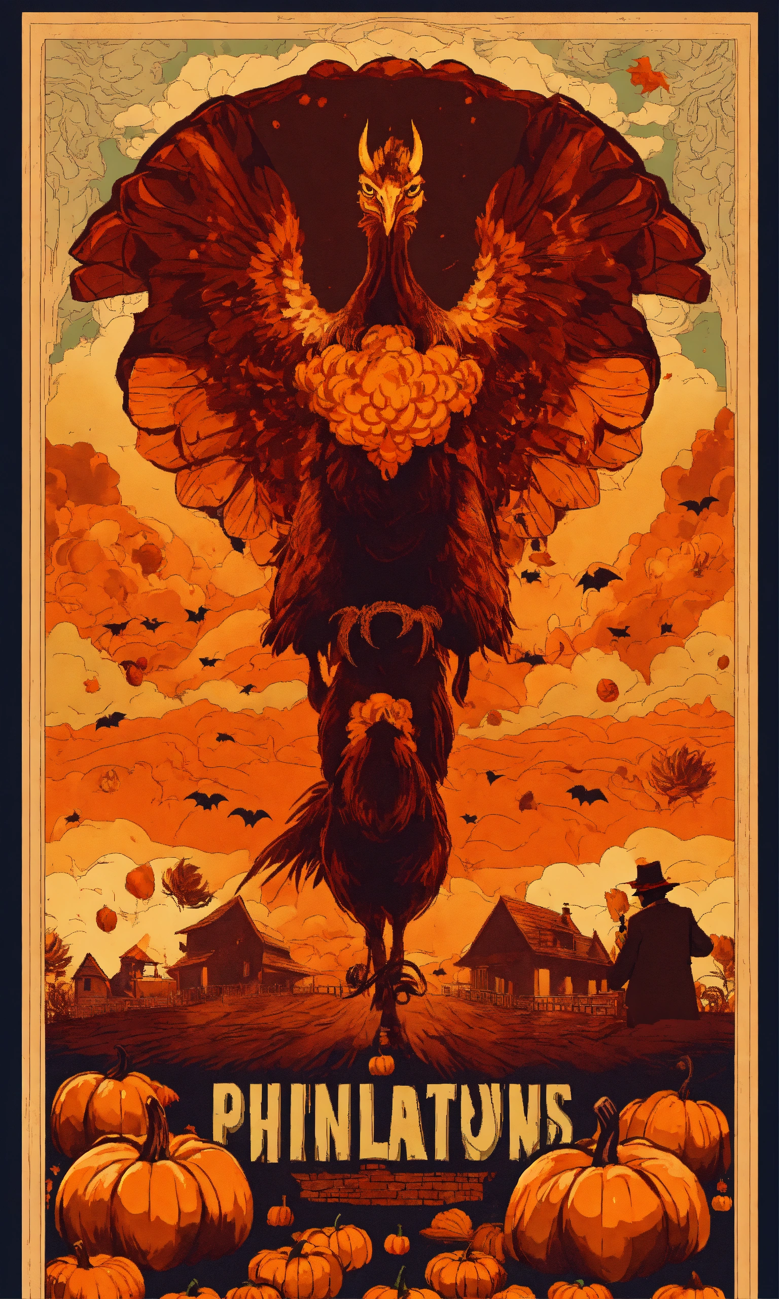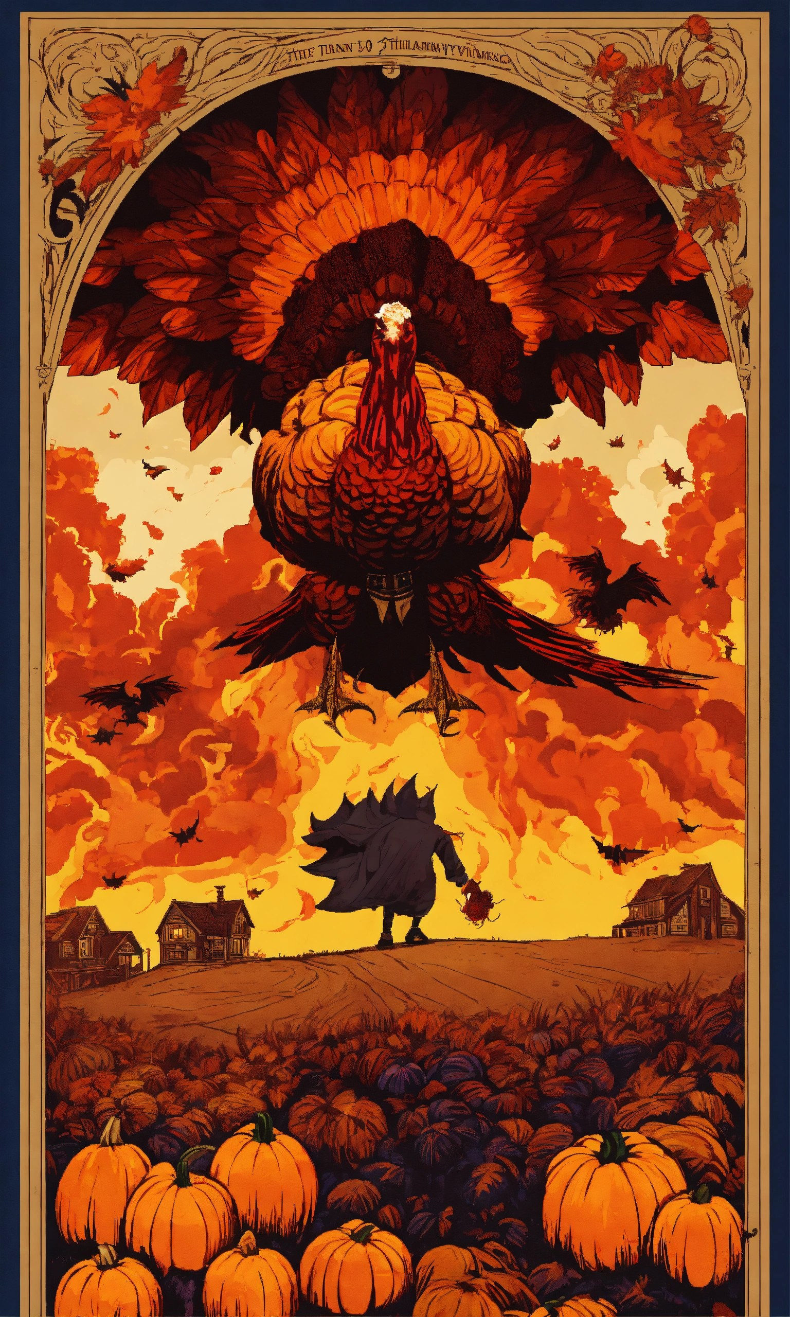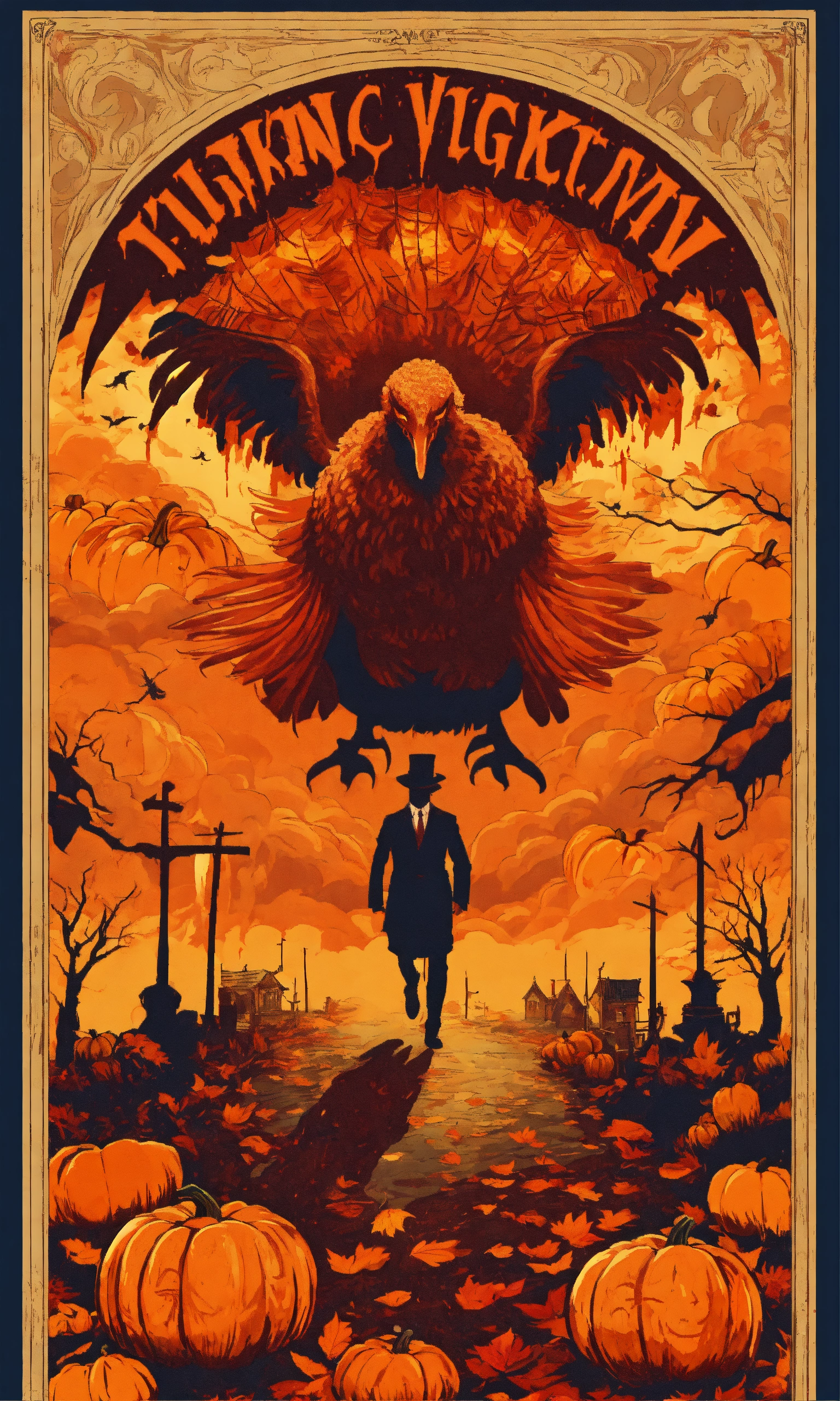 70s 80s movie poster, lovecraft killer turkey demon, thanksgiving, demon pilgrim, pumpkins, explosions, vector art, white boy