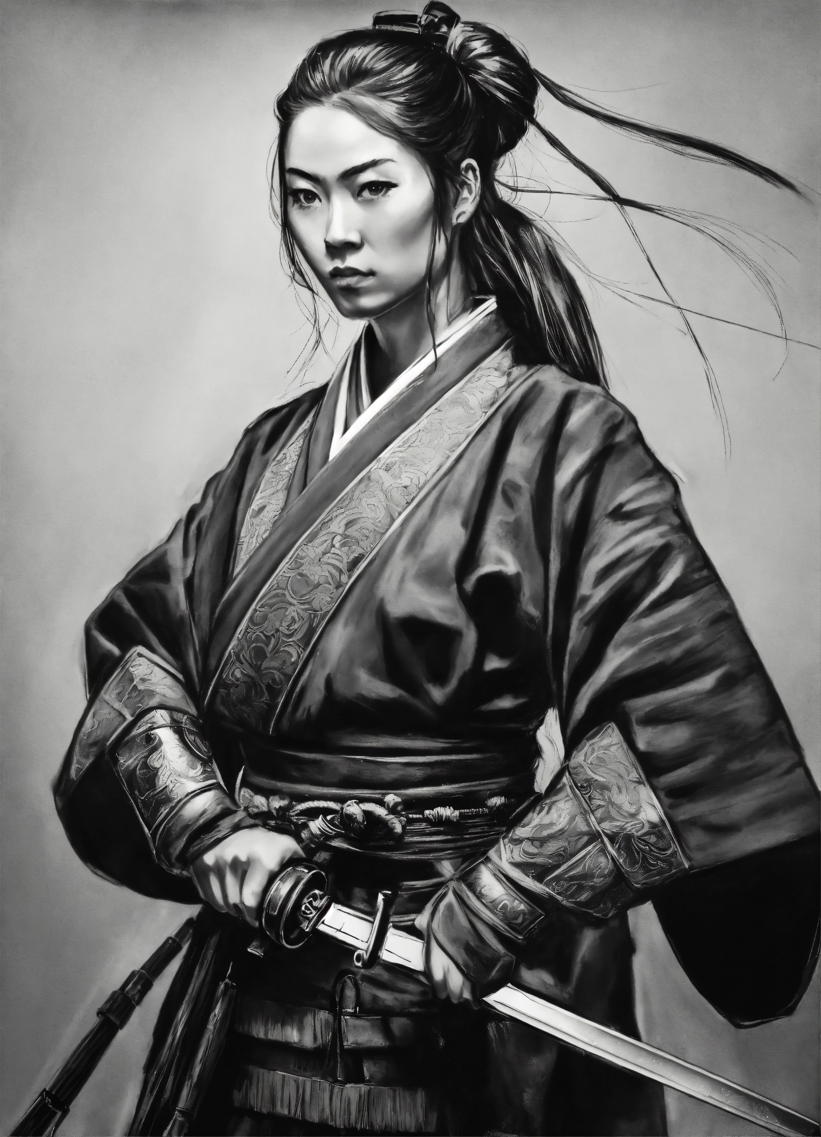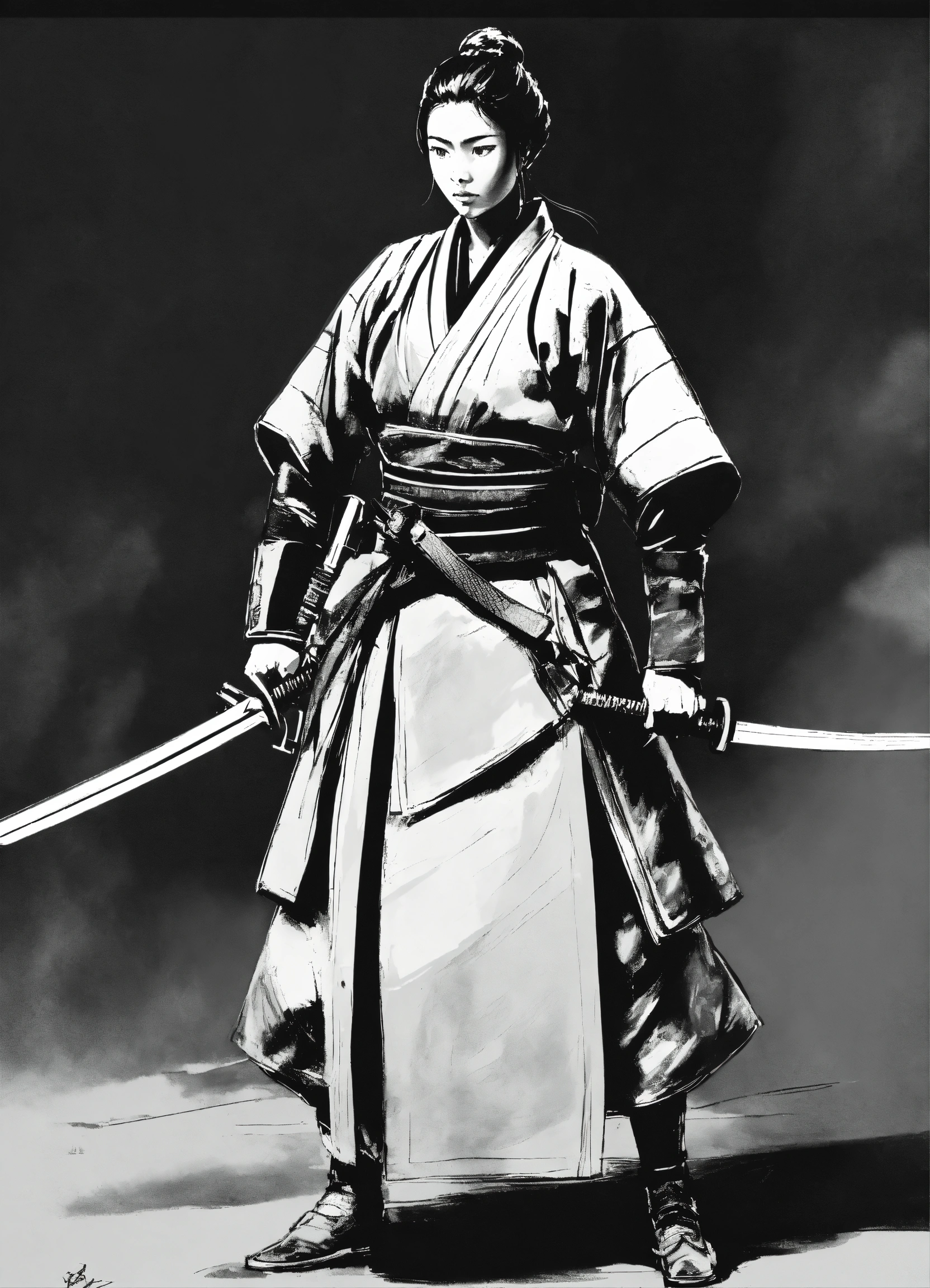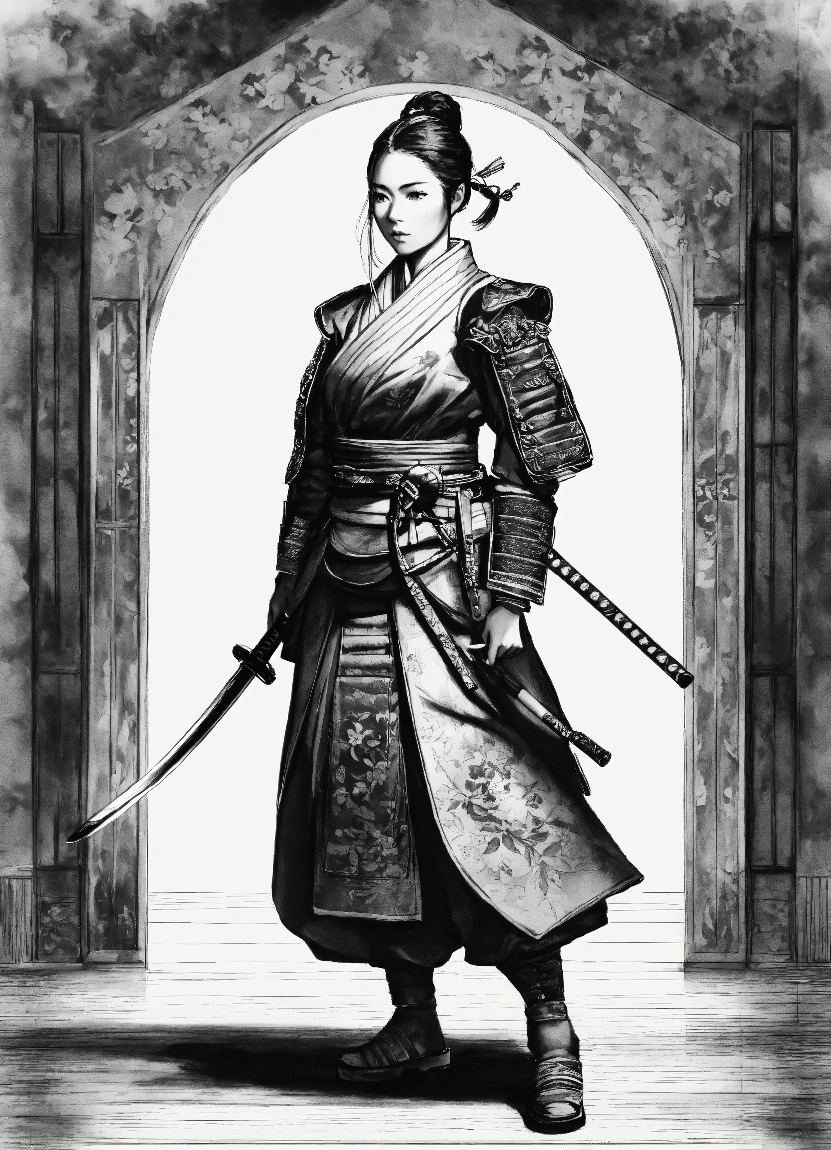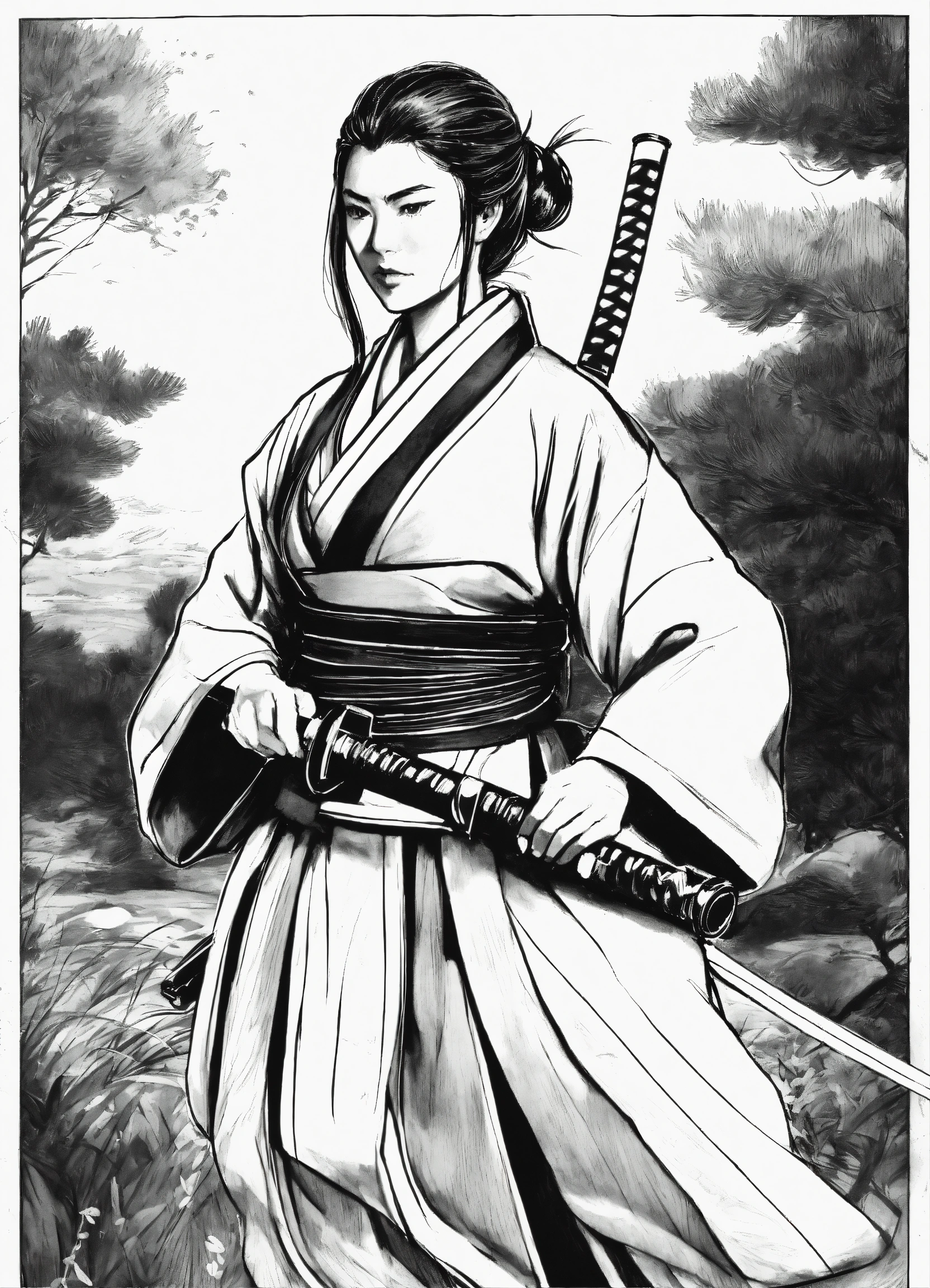 Eurasian samurai woman with saber in attache position in black and white drawing