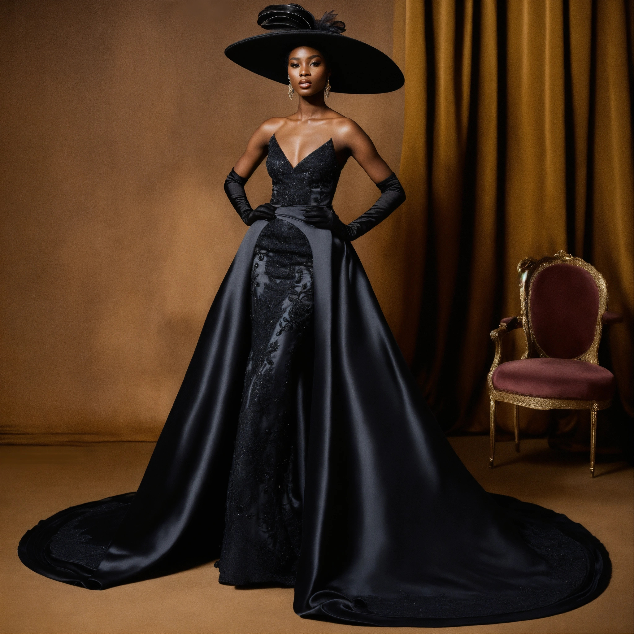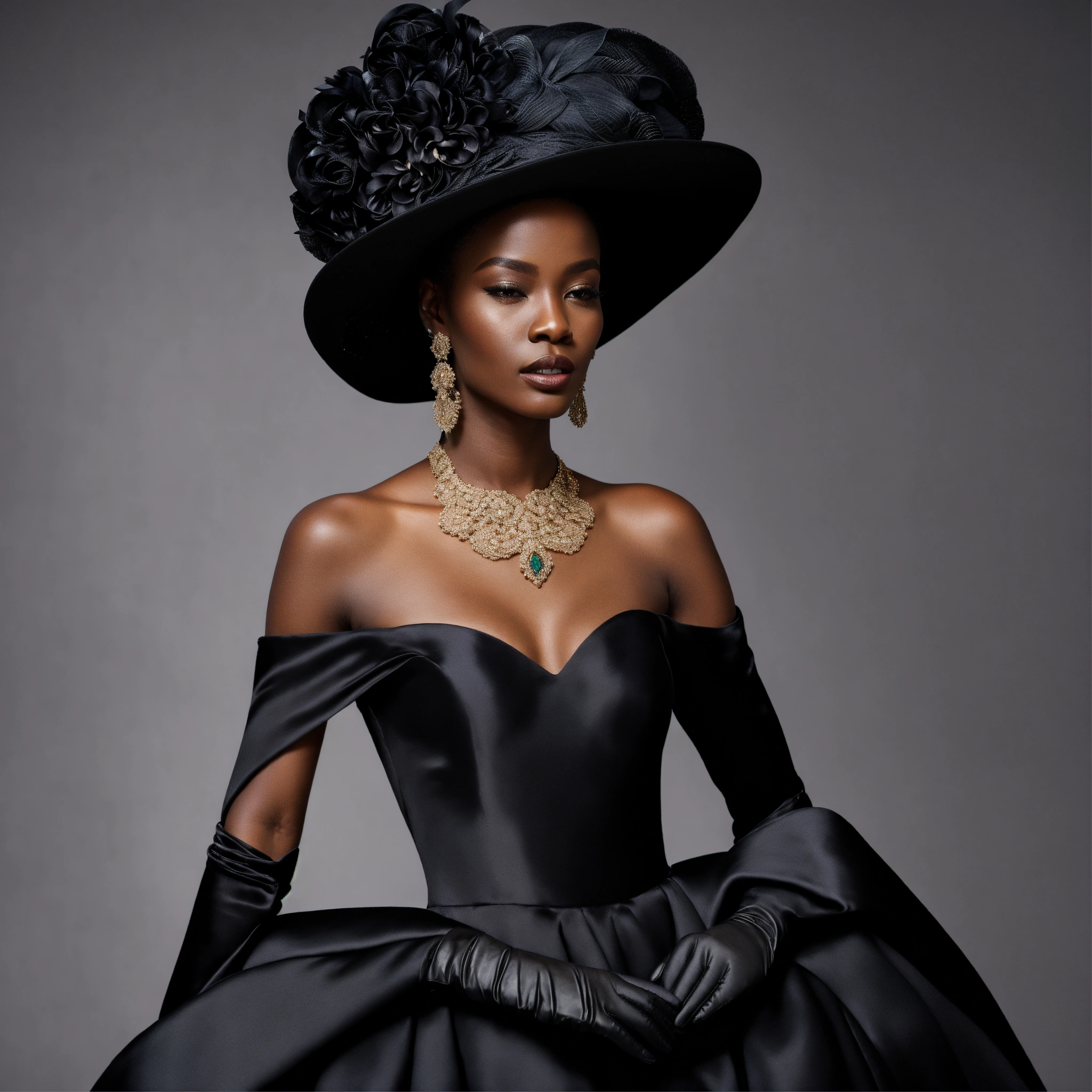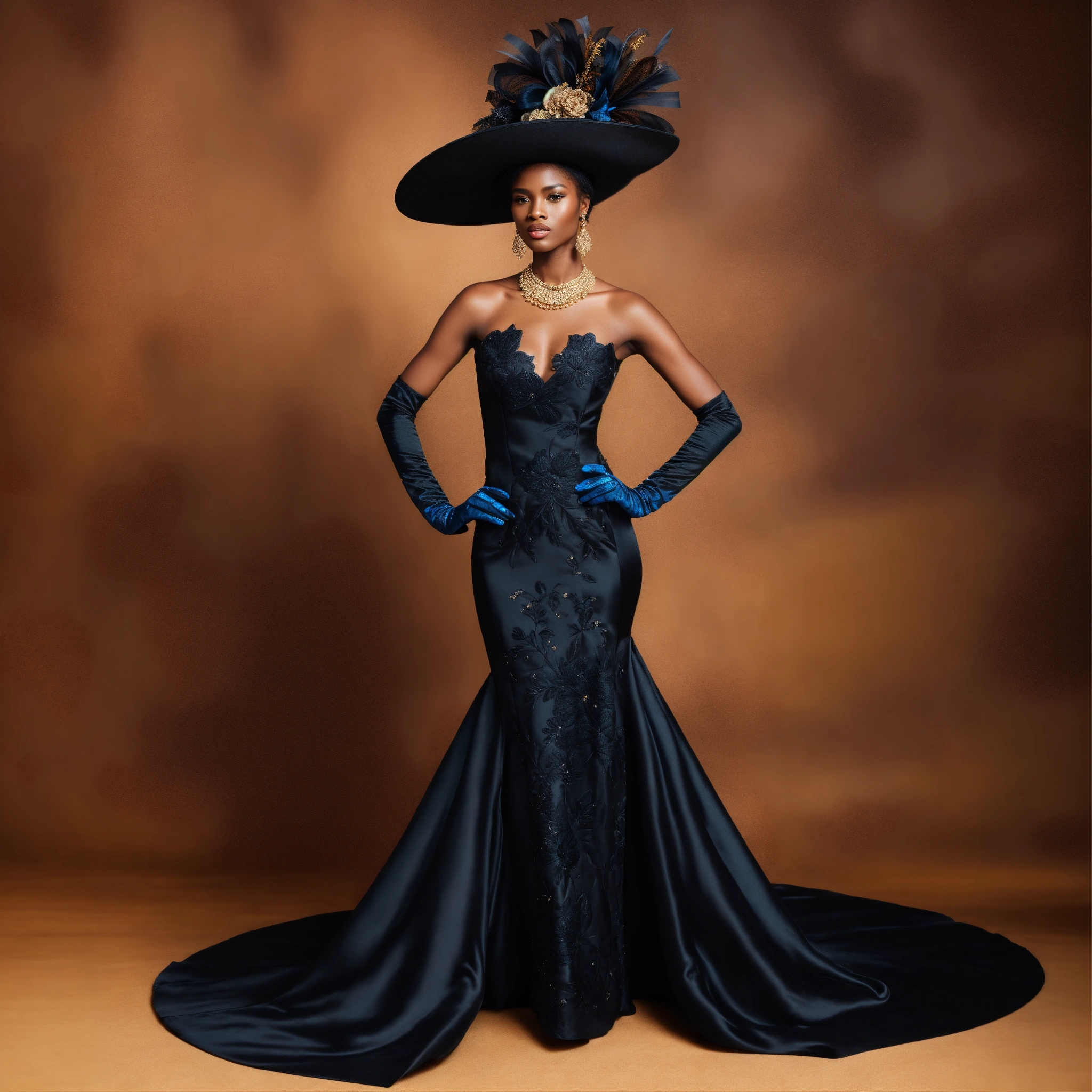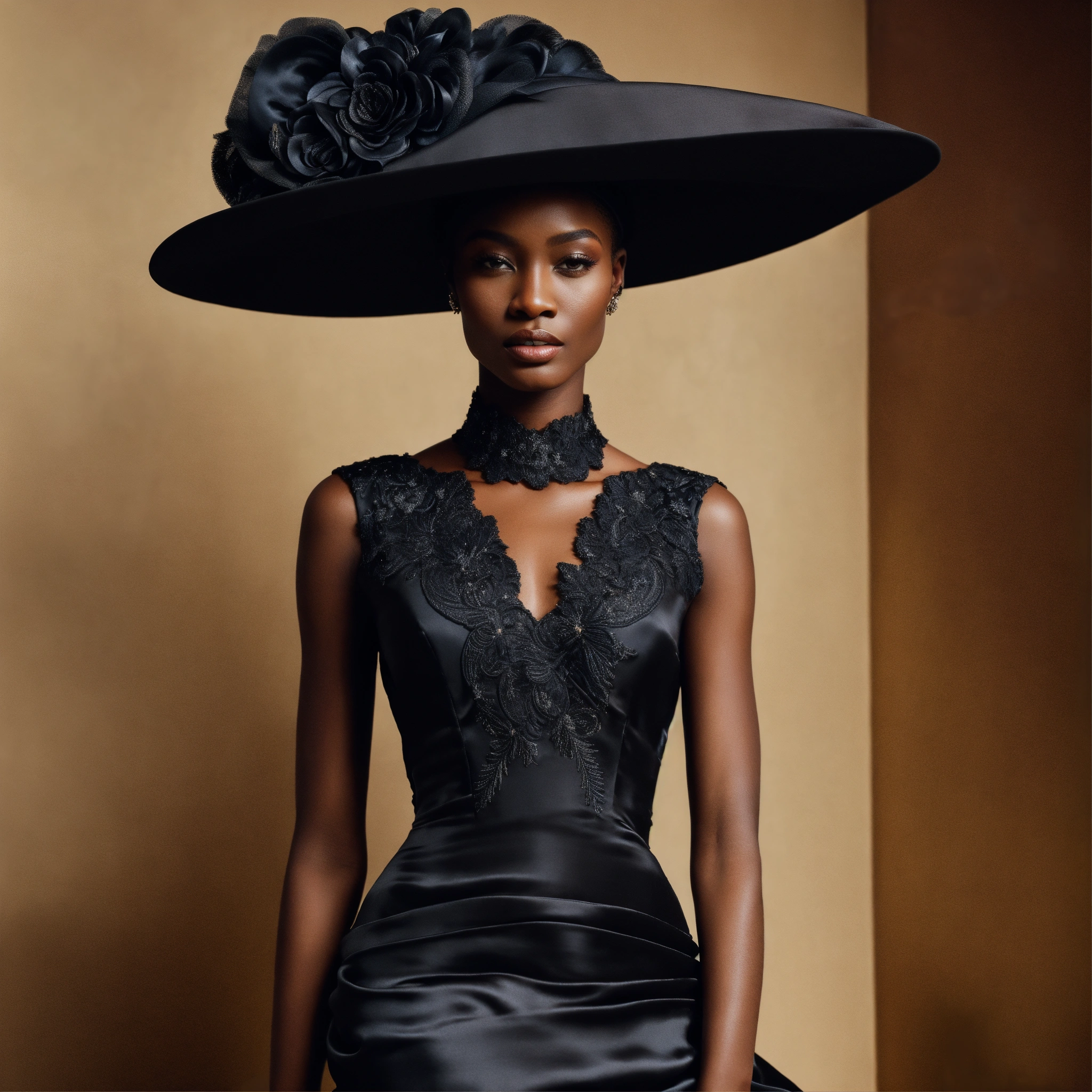 A chic african american fashion model wearing a modest luxurious black silk embroidered gown, wearing a fascinator black hat with no brim, long gloves, covered shoulders. and jewelry, photo realistic, full length