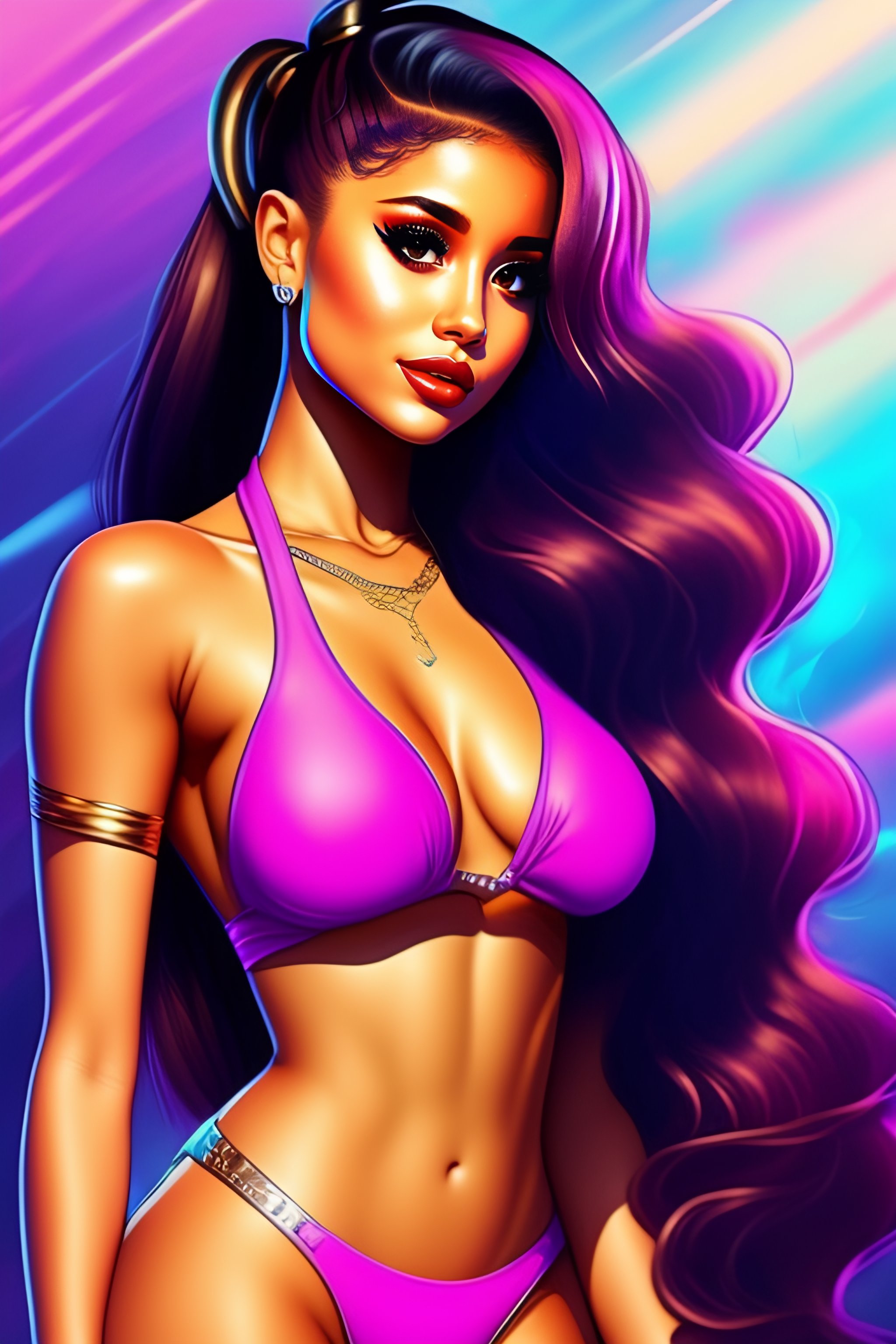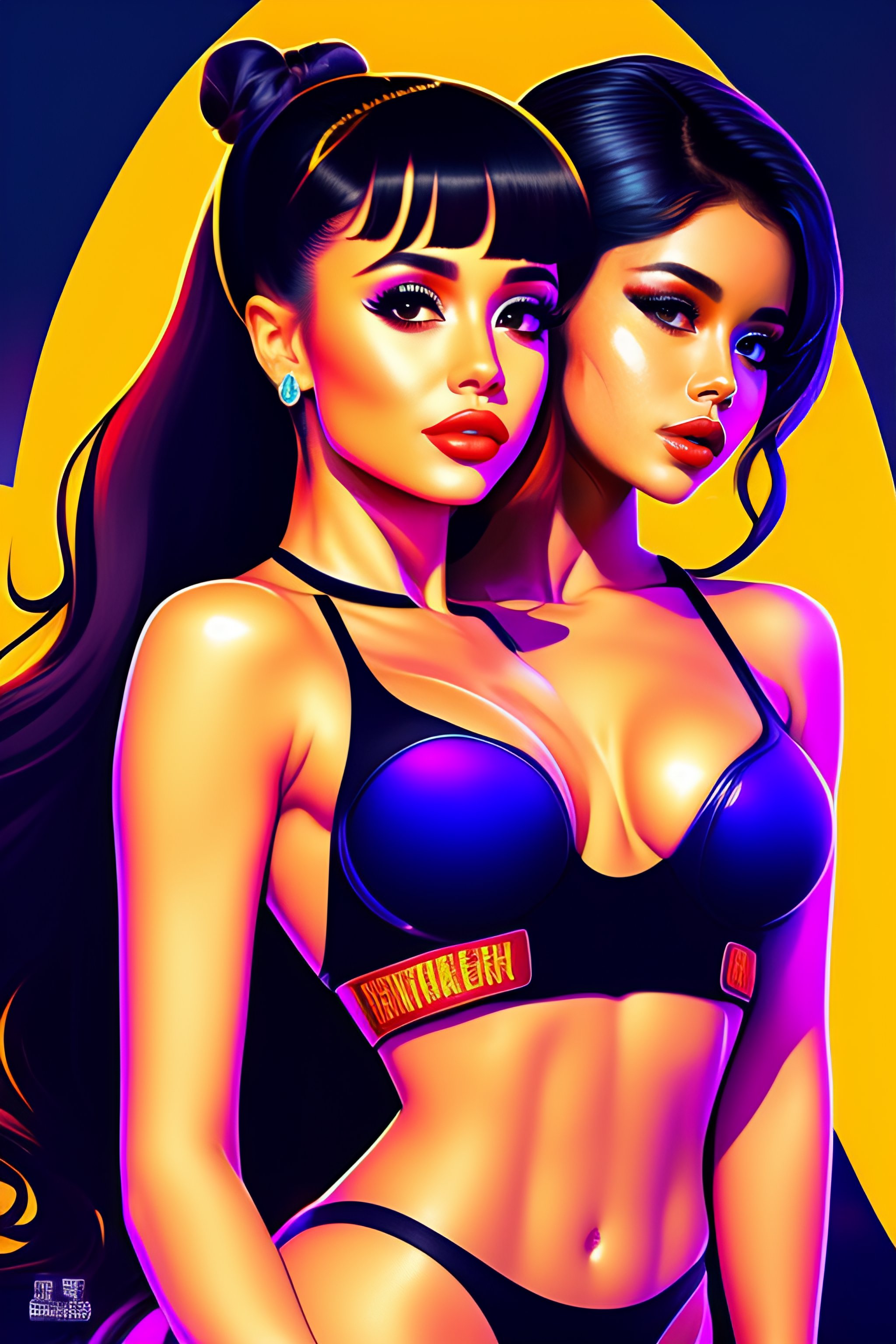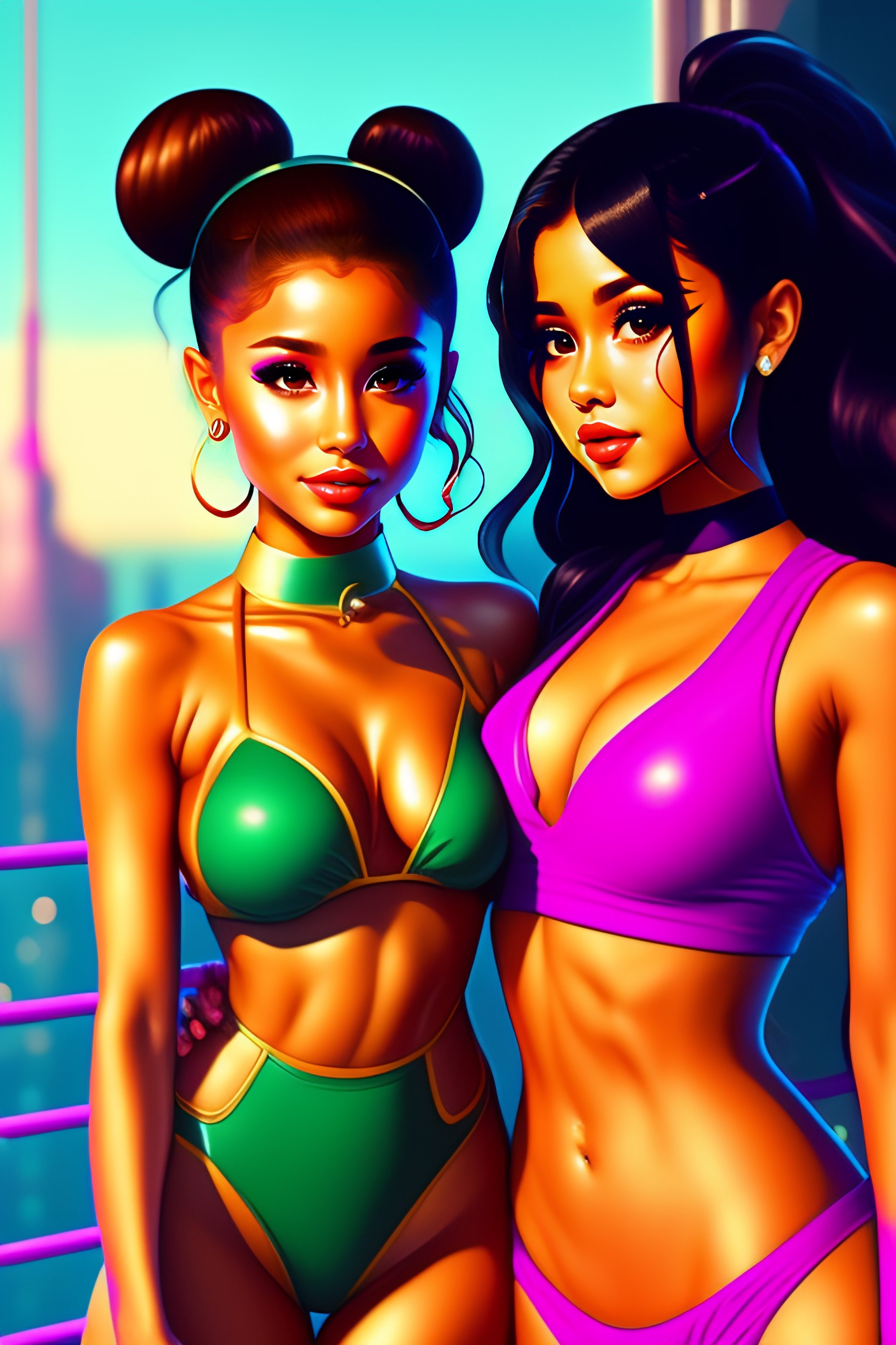 Photo of ariana grande and selena gomez girls full body with a cute expression in a micro piece of bikini, touch together in a dark room, hyper detailed painting, laurie greasley style, studio ghibli, akira toriyama, 4k, vibrant colors, trending on deviantart, trends in artstation, low details