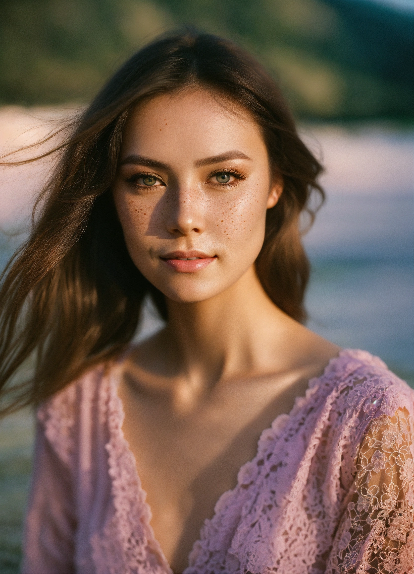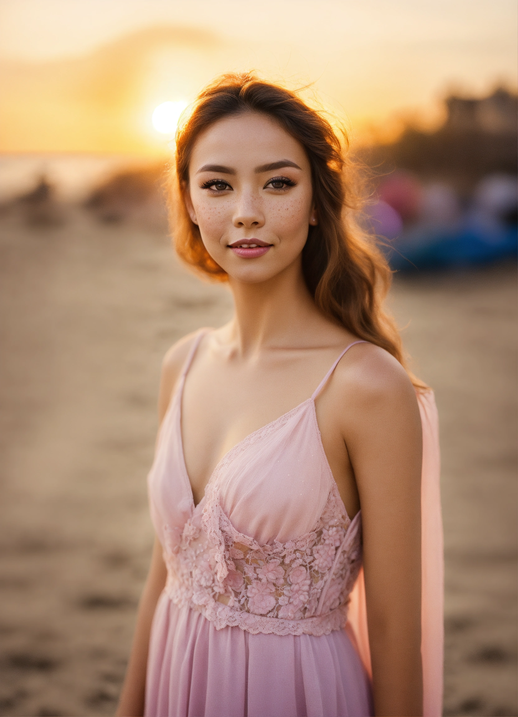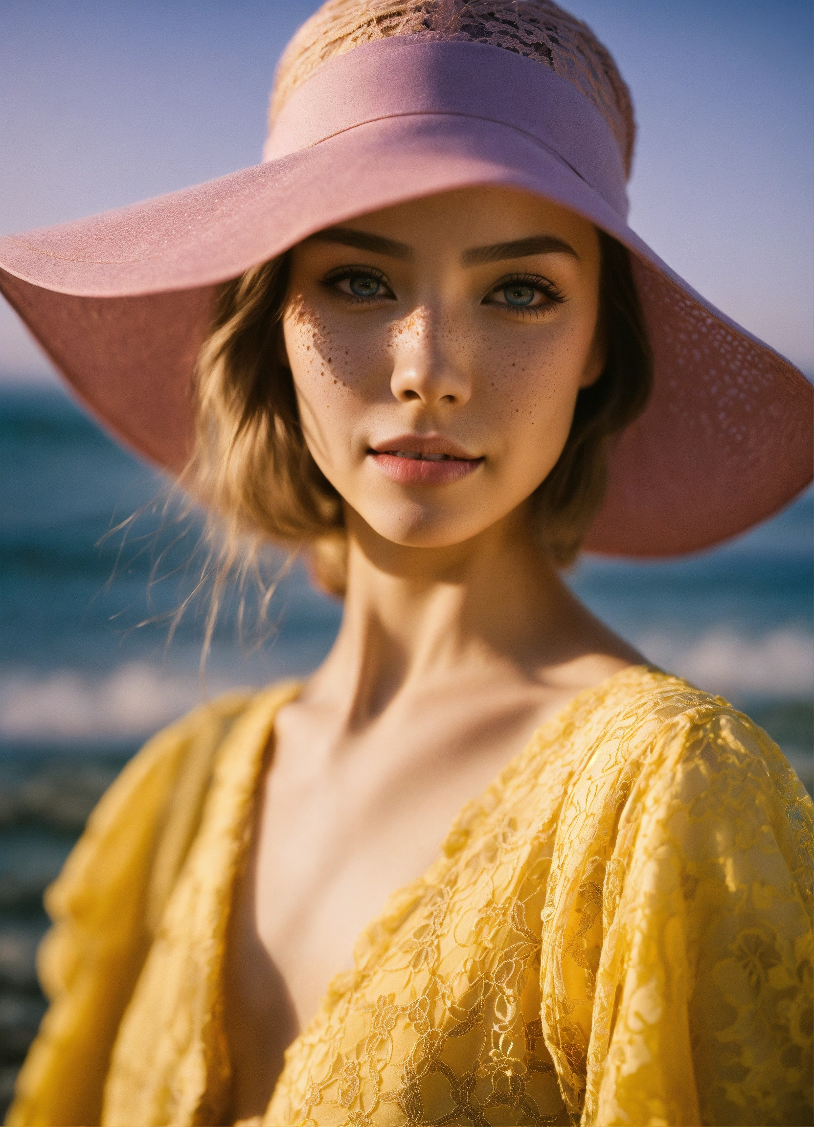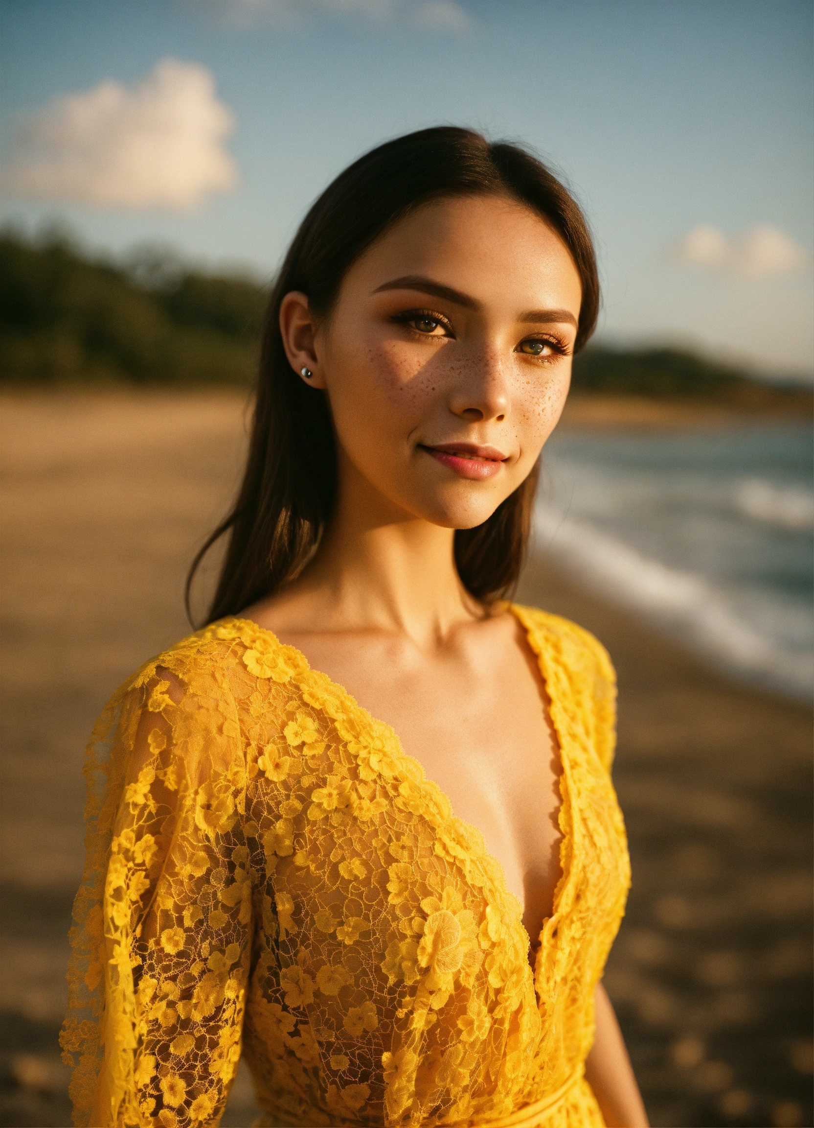 Young ksenia-kahnovich 35mm leica photograph (russian-face0.8)(german-face0.6) (asian-eyes0.5) long thin elegant face, detailed face, skin pores, cute-freckles, (prominent-cheekbones0.8), (enormous eyes0.9), (yellow-amber eyes1.0) small bump in long thin nose, (low-hairline0.9), long wavy brunette, long thin face, elegant neck, elegant chin, feminine, swollen lips, large eyes, cute ears, plunging yellow lace dress, golden hour at the beach, subsurface scattering, god rays, pink and purple sky, perfect lips, well-proportioned, big smile, kodak portra, instagram, photography