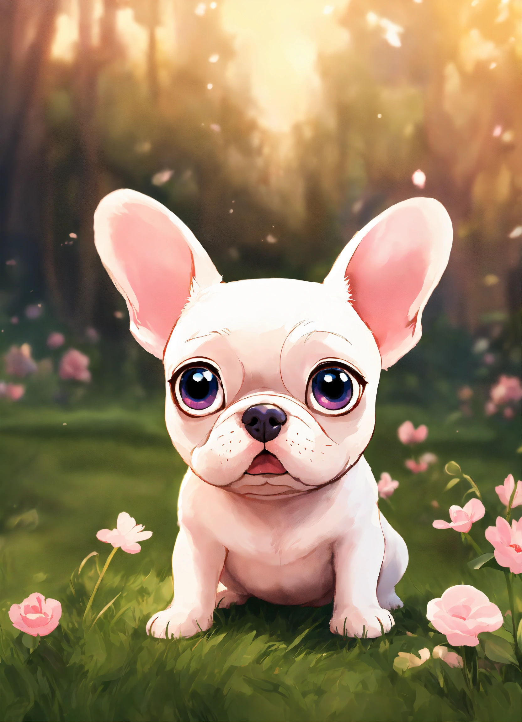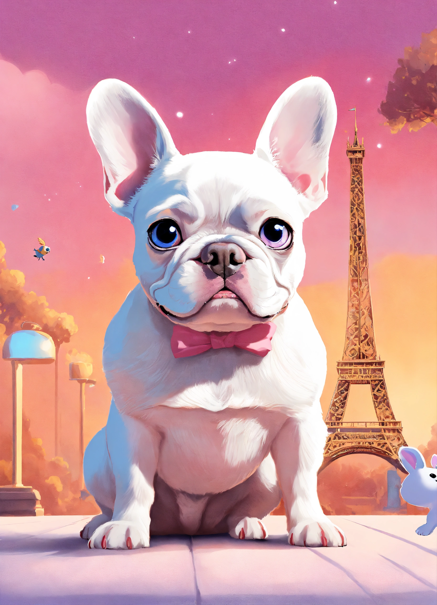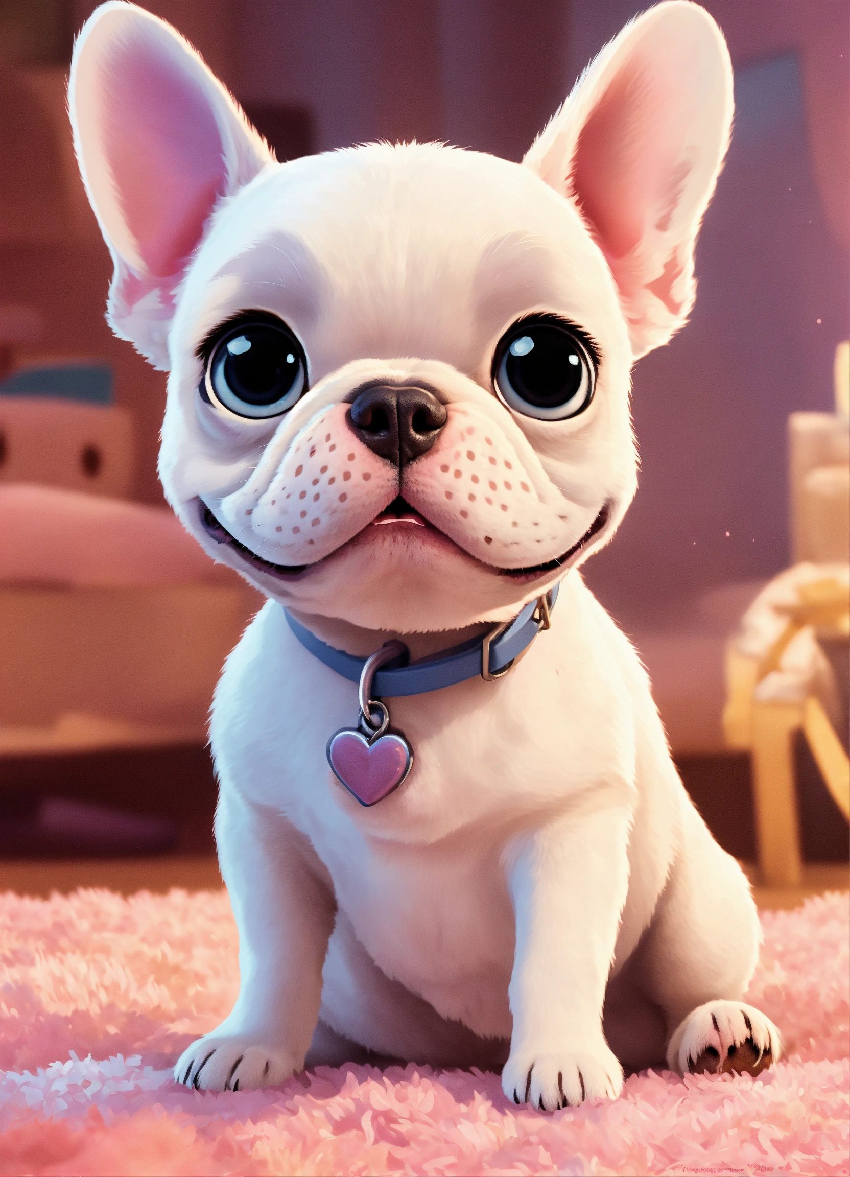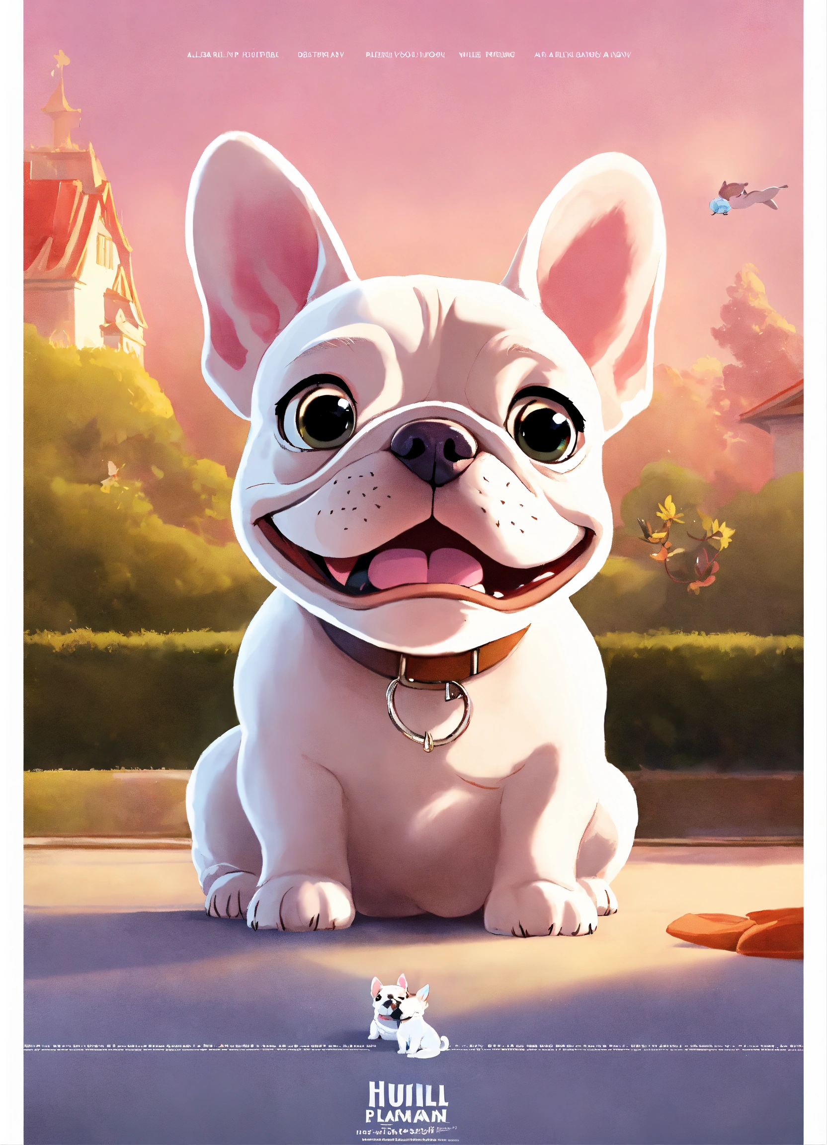 A disney pixar inspired movie poster. a white french bulldog, loving a white french bulldog puppy, white with big eyes, and happy. the scene should be in pixar's digital art style, emphasizing the characters expressions, white background with hues of pale pink, detailed characteristics of their animations.