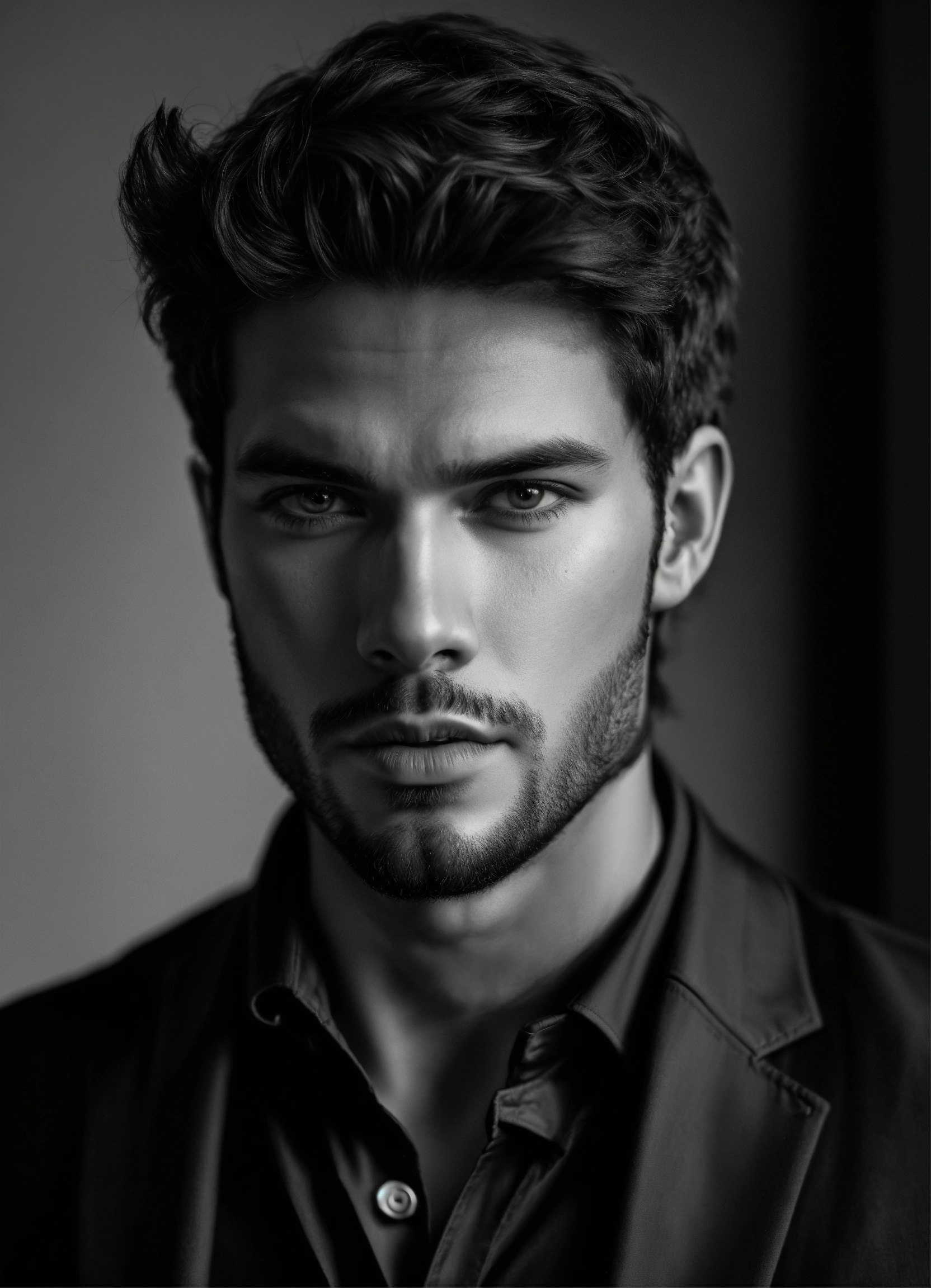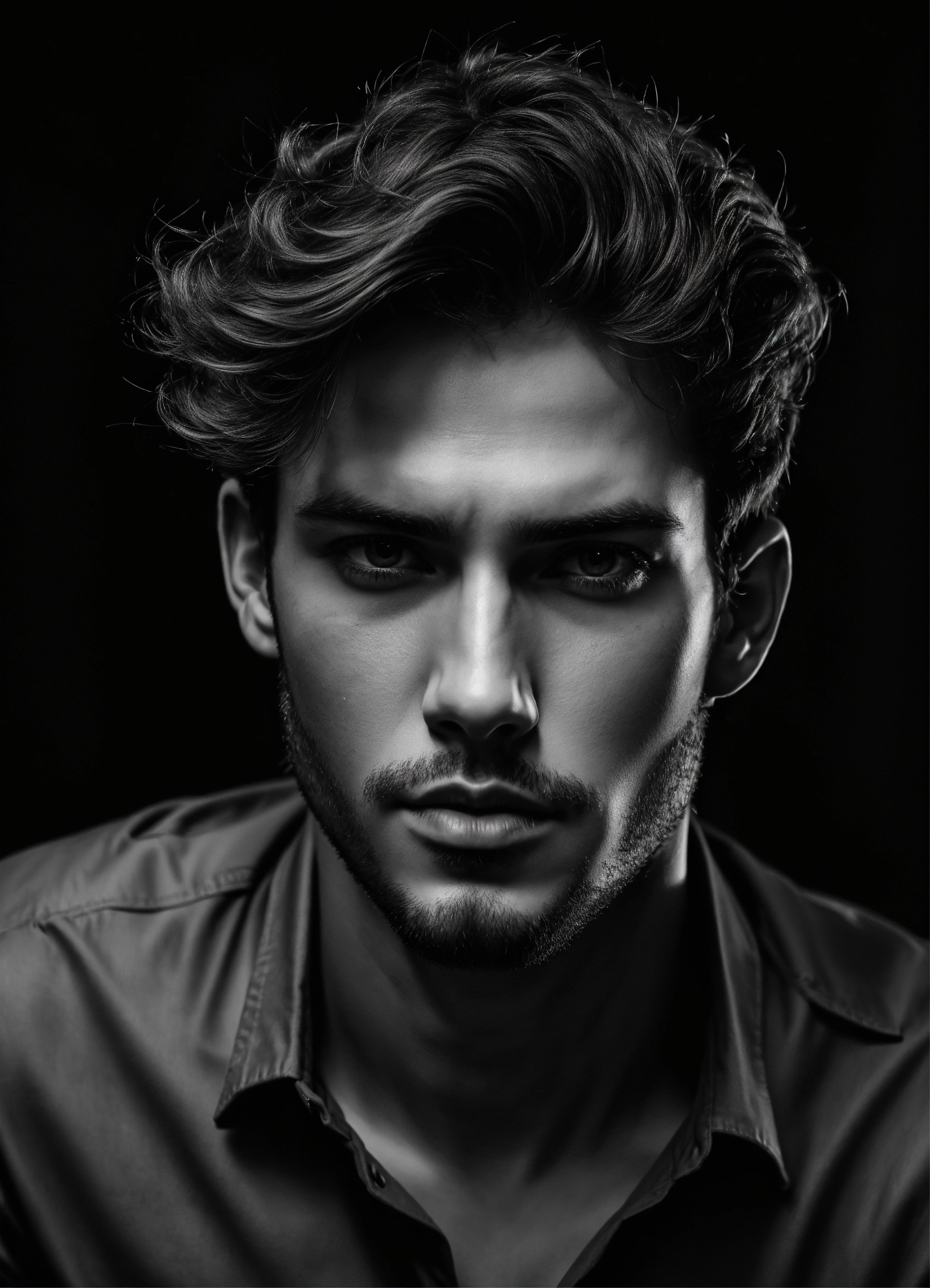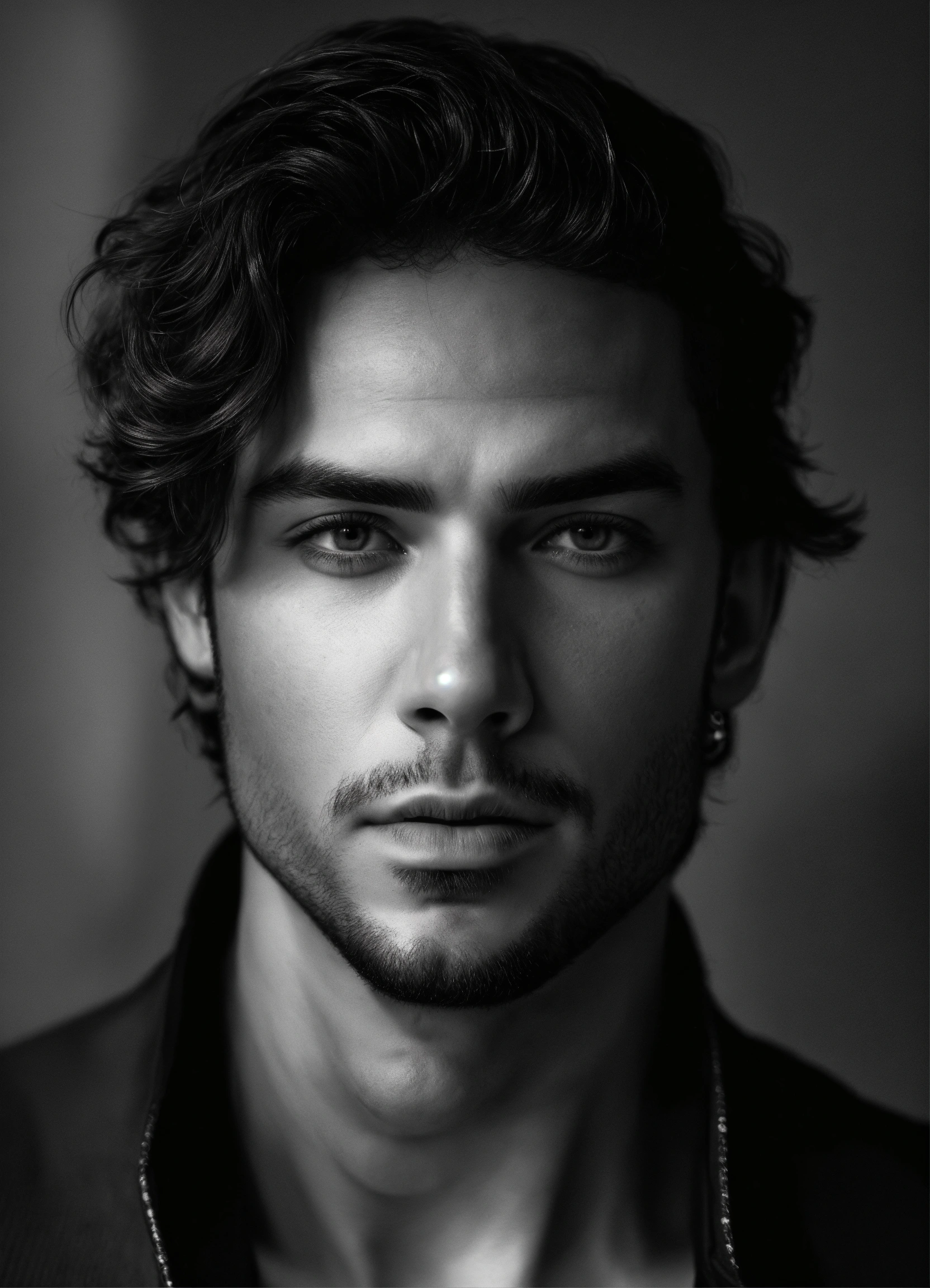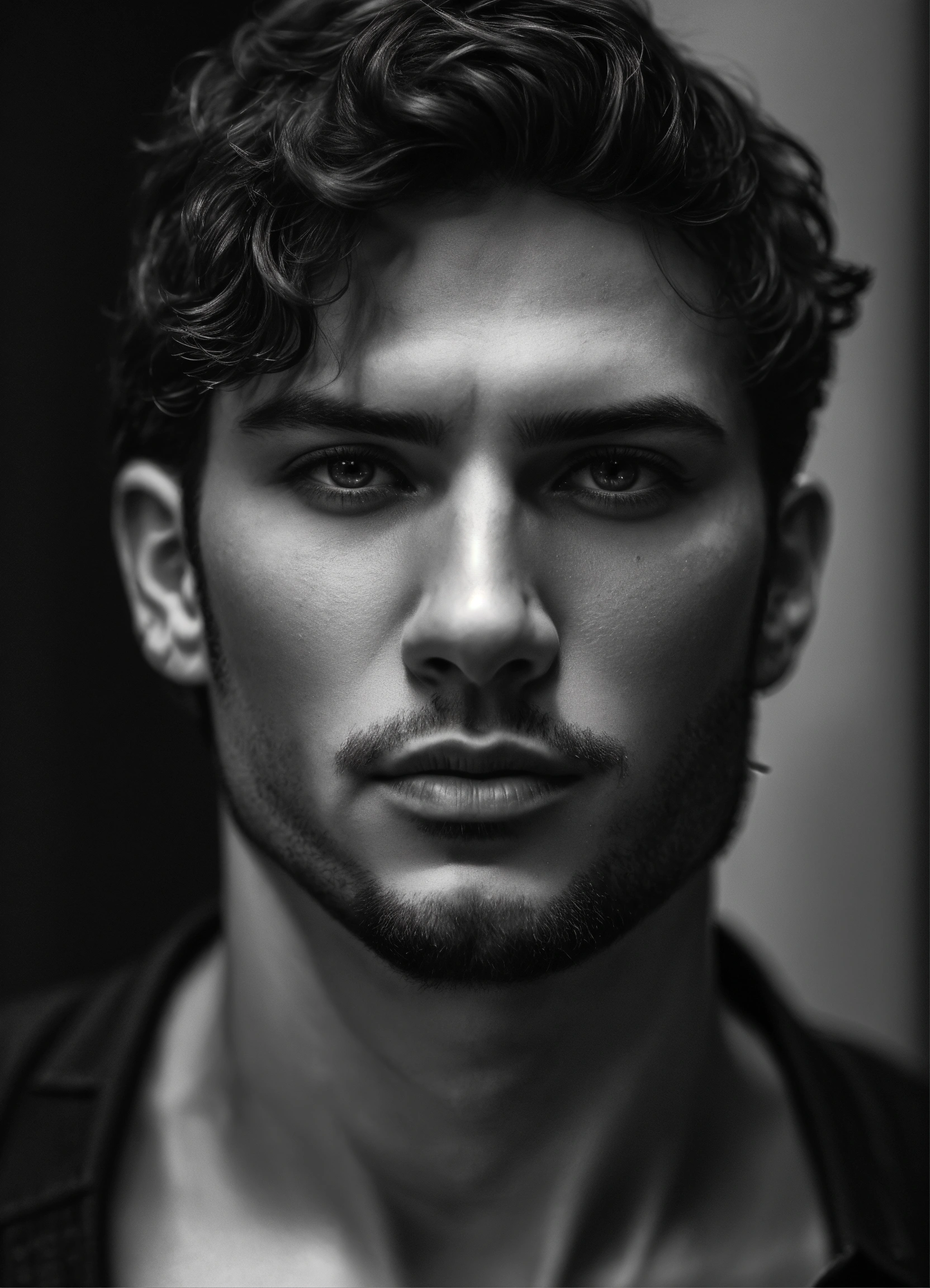 Photo of male model gonçalo teixeira, black and white, realistic, portrait, not painted, very detailed faces, skin with pores, 4k, dark suit, black plain background, skin not smoothed, face from left to right, desire in the eyes, half profile, glowering, looking into the camera, dark shirt.