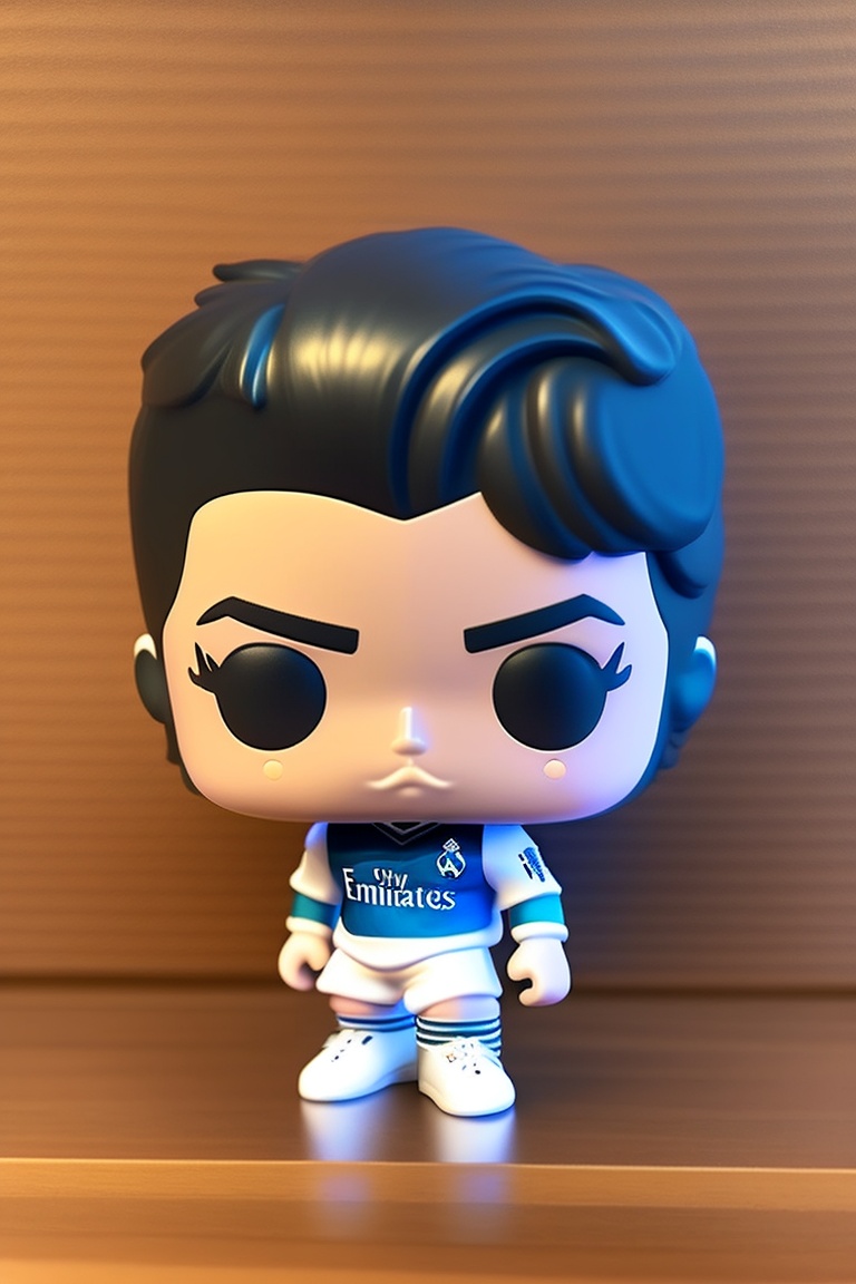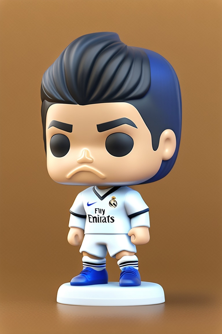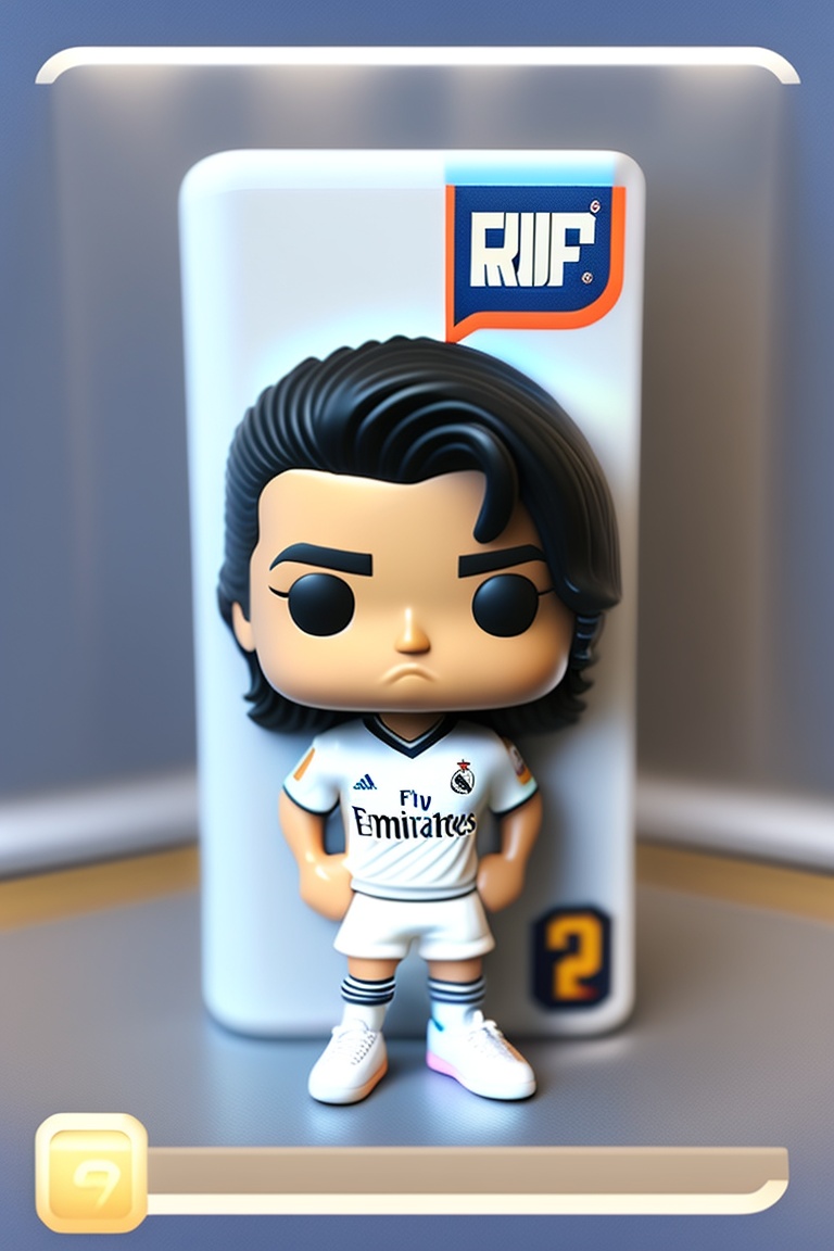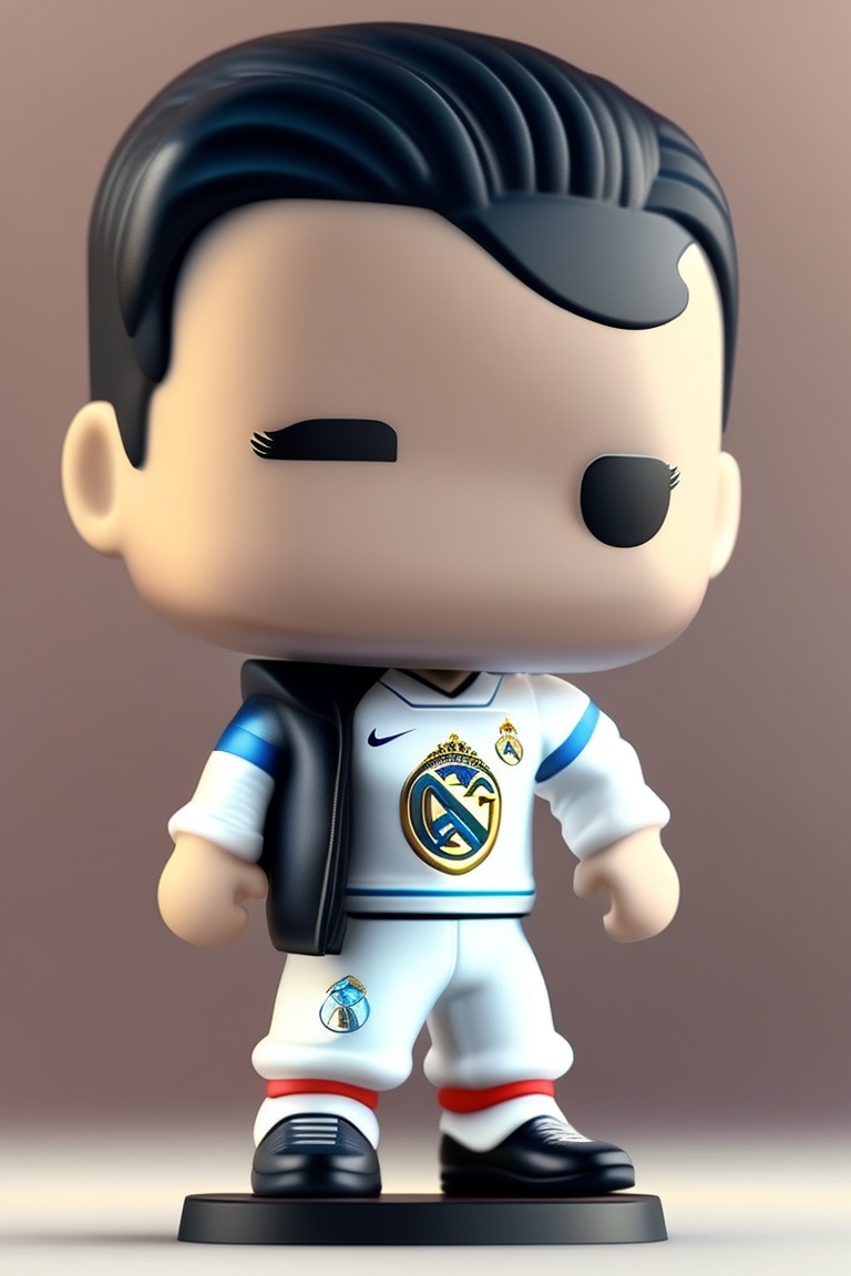 Funko pop of a boy dressed in the real madrid kit, a bit chubby, with very black hair, combed forward, with full lips