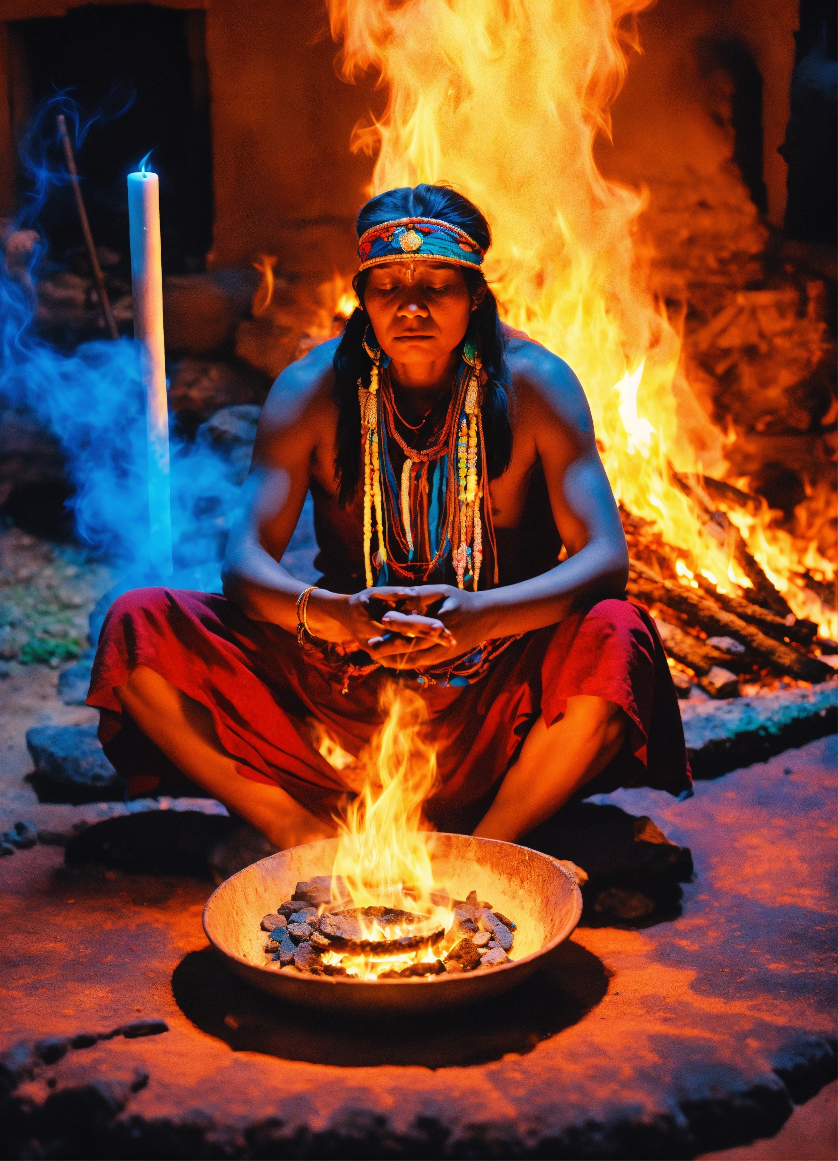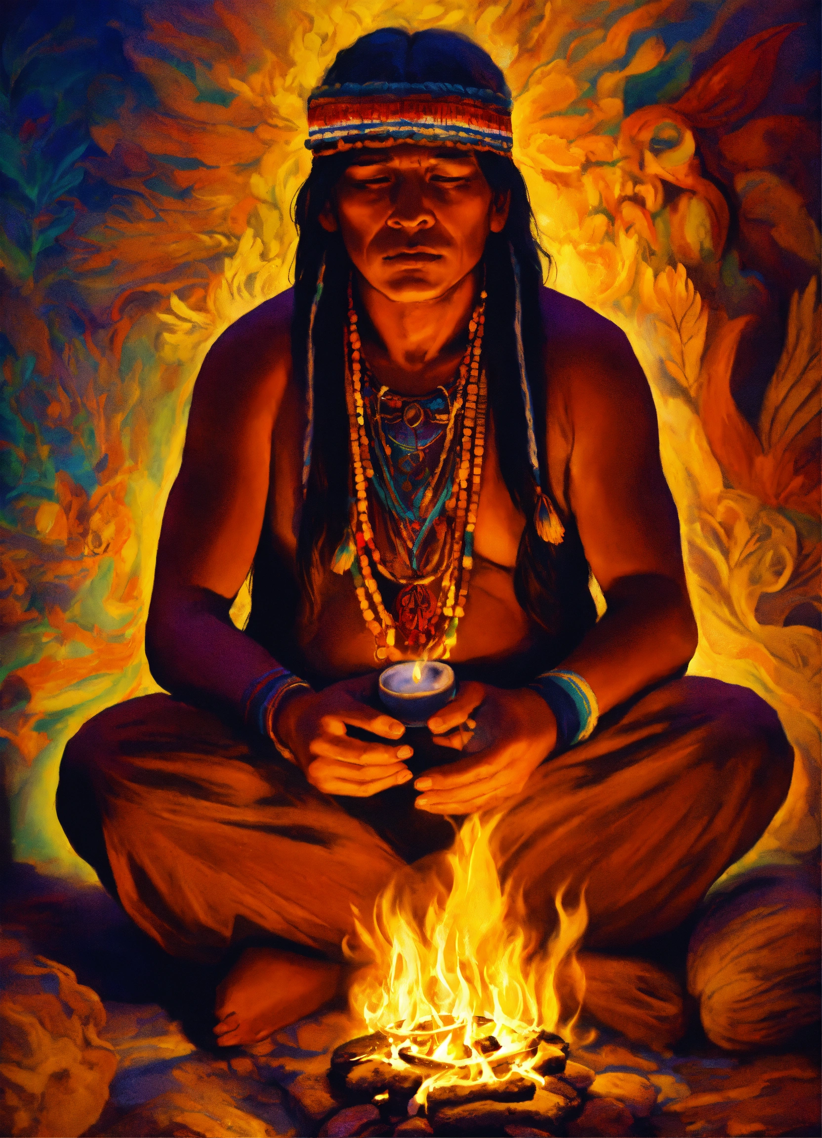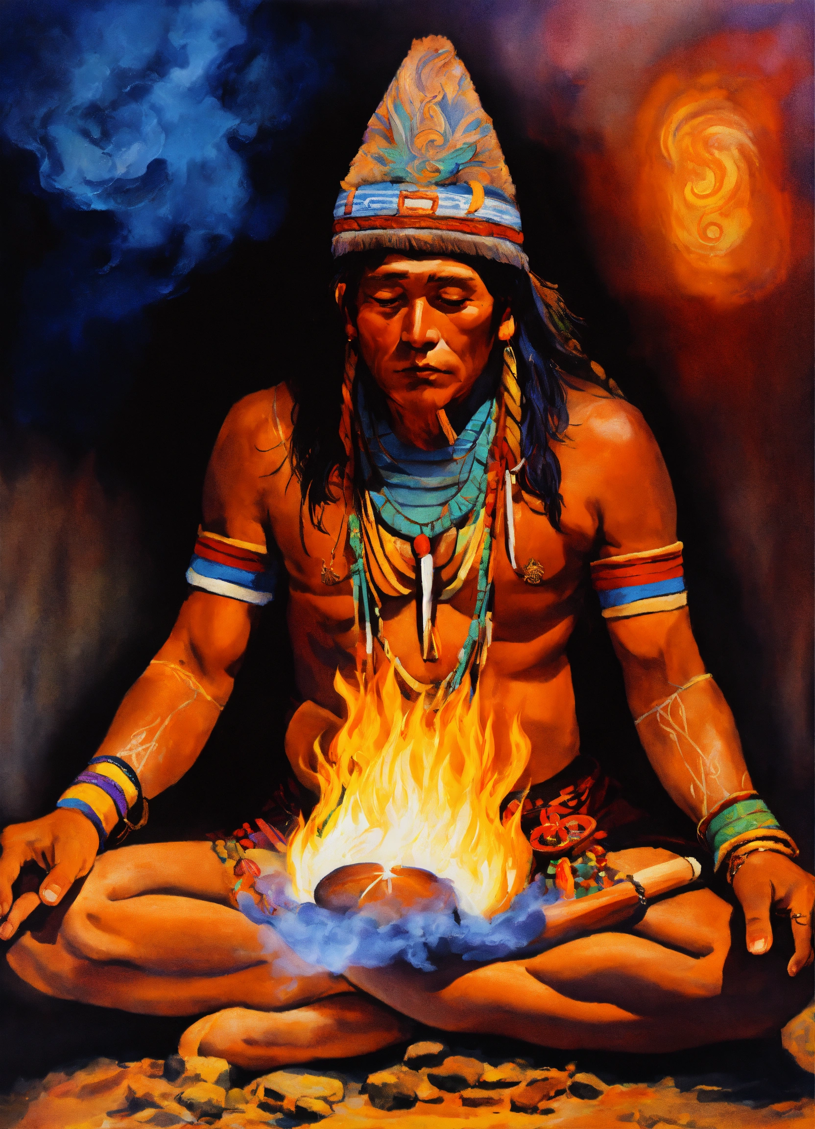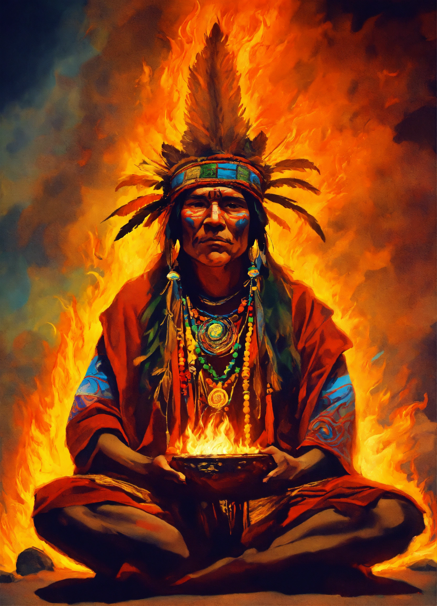 Drawing shaman from peru sitted in front of fire, watching us, meditating, transe, ayahuasca, smoke of several colors, judging